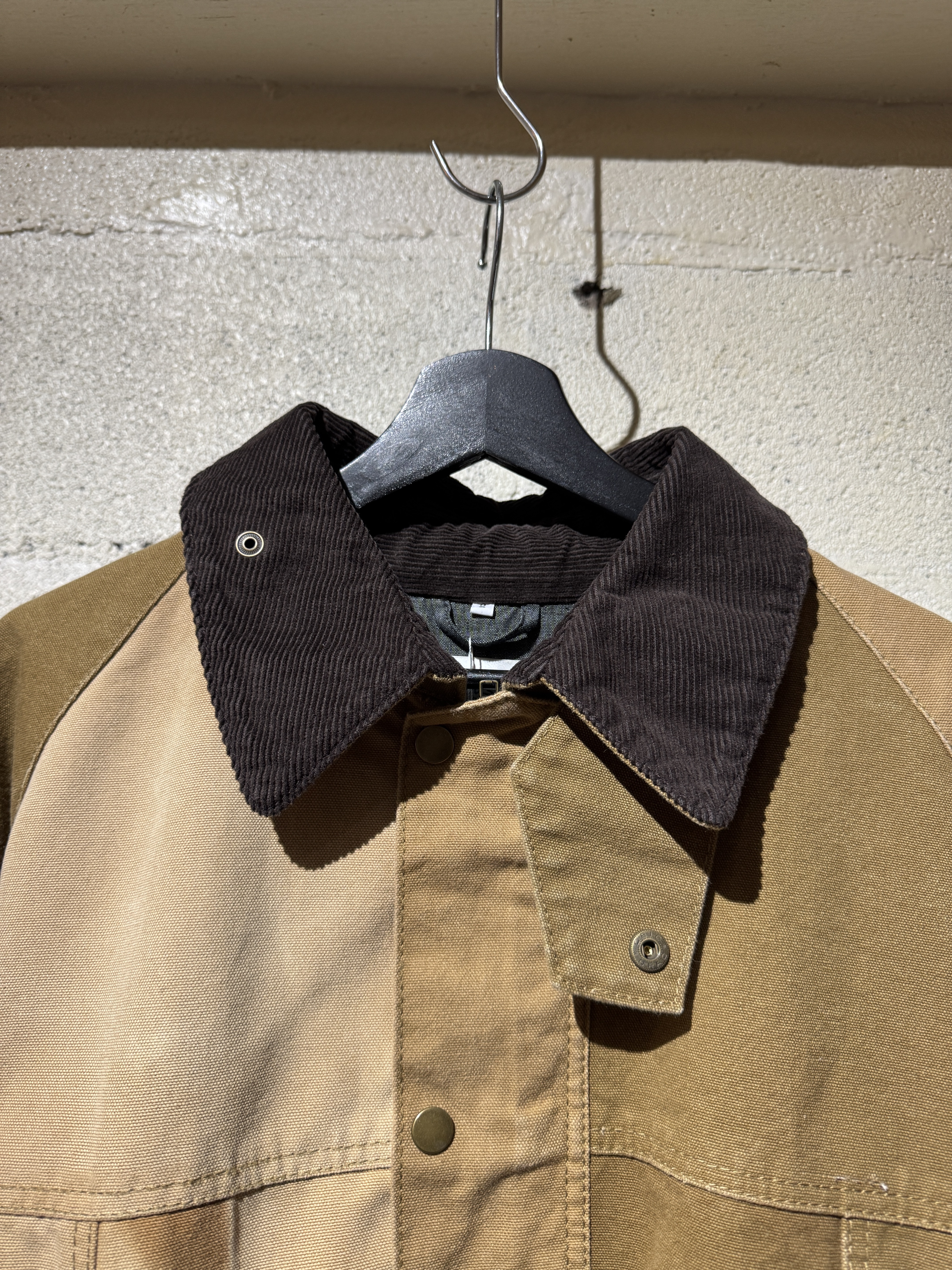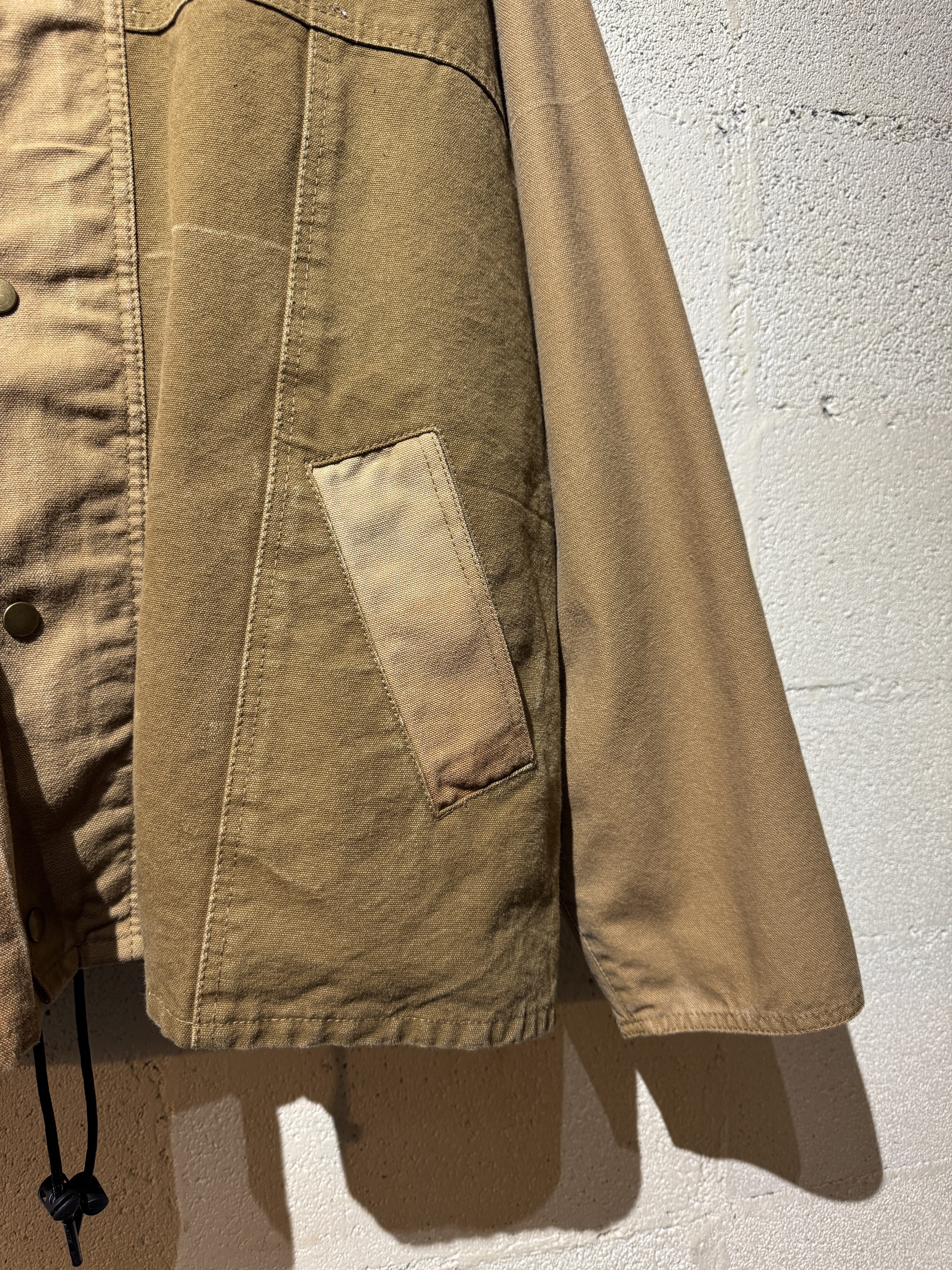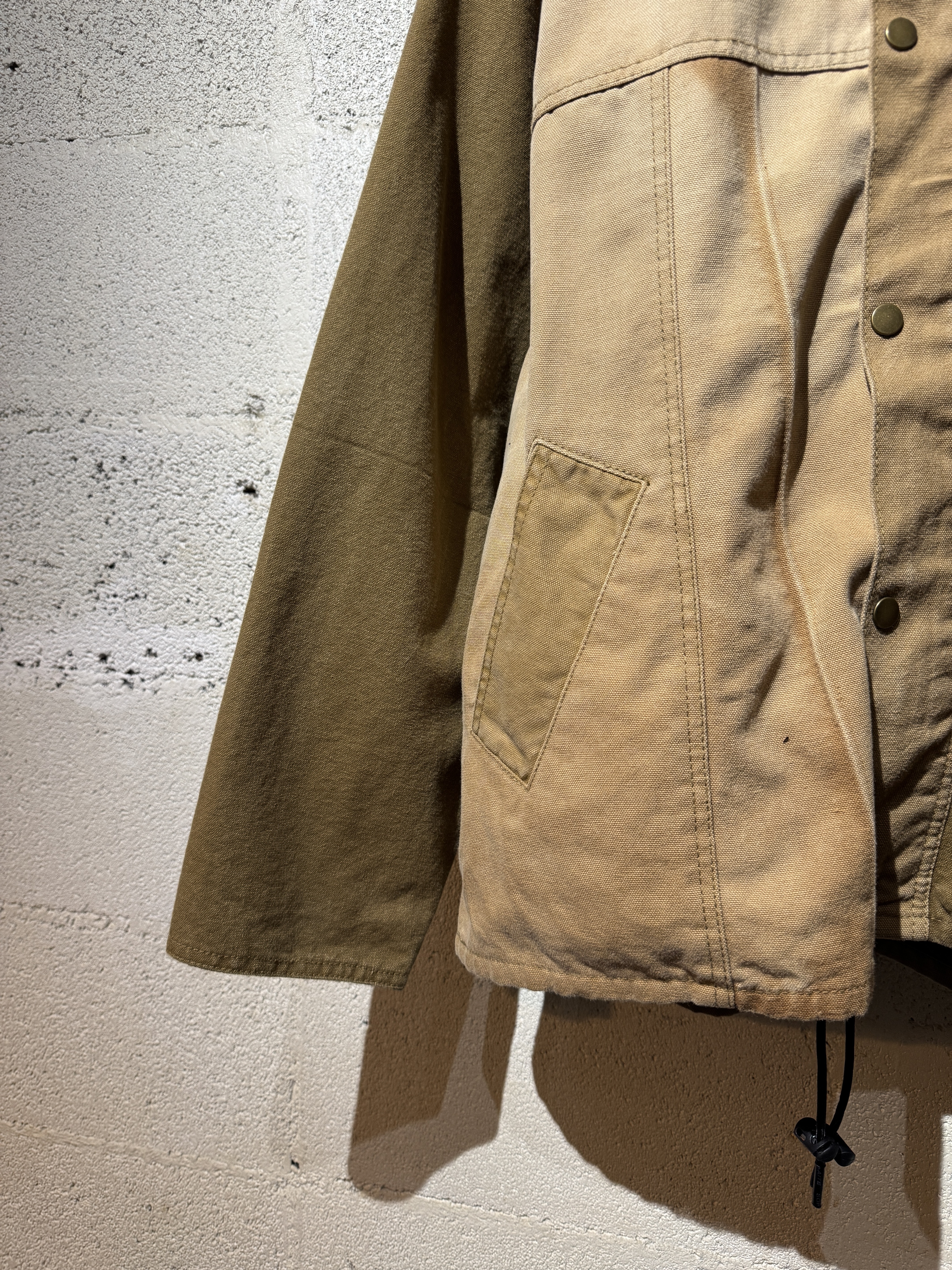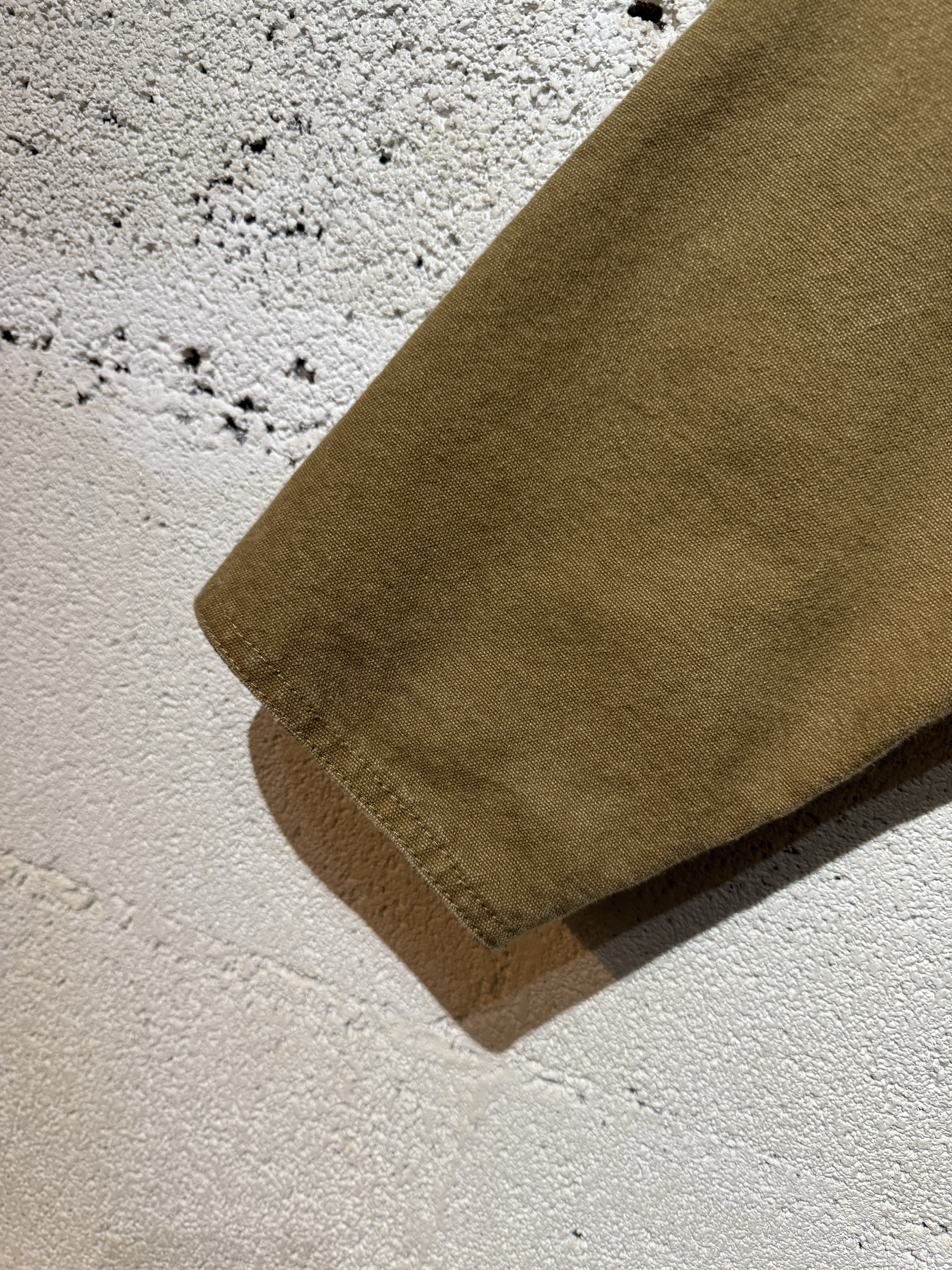 ダックジャケットで有名な某ワークブランドのパンツなどを解体し再構築したダック地のドライバーズジャケットです。yousedの定番レザードライバーズジャケットのダック地バージョンになります。身幅はややワイドめ、また着丈はショートのBOXシルエットのフォルムになります。襟はコーデュロイのチンストラップ付き、フロントはスナップボタンとジッパーの組み合わせです。裏地もそう古くはありませんが長く使用されず保管されたデッドストックのシャンブレーブラックを使用してあります。また袖内は二重構造のスナップ付きで風が入るのを防ぐ仕様です。余計なディテールは排除されたスタンダードなモデルですがシルエットに特に気を配った着回しのきくyousedのロングセラーモデルです。 詳細寸法 サイズ2 ゆき丈:88cm 身幅:69cm 着丈68cm