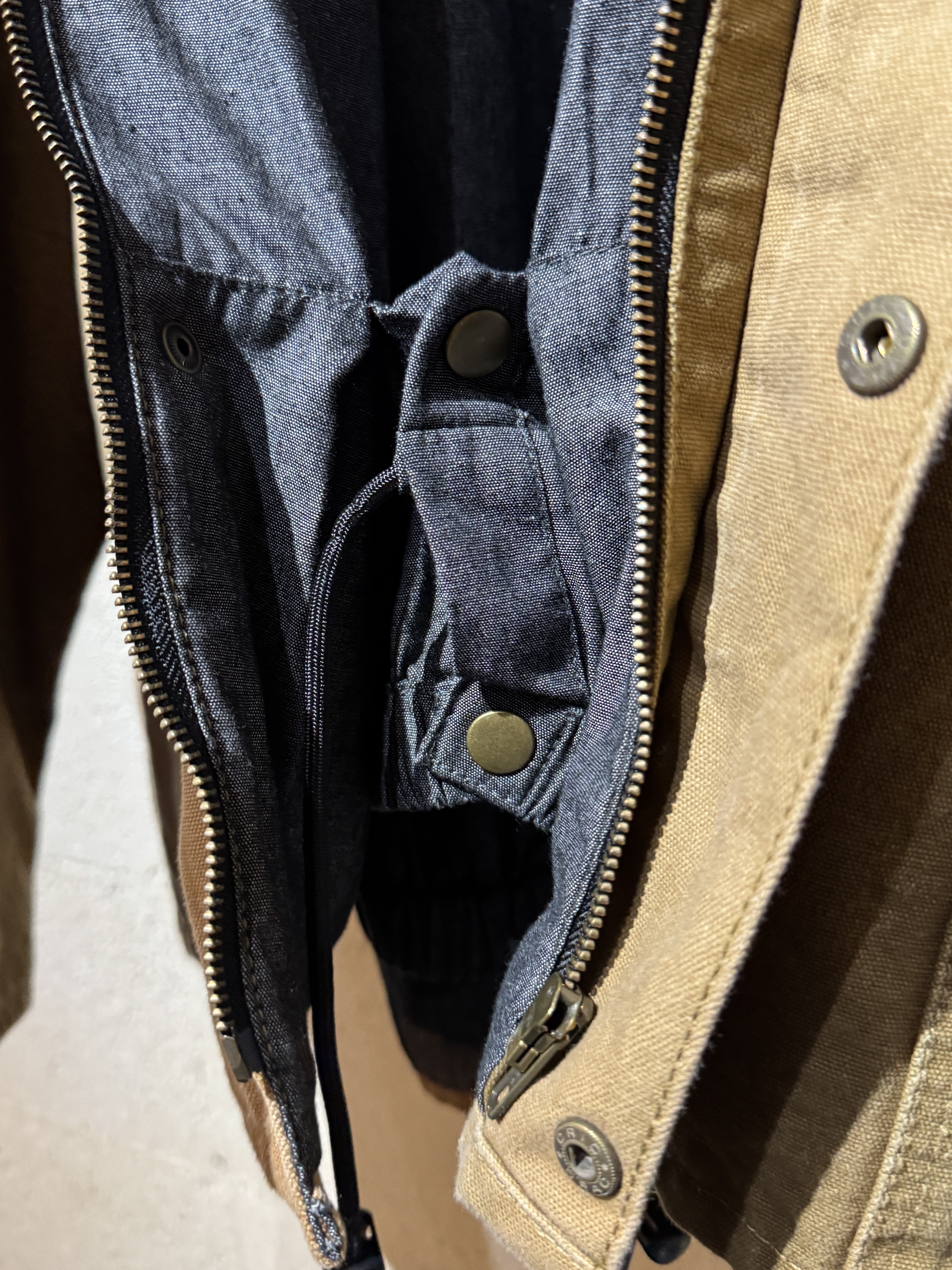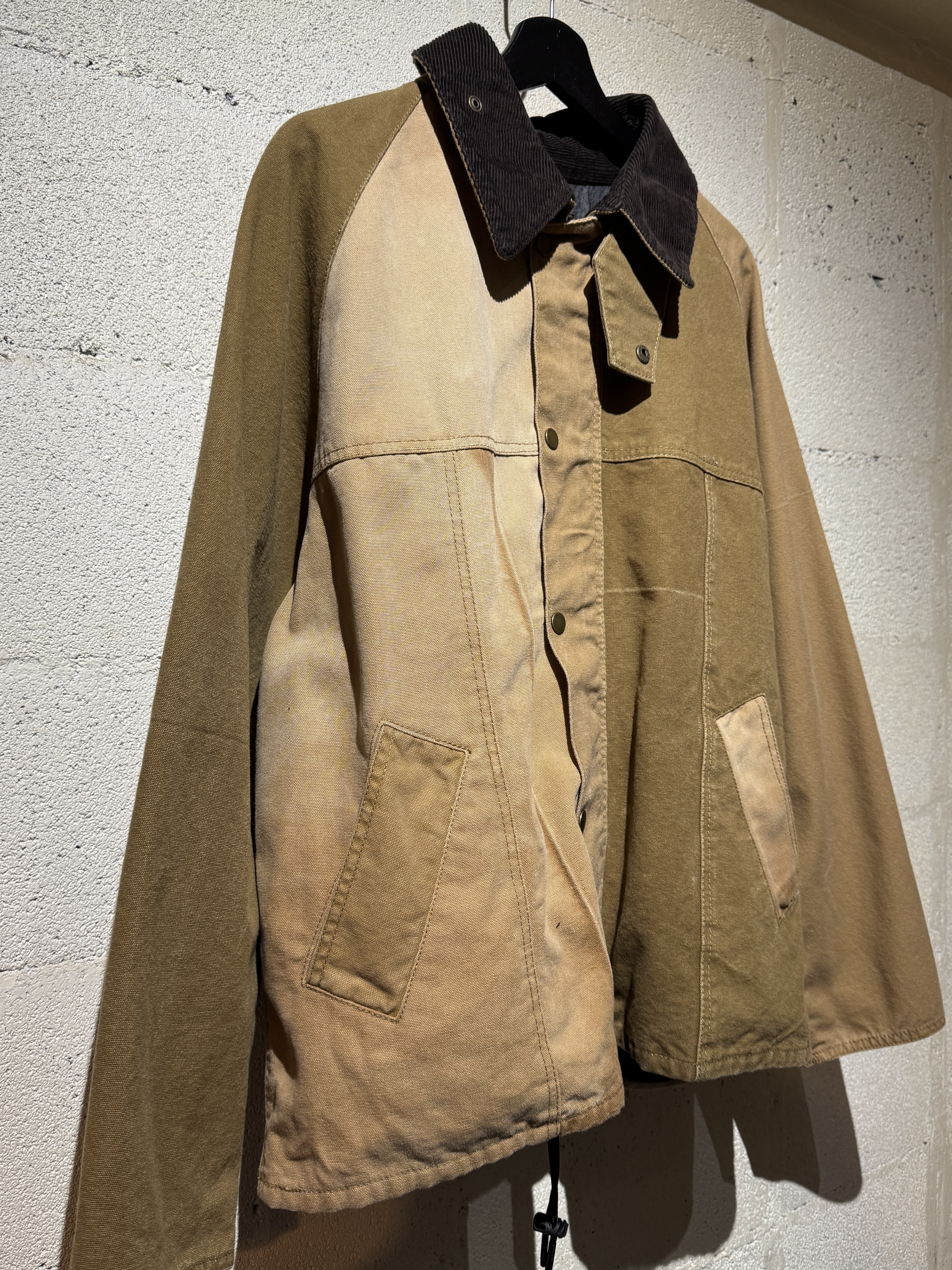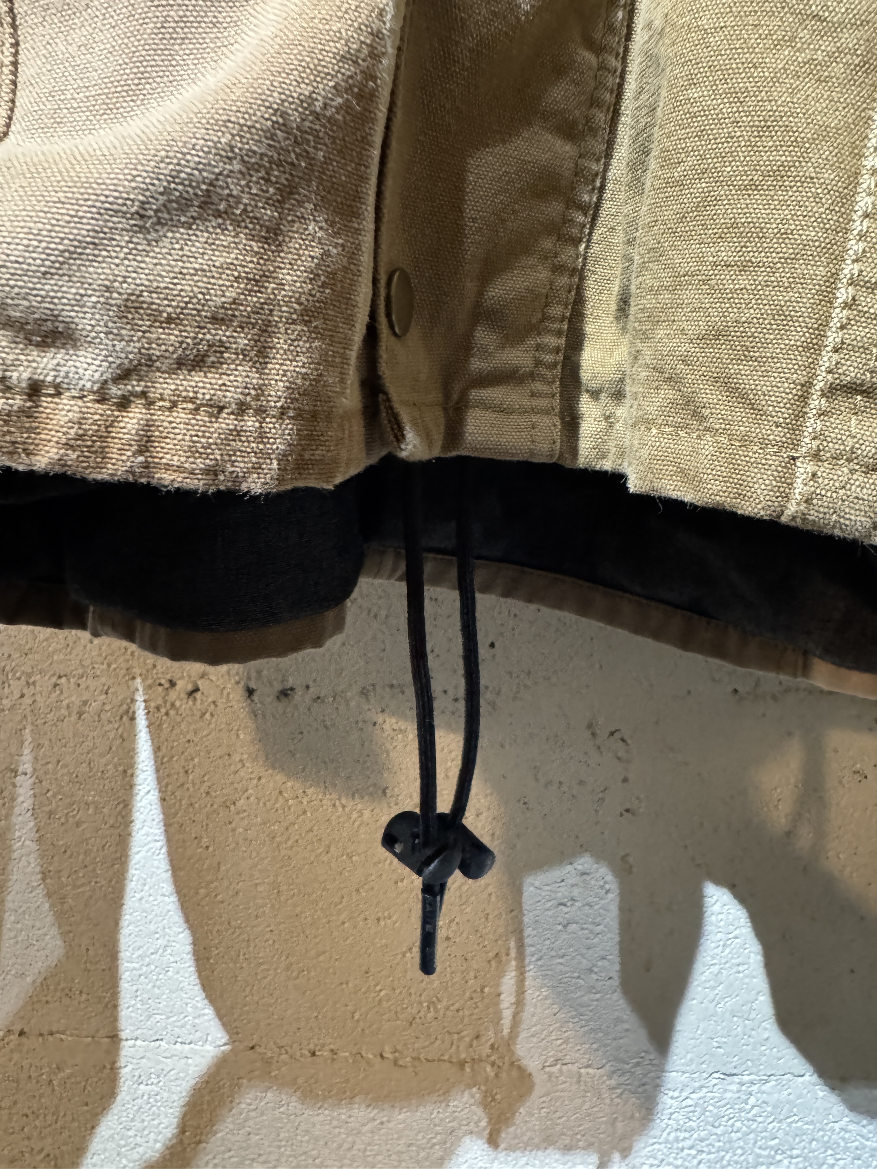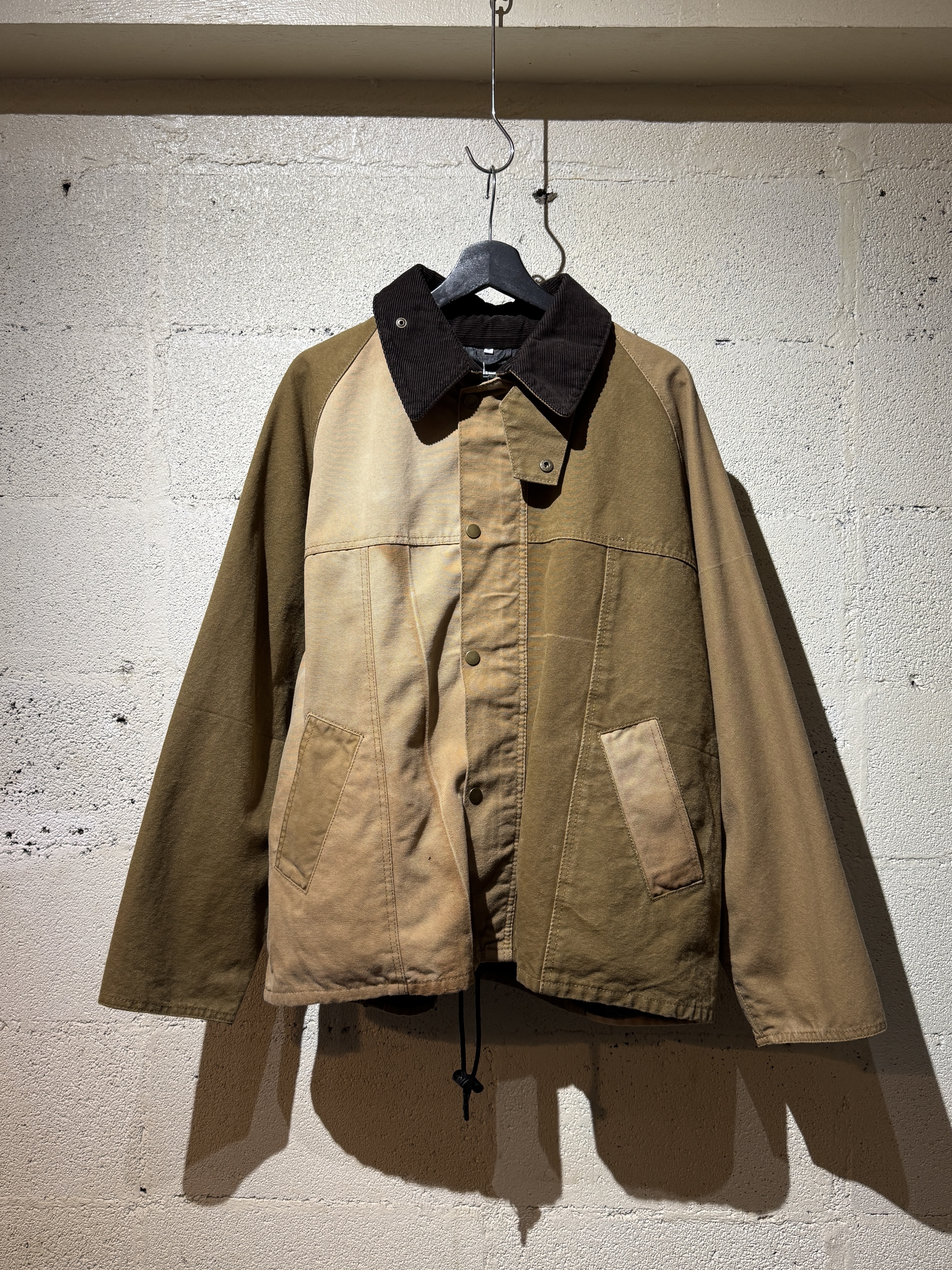 ダックジャケットで有名な某ワークブランドのパンツなどを解体し再構築したダック地のドライバーズジャケットです。yousedの定番レザードライバーズジャケットのダック地バージョンになります。身幅はややワイドめ、また着丈はショートのBOXシルエットのフォルムになります。襟はコーデュロイのチンストラップ付き、フロントはスナップボタンとジッパーの組み合わせです。裏地もそう古くはありませんが長く使用されず保管されたデッドストックのシャンブレーブラックを使用してあります。また袖内は二重構造のスナップ付きで風が入るのを防ぐ仕様です。余計なディテールは排除されたスタンダードなモデルですがシルエットに特に気を配った着回しのきくyousedのロングセラーモデルです。 詳細寸法 サイズ2 ゆき丈:88cm 身幅:69cm 着丈68cm