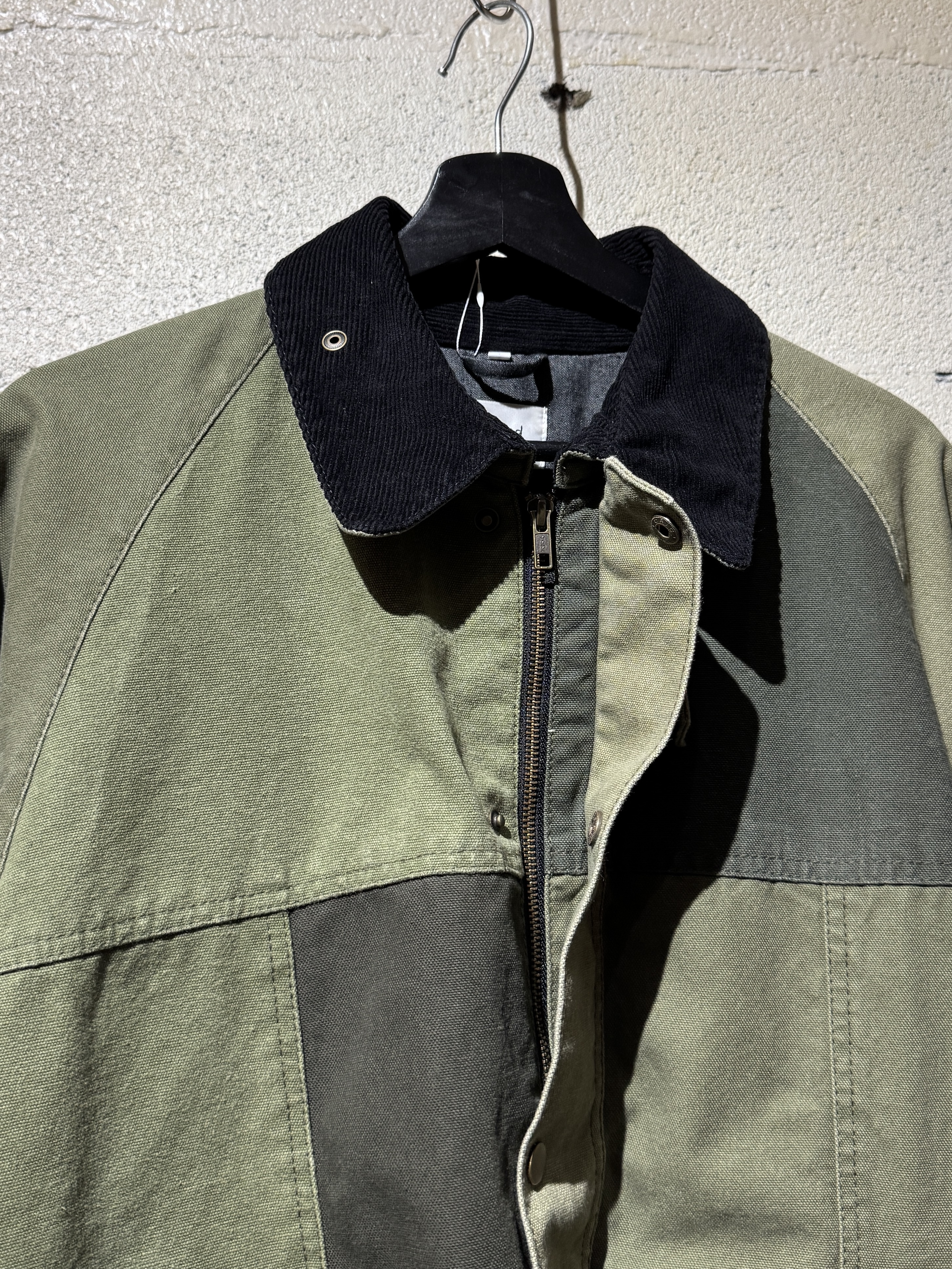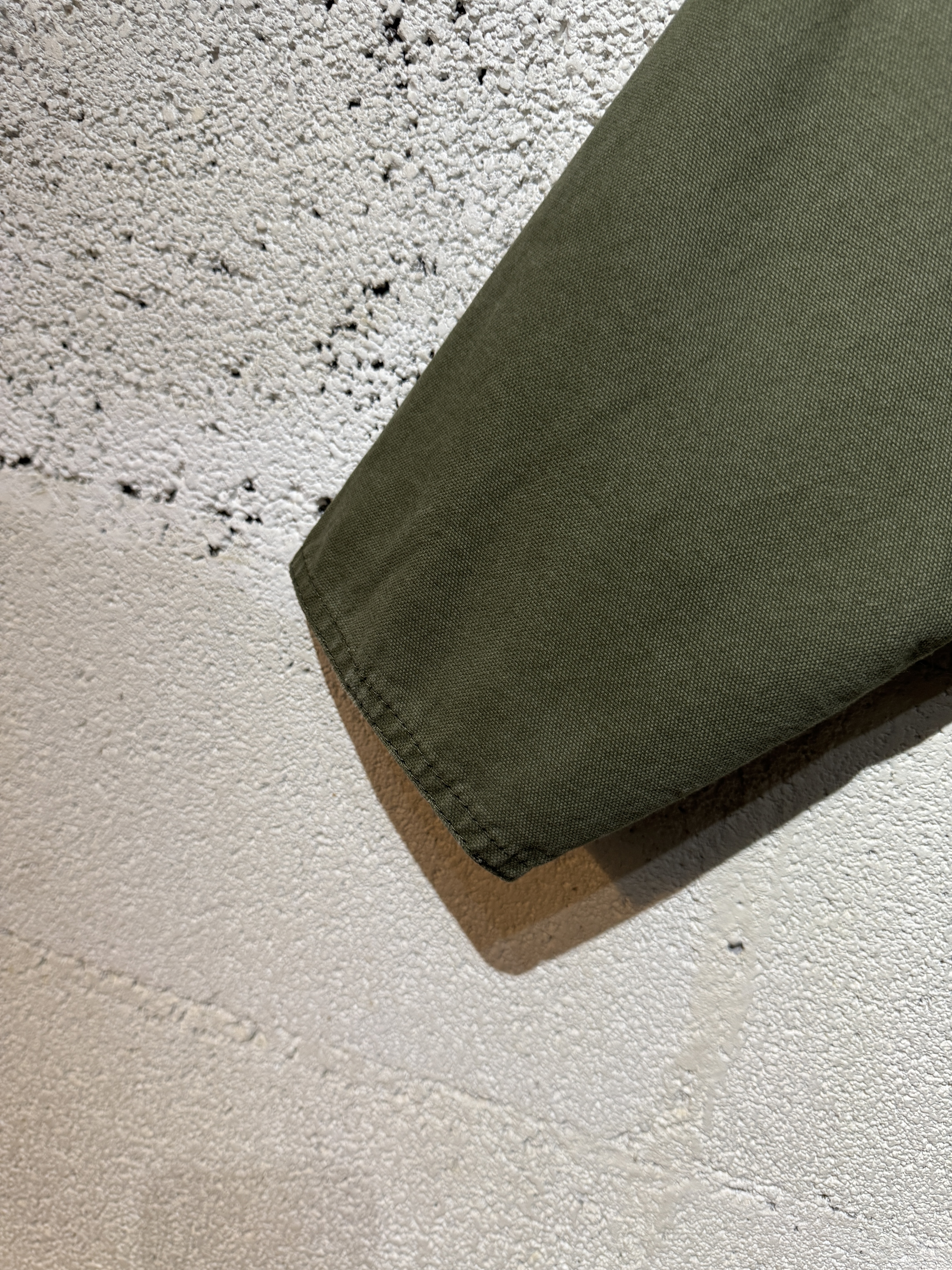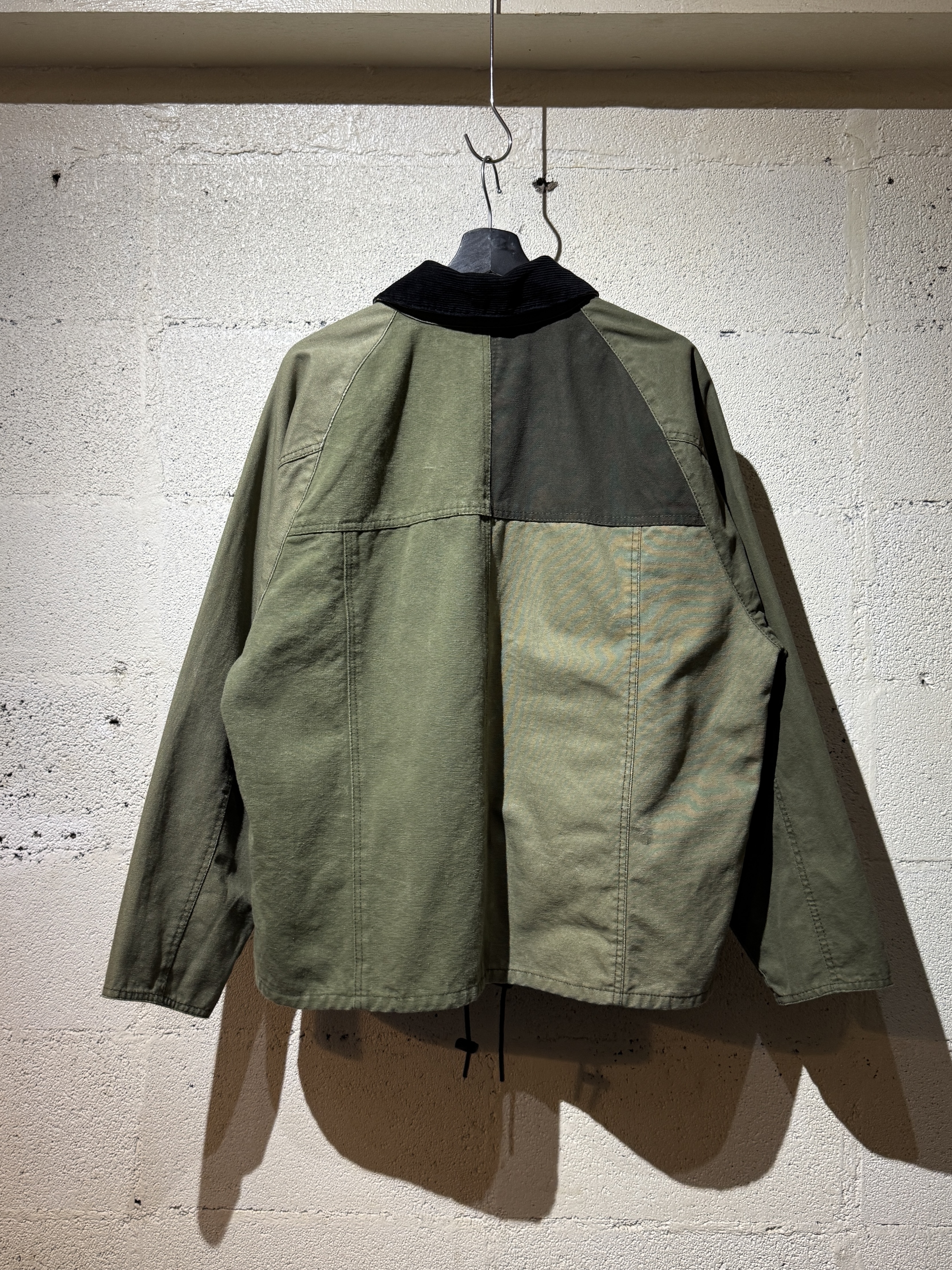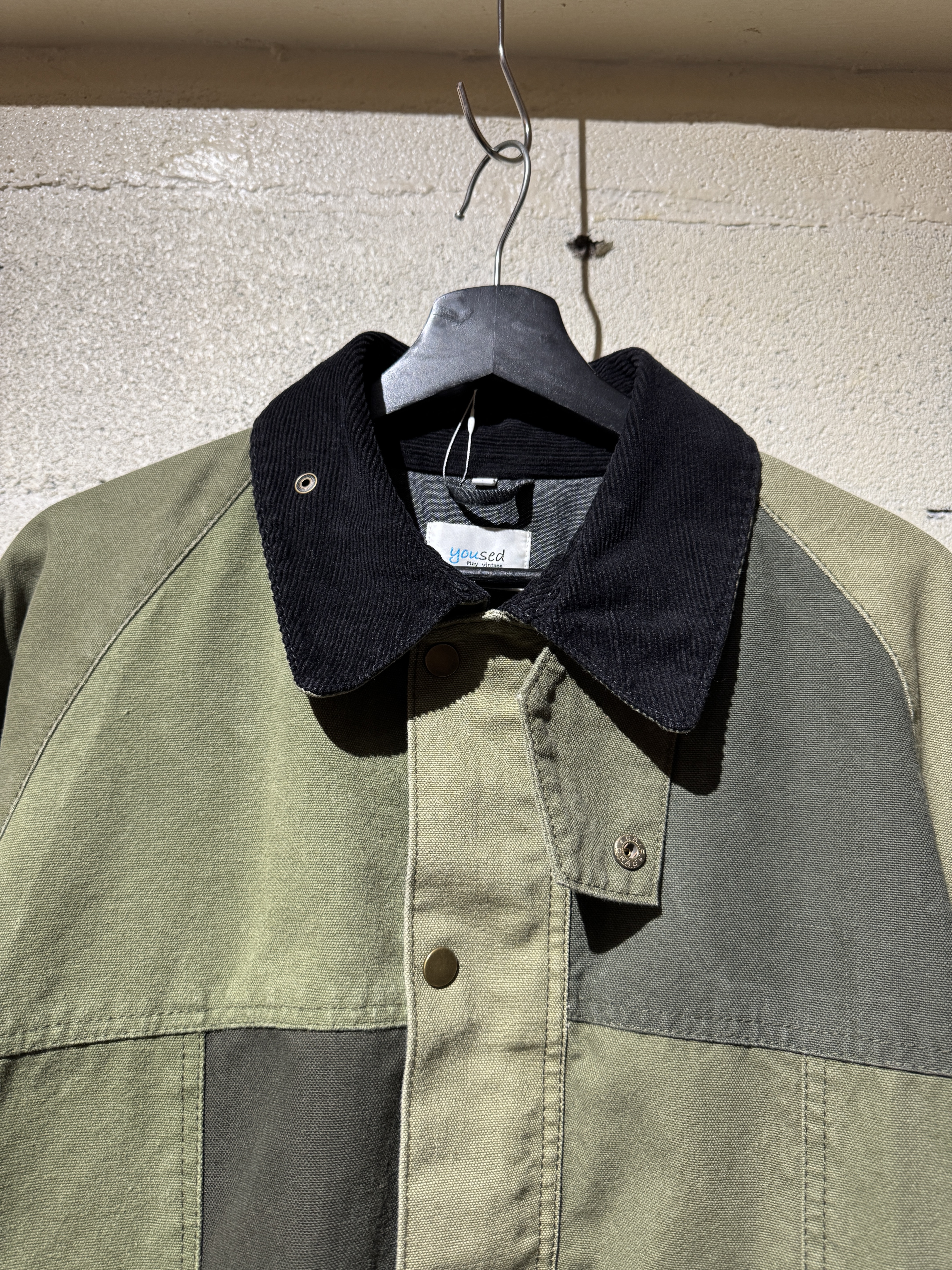 ダックジャケットで有名な某ワークブランドのパンツなどを解体し再構築したダック地のドライバーズジャケットです。yousedの定番レザードライバーズジャケットのダック地バージョンになります。身幅はややワイドめ、また着丈はショートのBOXシルエットのフォルムになります。襟はコーデュロイのチンストラップ付き、フロントはスナップボタンとジッパーの組み合わせです。裏地もそう古くはありませんが長く使用されず保管されたデッドストックのシャンブレーブラックを使用してあります。また袖内は二重構造のスナップ付きで風が入るのを防ぐ仕様です。余計なディテールは排除されたスタンダードなモデルですがシルエットに特に気を配った着回しのきくyousedのロングセラーモデルです。 詳細寸法 サイズ1 ゆき丈:86cm 身幅:67cm 着丈66cm