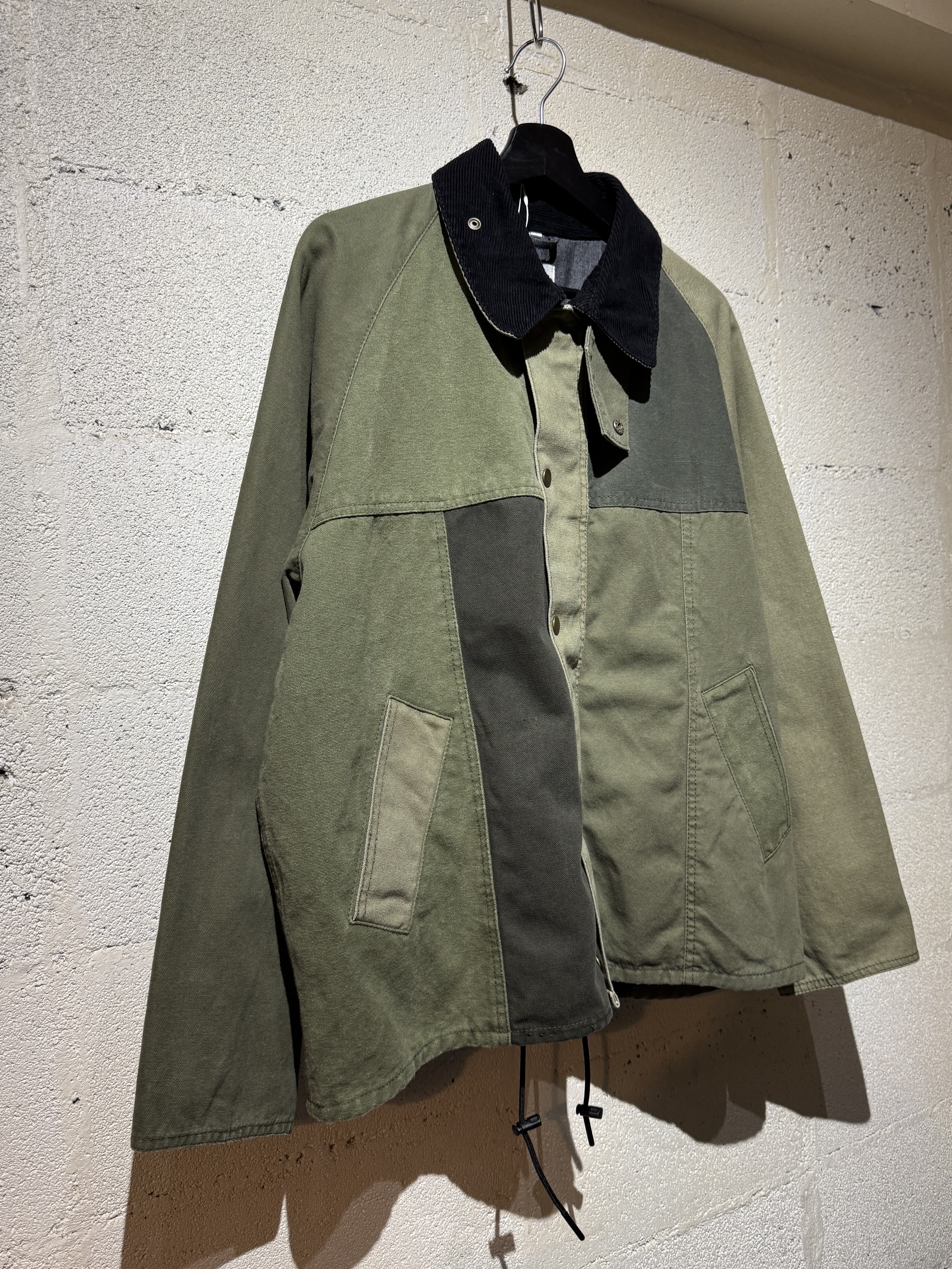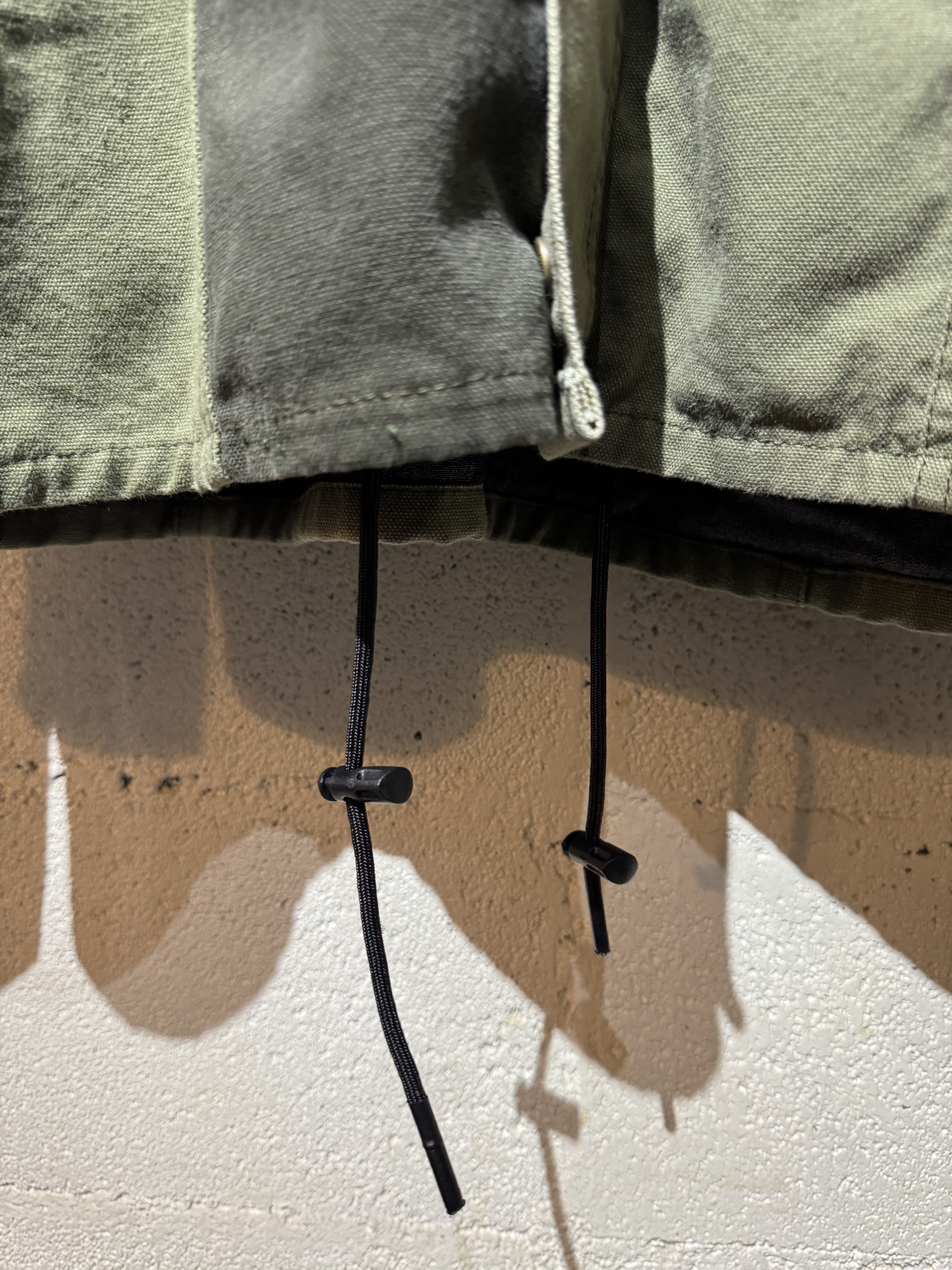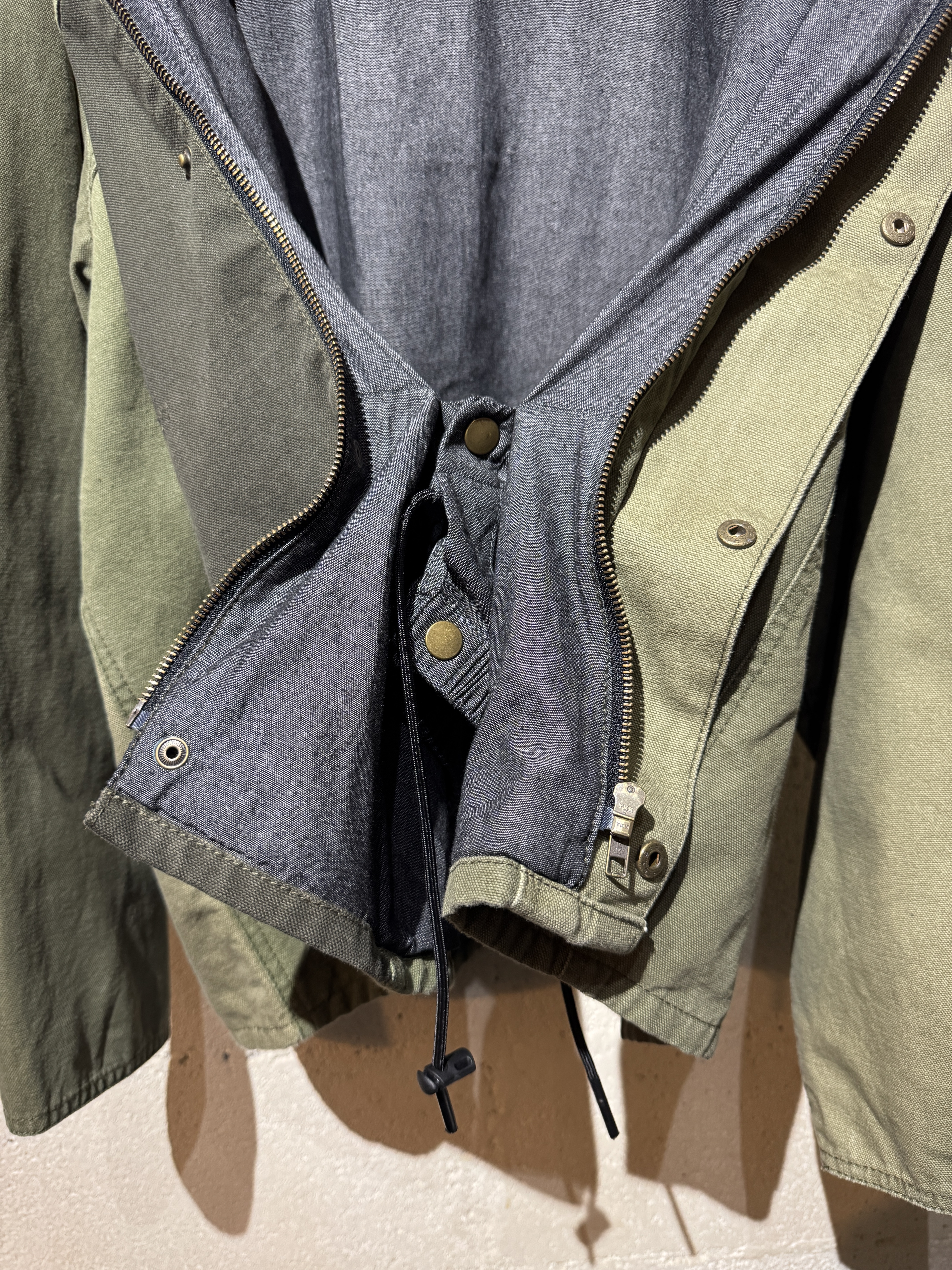 ダックジャケットで有名な某ワークブランドのパンツなどを解体し再構築したダック地のドライバーズジャケットです。yousedの定番レザードライバーズジャケットのダック地バージョンになります。身幅はややワイドめ、また着丈はショートのBOXシルエットのフォルムになります。襟はコーデュロイのチンストラップ付き、フロントはスナップボタンとジッパーの組み合わせです。裏地もそう古くはありませんが長く使用されず保管されたデッドストックのシャンブレーブラックを使用してあります。また袖内は二重構造のスナップ付きで風が入るのを防ぐ仕様です。余計なディテールは排除されたスタンダードなモデルですがシルエットに特に気を配った着回しのきくyousedのロングセラーモデルです。 詳細寸法 サイズ1 ゆき丈:86cm 身幅:67cm 着丈66cm