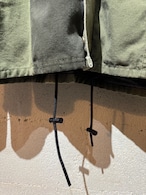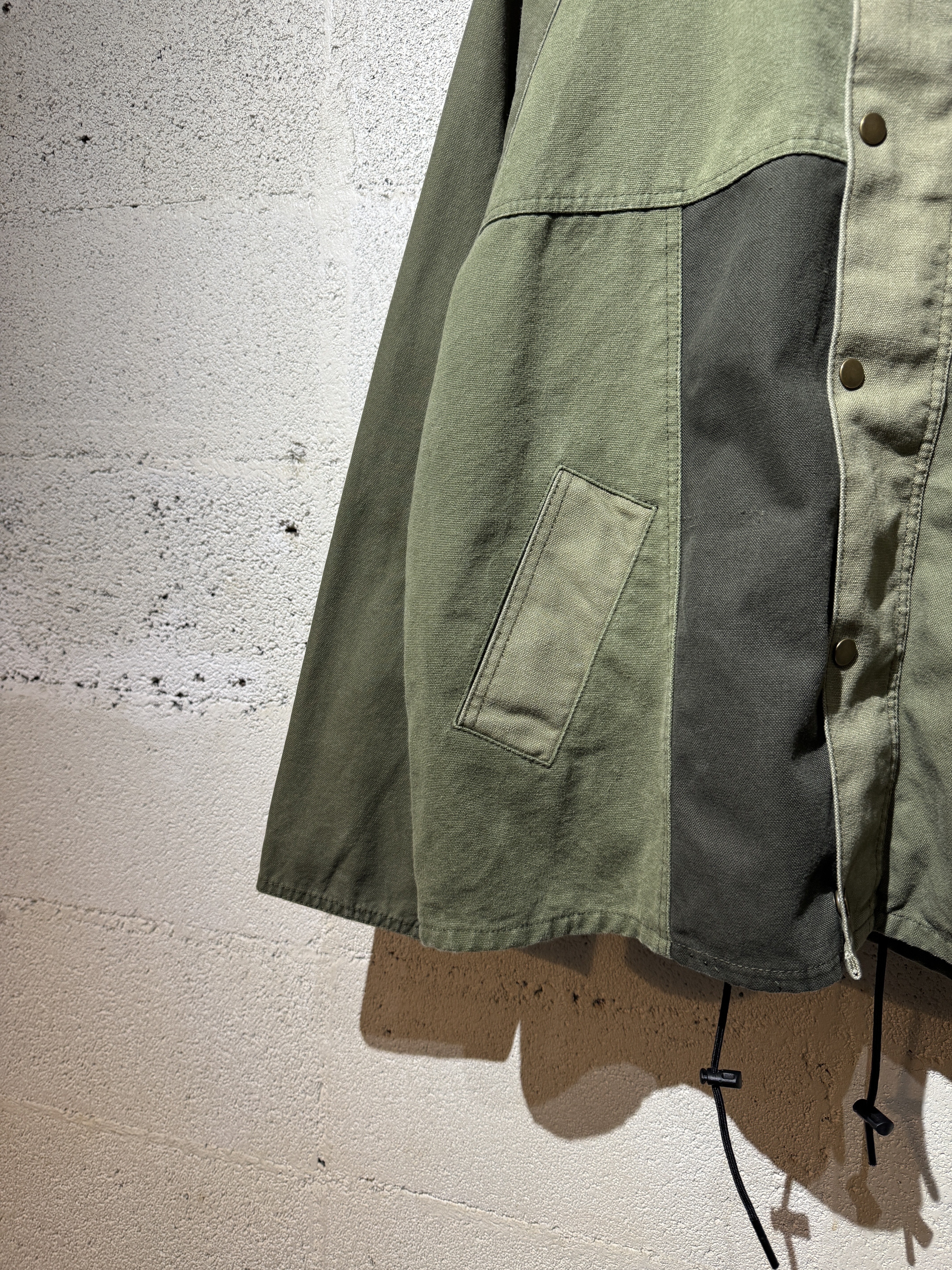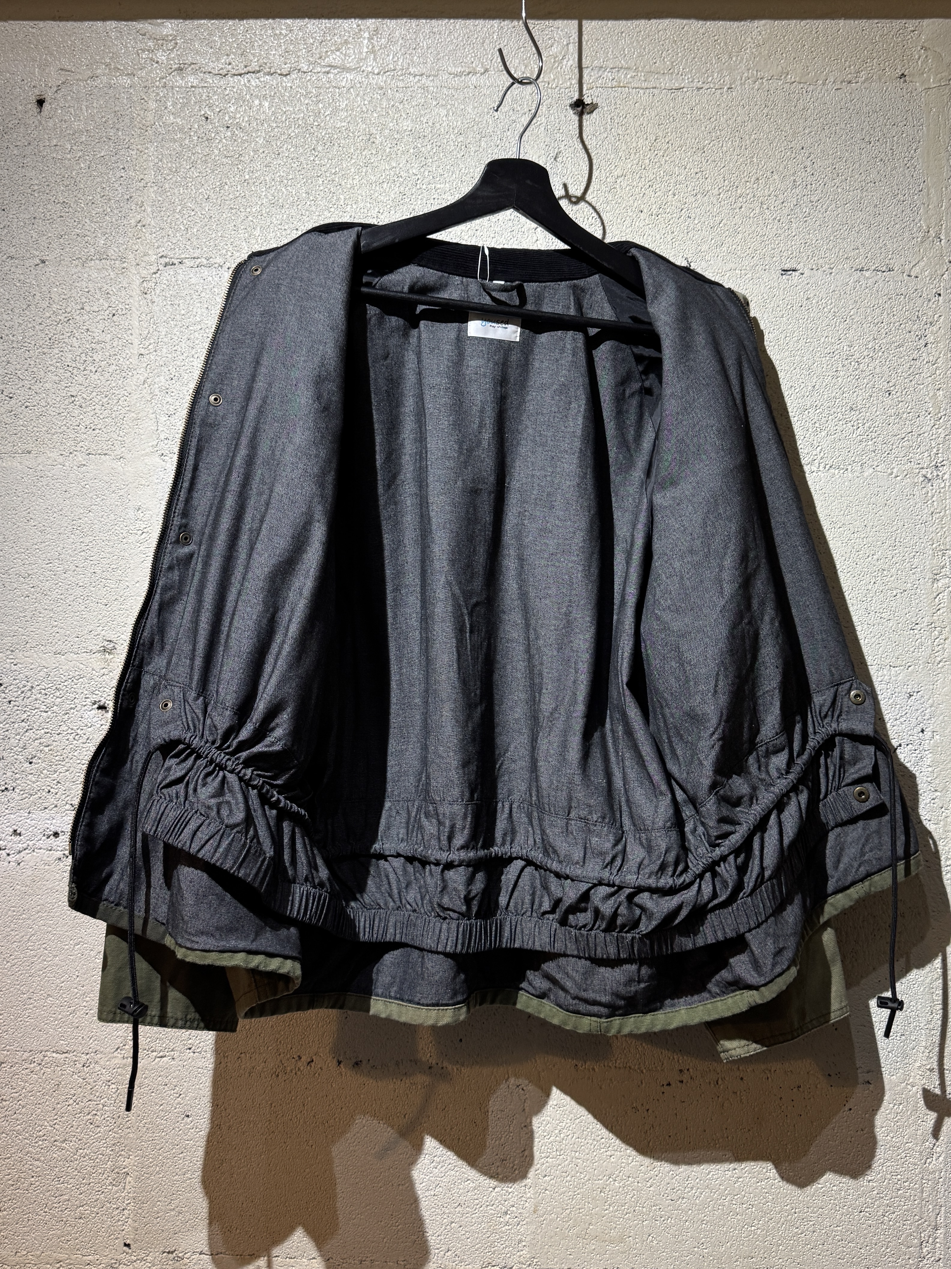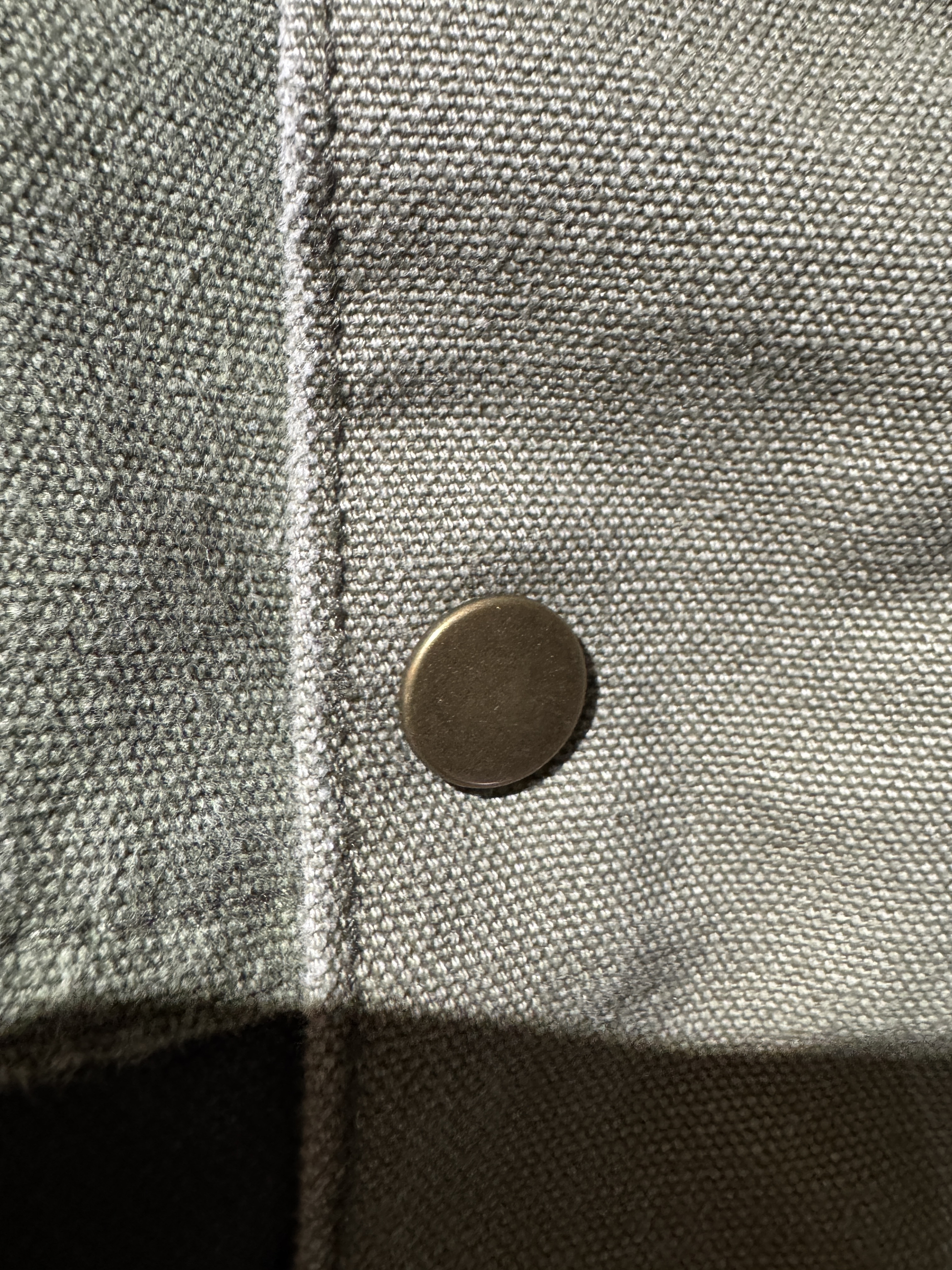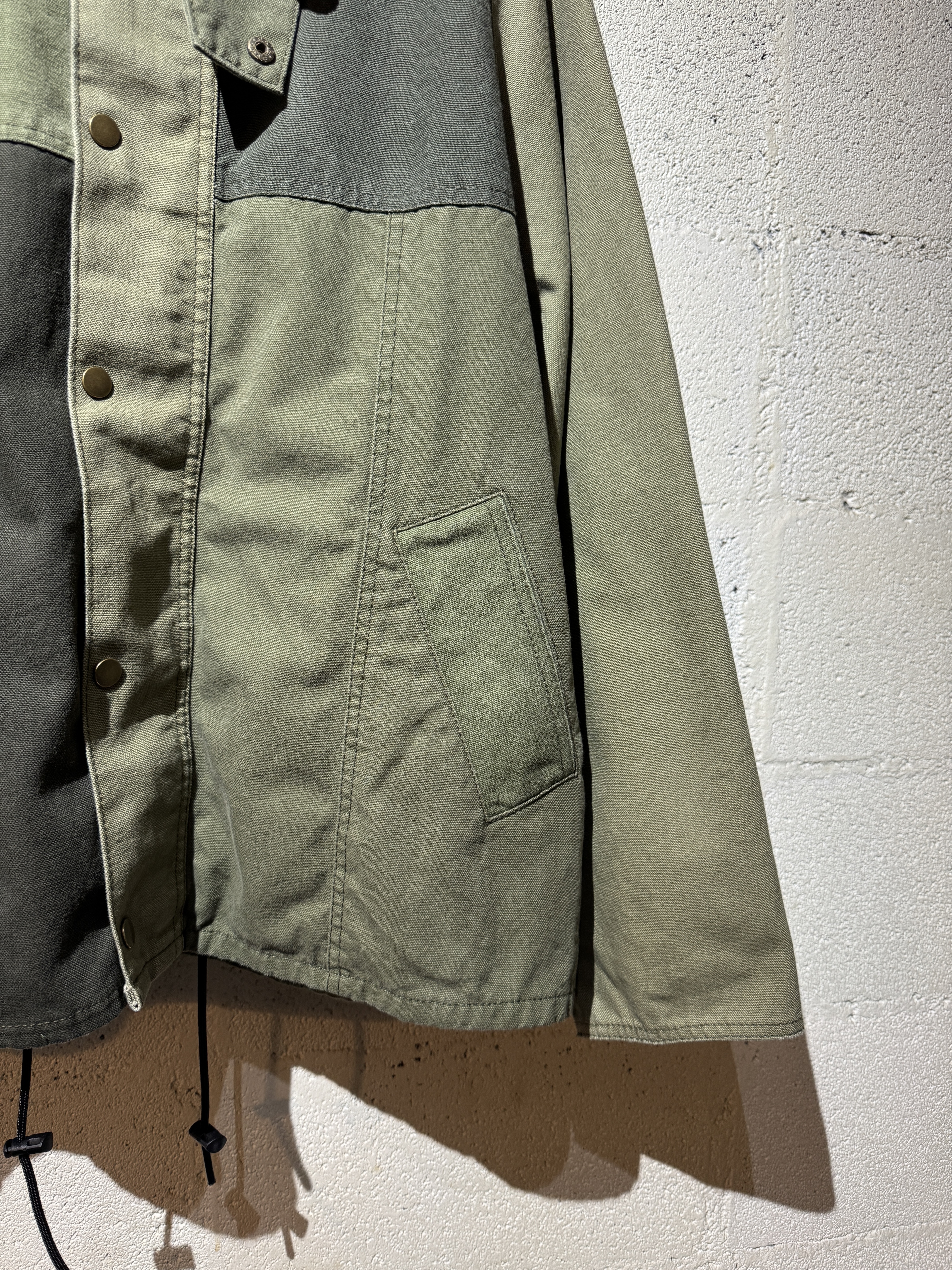 ダックジャケットで有名な某ワークブランドのパンツなどを解体し再構築したダック地のドライバーズジャケットです。yousedの定番レザードライバーズジャケットのダック地バージョンになります。身幅はややワイドめ、また着丈はショートのBOXシルエットのフォルムになります。襟はコーデュロイのチンストラップ付き、フロントはスナップボタンとジッパーの組み合わせです。裏地もそう古くはありませんが長く使用されず保管されたデッドストックのシャンブレーブラックを使用してあります。また袖内は二重構造のスナップ付きで風が入るのを防ぐ仕様です。余計なディテールは排除されたスタンダードなモデルですがシルエットに特に気を配った着回しのきくyousedのロングセラーモデルです。 詳細寸法 サイズ1 ゆき丈:86cm 身幅:67cm 着丈66cm
