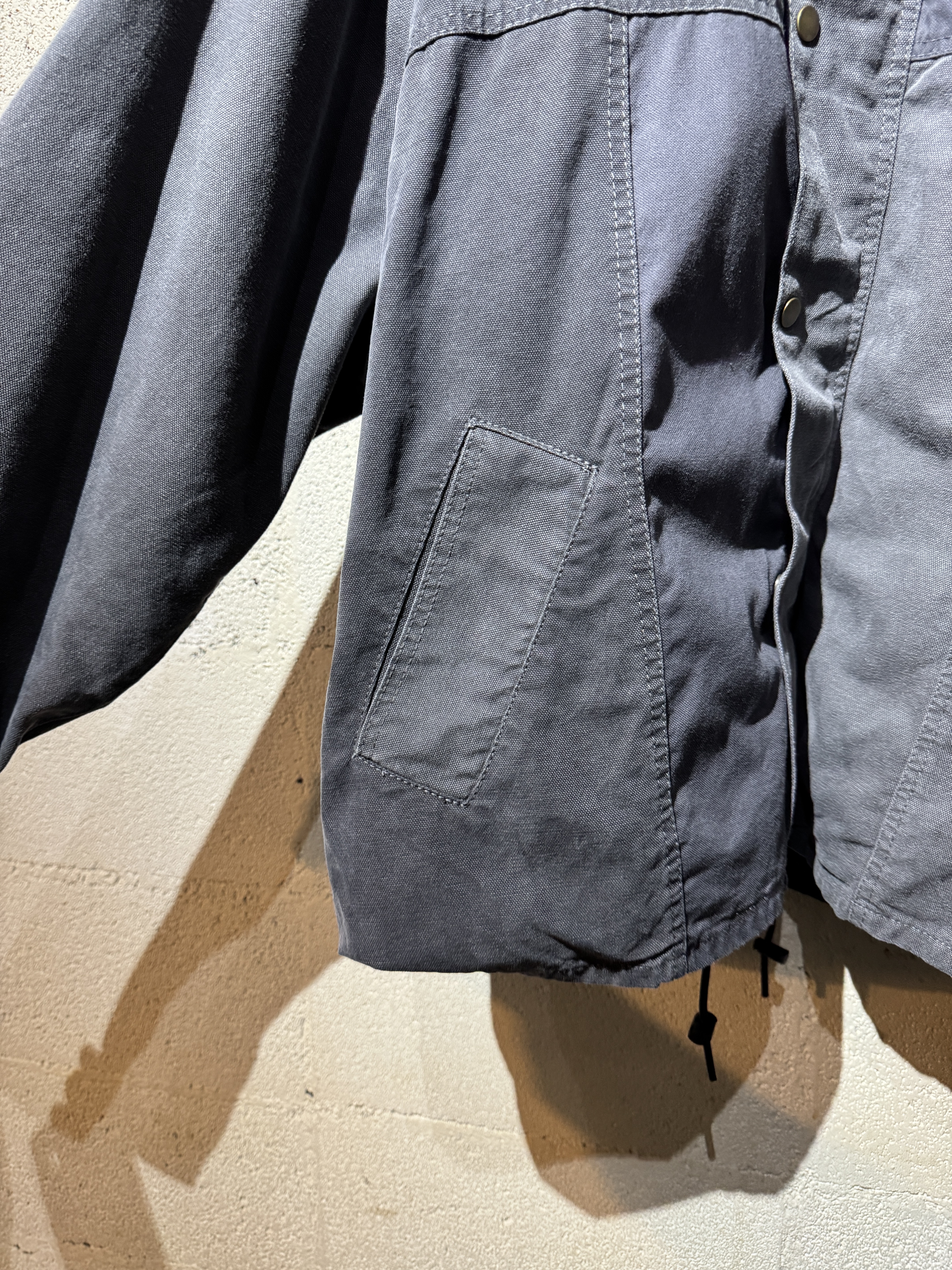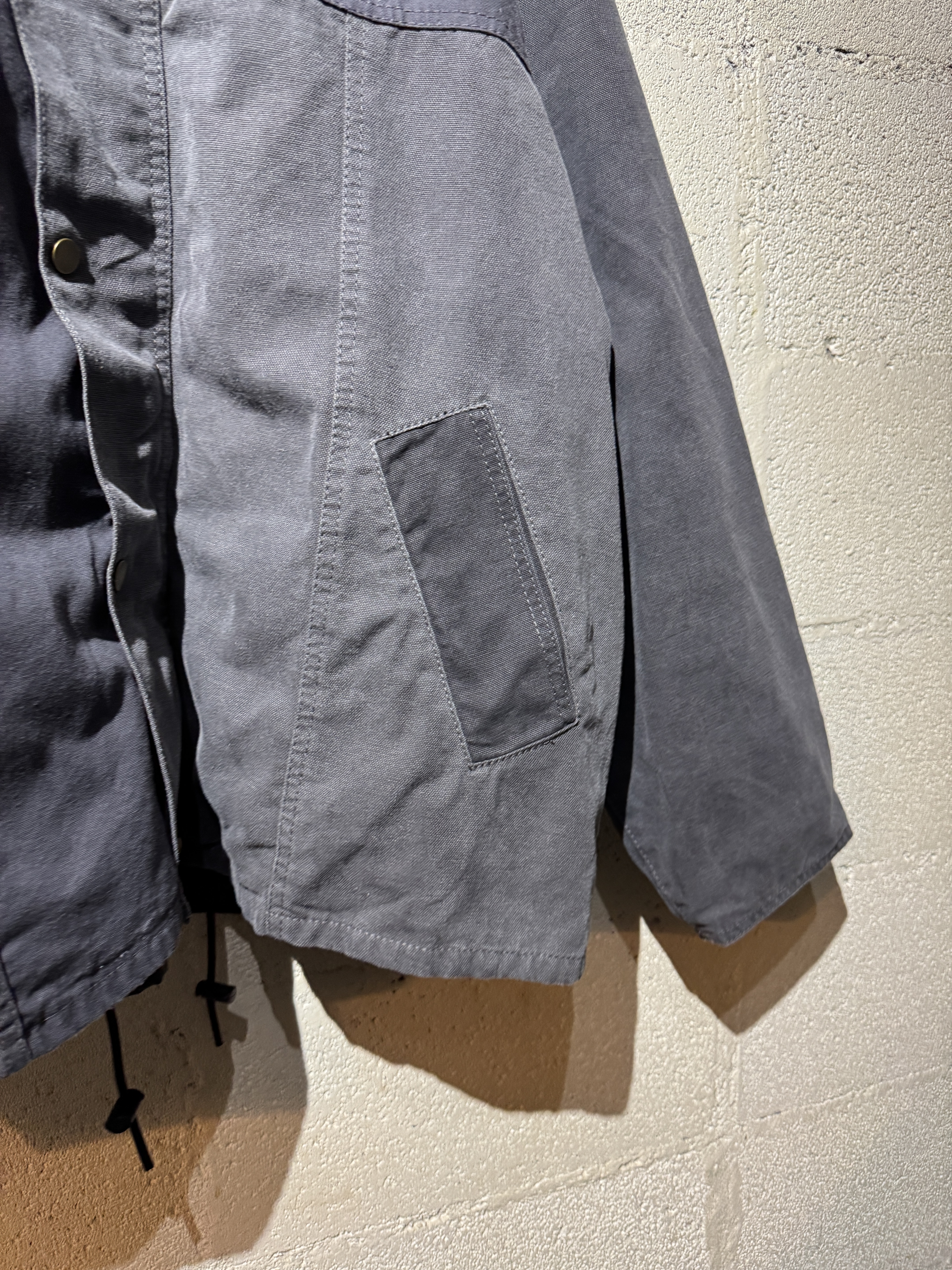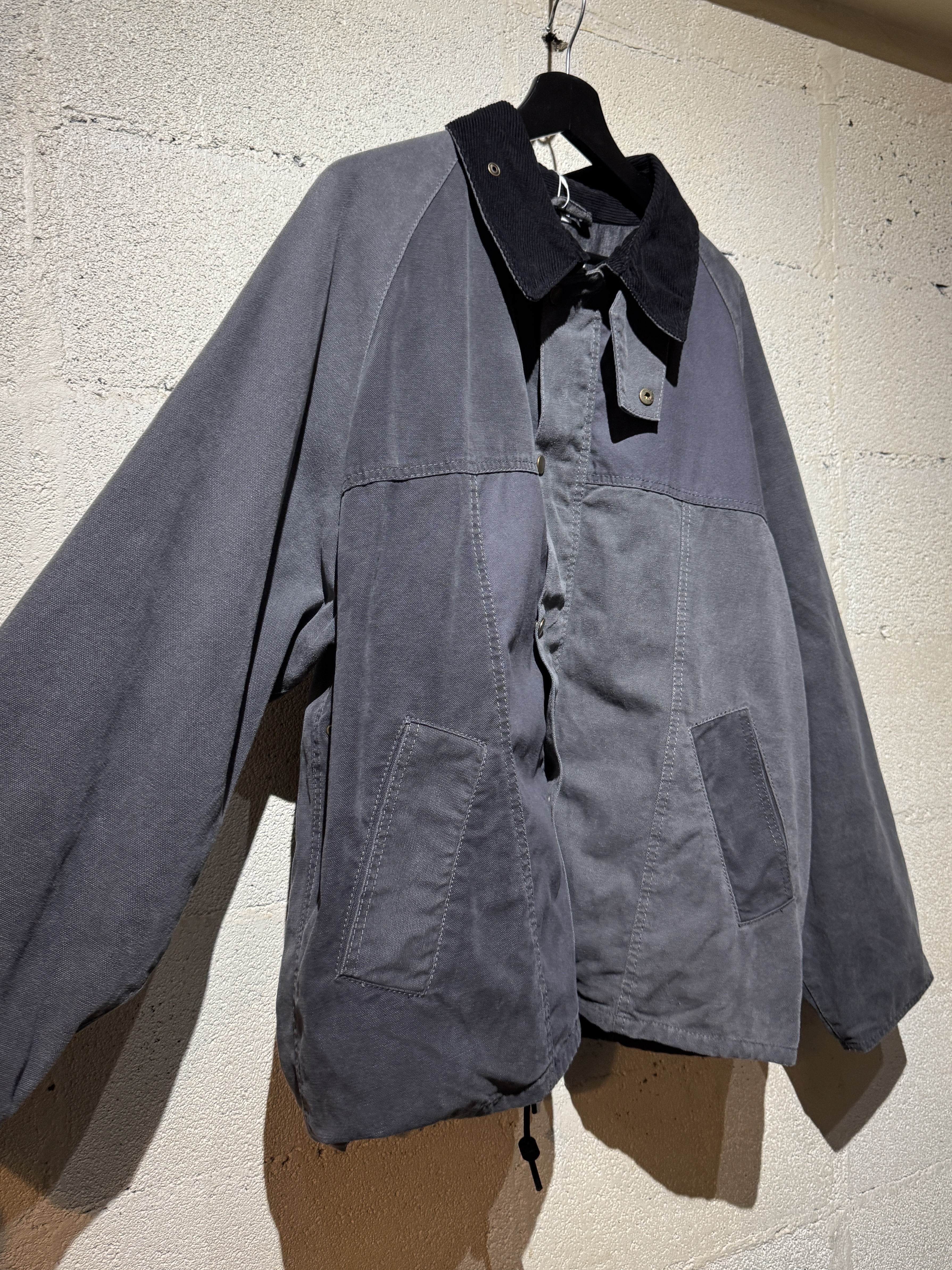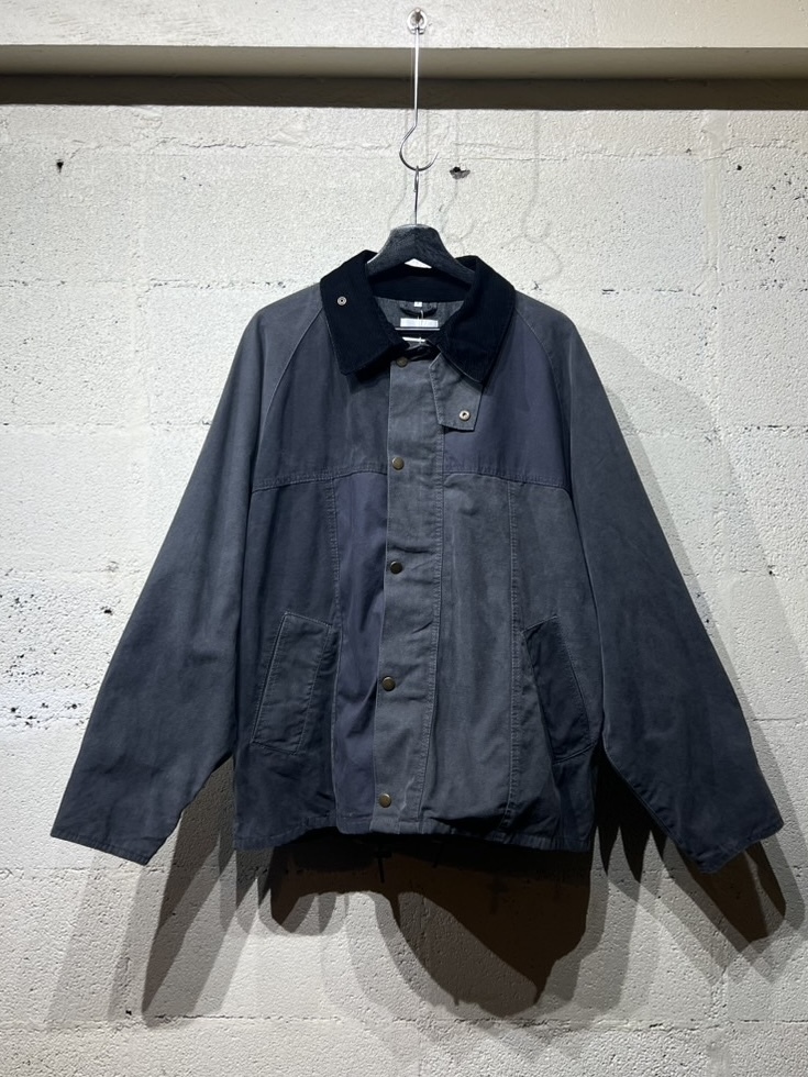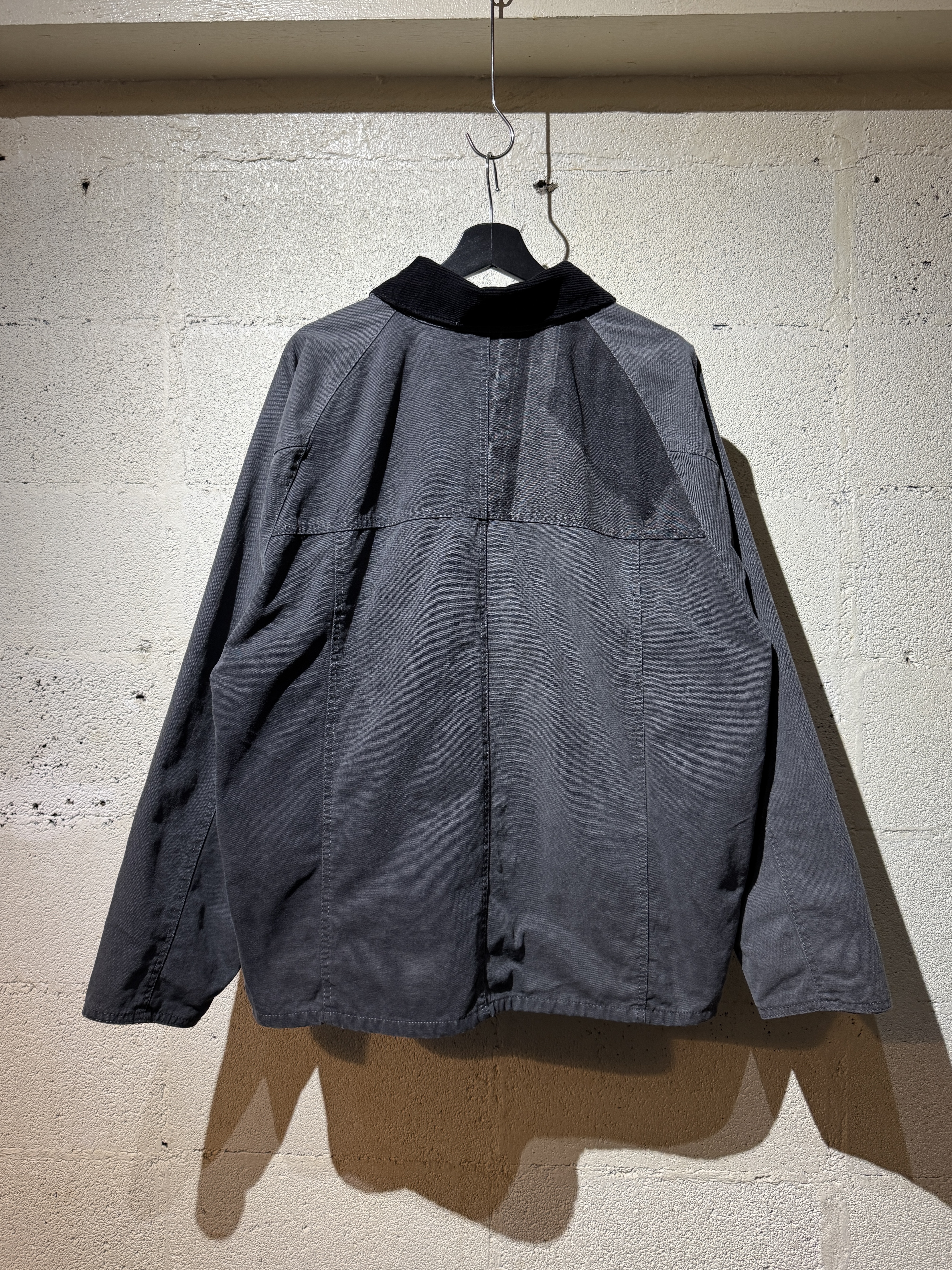 ダックジャケットで有名な某ワークブランドのパンツなどを解体し再構築したダック地のドライバーズジャケットです。yousedの定番レザードライバーズジャケットのダック地バージョンになります。身幅はややワイドめ、また着丈はショートのBOXシルエットのフォルムになります。襟はコーデュロイのチンストラップ付き、フロントはスナップボタンとジッパーの組み合わせです。裏地もそう古くはありませんが長く使用されず保管されたデッドストックのシャンブレーブラックを使用してあります。また袖内は二重構造のスナップ付きで風が入るのを防ぐ仕様です。余計なディテールは排除されたスタンダードなモデルですがシルエットに特に気を配った着回しのきくyousedのロングセラーモデルです。 詳細寸法 サイズ2 ゆき丈:88cm 身幅:69cm 着丈68cm
