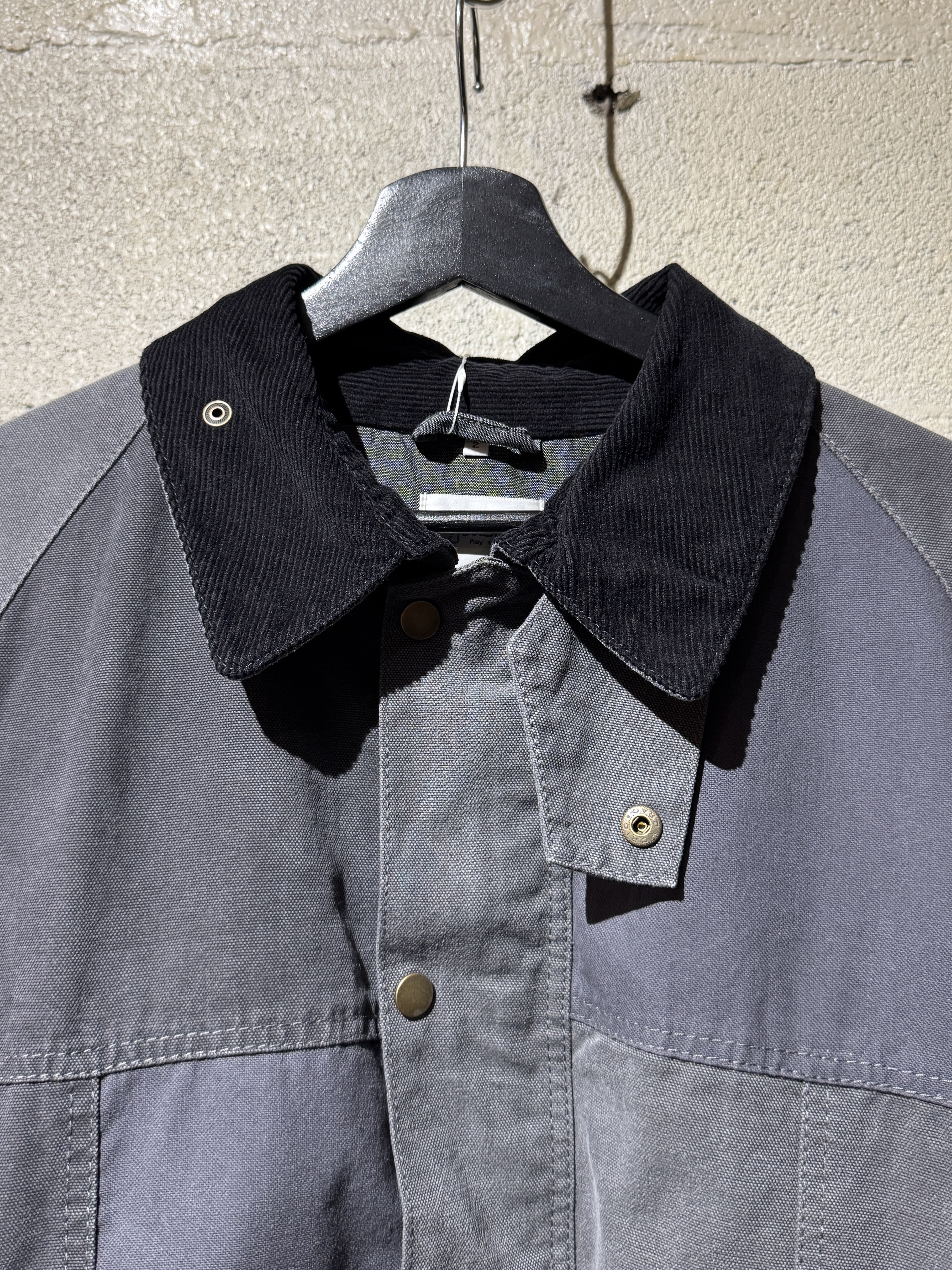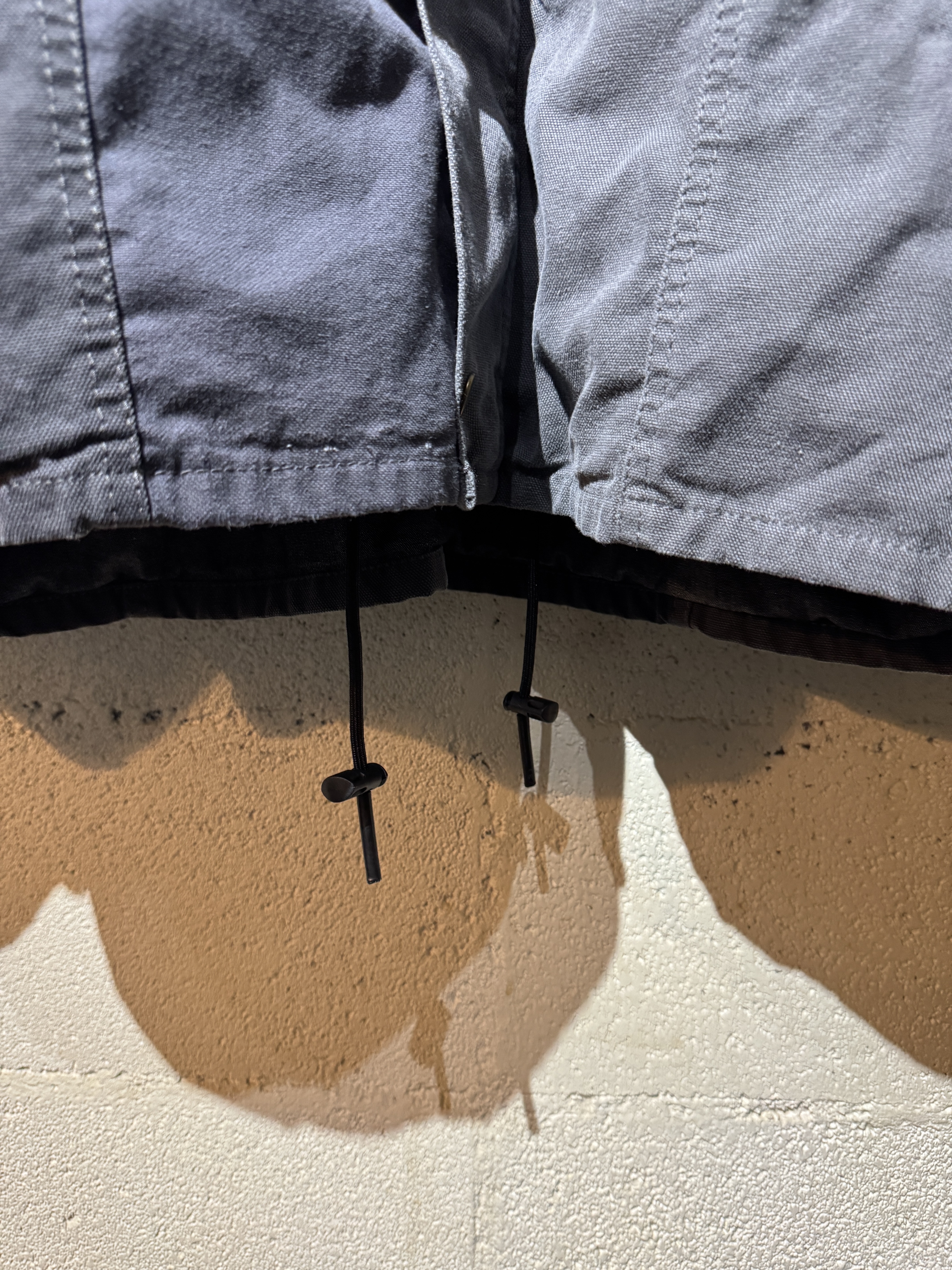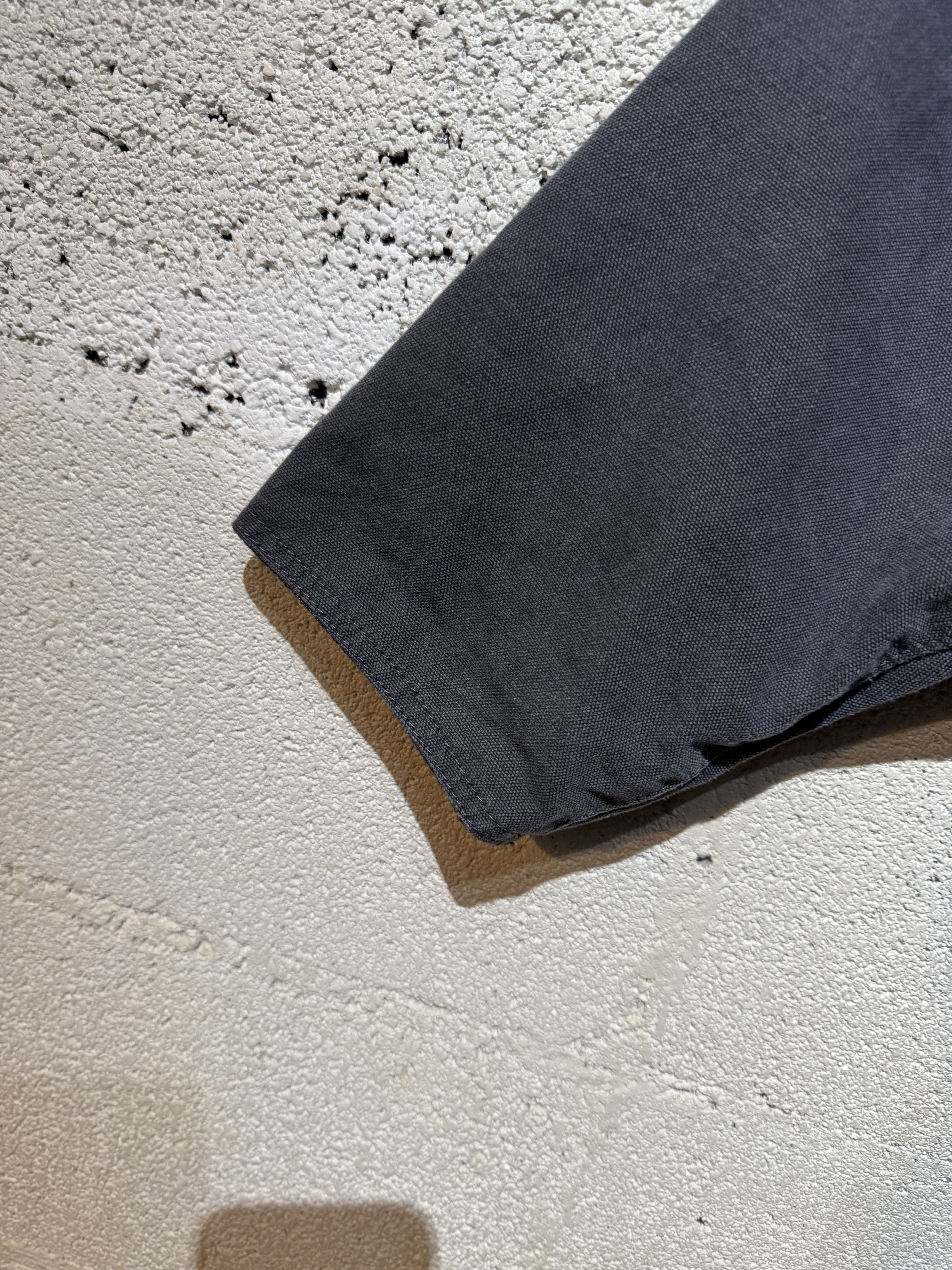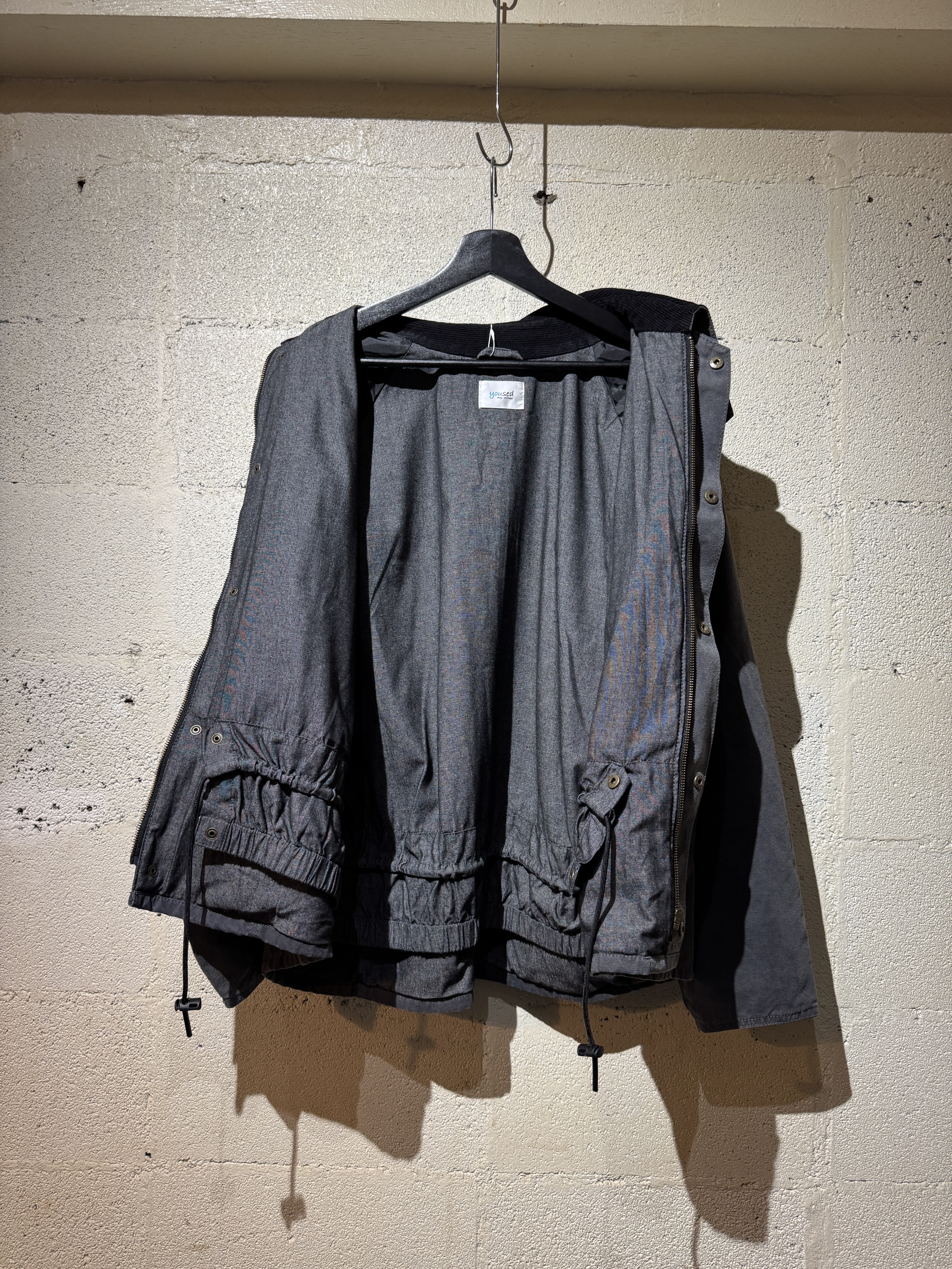 ダックジャケットで有名な某ワークブランドのパンツなどを解体し再構築したダック地のドライバーズジャケットです。yousedの定番レザードライバーズジャケットのダック地バージョンになります。身幅はややワイドめ、また着丈はショートのBOXシルエットのフォルムになります。襟はコーデュロイのチンストラップ付き、フロントはスナップボタンとジッパーの組み合わせです。裏地もそう古くはありませんが長く使用されず保管されたデッドストックのシャンブレーブラックを使用してあります。また袖内は二重構造のスナップ付きで風が入るのを防ぐ仕様です。余計なディテールは排除されたスタンダードなモデルですがシルエットに特に気を配った着回しのきくyousedのロングセラーモデルです。 詳細寸法 サイズ2 ゆき丈:88cm 身幅:69cm 着丈68cm