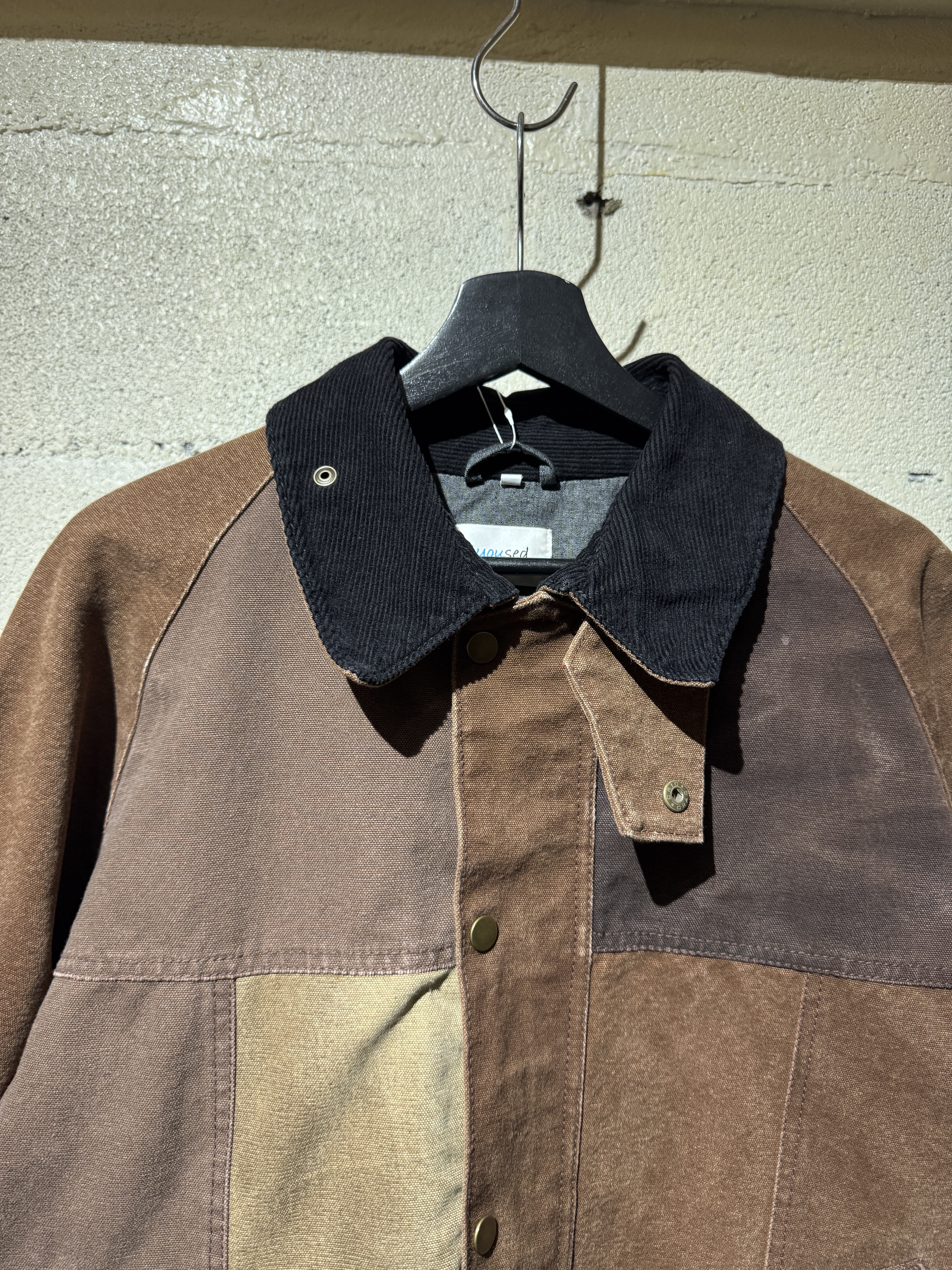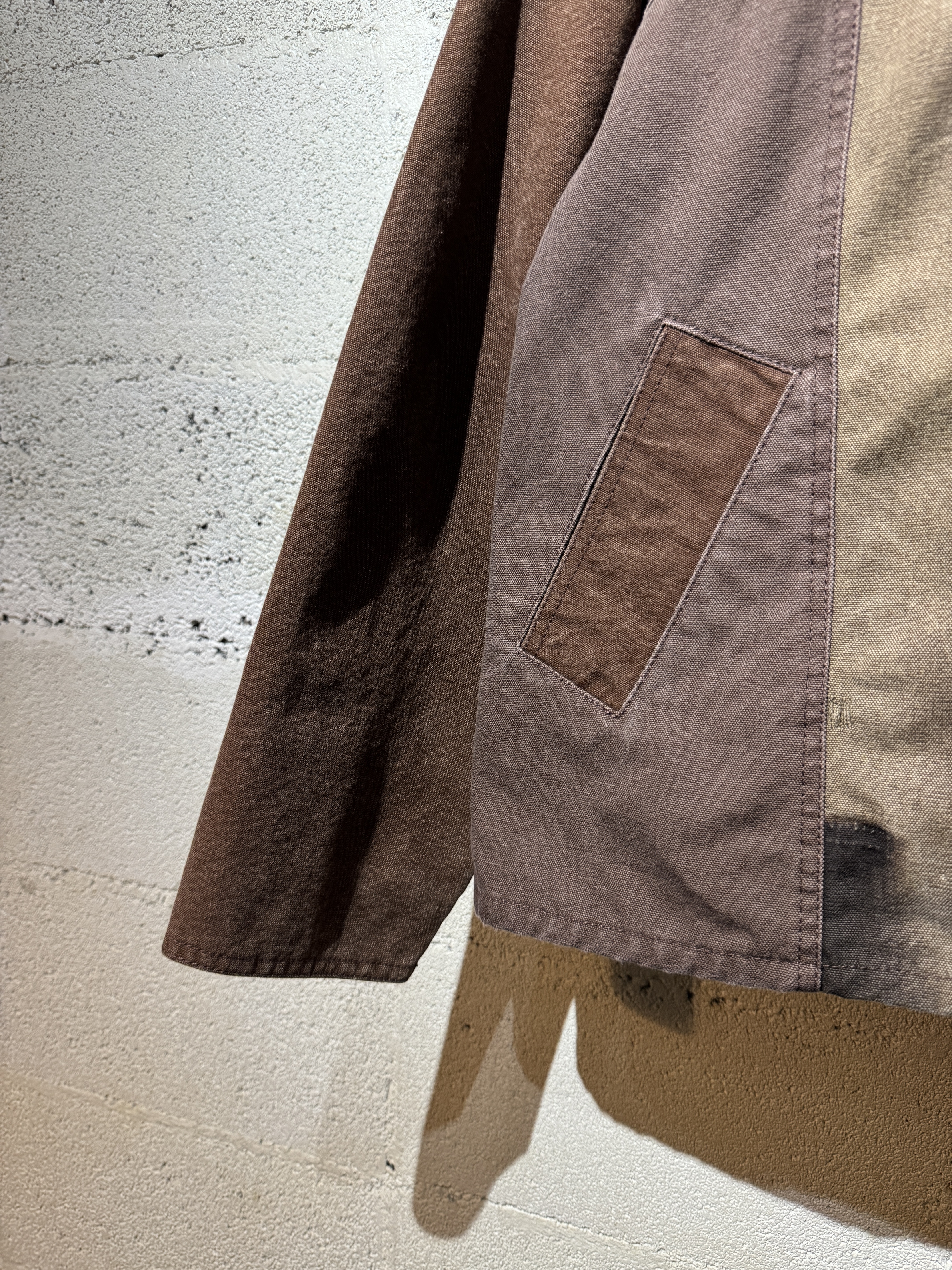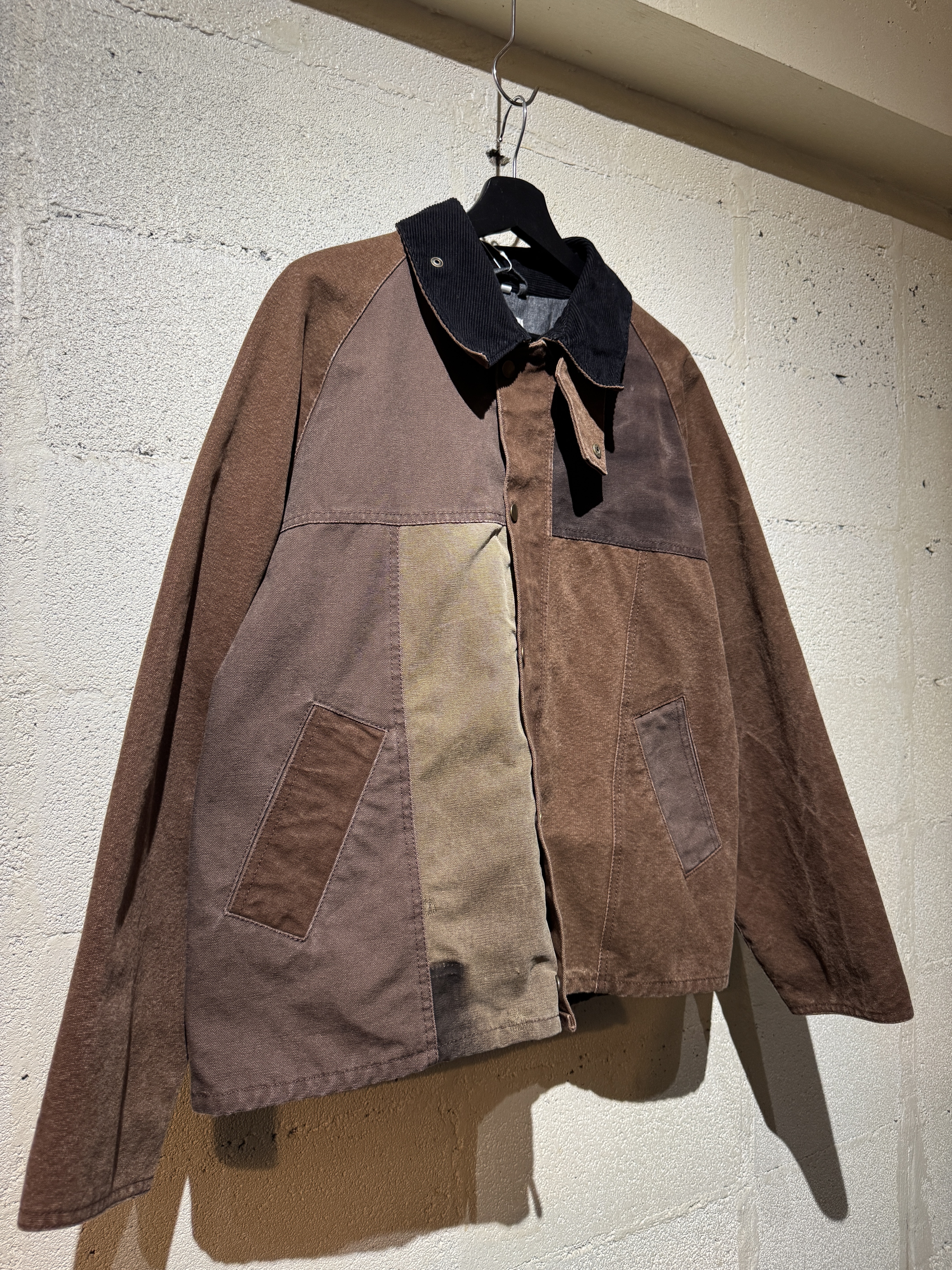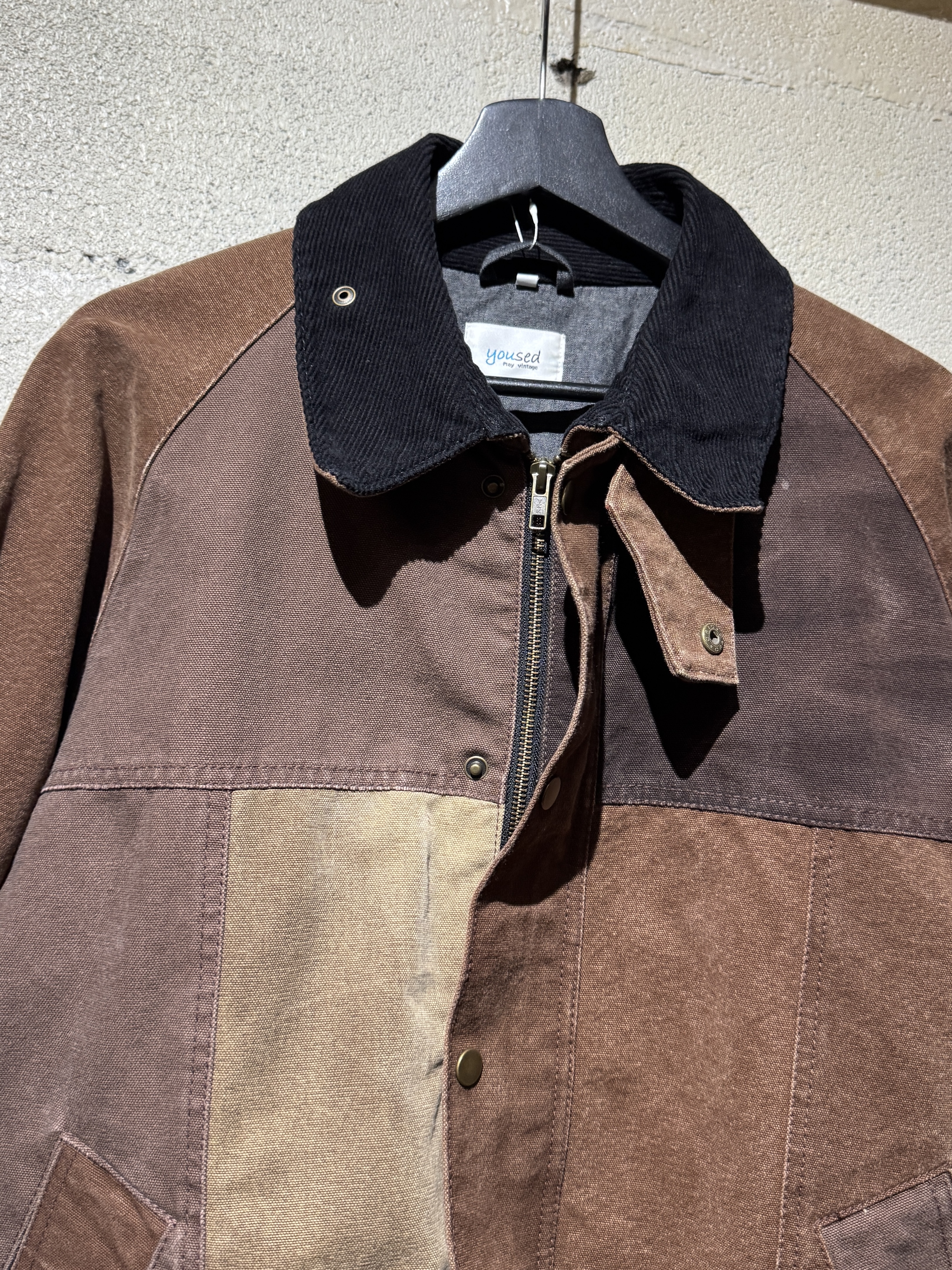ダックジャケットで有名な某ワークブランドのパンツなどを解体し再構築したダック地のドライバーズジャケットです。yousedの定番レザードライバーズジャケットのダック地バージョンになります。身幅はややワイドめ、また着丈はショートのBOXシルエットのフォルムになります。襟はコーデュロイのチンストラップ付き、フロントはスナップボタンとジッパーの組み合わせです。裏地もそう古くはありませんが長く使用されず保管されたデッドストックのシャンブレーブラックを使用してあります。また袖内は二重構造のスナップ付きで風が入るのを防ぐ仕様です。余計なディテールは排除されたスタンダードなモデルですがシルエットに特に気を配った着回しのきくyousedのロングセラーモデルです。 詳細寸法 サイズ1 ゆき丈:86cm 身幅:67cm 着丈66cm