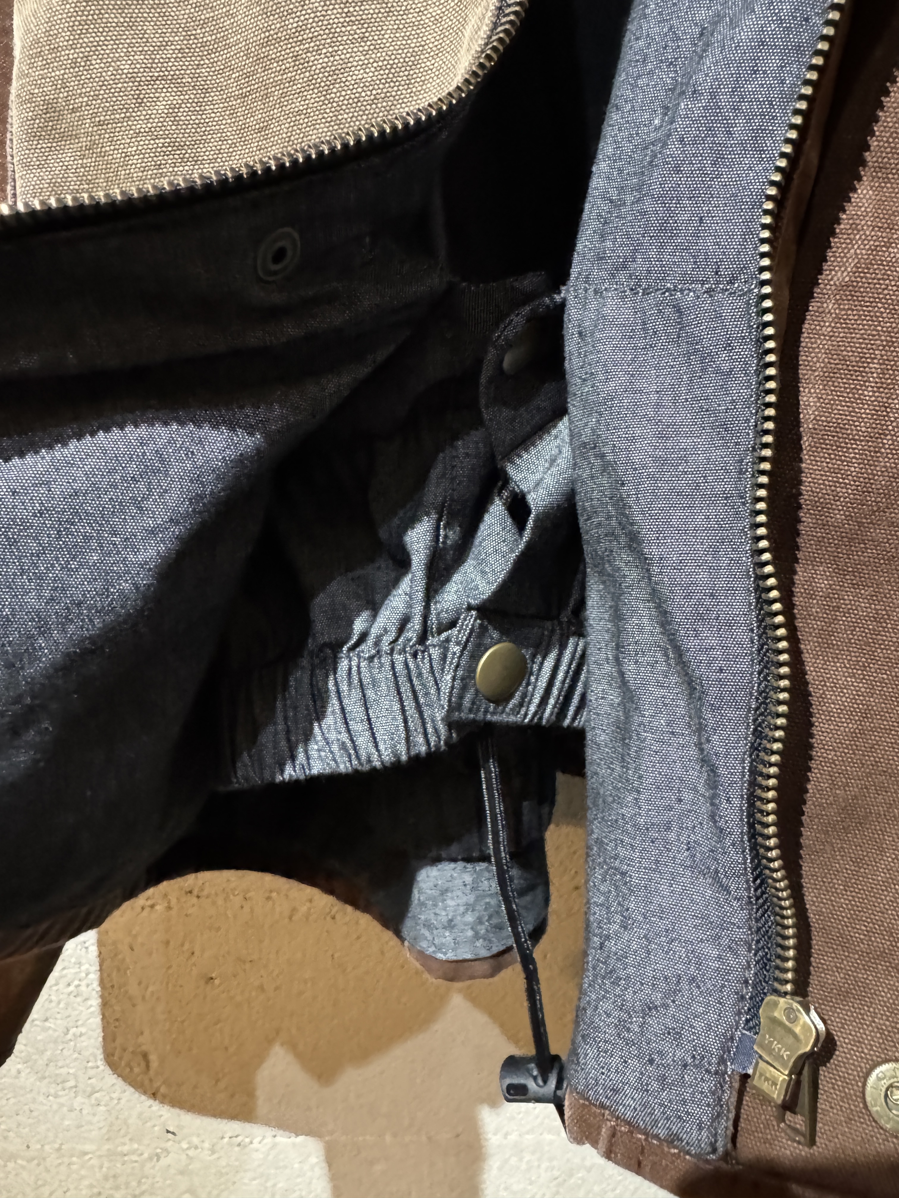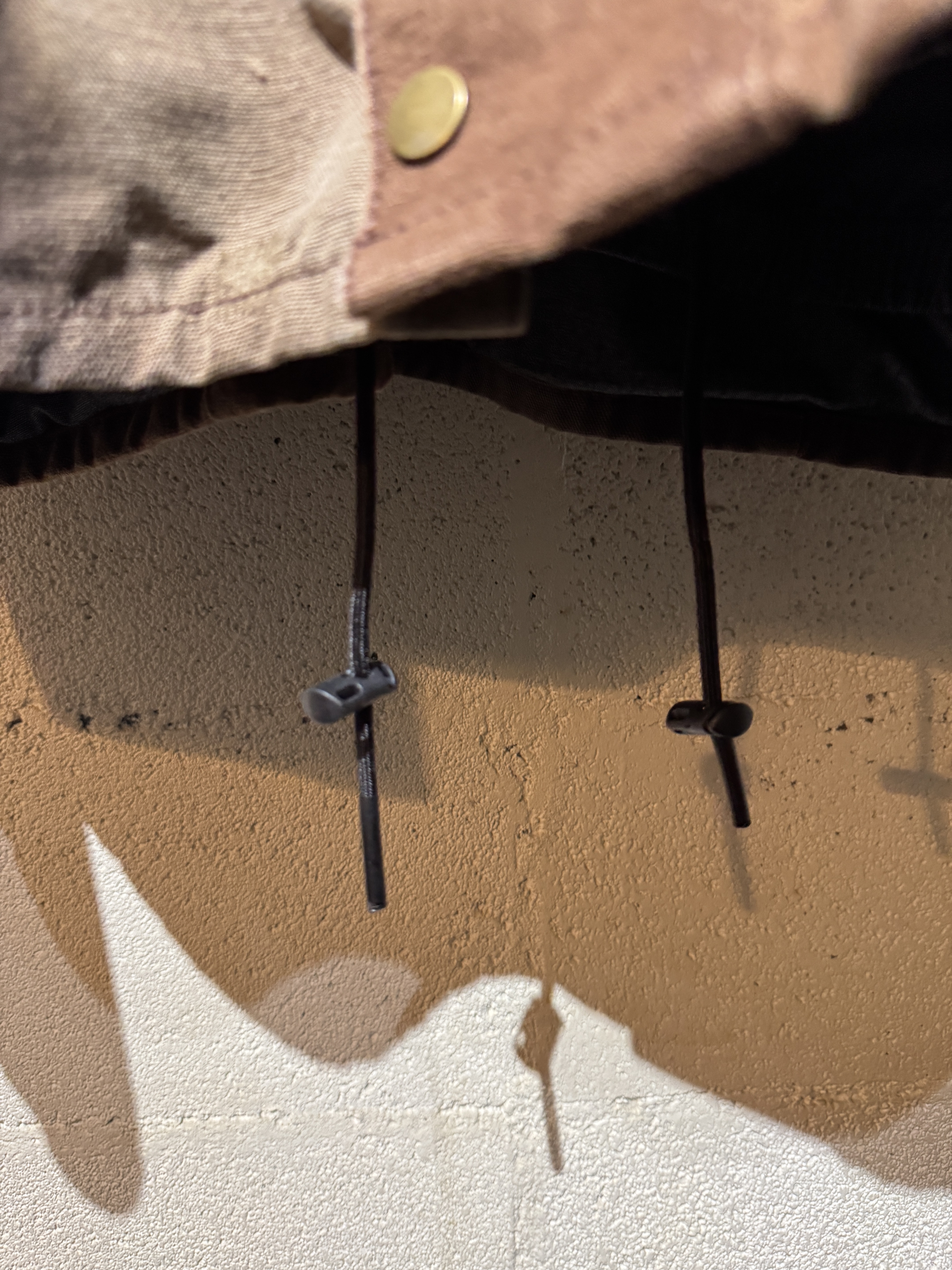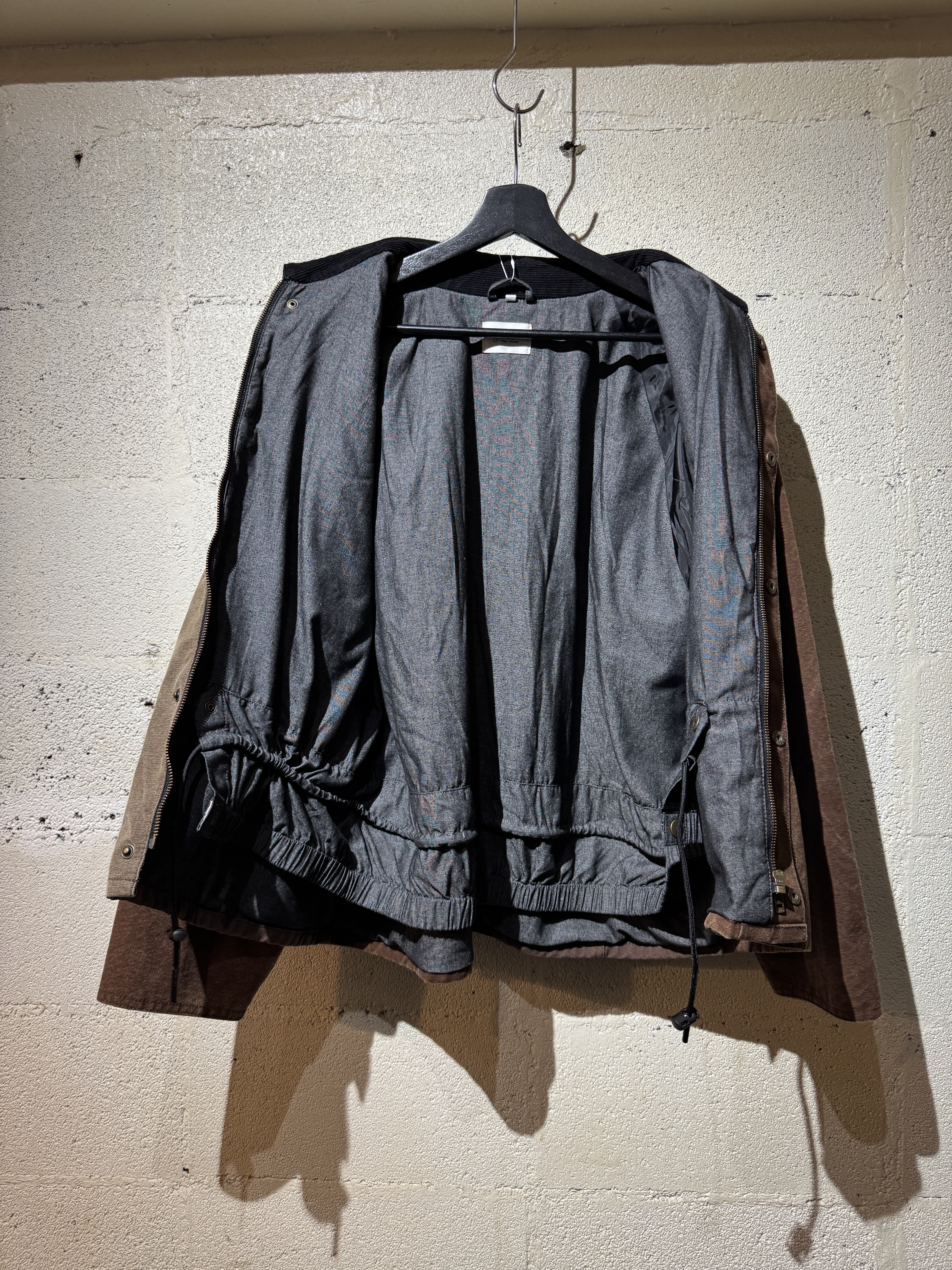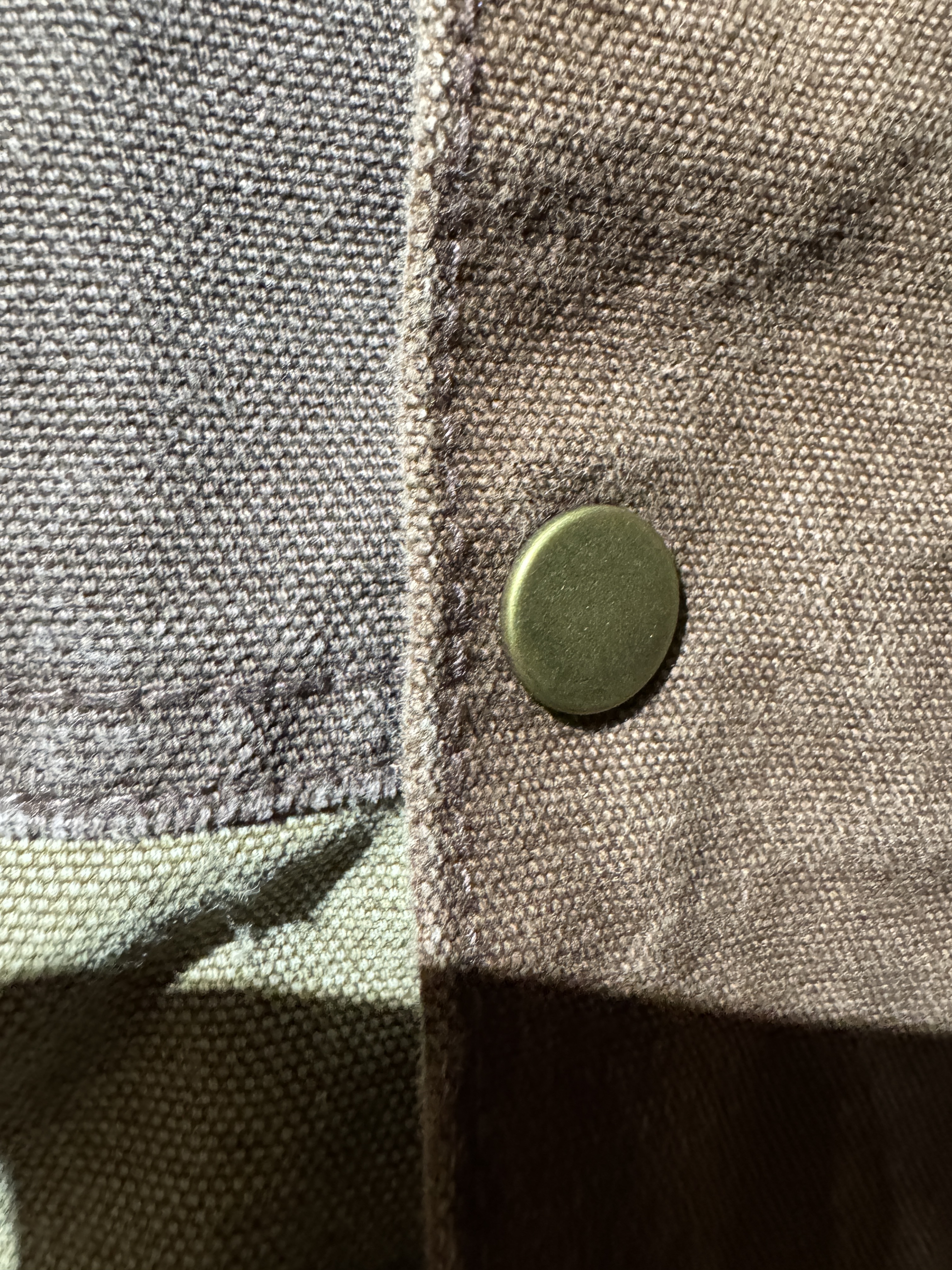 ダックジャケットで有名な某ワークブランドのパンツなどを解体し再構築したダック地のドライバーズジャケットです。yousedの定番レザードライバーズジャケットのダック地バージョンになります。身幅はややワイドめ、また着丈はショートのBOXシルエットのフォルムになります。襟はコーデュロイのチンストラップ付き、フロントはスナップボタンとジッパーの組み合わせです。裏地もそう古くはありませんが長く使用されず保管されたデッドストックのシャンブレーブラックを使用してあります。また袖内は二重構造のスナップ付きで風が入るのを防ぐ仕様です。余計なディテールは排除されたスタンダードなモデルですがシルエットに特に気を配った着回しのきくyousedのロングセラーモデルです。 詳細寸法 サイズ1 ゆき丈:86cm 身幅:67cm 着丈66cm