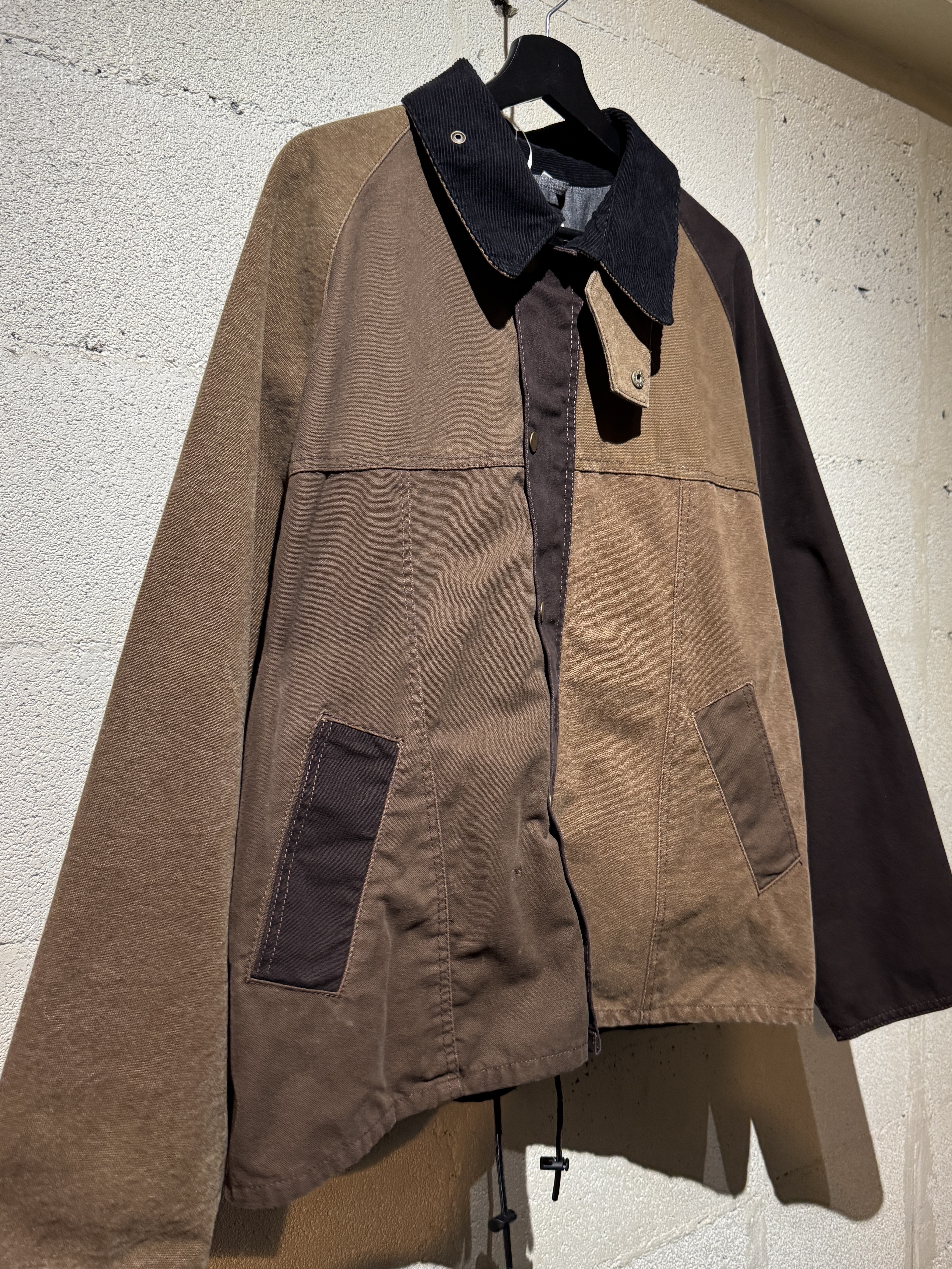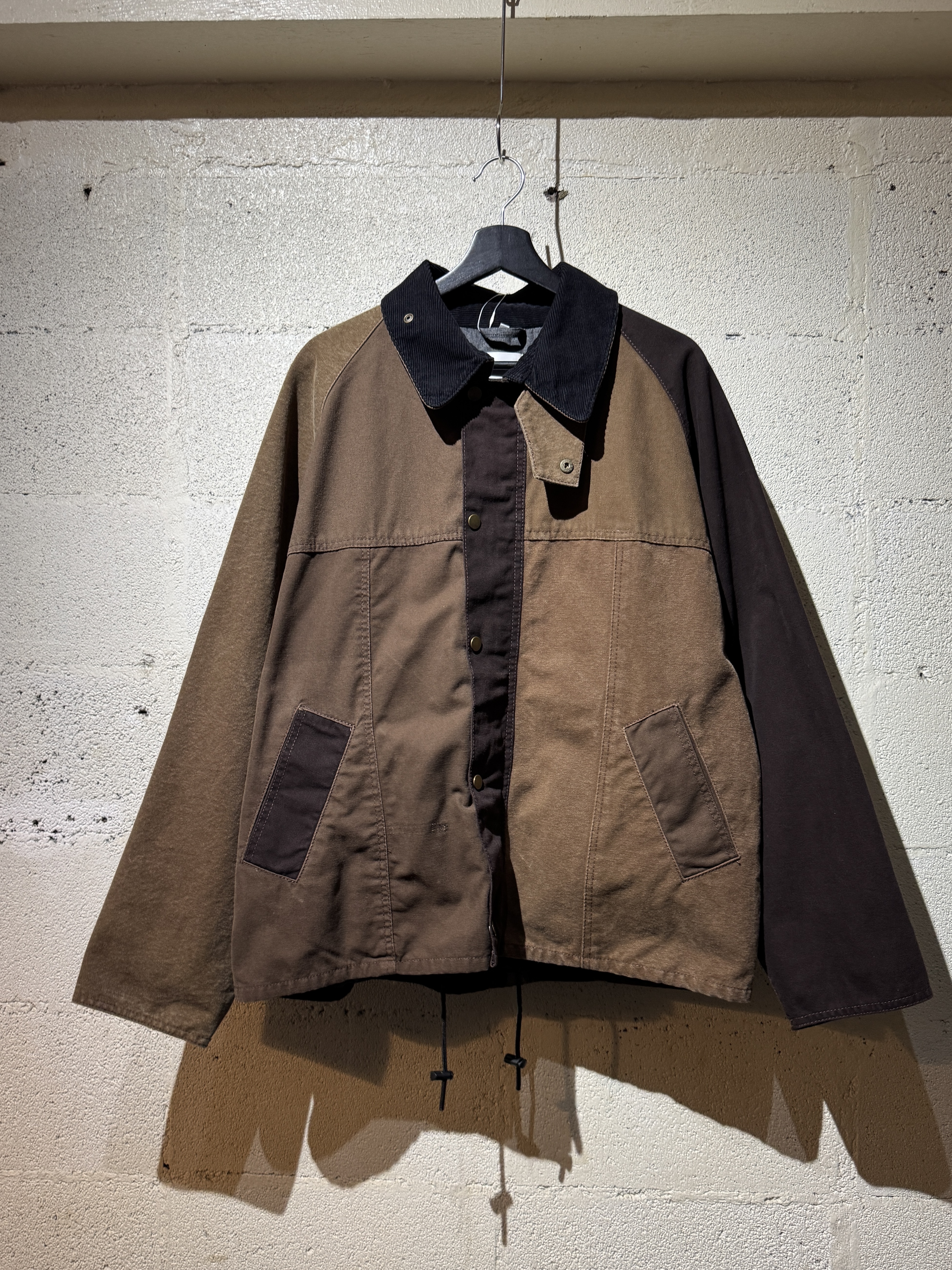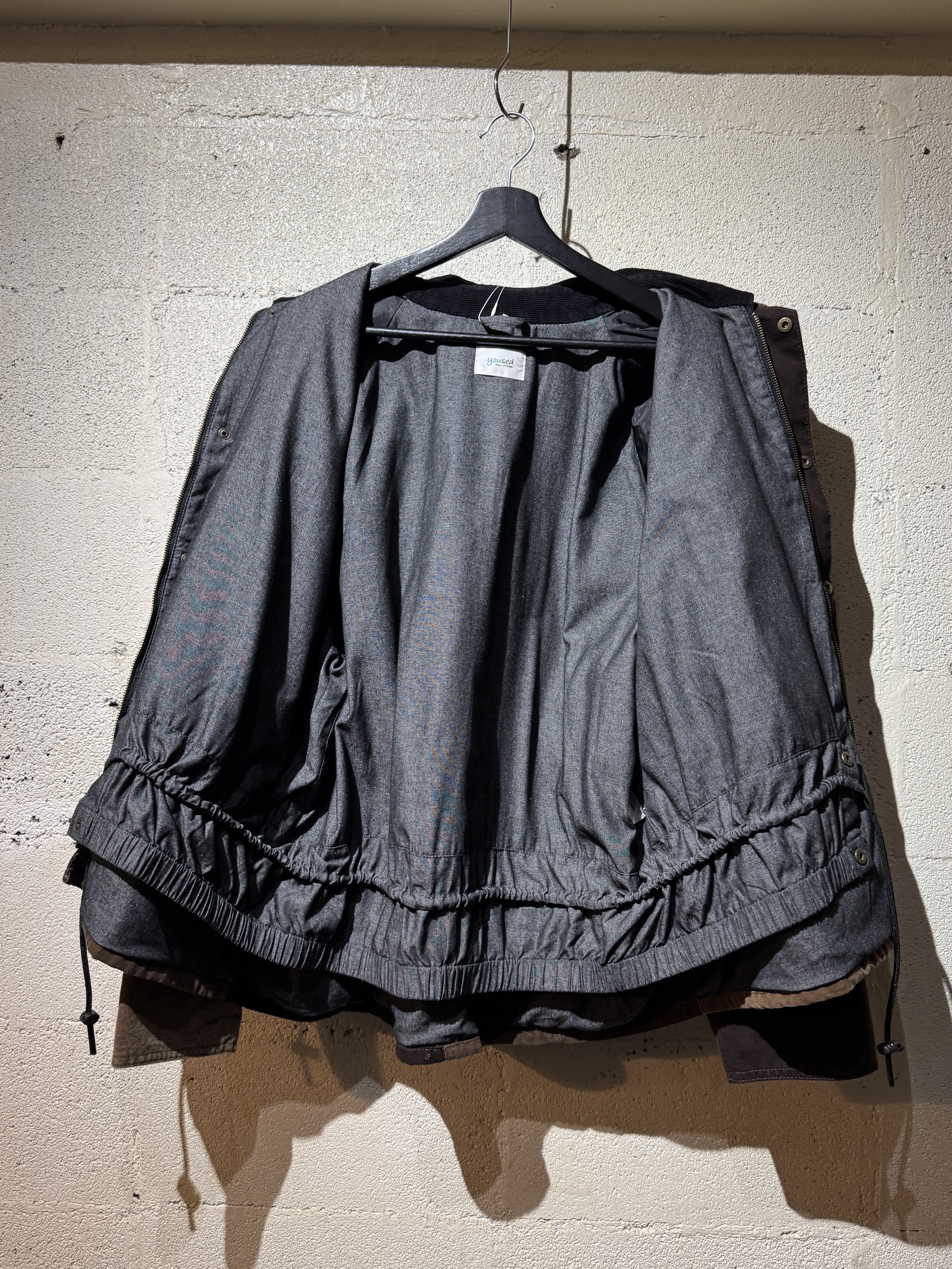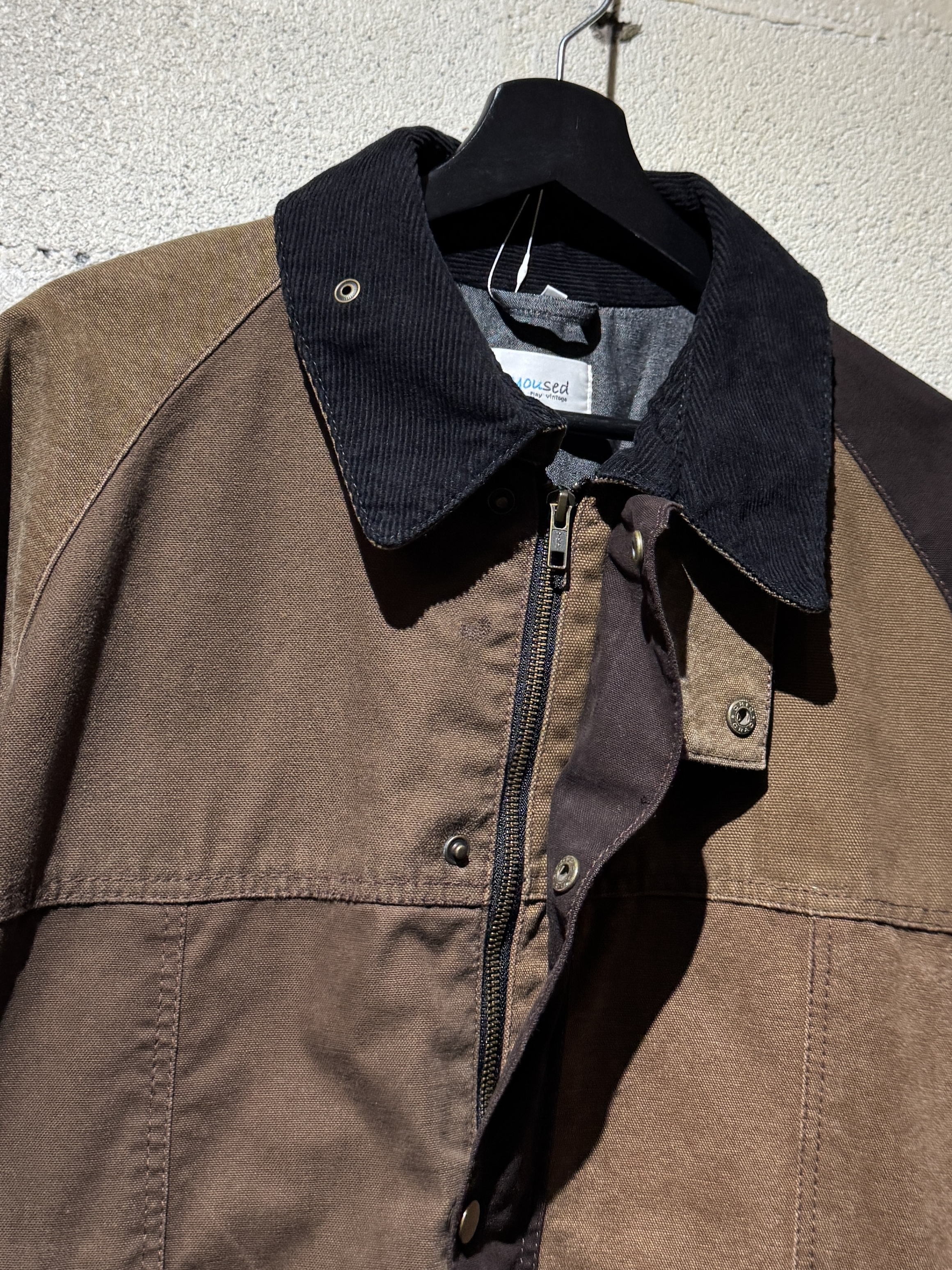 ダックジャケットで有名な某ワークブランドのパンツなどを解体し再構築したダック地のドライバーズジャケットです。yousedの定番レザードライバーズジャケットのダック地バージョンになります。身幅はややワイドめ、また着丈はショートのBOXシルエットのフォルムになります。襟はコーデュロイのチンストラップ付き、フロントはスナップボタンとジッパーの組み合わせです。裏地もそう古くはありませんが長く使用されず保管されたデッドストックのシャンブレーブラックを使用してあります。また袖内は二重構造のスナップ付きで風が入るのを防ぐ仕様です。余計なディテールは排除されたスタンダードなモデルですがシルエットに特に気を配った着回しのきくyousedのロングセラーモデルです。 詳細寸法 サイズ2 ゆき丈:88cm 身幅:69cm 着丈68cm