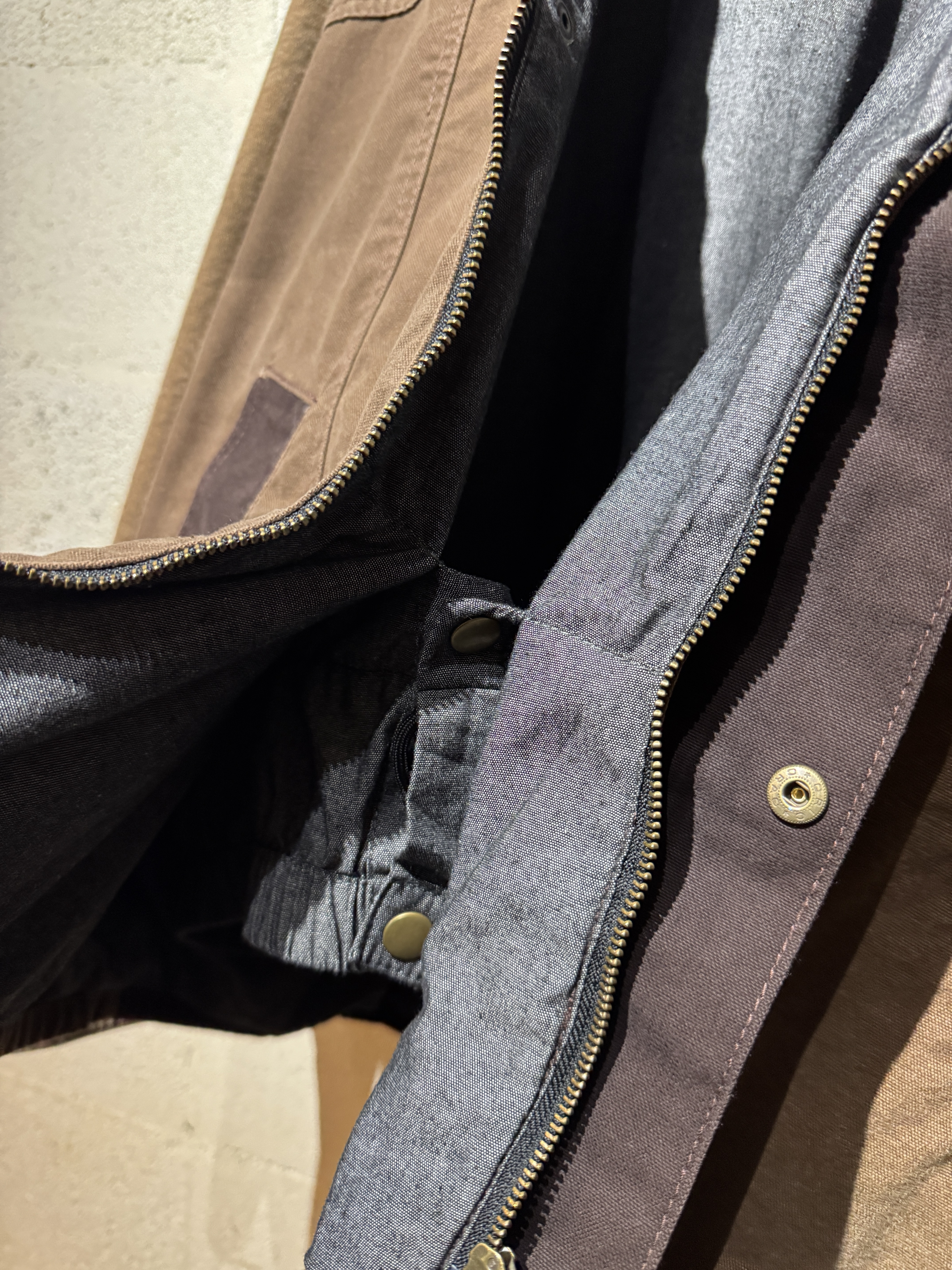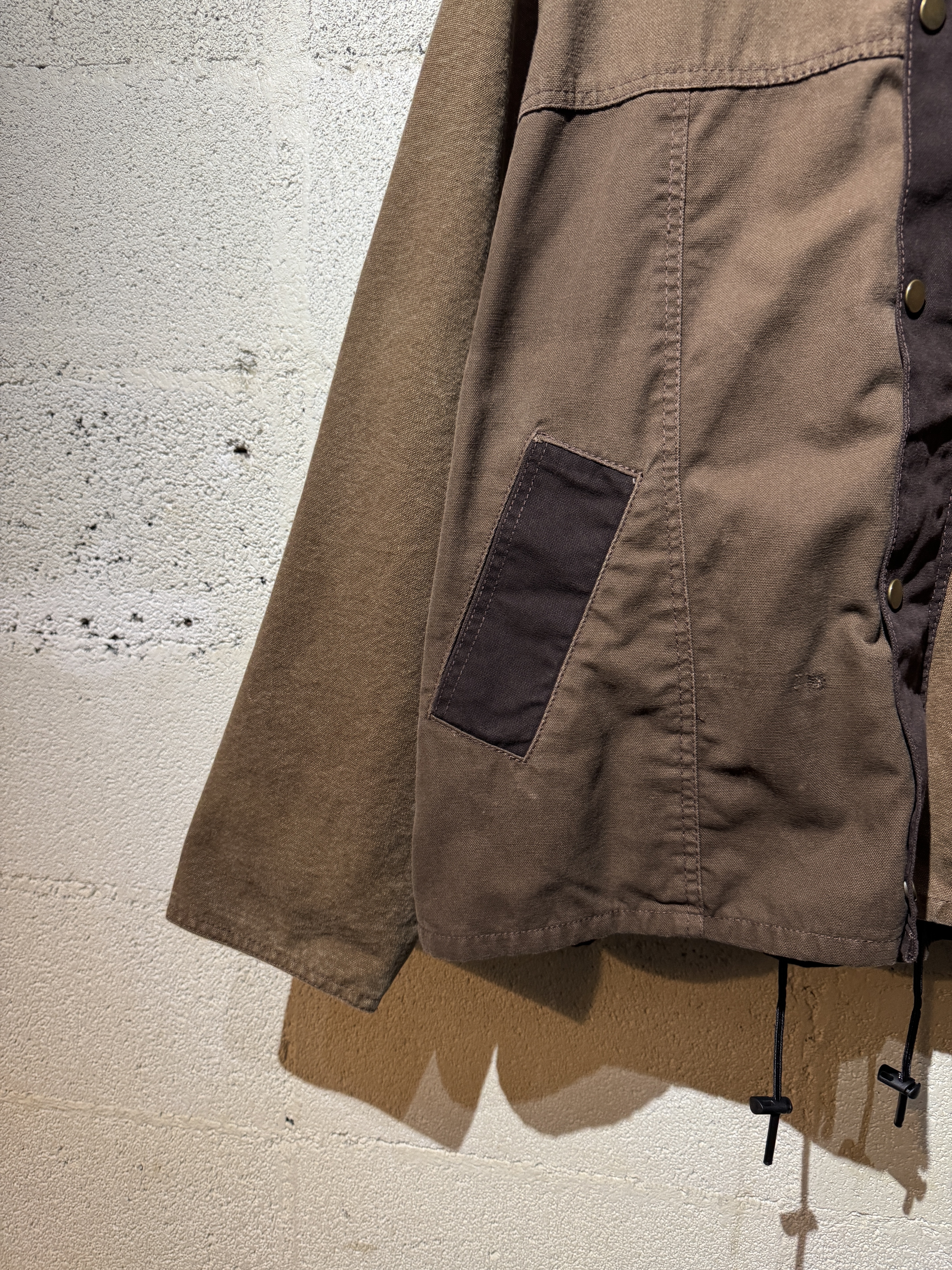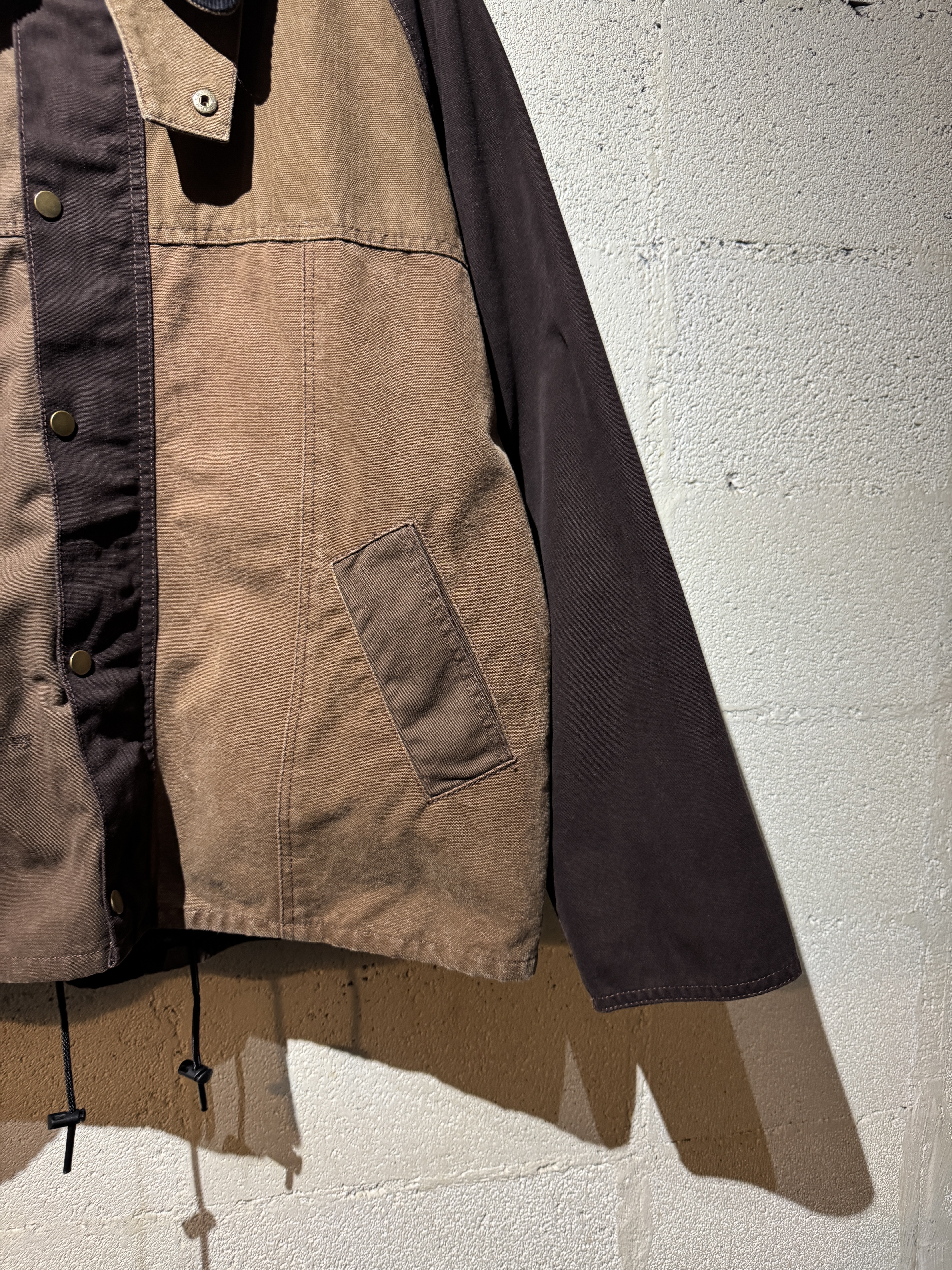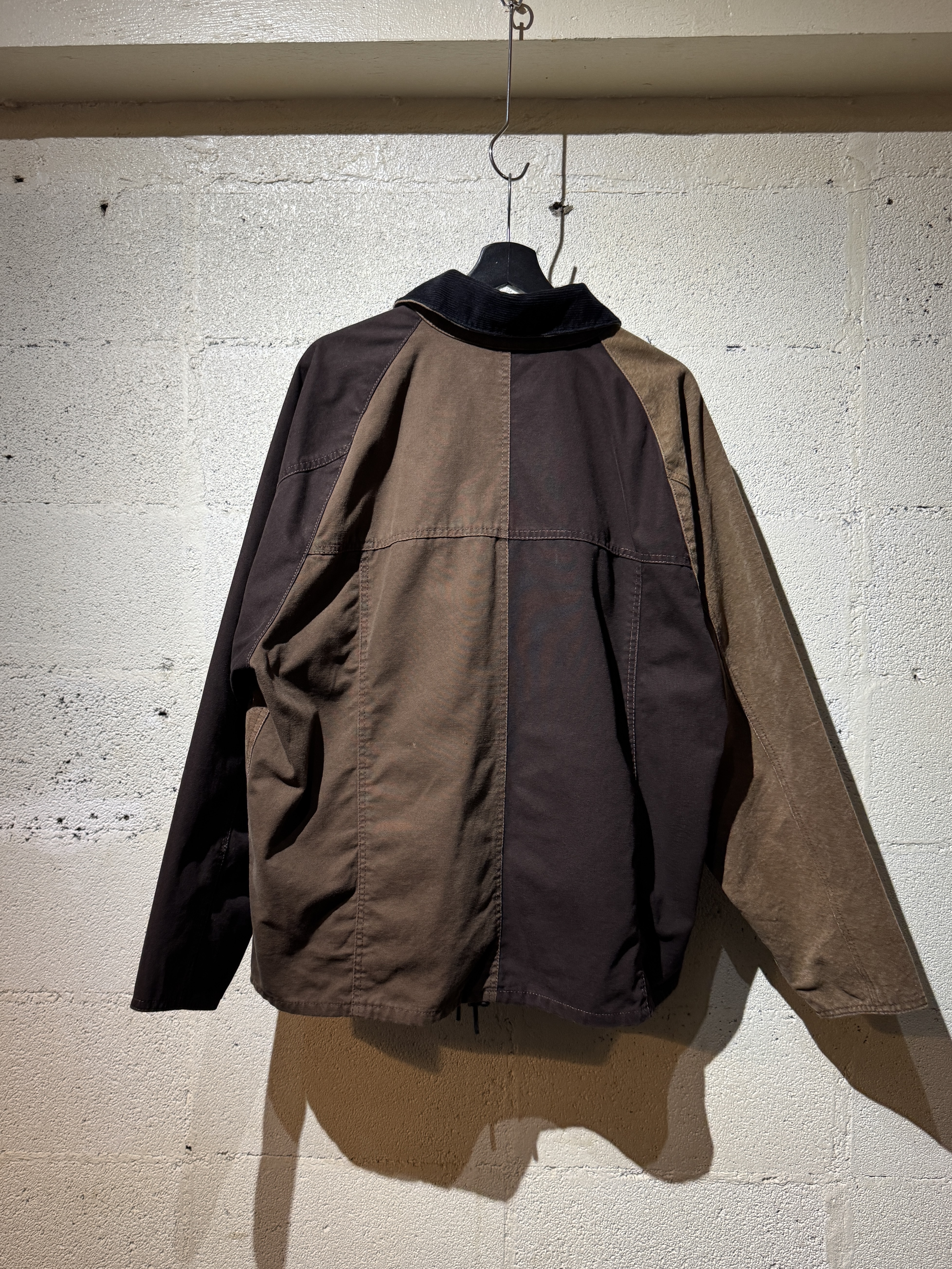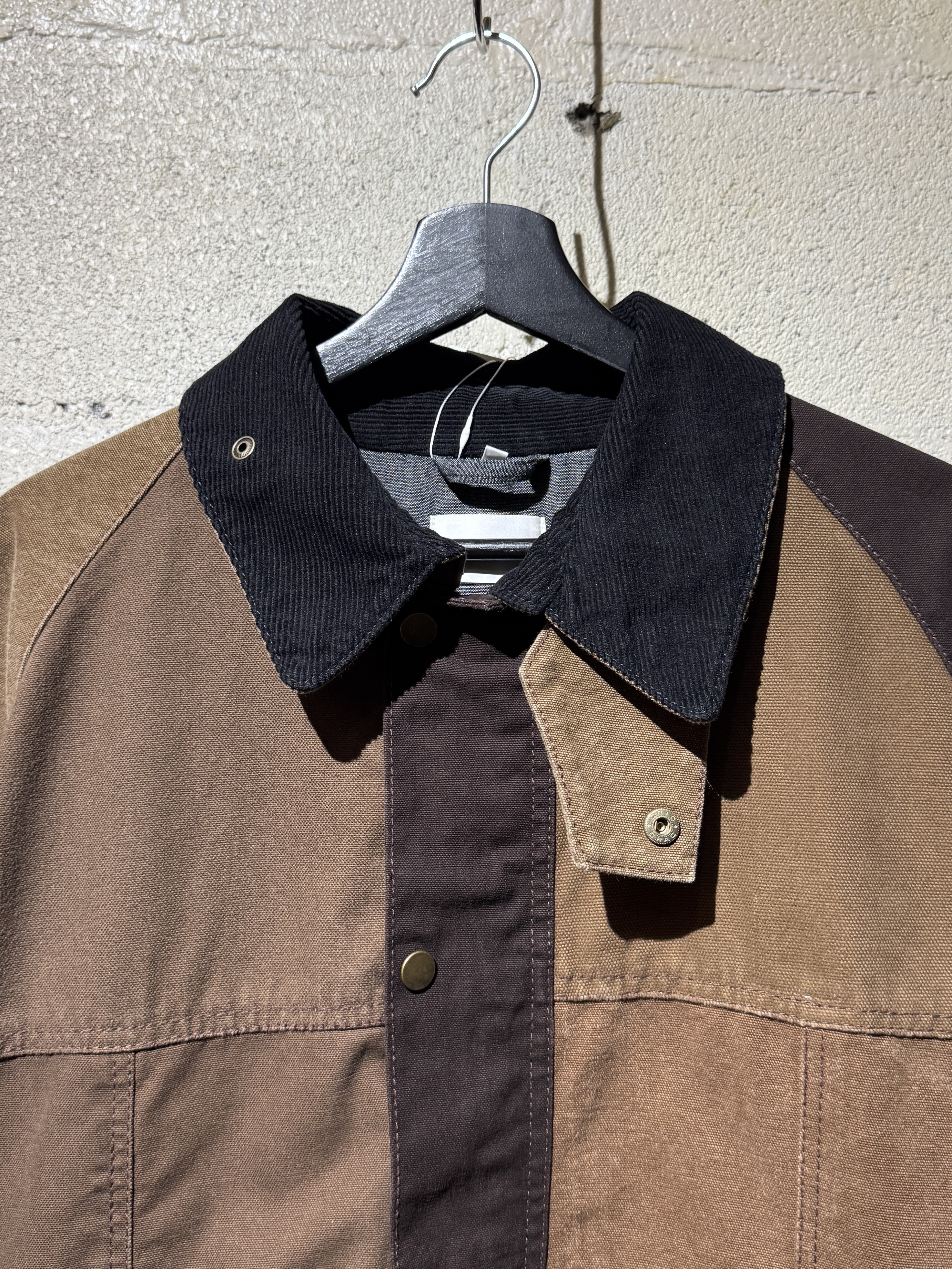 ダックジャケットで有名な某ワークブランドのパンツなどを解体し再構築したダック地のドライバーズジャケットです。yousedの定番レザードライバーズジャケットのダック地バージョンになります。身幅はややワイドめ、また着丈はショートのBOXシルエットのフォルムになります。襟はコーデュロイのチンストラップ付き、フロントはスナップボタンとジッパーの組み合わせです。裏地もそう古くはありませんが長く使用されず保管されたデッドストックのシャンブレーブラックを使用してあります。また袖内は二重構造のスナップ付きで風が入るのを防ぐ仕様です。余計なディテールは排除されたスタンダードなモデルですがシルエットに特に気を配った着回しのきくyousedのロングセラーモデルです。 詳細寸法 サイズ2 ゆき丈:88cm 身幅:69cm 着丈68cm