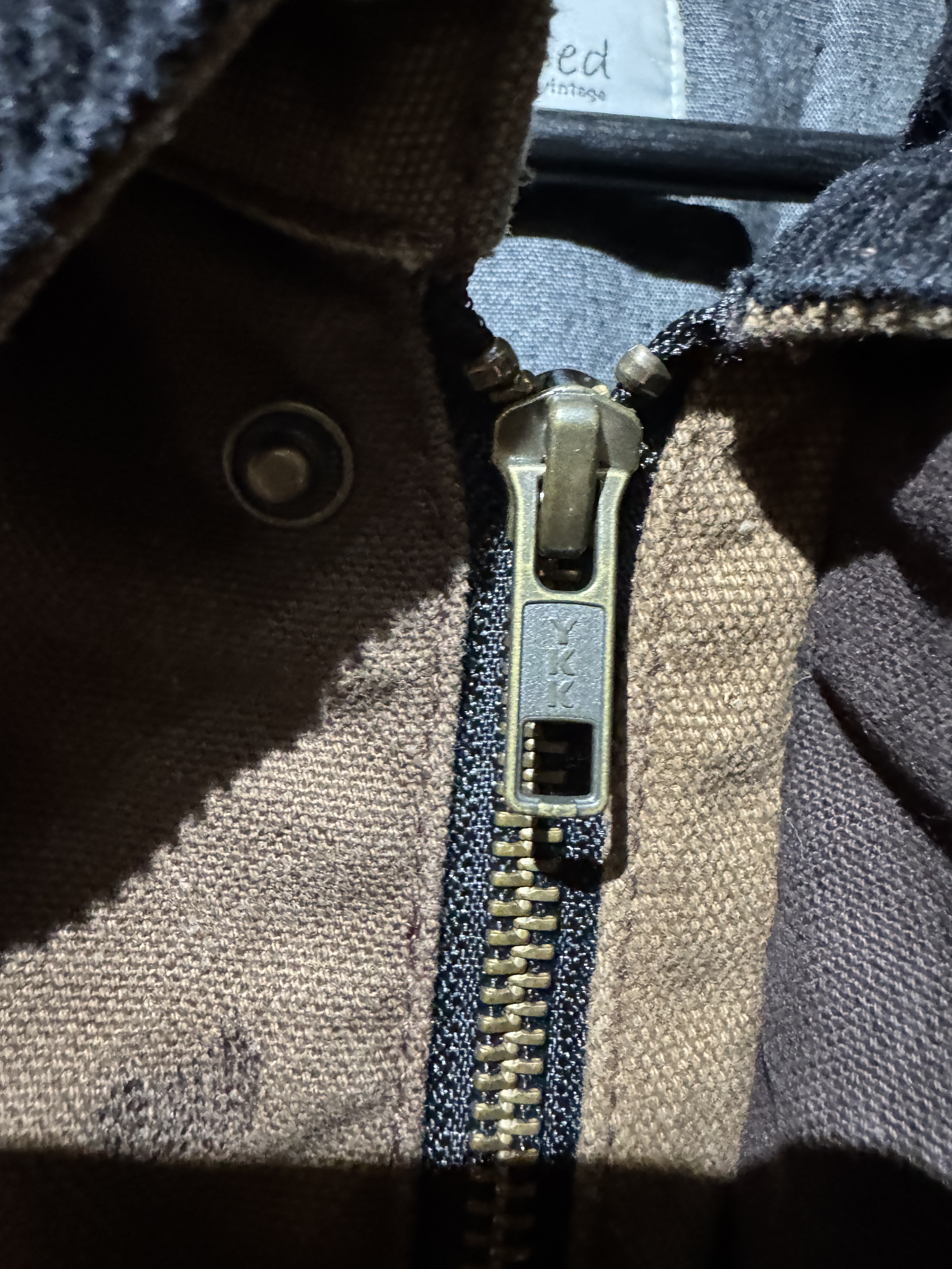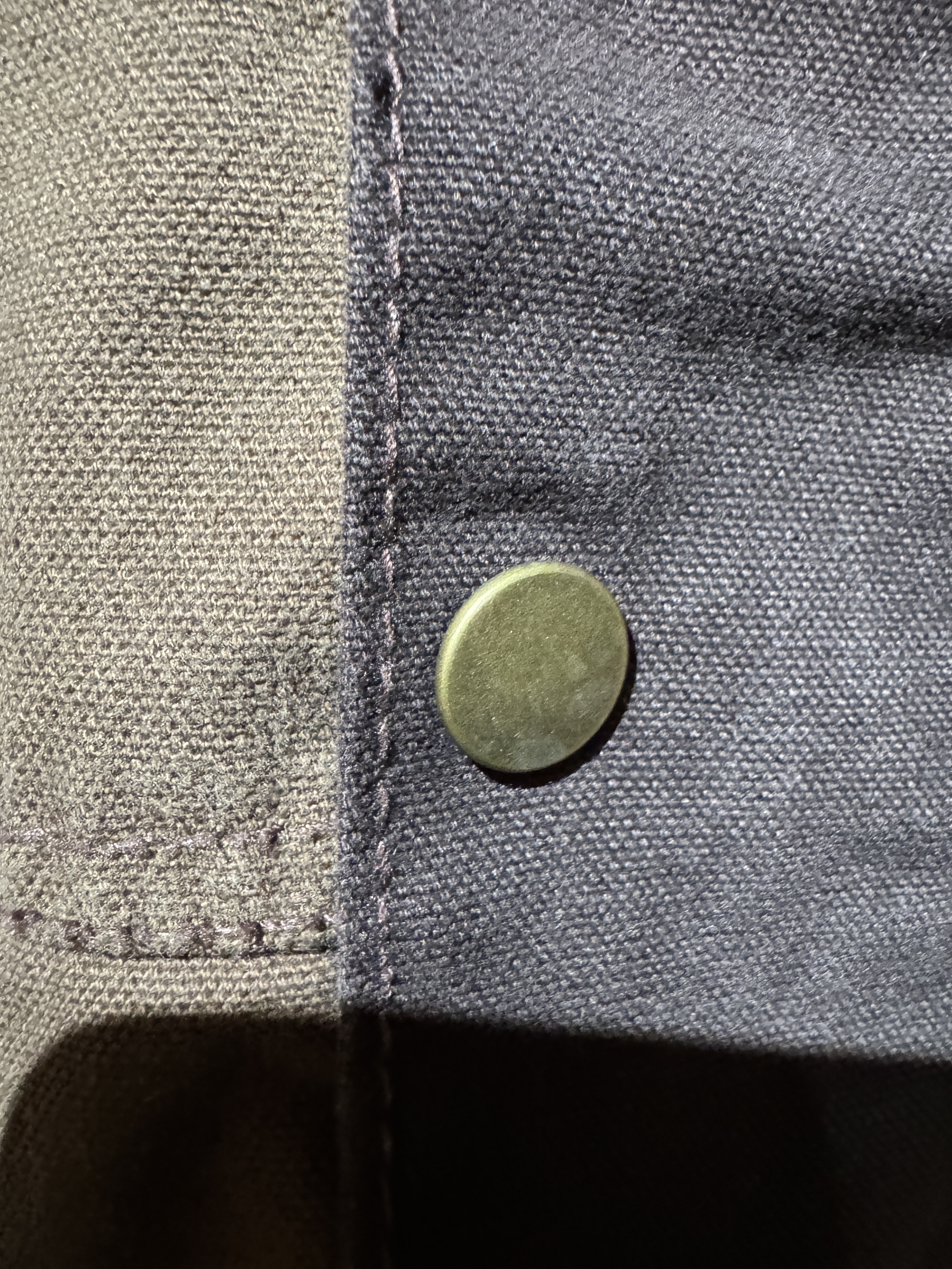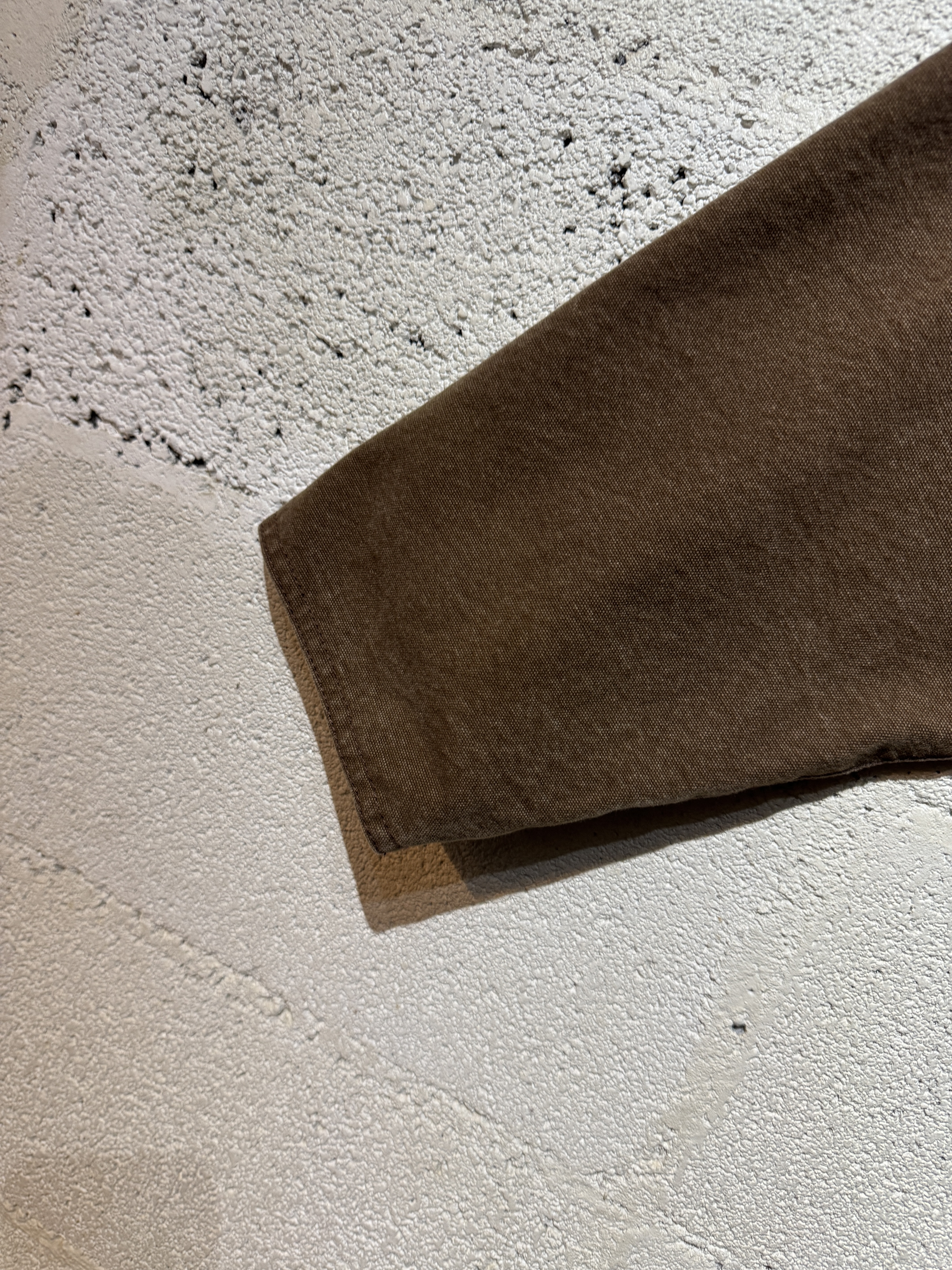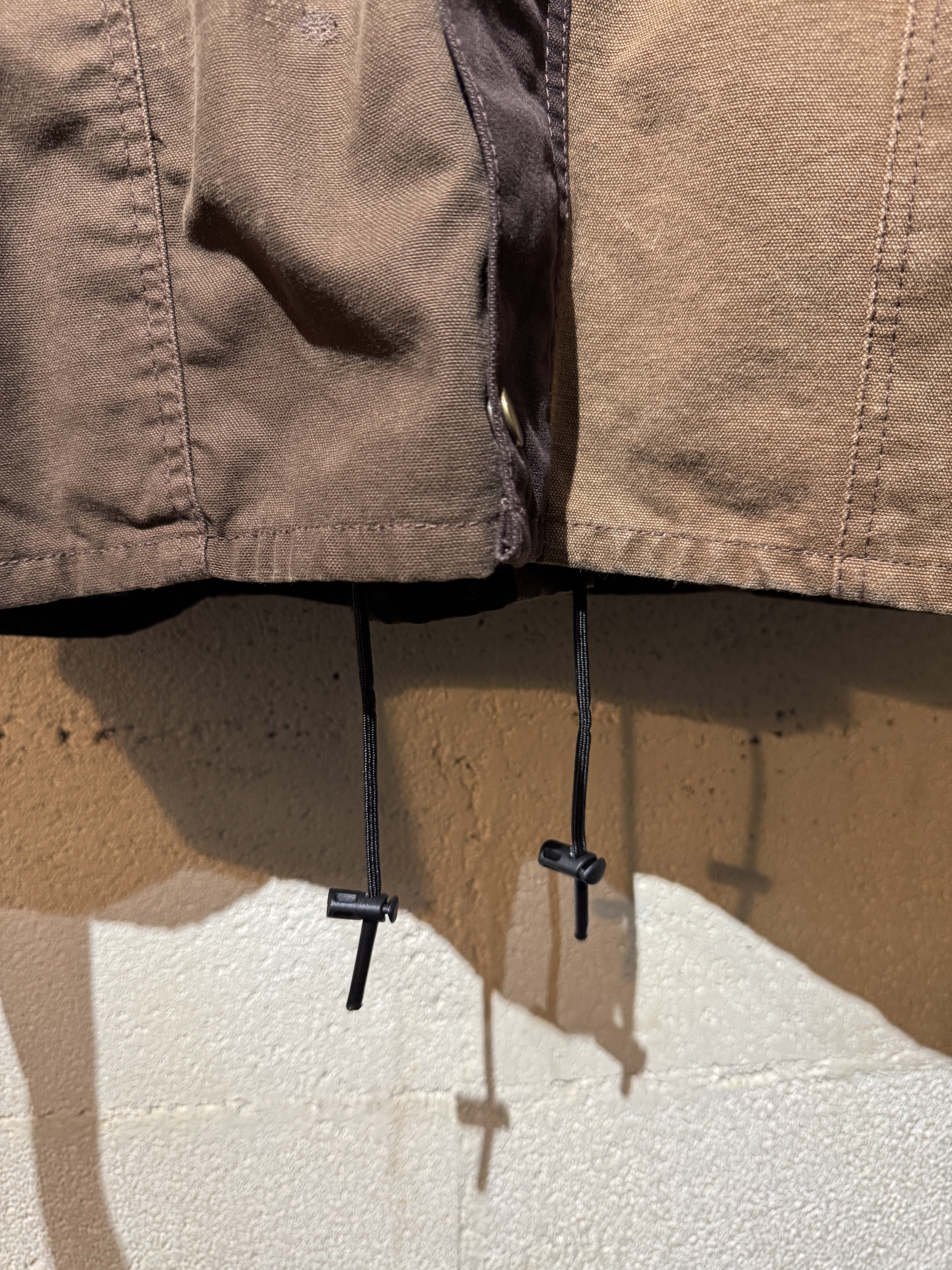 ダックジャケットで有名な某ワークブランドのパンツなどを解体し再構築したダック地のドライバーズジャケットです。yousedの定番レザードライバーズジャケットのダック地バージョンになります。身幅はややワイドめ、また着丈はショートのBOXシルエットのフォルムになります。襟はコーデュロイのチンストラップ付き、フロントはスナップボタンとジッパーの組み合わせです。裏地もそう古くはありませんが長く使用されず保管されたデッドストックのシャンブレーブラックを使用してあります。また袖内は二重構造のスナップ付きで風が入るのを防ぐ仕様です。余計なディテールは排除されたスタンダードなモデルですがシルエットに特に気を配った着回しのきくyousedのロングセラーモデルです。 詳細寸法 サイズ2 ゆき丈:88cm 身幅:69cm 着丈68cm