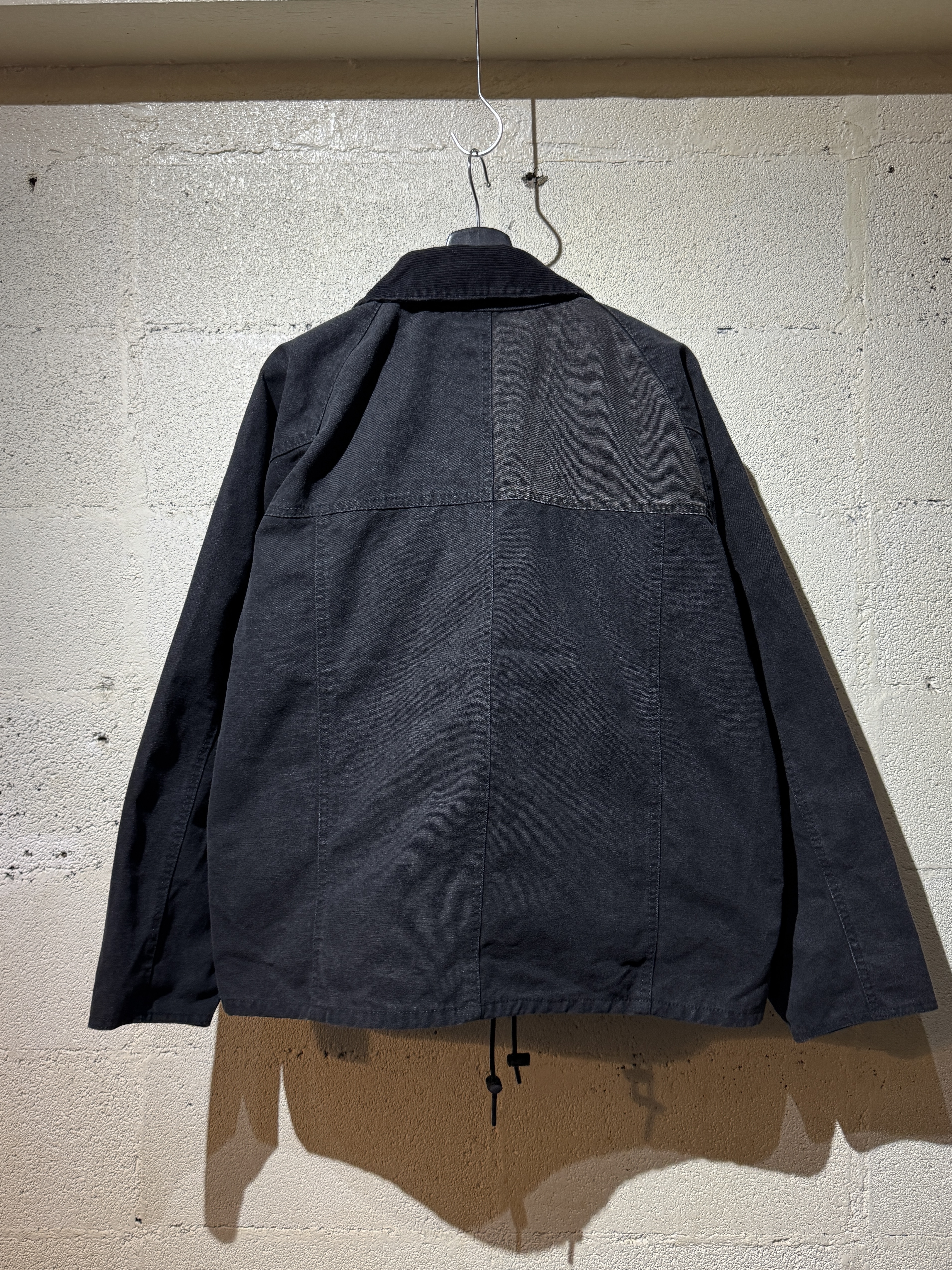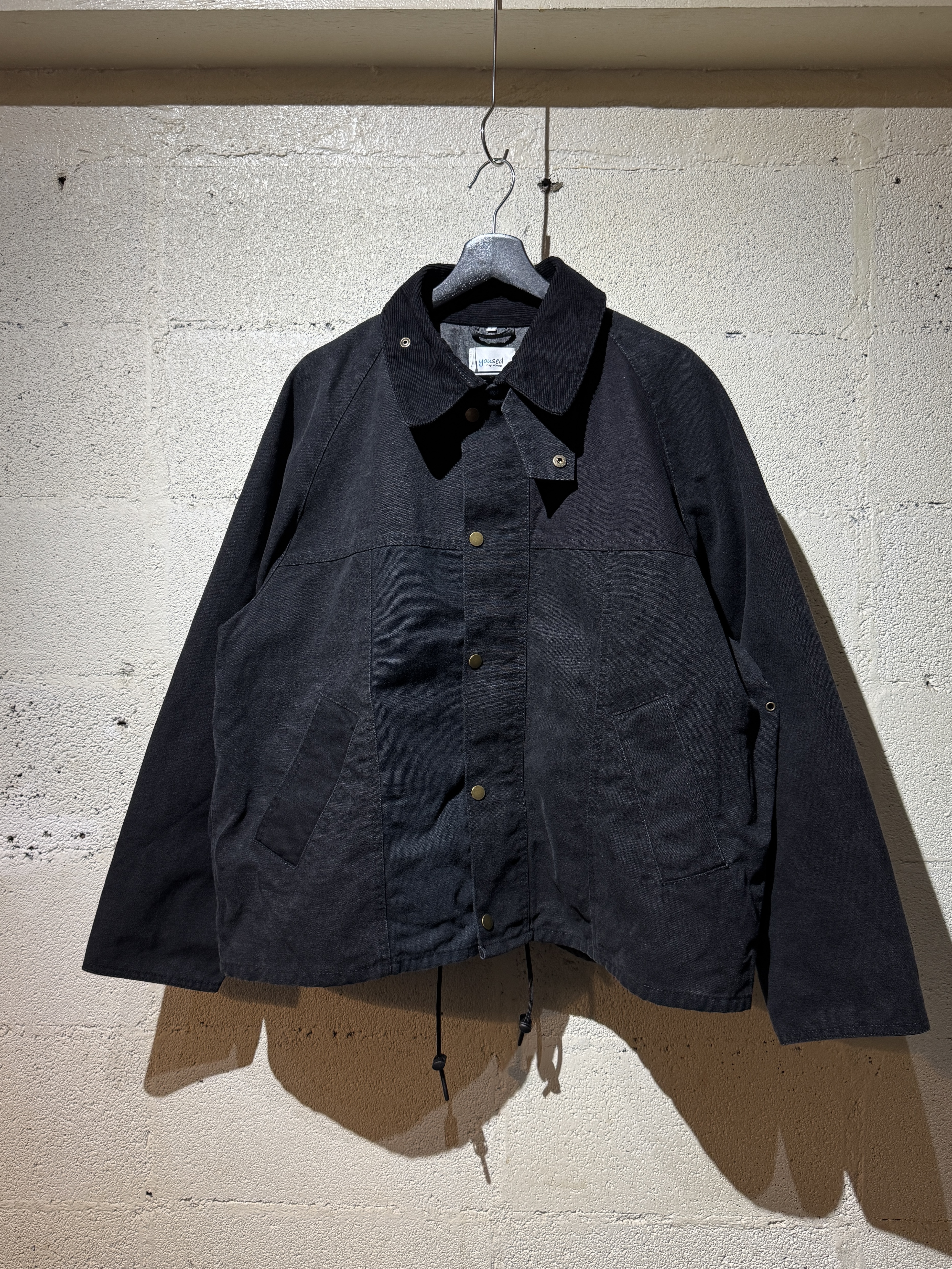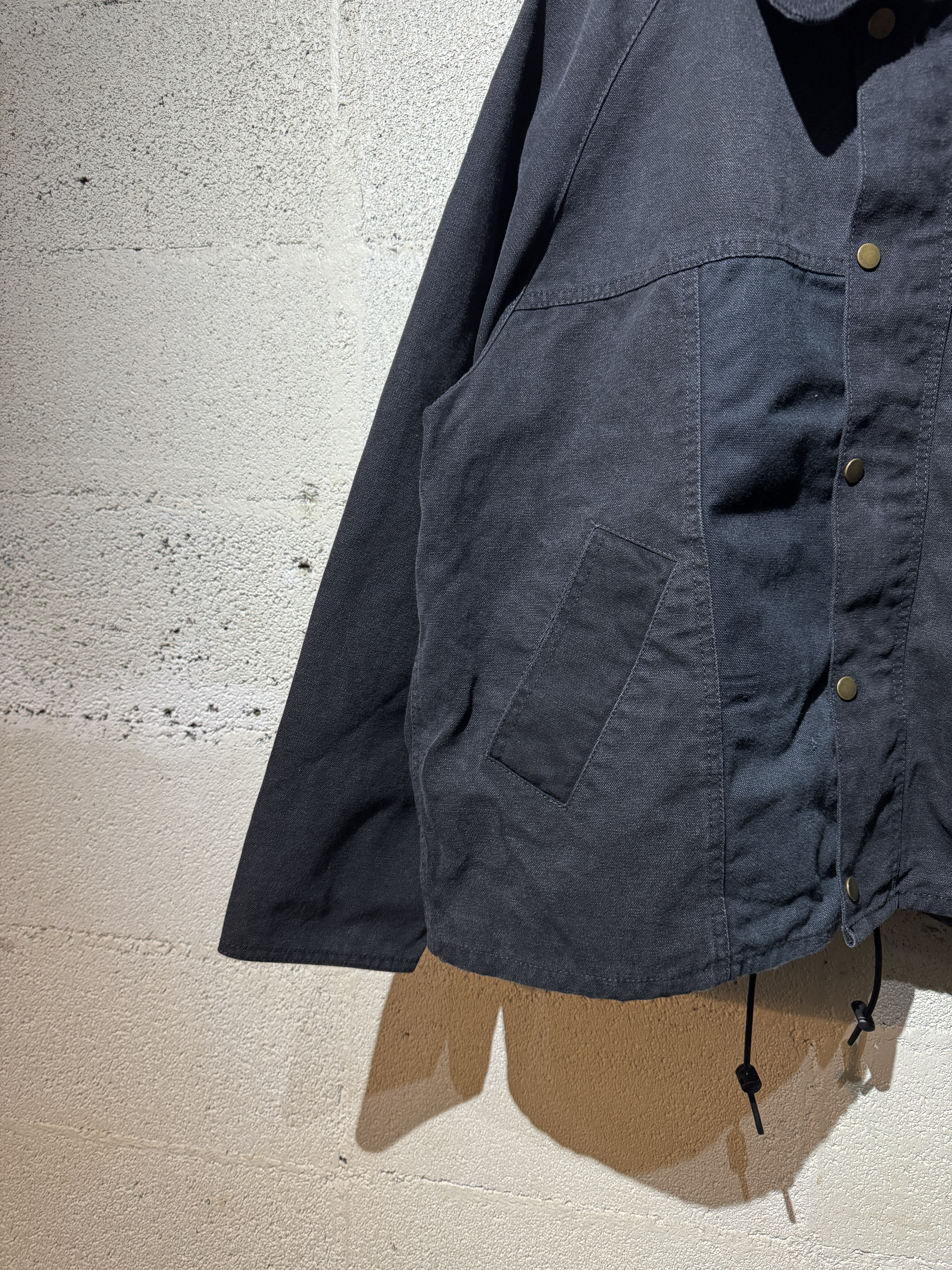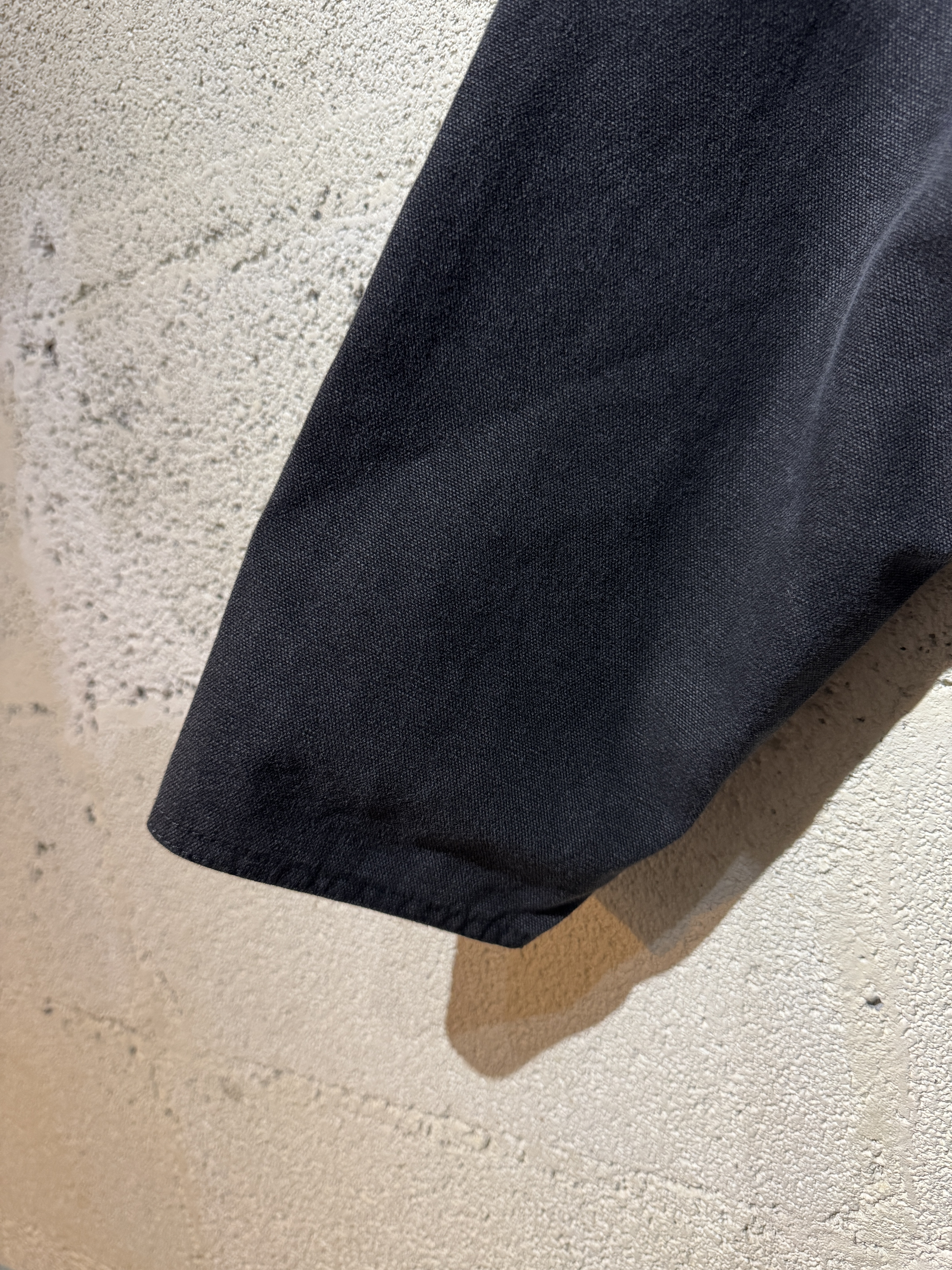ダックジャケットで有名な某ワークブランドのパンツなどを解体し再構築したダック地のドライバーズジャケットです。yousedの定番レザードライバーズジャケットのダック地バージョンになります。身幅はややワイドめ、また着丈はショートのBOXシルエットのフォルムになります。襟はコーデュロイのチンストラップ付き、フロントはスナップボタンとジッパーの組み合わせです。裏地もそう古くはありませんが長く使用されず保管されたデッドストックのシャンブレーブラックを使用してあります。また袖内は二重構造のスナップ付きで風が入るのを防ぐ仕様です。余計なディテールは排除されたスタンダードなモデルですがシルエットに特に気を配った着回しのきくyousedのロングセラーモデルです。 詳細寸法 サイズ1 ゆき丈:86cm 身幅:67cm 着丈66cm