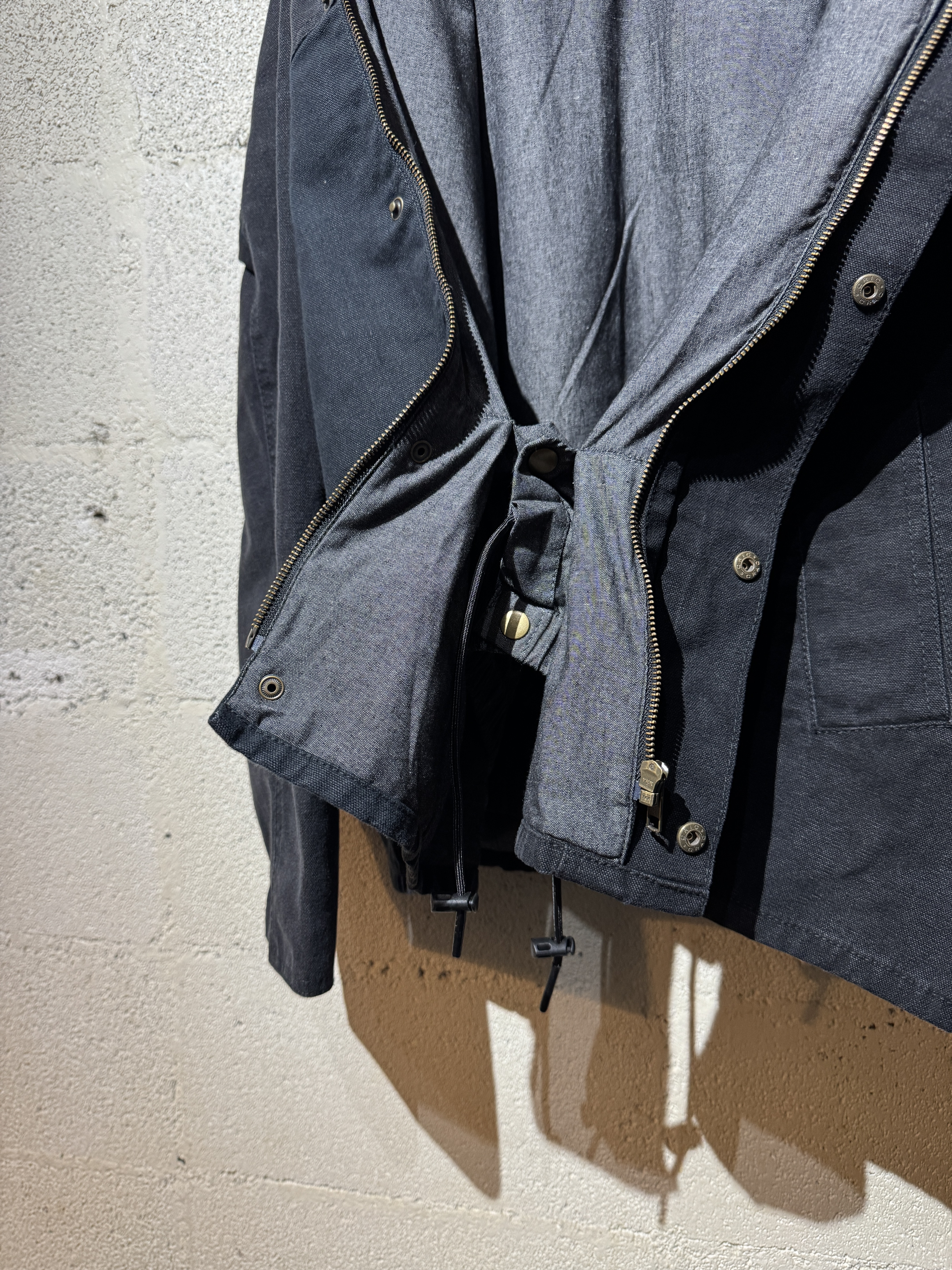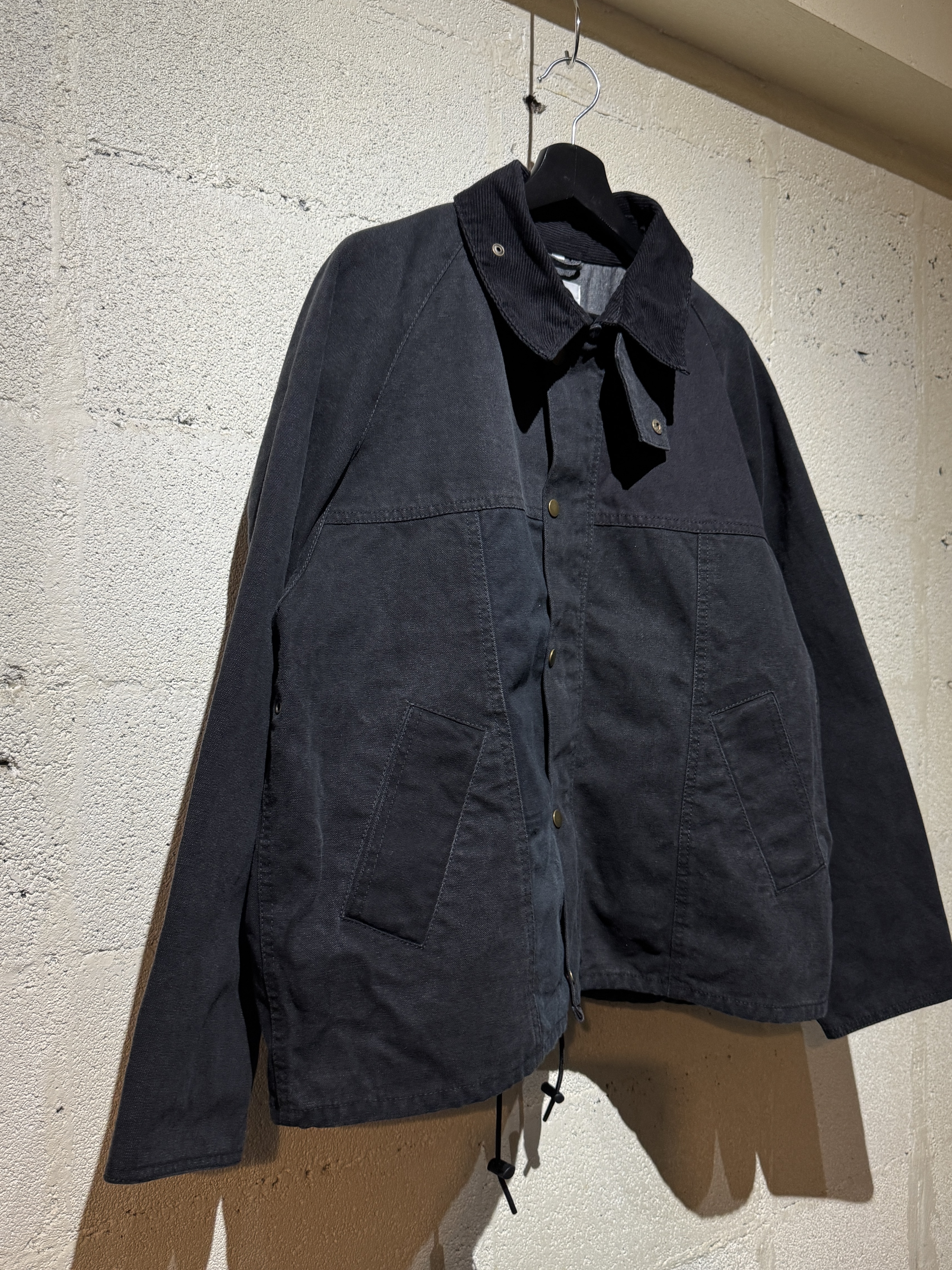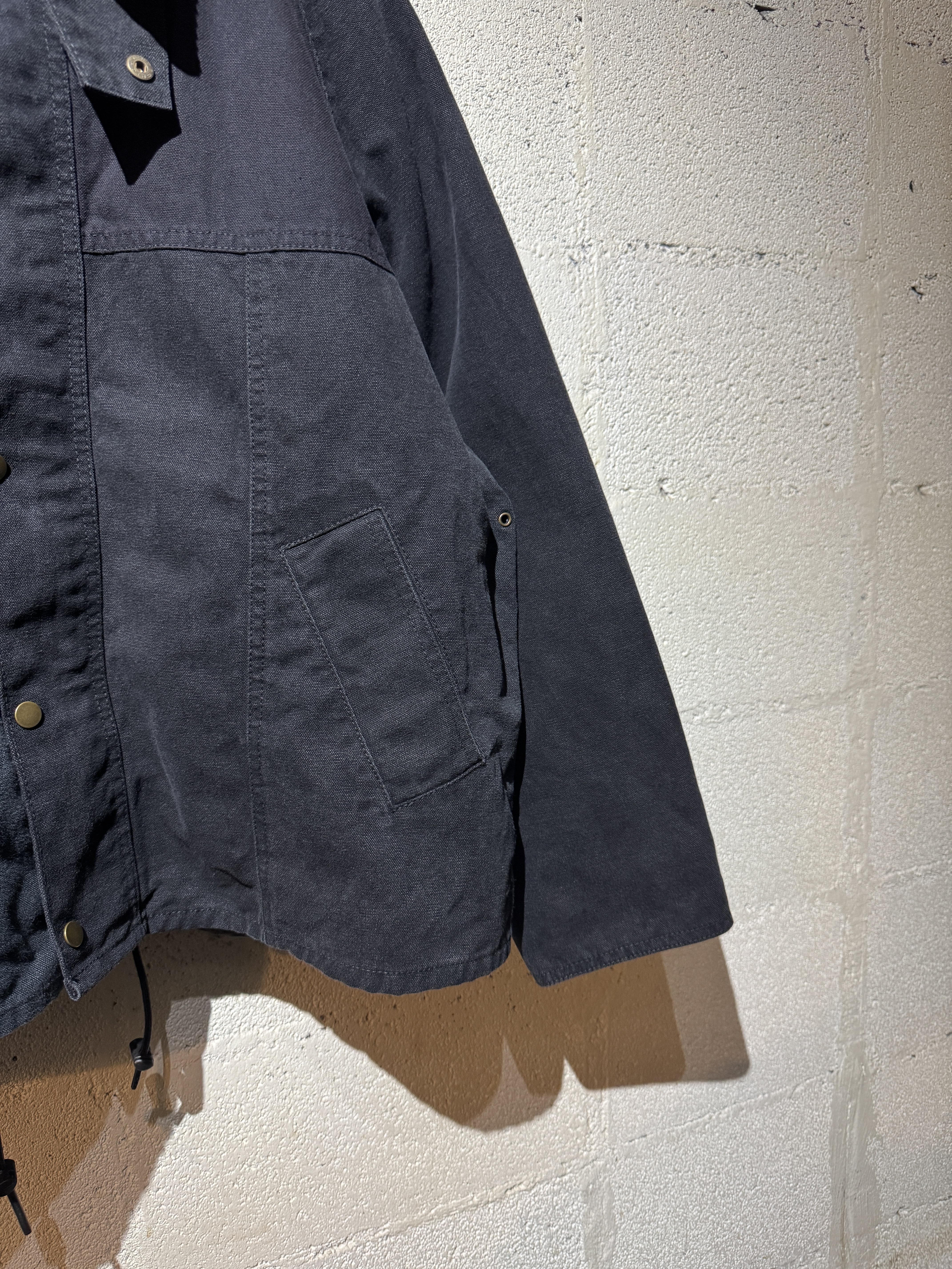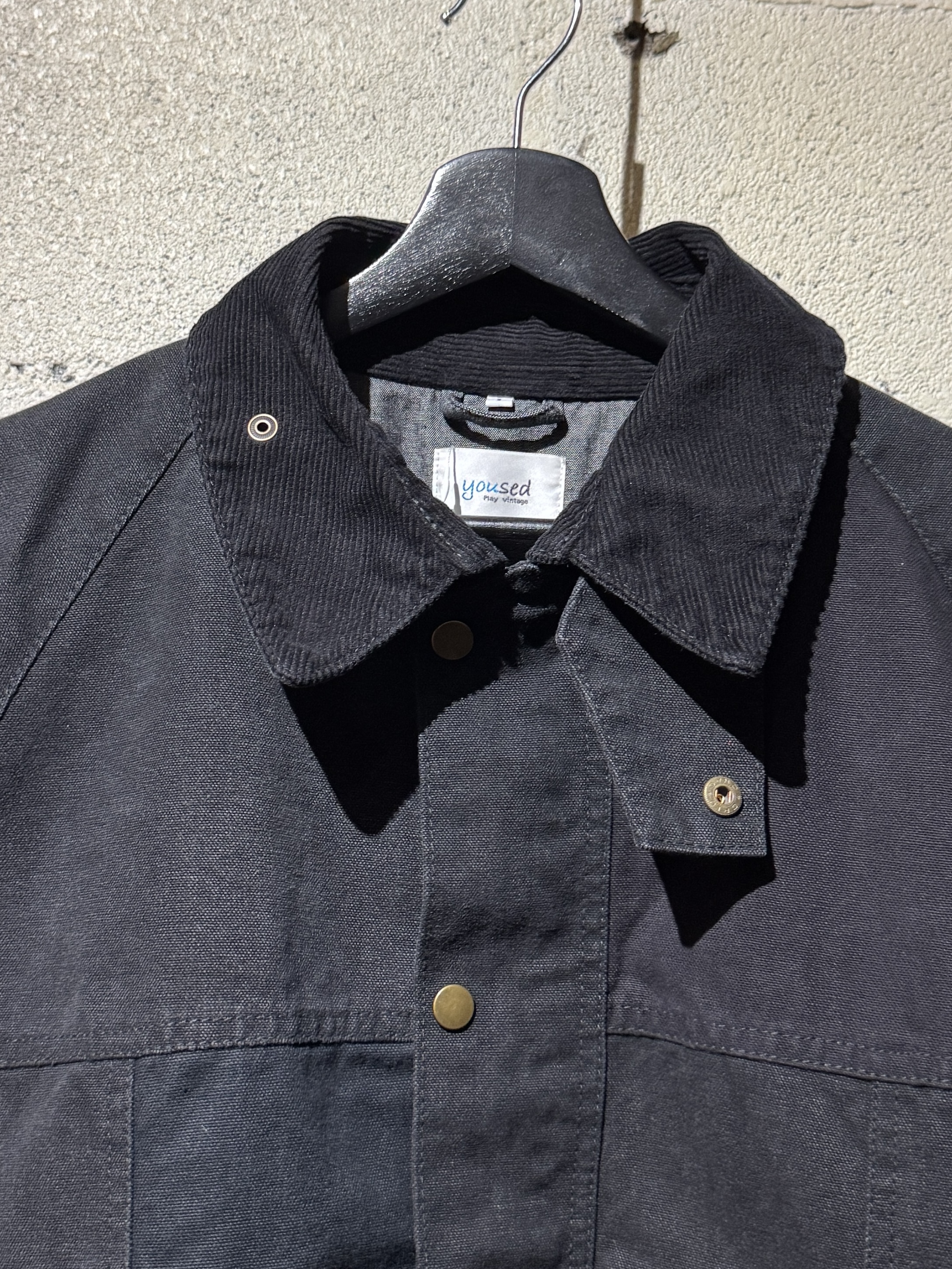 ダックジャケットで有名な某ワークブランドのパンツなどを解体し再構築したダック地のドライバーズジャケットです。yousedの定番レザードライバーズジャケットのダック地バージョンになります。身幅はややワイドめ、また着丈はショートのBOXシルエットのフォルムになります。襟はコーデュロイのチンストラップ付き、フロントはスナップボタンとジッパーの組み合わせです。裏地もそう古くはありませんが長く使用されず保管されたデッドストックのシャンブレーブラックを使用してあります。また袖内は二重構造のスナップ付きで風が入るのを防ぐ仕様です。余計なディテールは排除されたスタンダードなモデルですがシルエットに特に気を配った着回しのきくyousedのロングセラーモデルです。 詳細寸法 サイズ1 ゆき丈:86cm 身幅:67cm 着丈66cm
