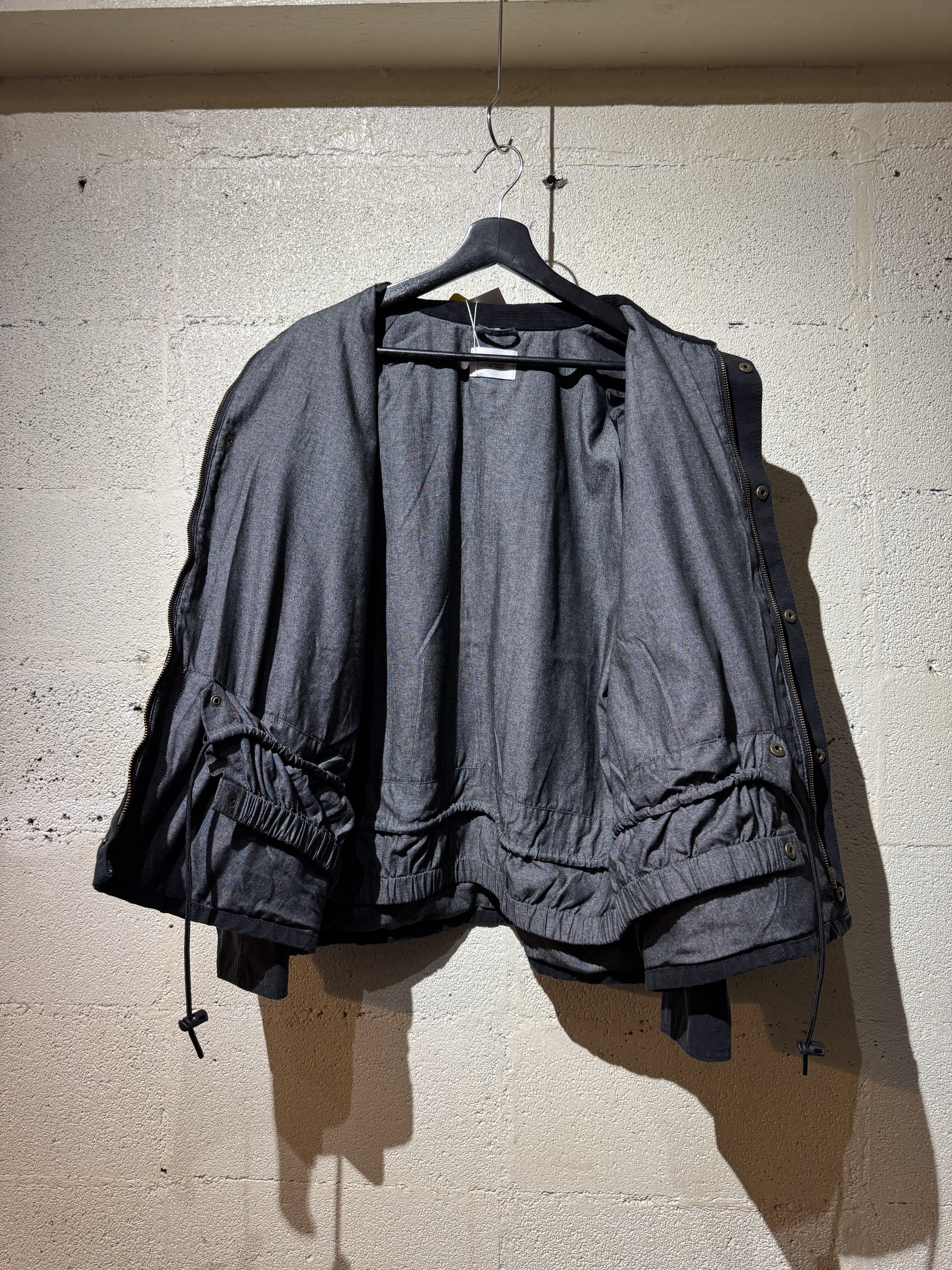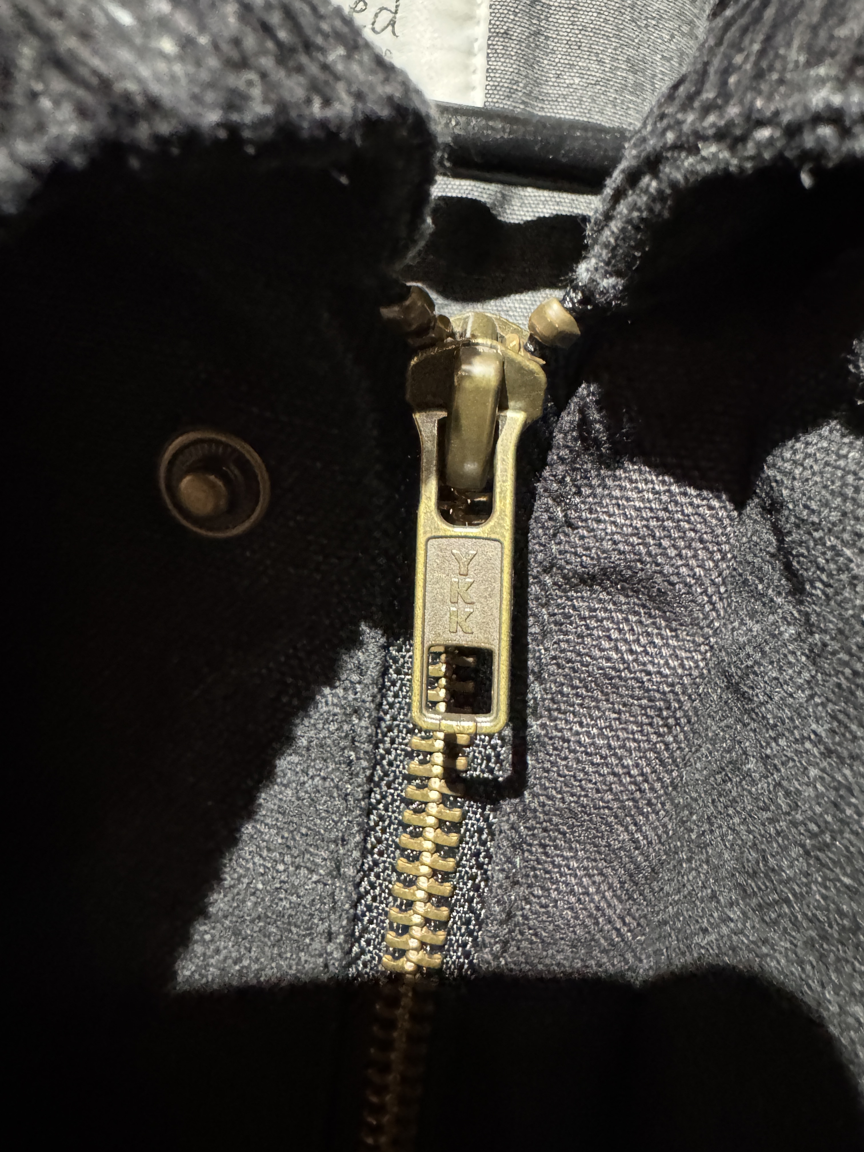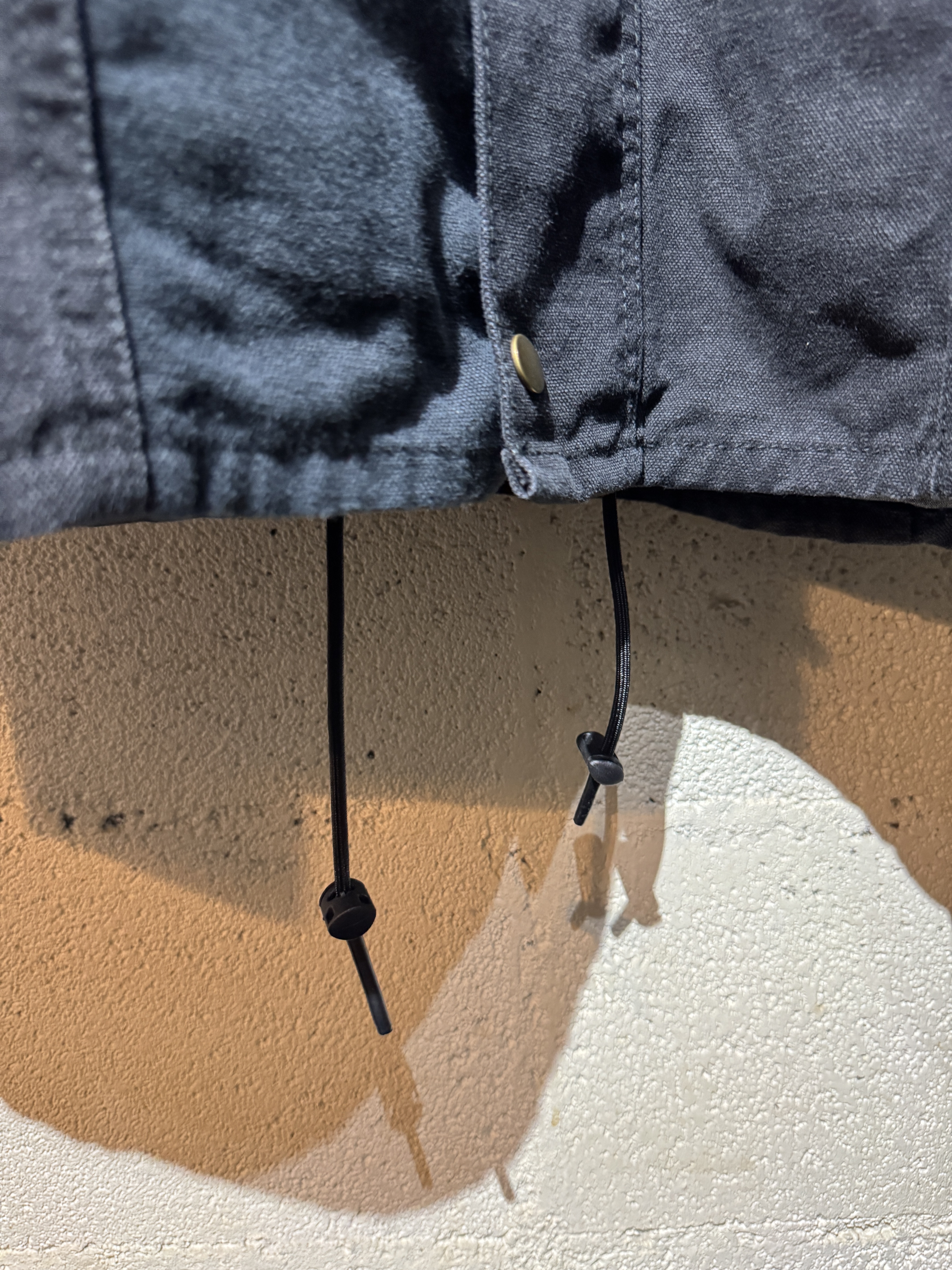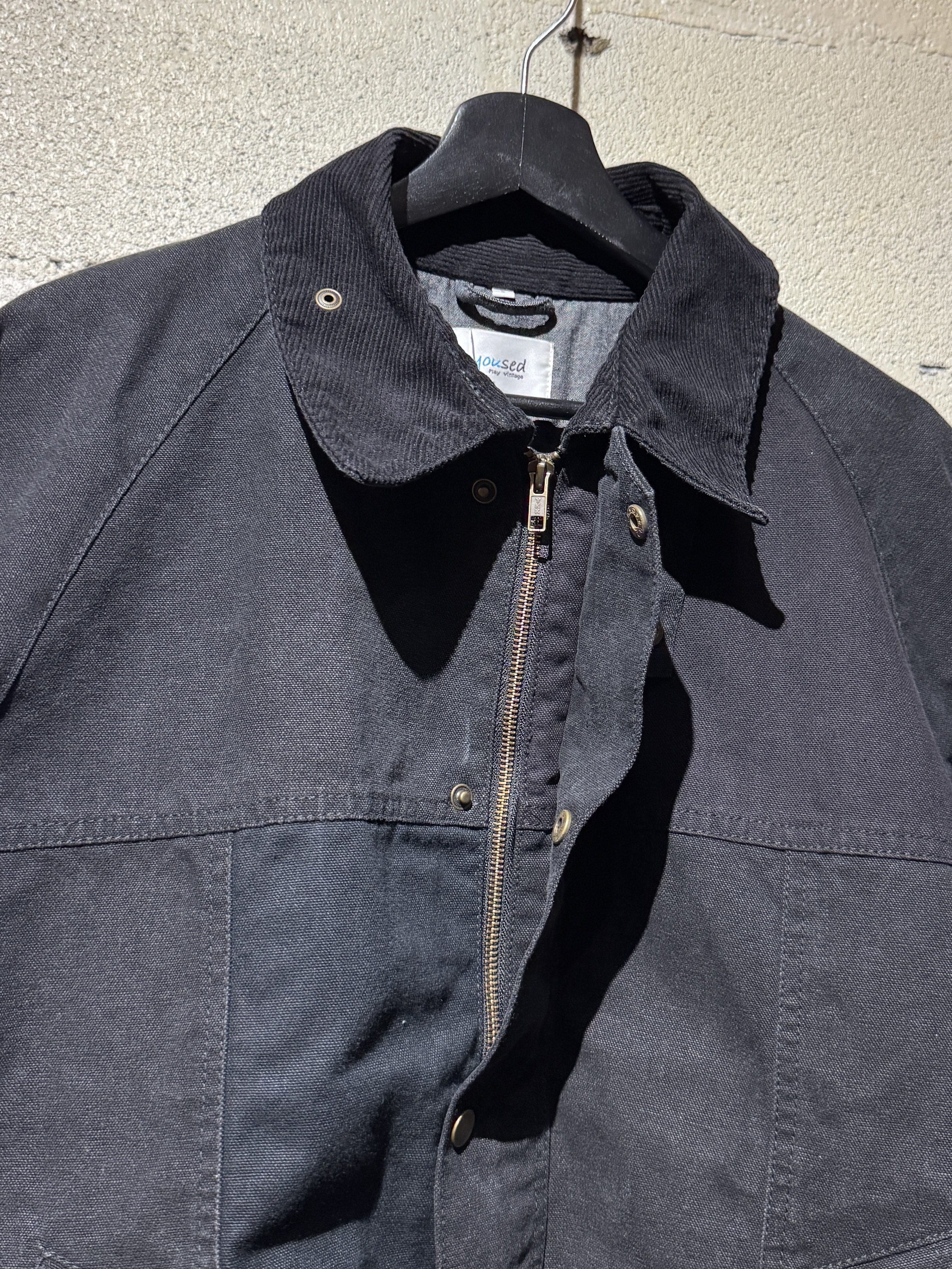 ダックジャケットで有名な某ワークブランドのパンツなどを解体し再構築したダック地のドライバーズジャケットです。yousedの定番レザードライバーズジャケットのダック地バージョンになります。身幅はややワイドめ、また着丈はショートのBOXシルエットのフォルムになります。襟はコーデュロイのチンストラップ付き、フロントはスナップボタンとジッパーの組み合わせです。裏地もそう古くはありませんが長く使用されず保管されたデッドストックのシャンブレーブラックを使用してあります。また袖内は二重構造のスナップ付きで風が入るのを防ぐ仕様です。余計なディテールは排除されたスタンダードなモデルですがシルエットに特に気を配った着回しのきくyousedのロングセラーモデルです。 詳細寸法 サイズ1 ゆき丈:86cm 身幅:67cm 着丈66cm