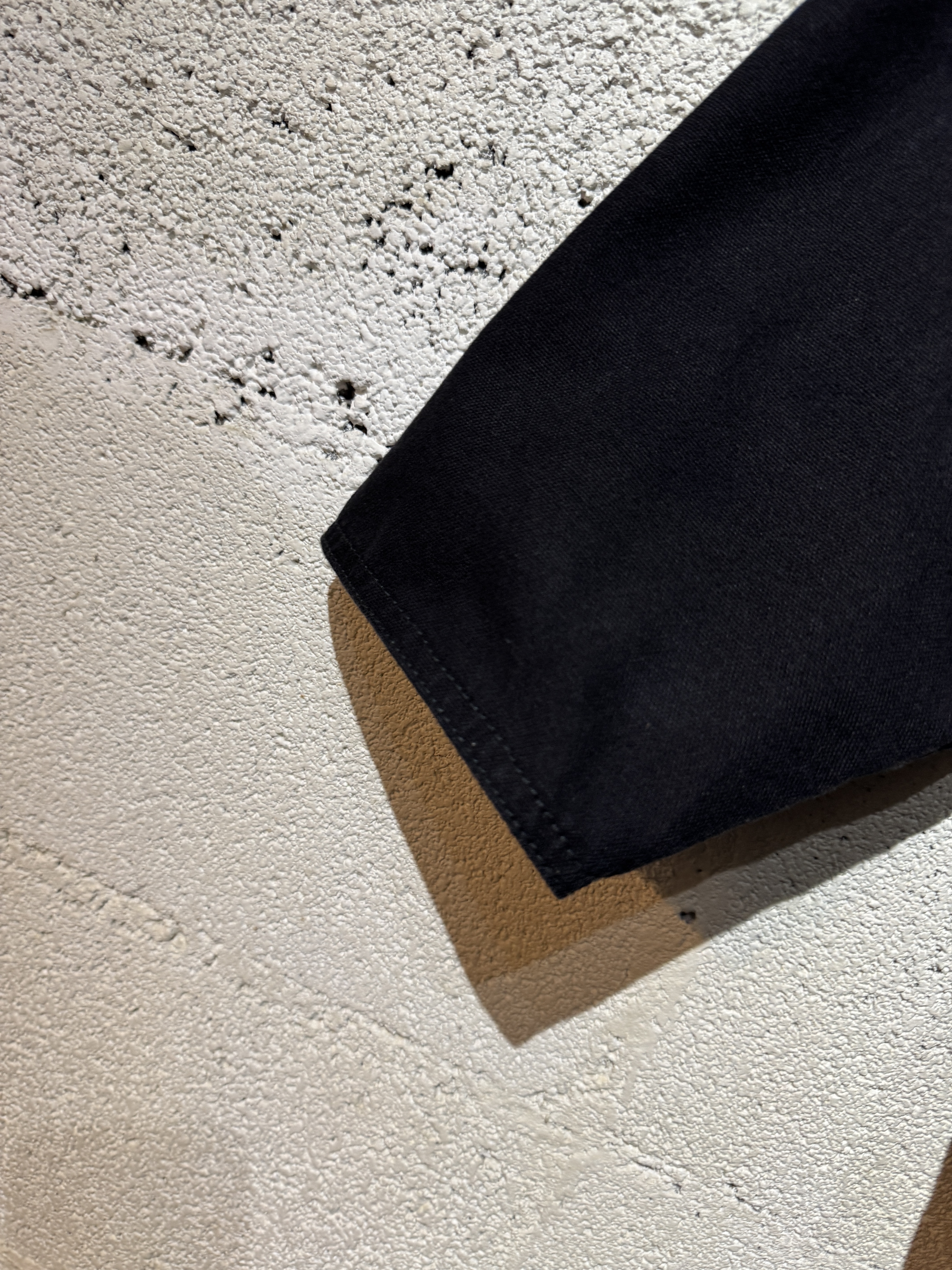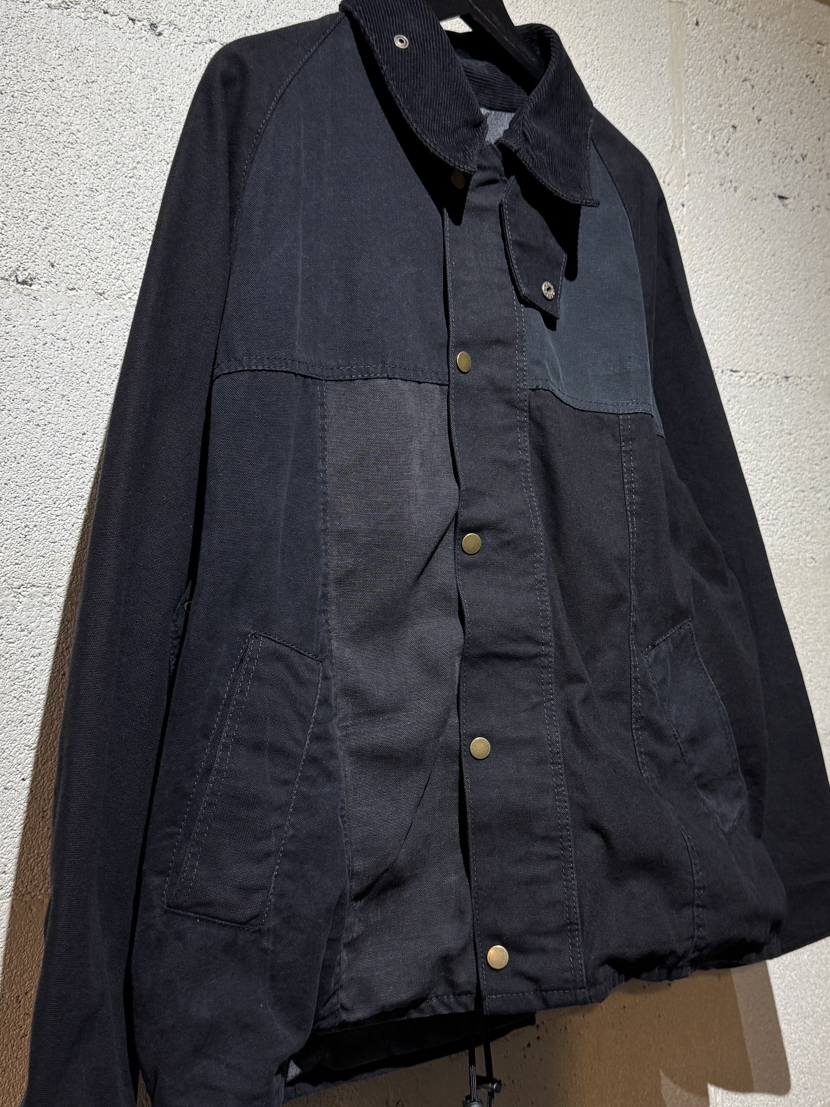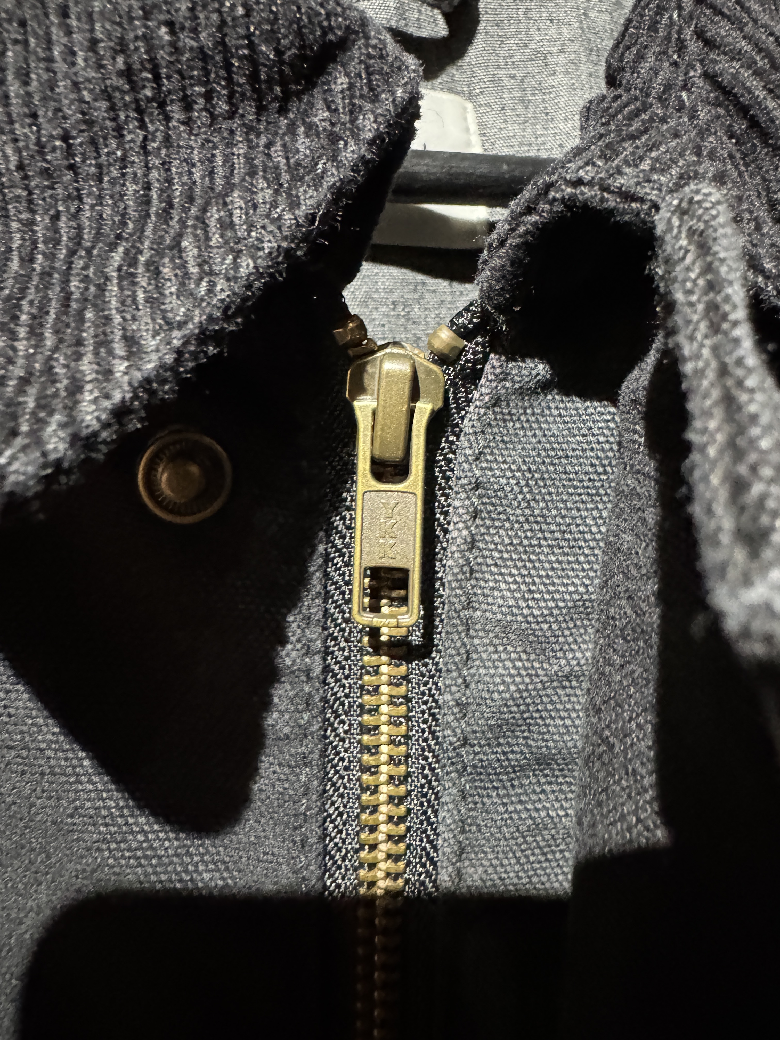 ダックジャケットで有名な某ワークブランドのパンツなどを解体し再構築したダック地のドライバーズジャケットです。yousedの定番レザードライバーズジャケットのダック地バージョンになります。身幅はややワイドめ、また着丈はショートのBOXシルエットのフォルムになります。襟はコーデュロイのチンストラップ付き、フロントはスナップボタンとジッパーの組み合わせです。裏地もそう古くはありませんが長く使用されず保管されたデッドストックのシャンブレーブラックを使用してあります。また袖内は二重構造のスナップ付きで風が入るのを防ぐ仕様です。余計なディテールは排除されたスタンダードなモデルですがシルエットに特に気を配った着回しのきくyousedのロングセラーモデルです。 詳細寸法 サイズ2 ゆき丈:88cm 身幅:69cm 着丈68cm