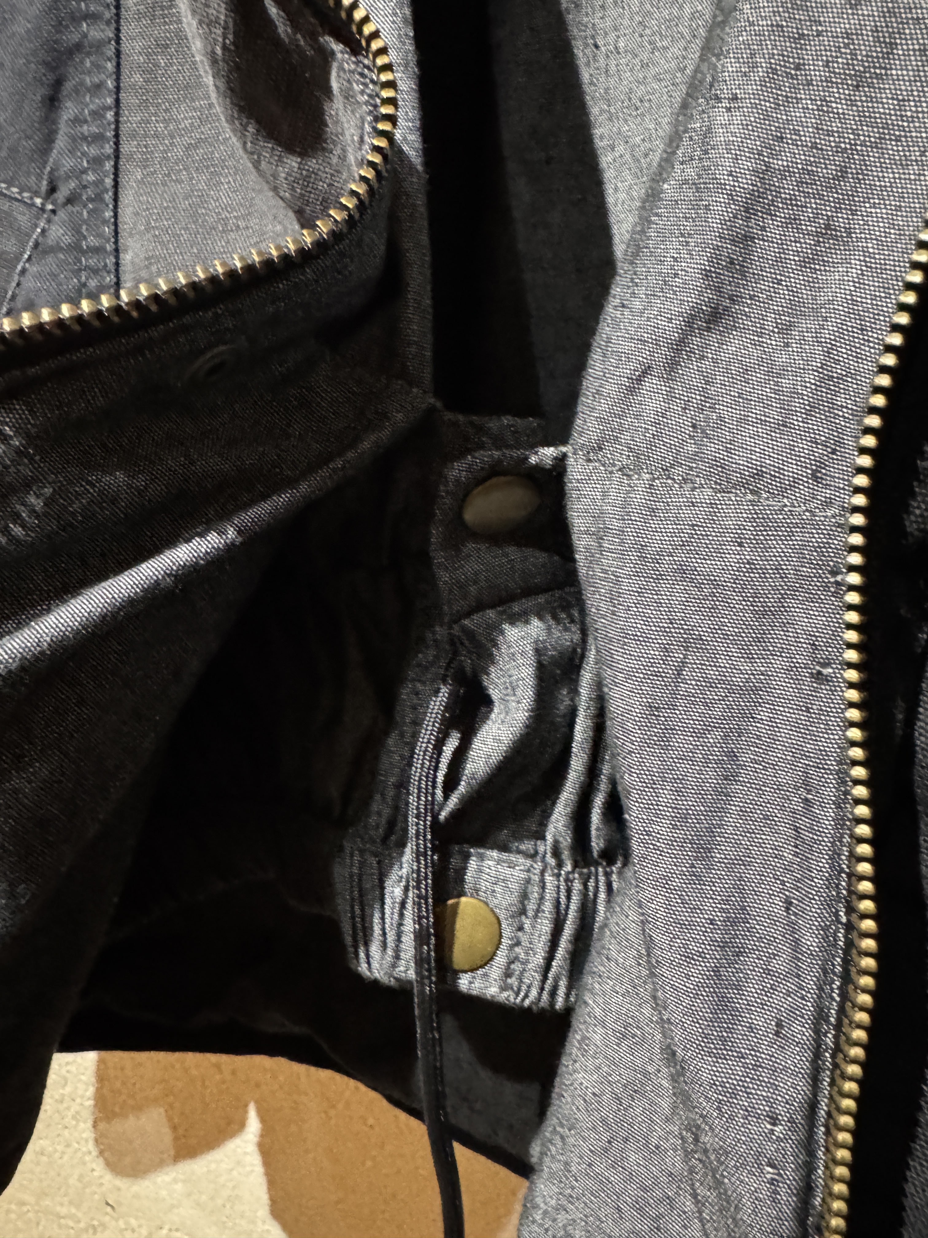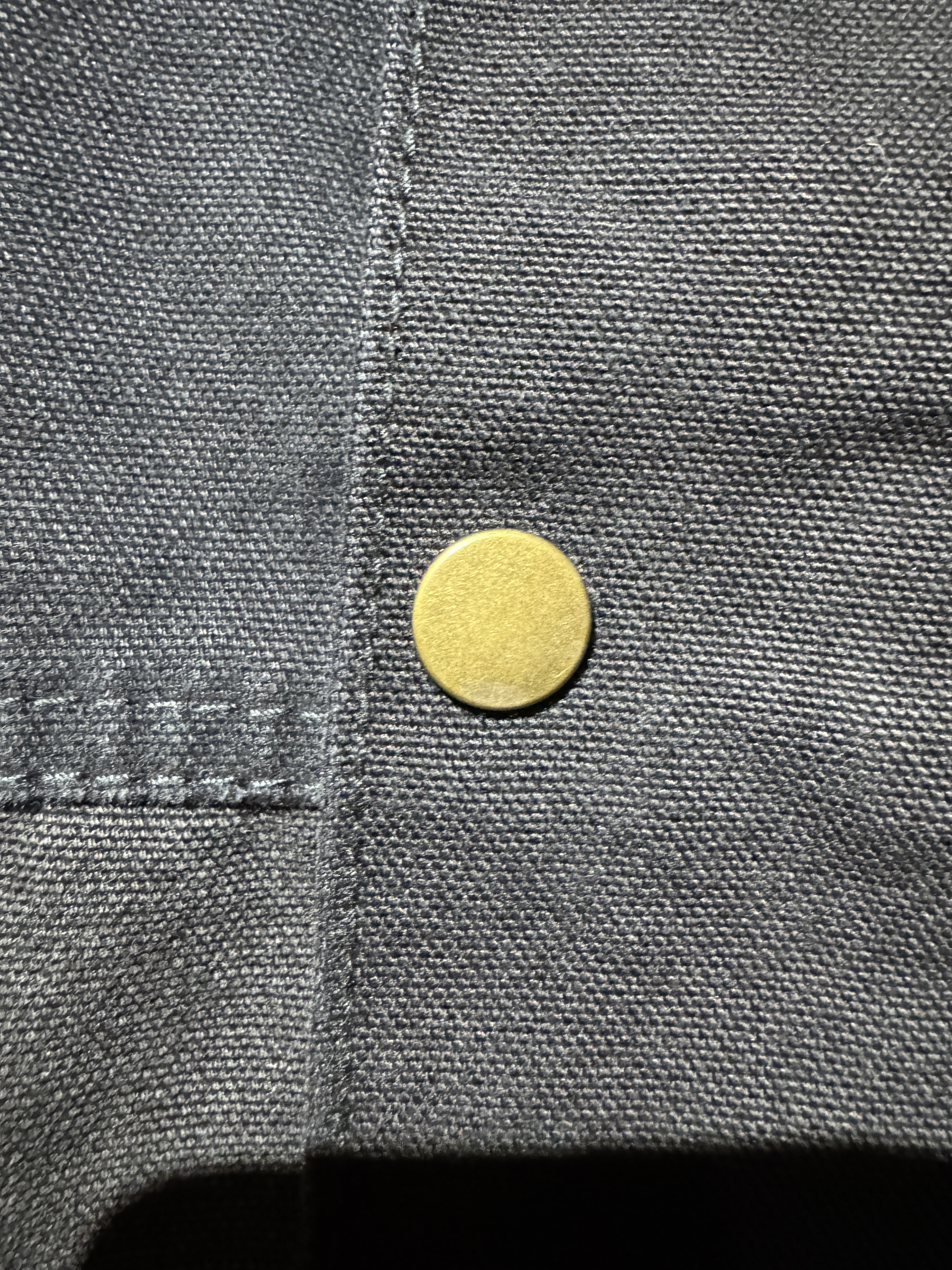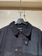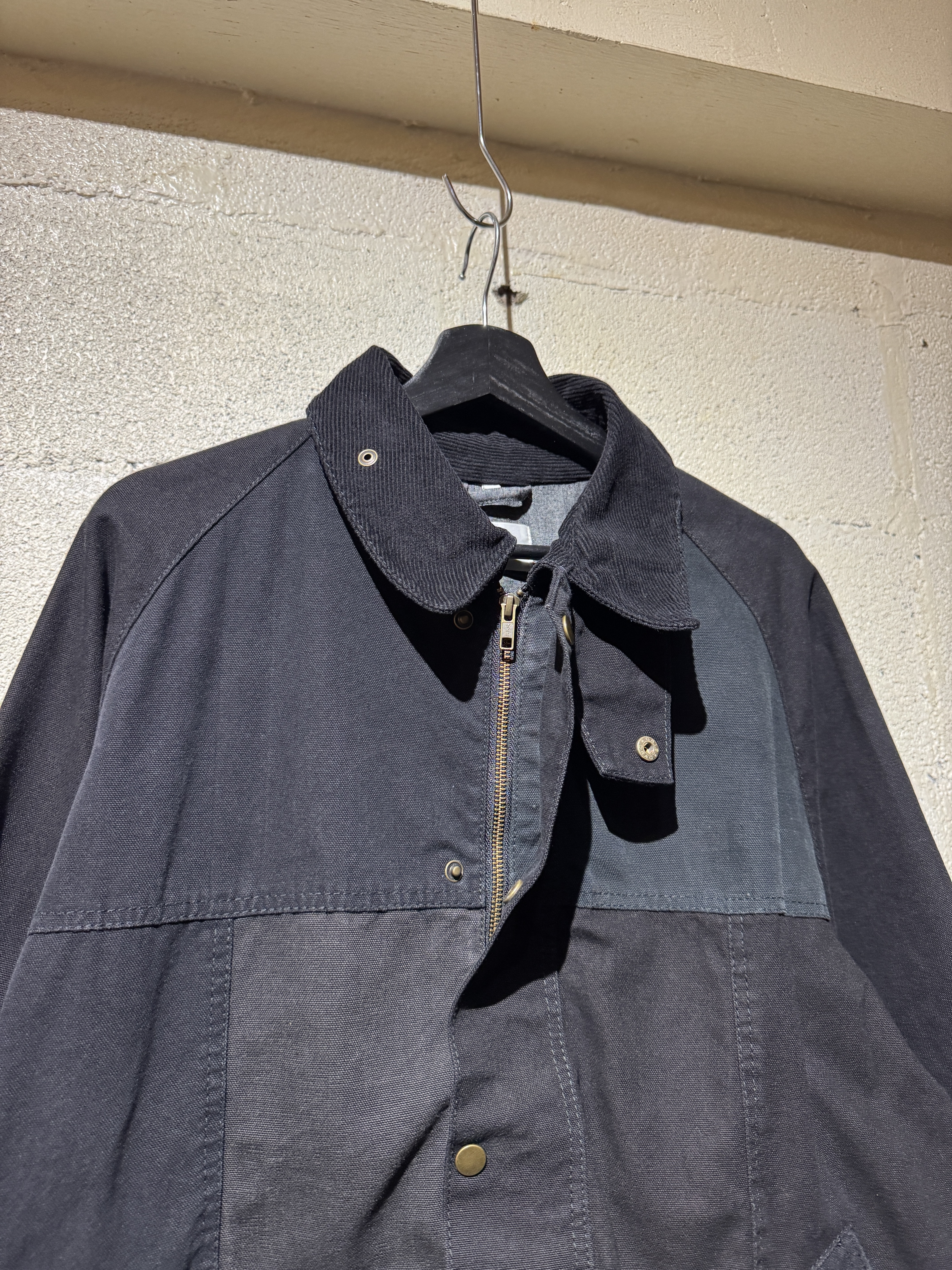 ダックジャケットで有名な某ワークブランドのパンツなどを解体し再構築したダック地のドライバーズジャケットです。yousedの定番レザードライバーズジャケットのダック地バージョンになります。身幅はややワイドめ、また着丈はショートのBOXシルエットのフォルムになります。襟はコーデュロイのチンストラップ付き、フロントはスナップボタンとジッパーの組み合わせです。裏地もそう古くはありませんが長く使用されず保管されたデッドストックのシャンブレーブラックを使用してあります。また袖内は二重構造のスナップ付きで風が入るのを防ぐ仕様です。余計なディテールは排除されたスタンダードなモデルですがシルエットに特に気を配った着回しのきくyousedのロングセラーモデルです。 詳細寸法 サイズ2 ゆき丈:88cm 身幅:69cm 着丈68cm