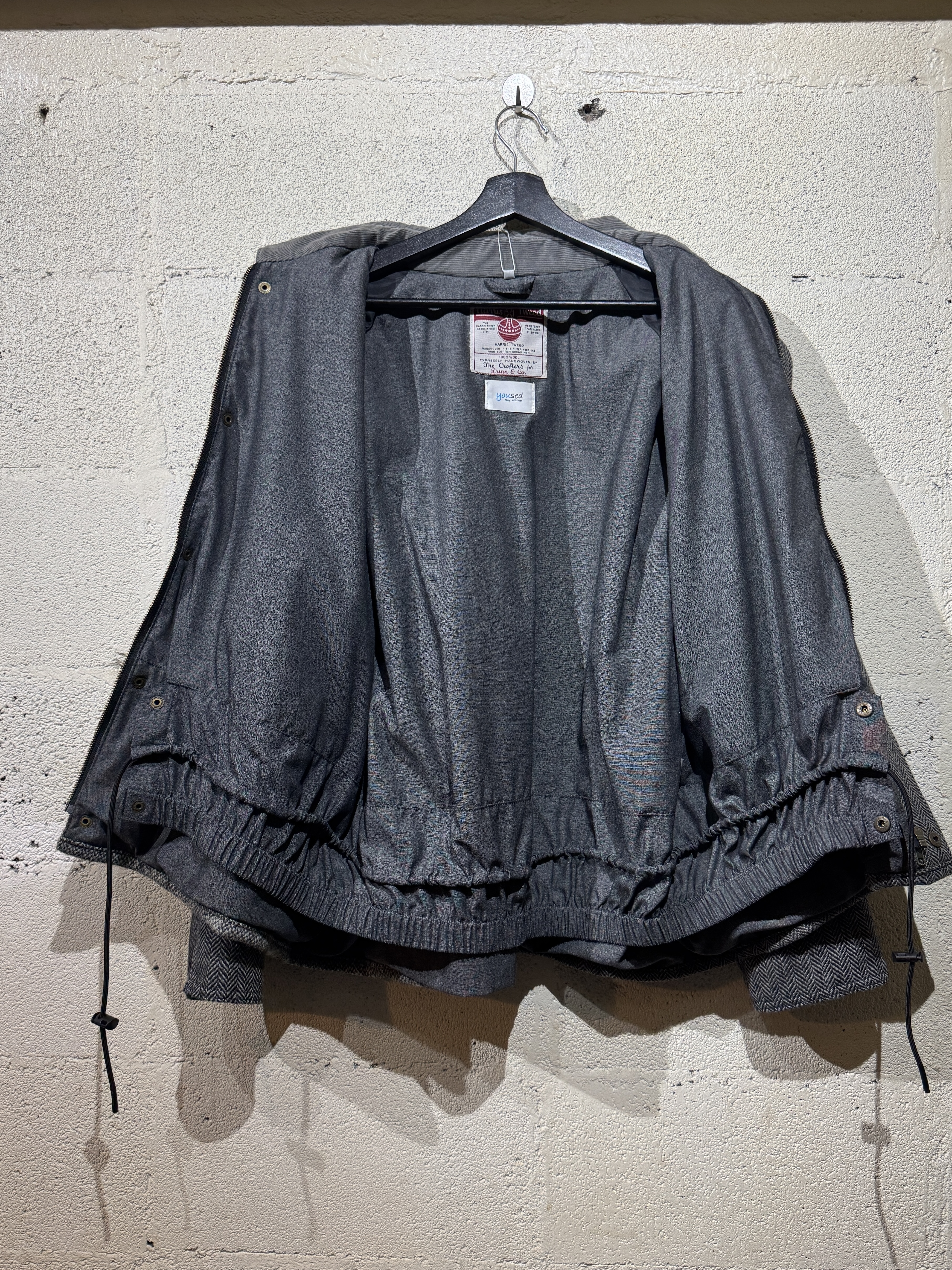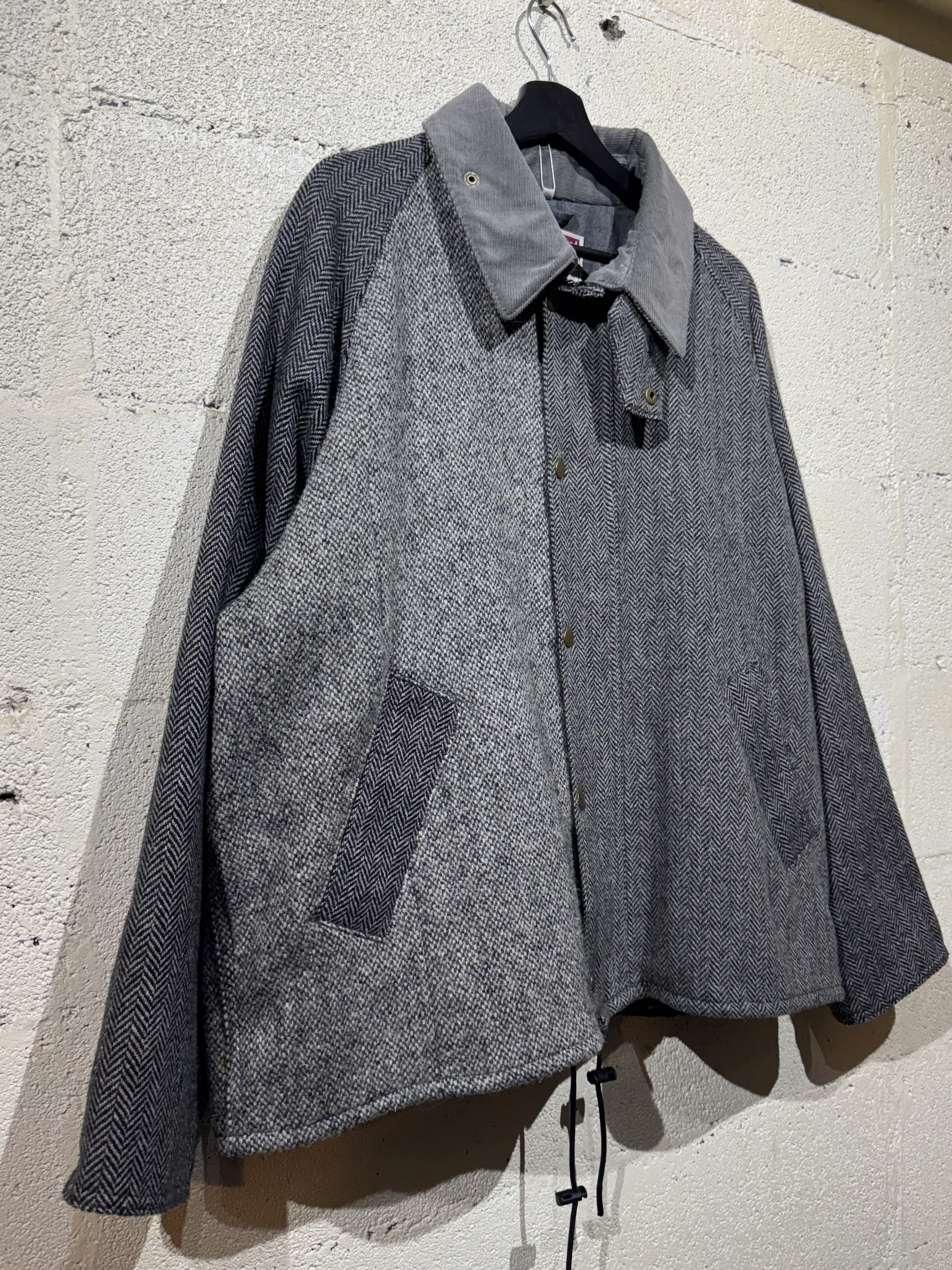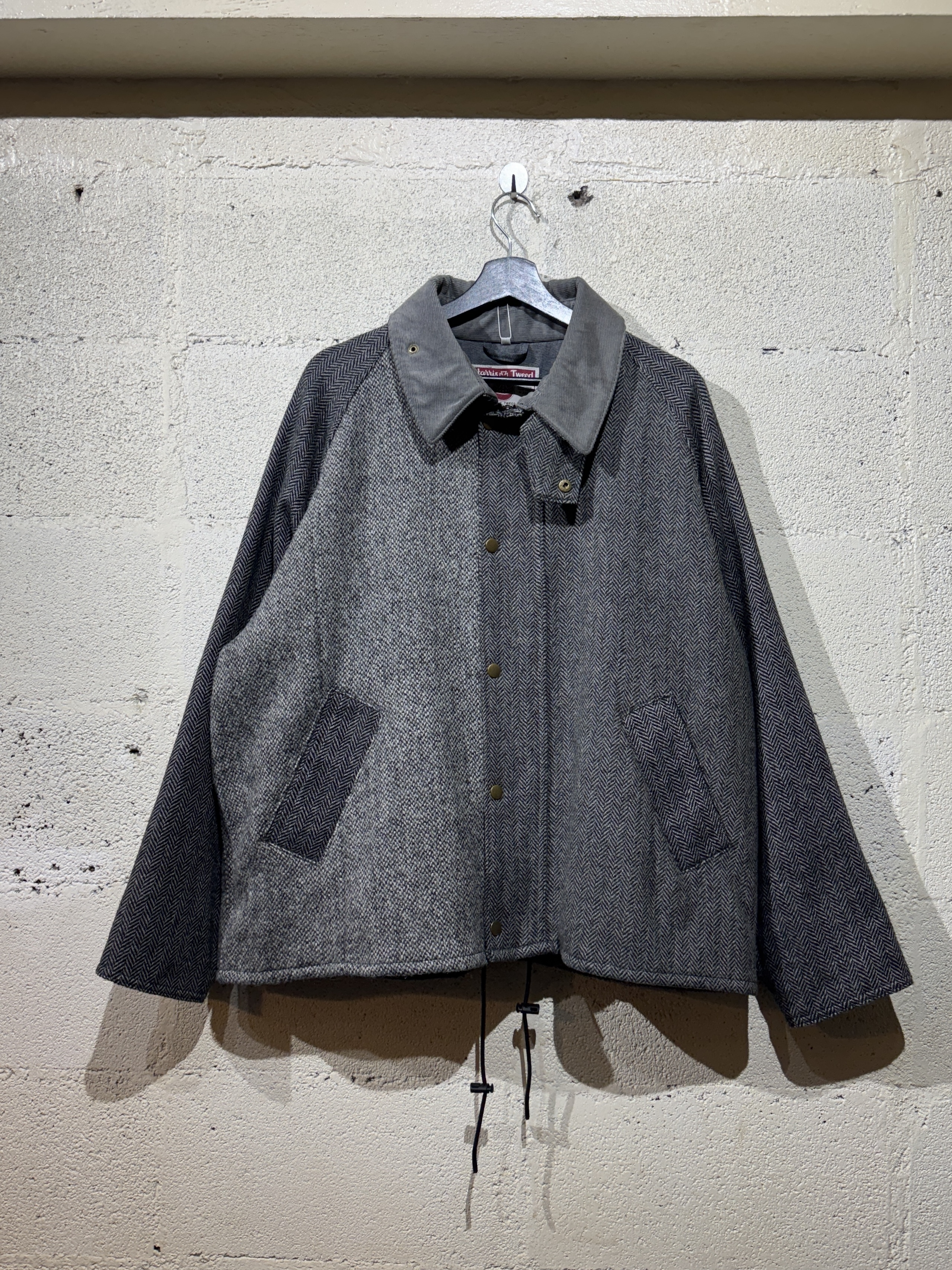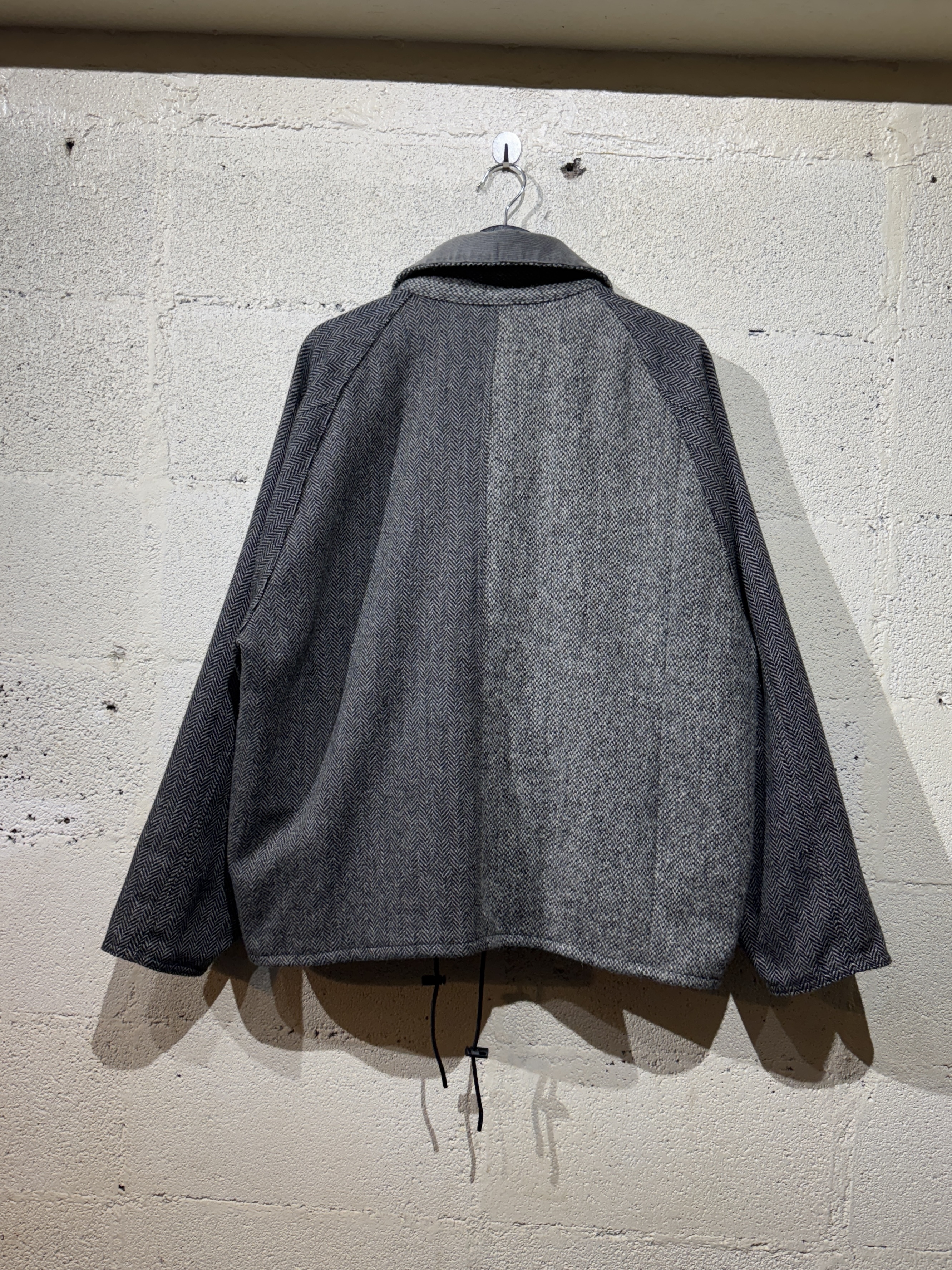 Hariss tweed drivers jacket ビンテージのハリスツイードジャケットを解体しドライバーズジャケットに再構築しました。 シルエット、サイズ感はyousedレザードライバーズジャケットと同じです。 ややゆったりとしたコーチジャケットタイプで合わせやすいデザインです。 カラーは大まかにブラウン系とグレー系の2種類、襟のコーデュロイもボディカラーに合わせてあります。 尚、ビンテージのハリスツイードを使用してますので全て1点ものとなり個性を大切にしたyousedらしいデザインです。 サイズは1、2の2サイズ展開です。 当商品のカラーはグレー系です。 着画は170cm.60kgのものがサイズ1を着用しています。 詳細寸法 サイズ:1 着丈:68cm 身幅:68cm 裄丈:87cm