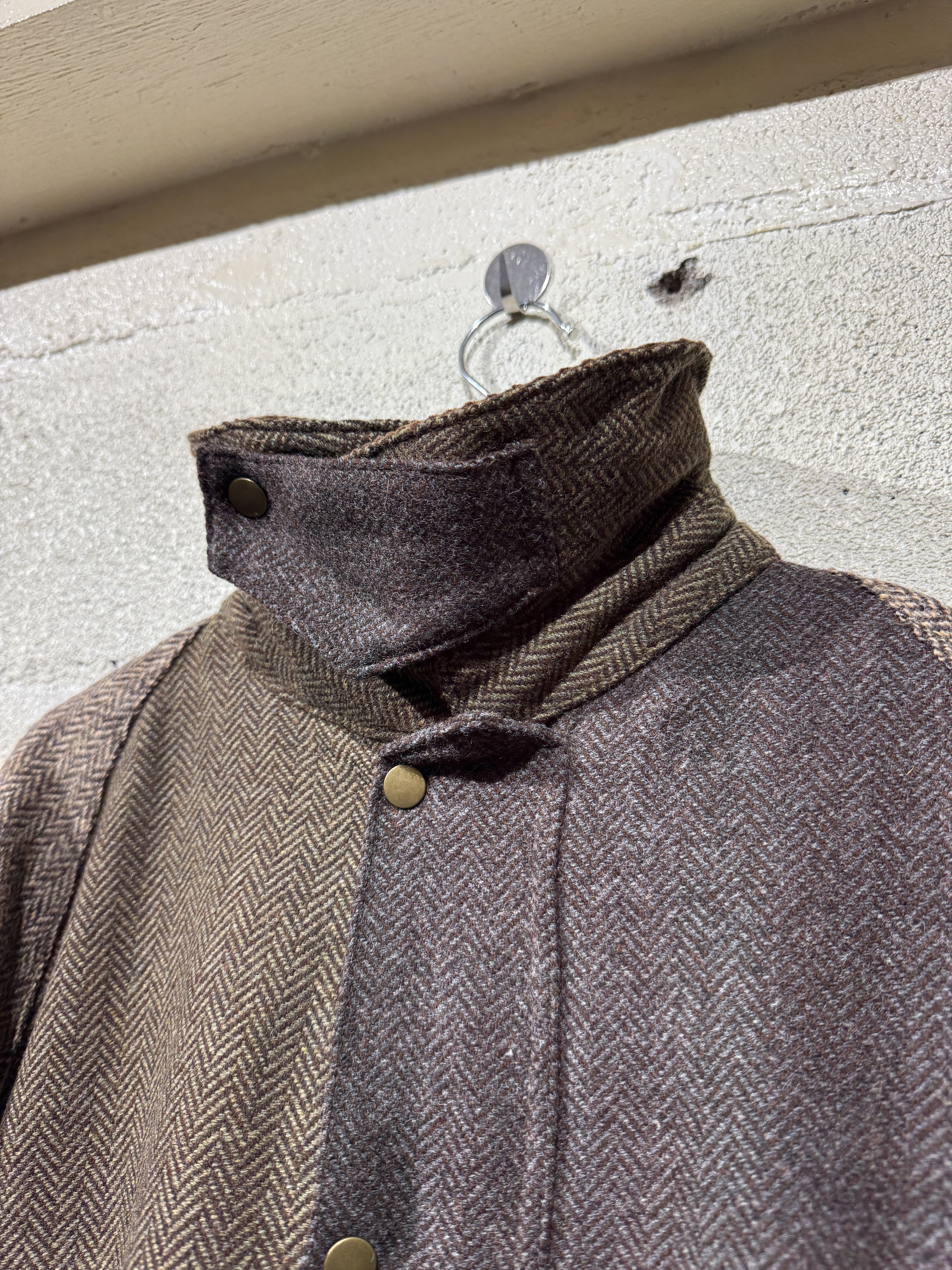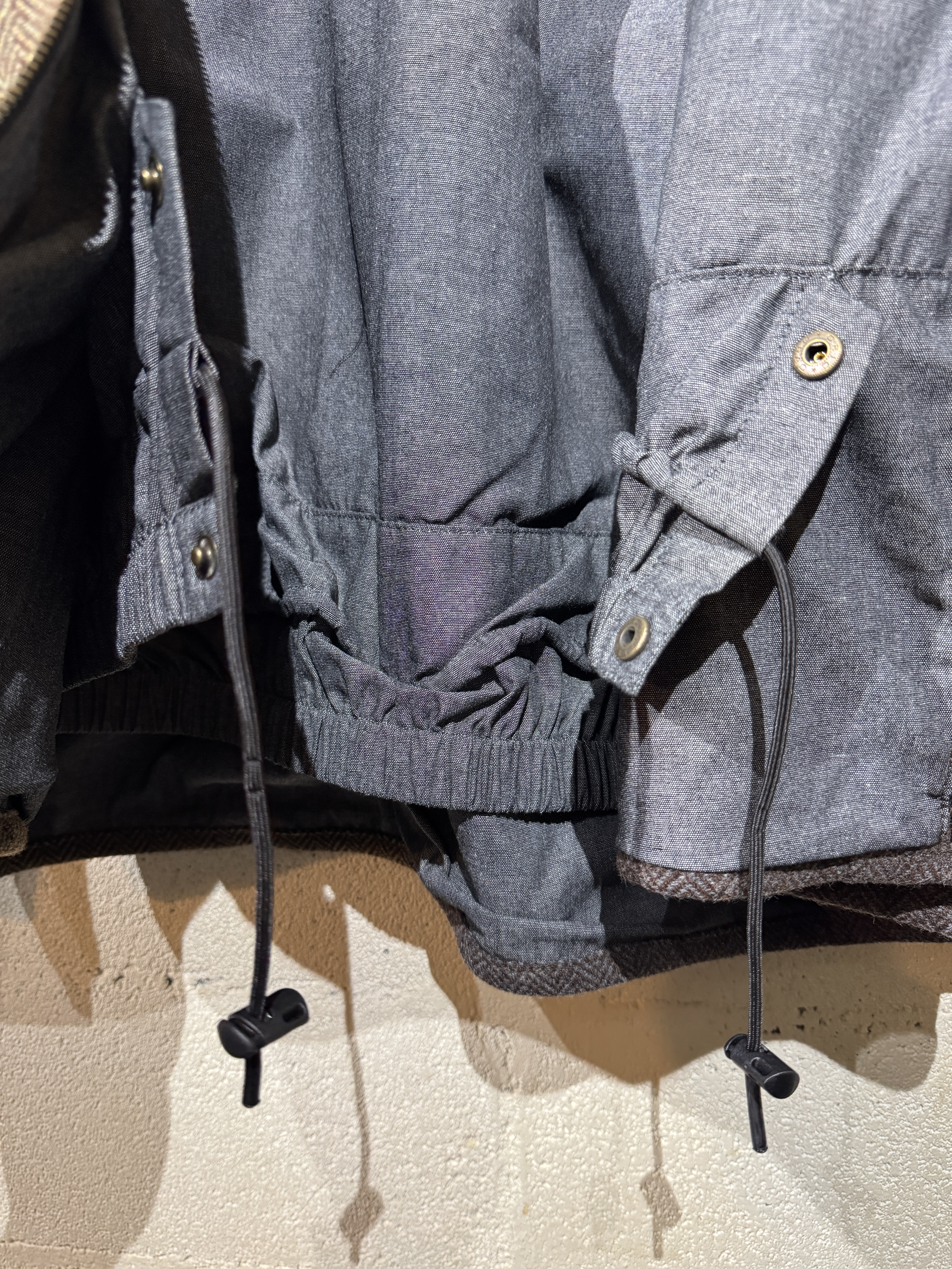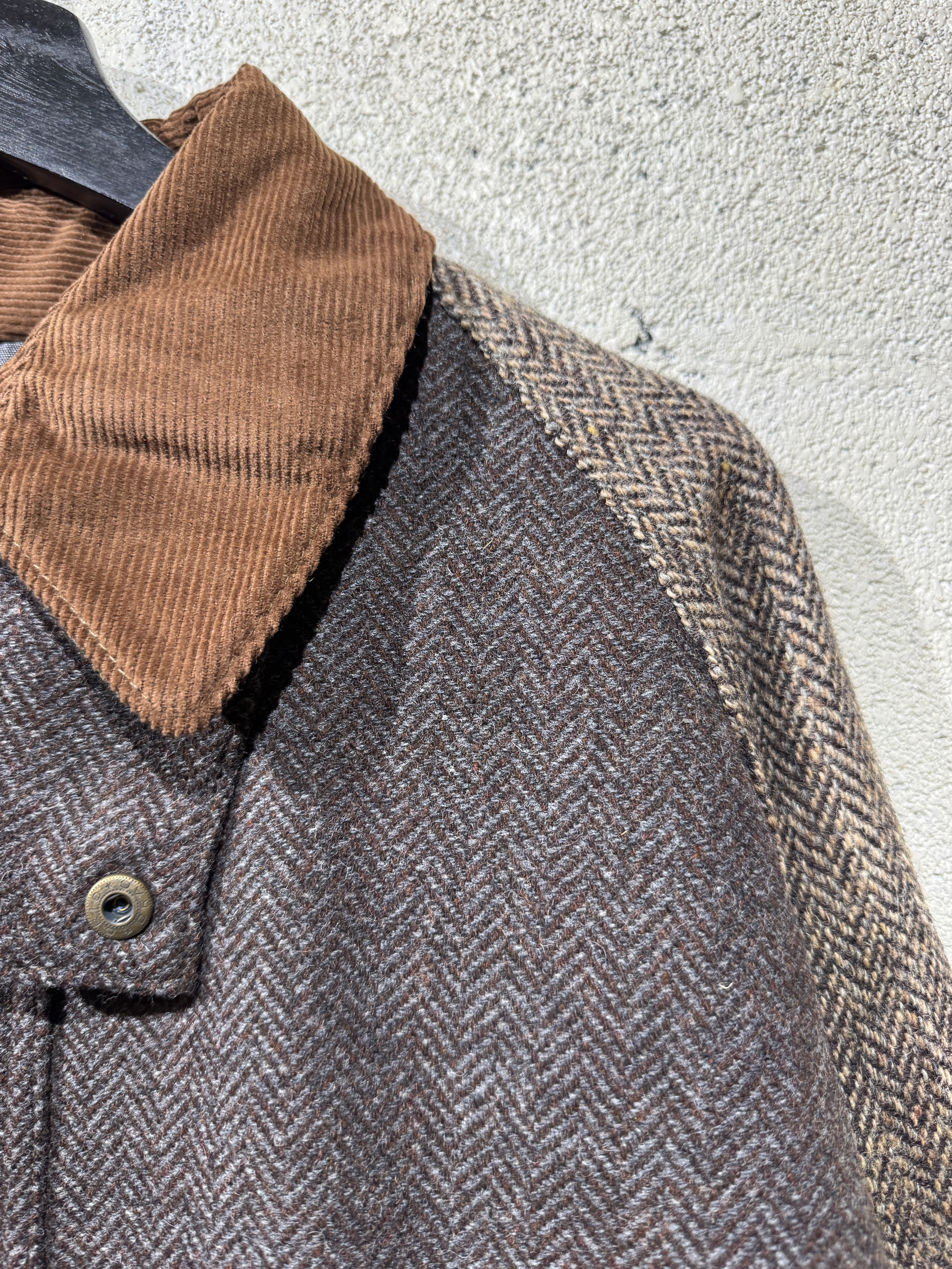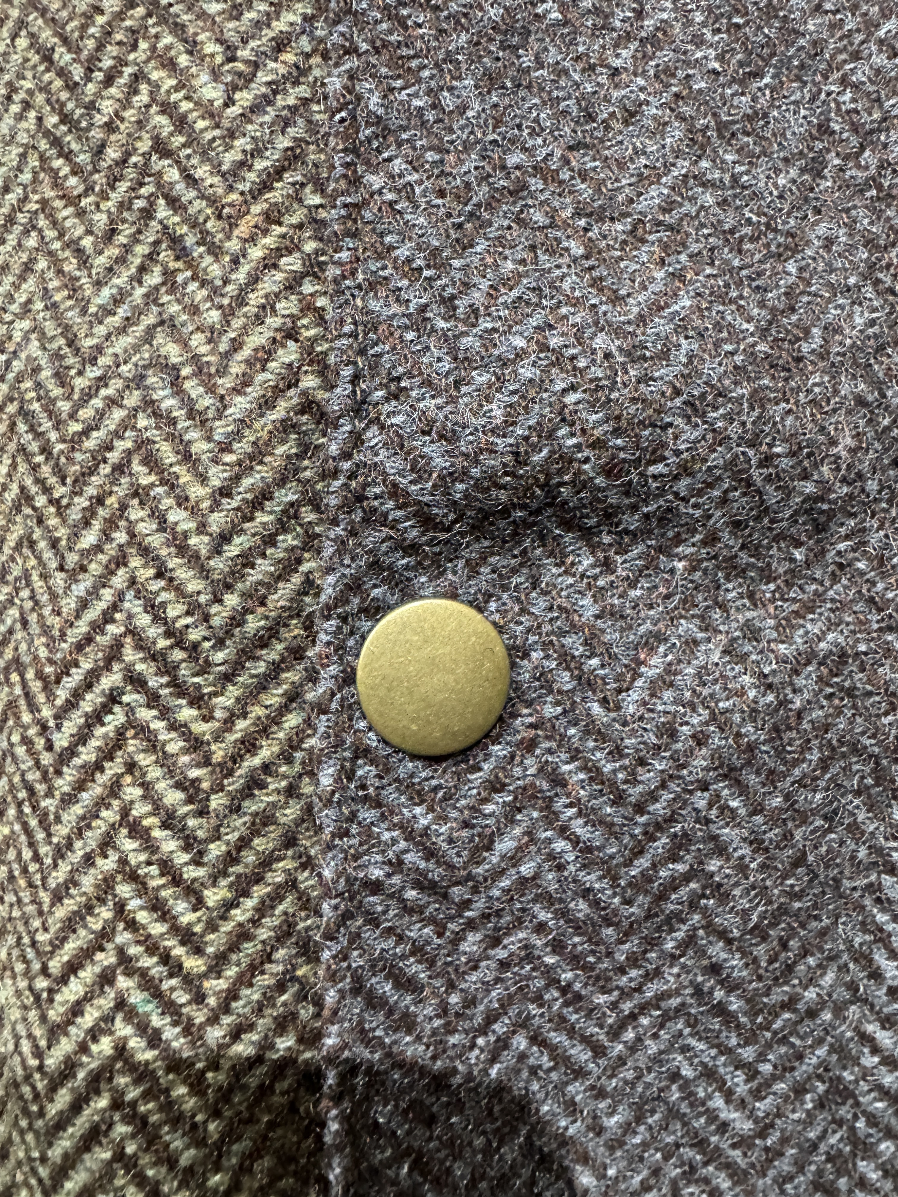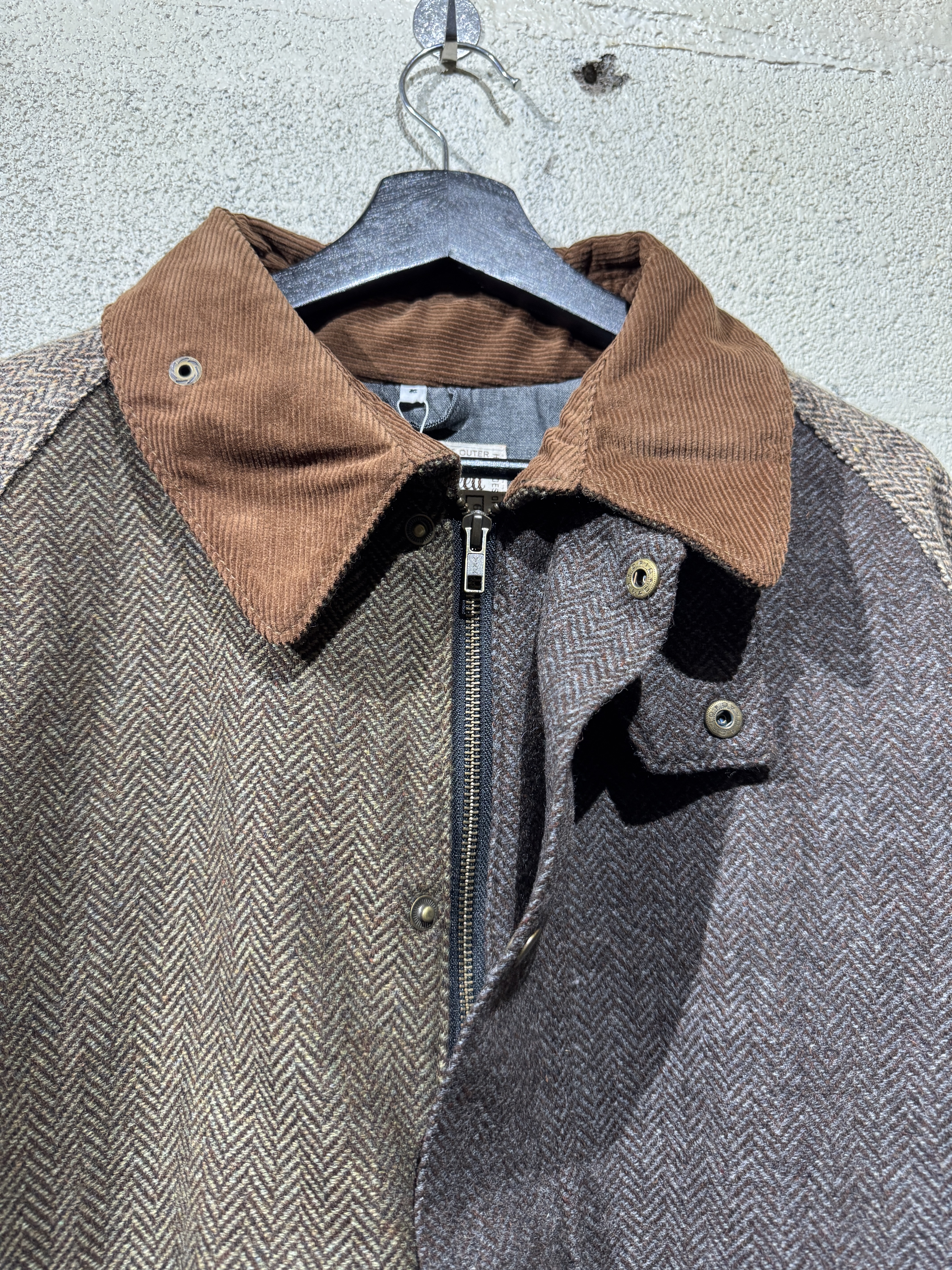 Hariss tweed drivers jacket ビンテージのハリスツイードジャケットを解体しドライバーズジャケットに再構築しました。 シルエット、サイズ感はyousedレザードライバーズジャケットと同じです。 ややゆったりとしたコーチジャケットタイプで合わせやすいデザインです。 カラーは大まかにブラウン系とグレー系の2種類、襟のコーデュロイもボディカラーに合わせてあります。 尚、ビンテージのハリスツイードを使用してますので全て1点ものとなり個性を大切にしたyousedらしいデザインです。 サイズは1、2の2サイズ展開です。 当商品のカラーはブラウン系です。 着画は170cm.60kgのものがサイズ1を着用しています。 詳細寸法 サイズ:2 着丈:70cm 身幅:70cm 裄丈:89cm