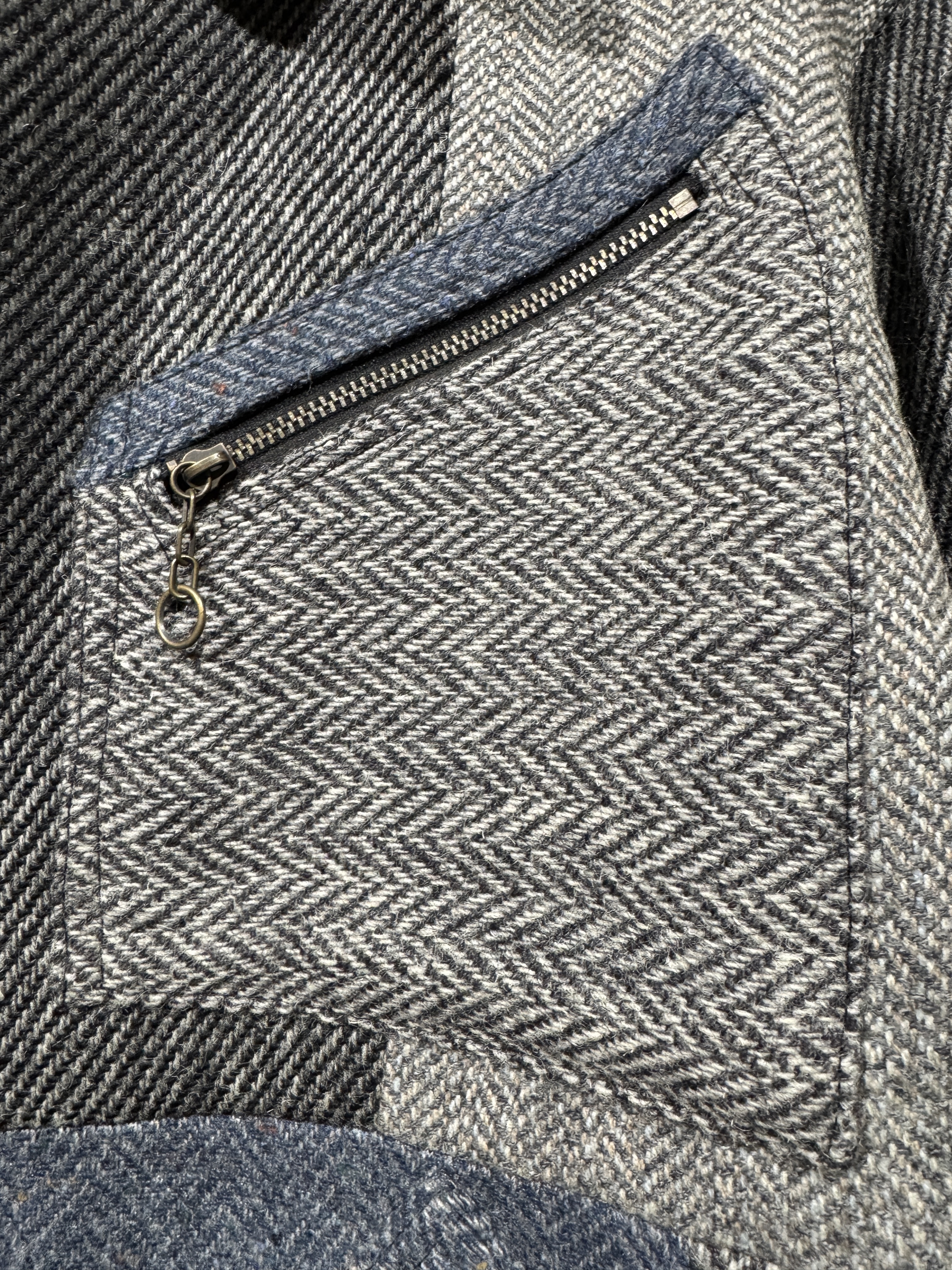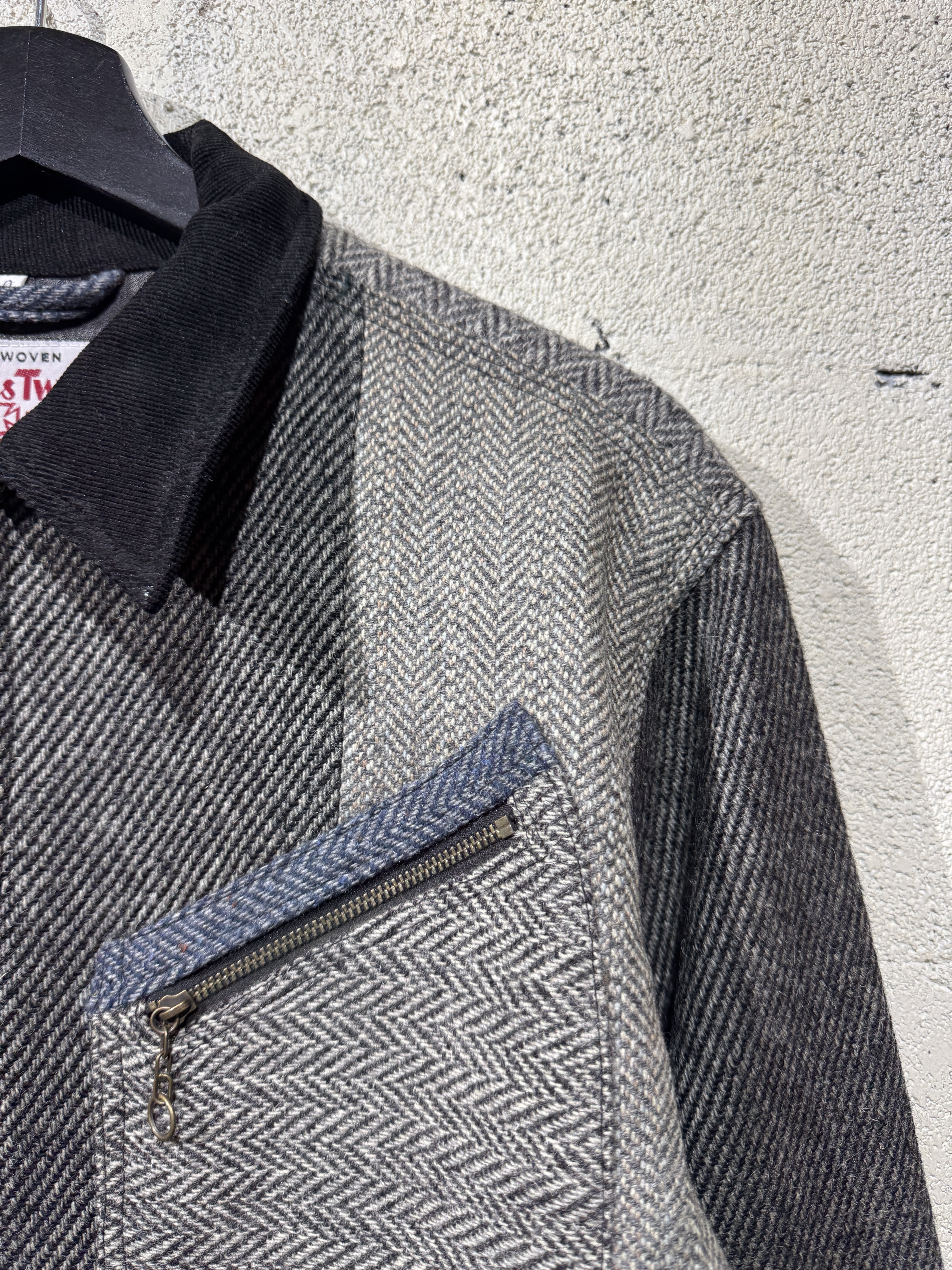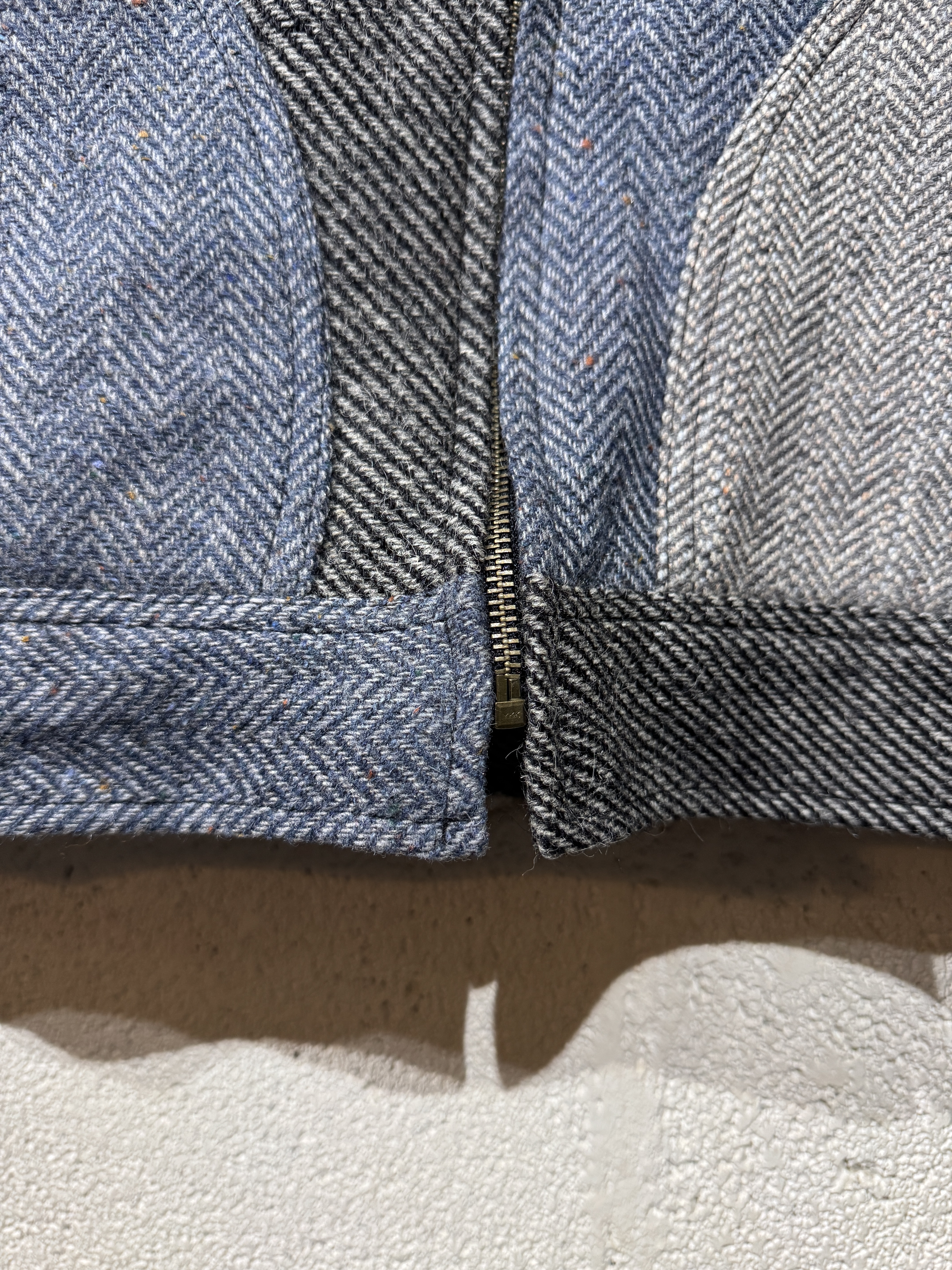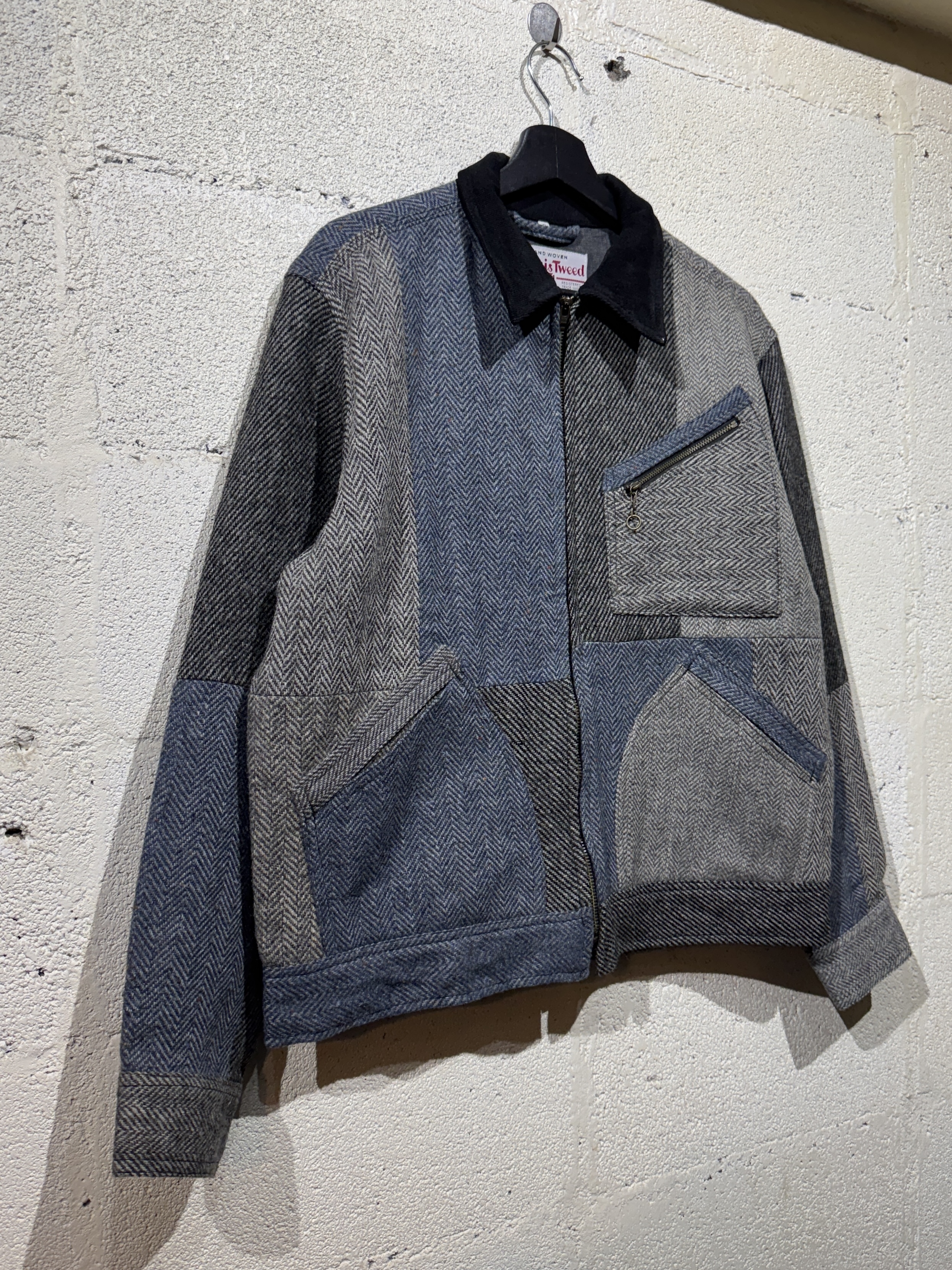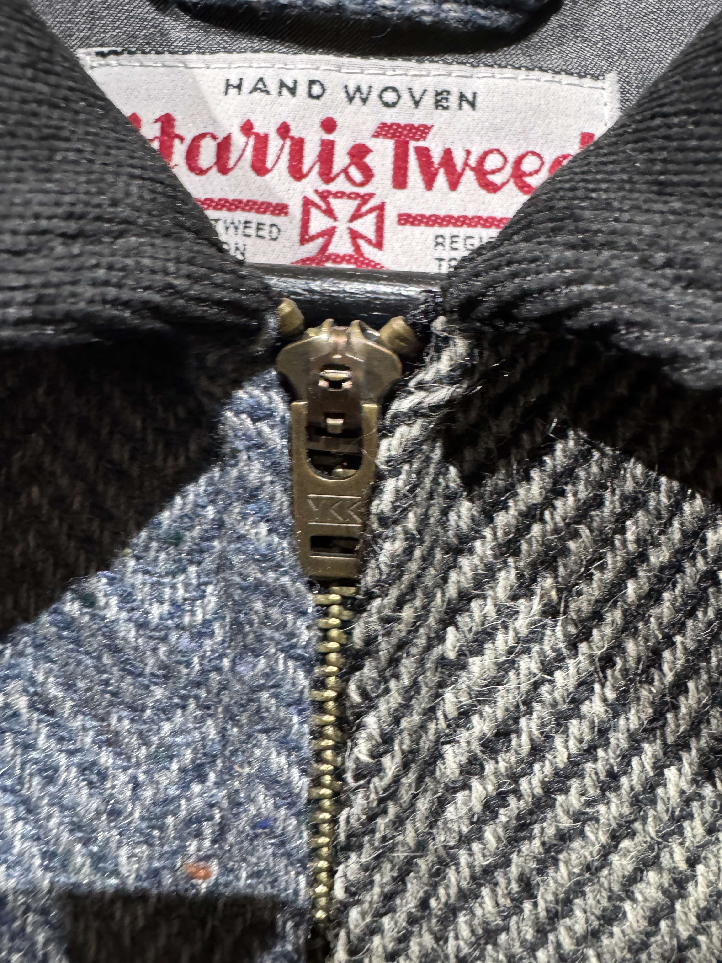 Harris Tweed Sports jacket(91B) レザーで好評の91Bタイプのスポーツジャケットをハリスツイードにて作りました。ハリスツイードは70〜90年代のクラシカルなビンテージをピックし、細かなパーツに分けて再構築してあります。襟はコーデュロイ仕様、ビンテージの91Bよりもやや小ぶりに作ってあります。裏地はシャンブレー生地、また特徴的な胸の斜めポケットのジッパーには91Bのアイコンであるリングトップを付属してます。シルエットはショート丈の太すぎず細すぎずのスポーティーなシルエット。またツイードはレザーに比べ軽いのでストレスを感じさせません。1929年にLeeが発売して約100年。スタイルの変更がほぼ無い完成されたモデルで流行に左右されることなく長くご愛用頂けること間違いありません。カラーはグレー系、ブラウン系の2種、一つ一つ違いますので写真でご確認ください。またサイズは0.1.2の3サイズ、着画は170cm.60kgのものがニットの上から「1」を着用しています。 詳細寸法 サイズ0 身幅:60cm 袖丈:59cm 肩幅:49cm 着丈:62cm
