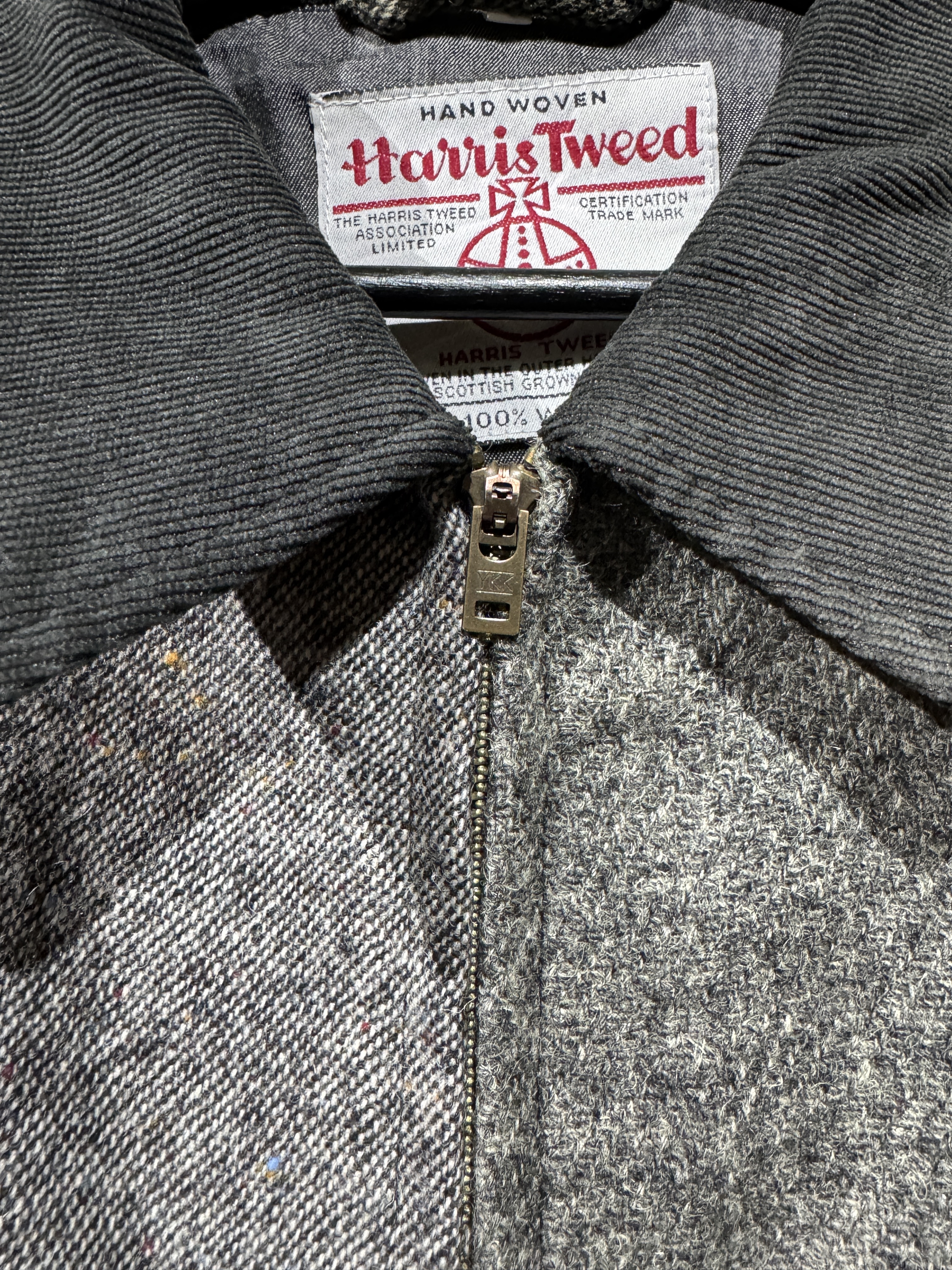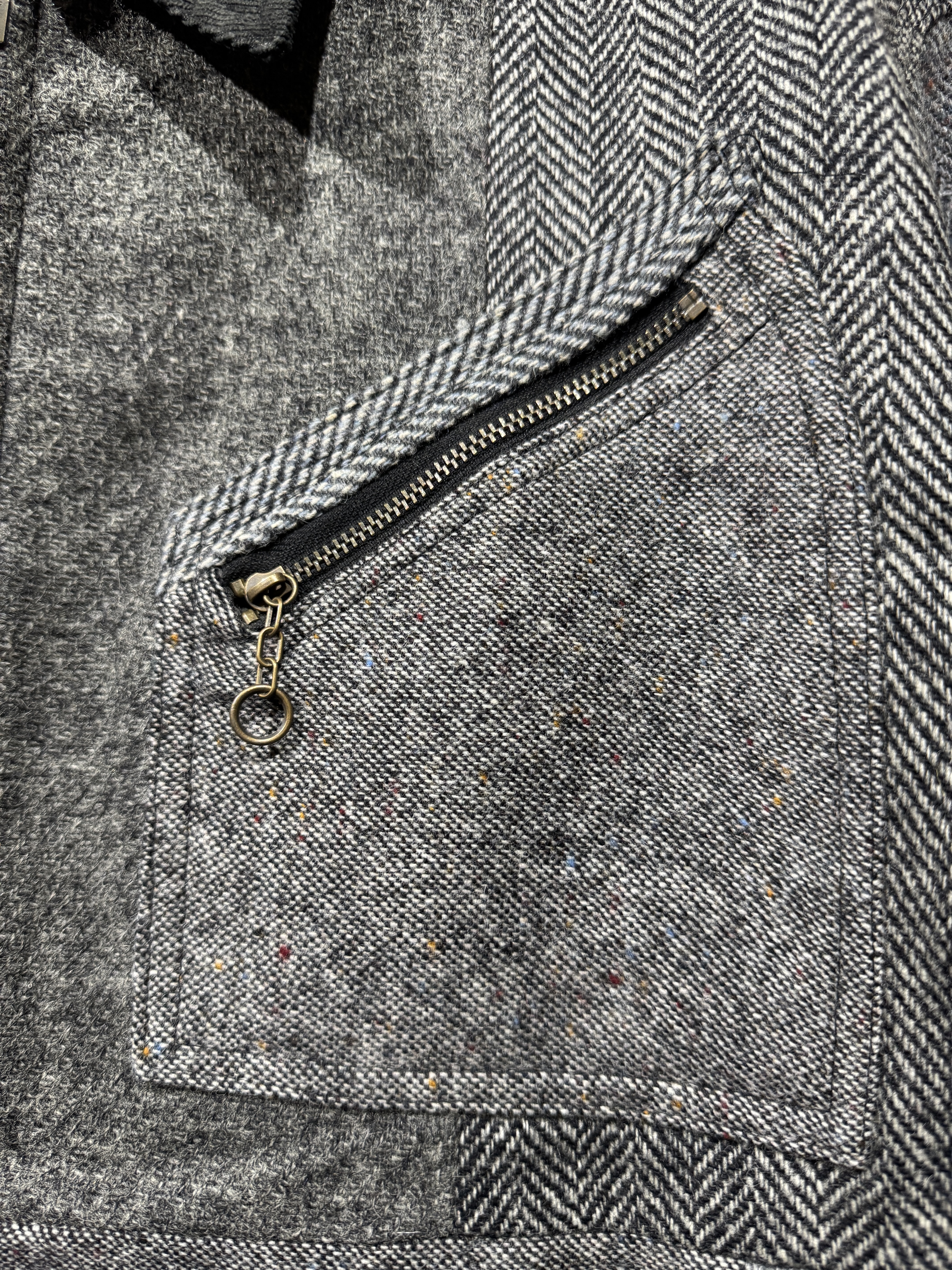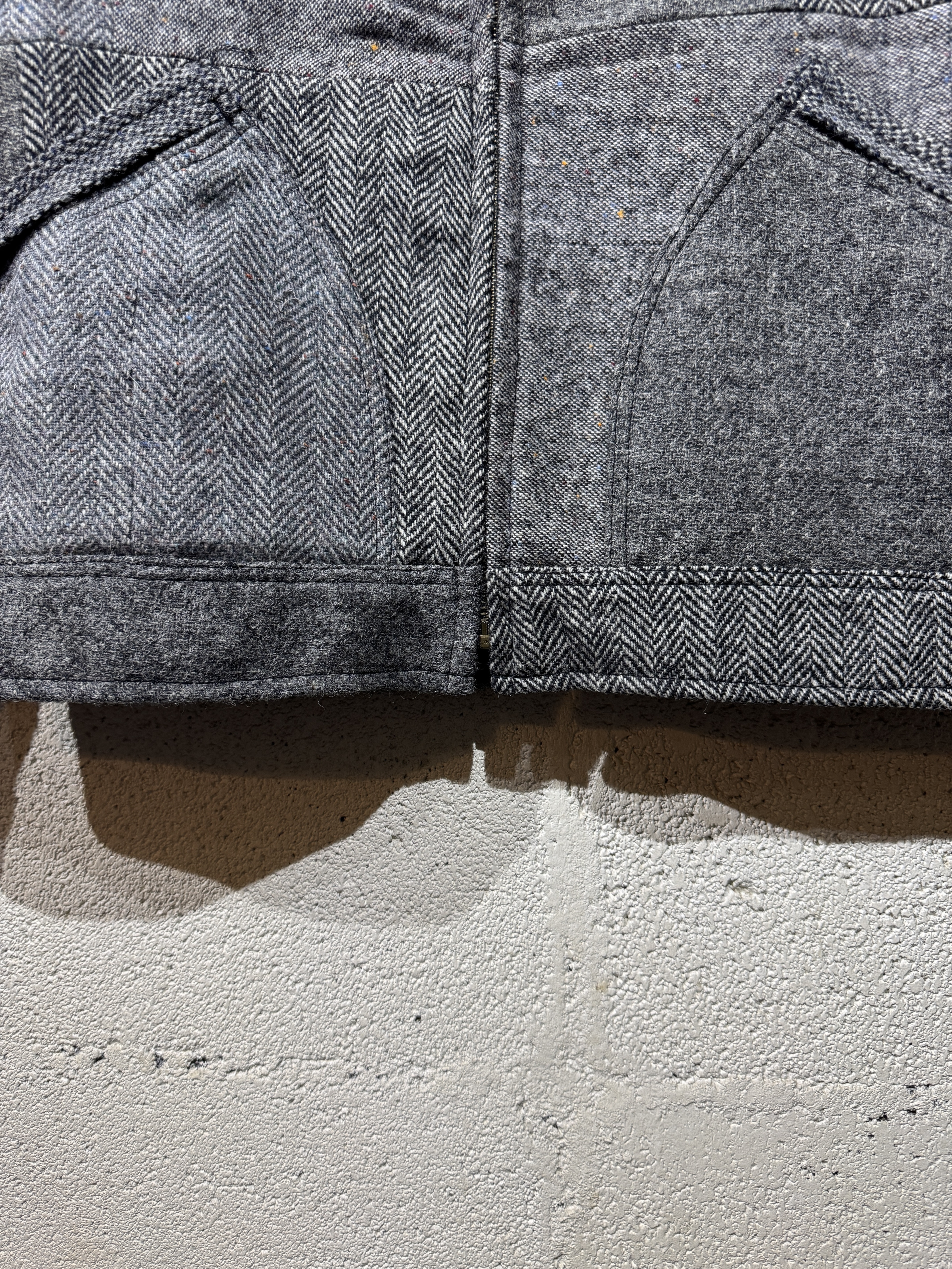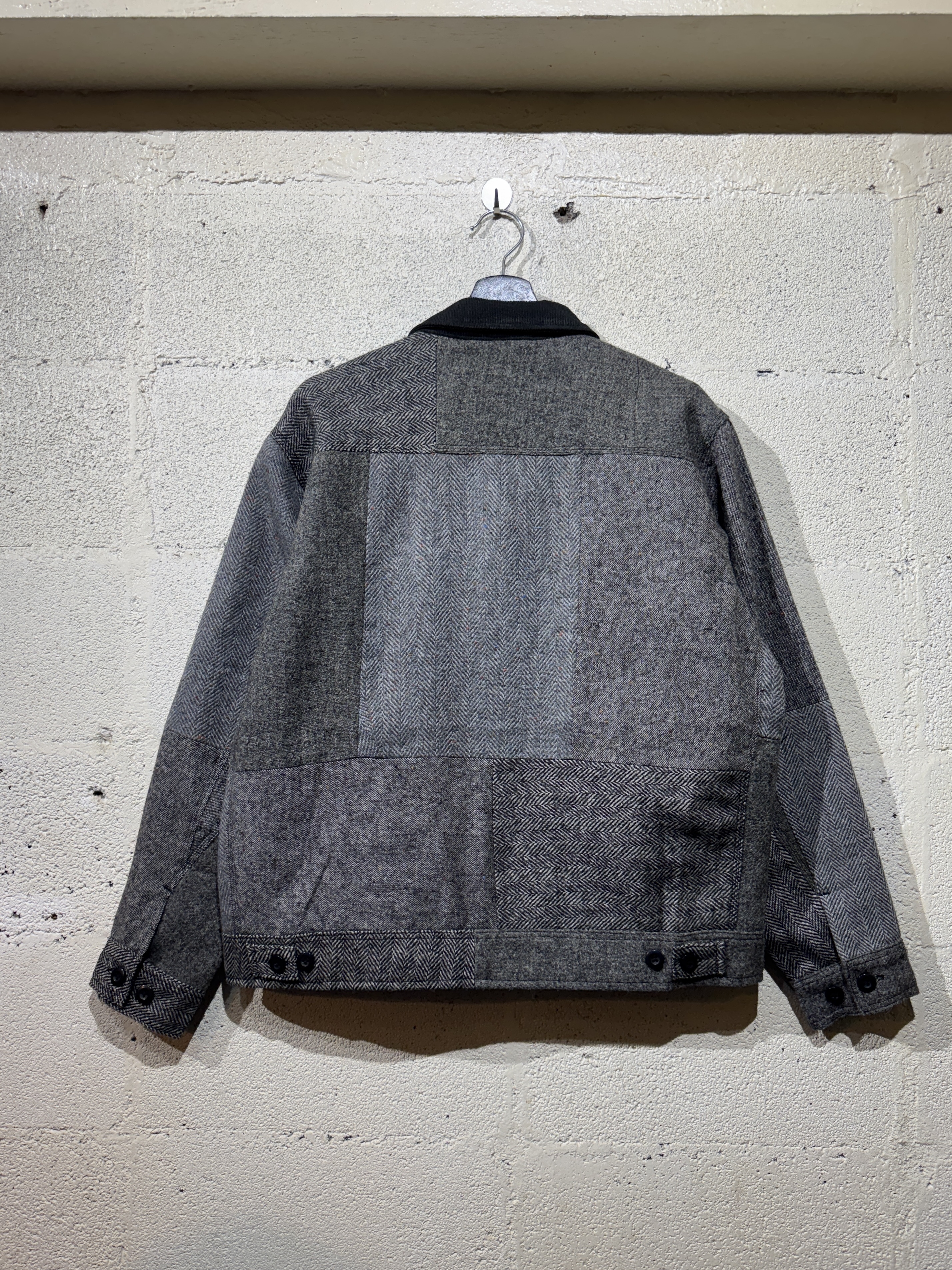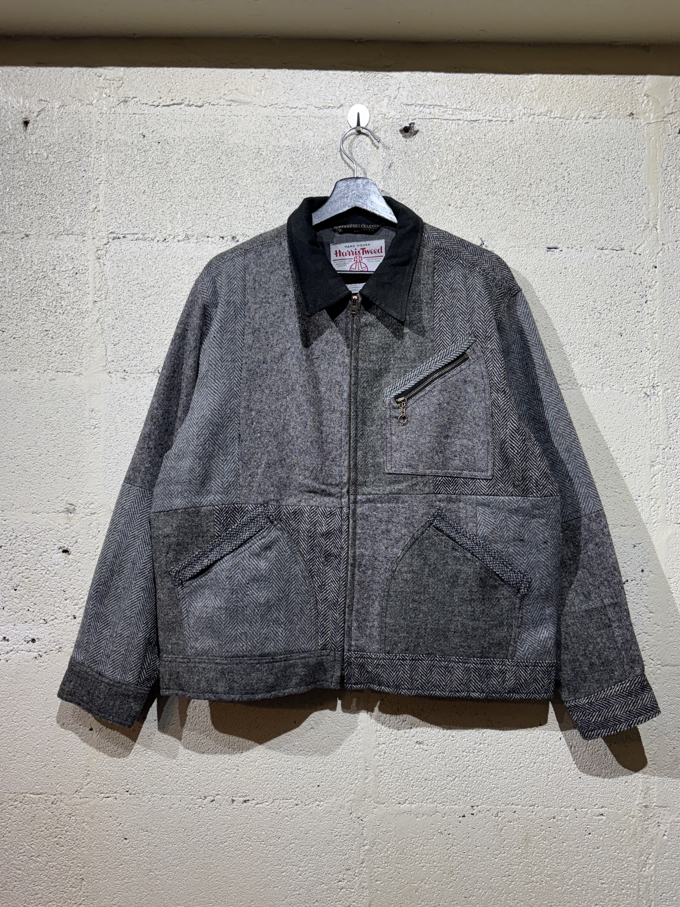 Harris Tweed Sports jacket(91B) レザーで好評の91Bタイプのスポーツジャケットをハリスツイードにて作りました。ハリスツイードは70〜90年代のクラシカルなビンテージをピックし、細かなパーツに分けて再構築してあります。襟はコーデュロイ仕様、ビンテージの91Bよりもやや小ぶりに作ってあります。裏地はシャンブレー生地、また特徴的な胸の斜めポケットのジッパーには91Bのアイコンであるリングトップを付属してます。シルエットはショート丈の太すぎず細すぎずのスポーティーなシルエット。またツイードはレザーに比べ軽いのでストレスを感じさせません。1929年にLeeが発売して約100年。スタイルの変更がほぼ無い完成されたモデルで流行に左右されることなく長くご愛用頂けること間違いありません。カラーはグレー系、ブラウン系の2種、一つ一つ違いますので写真でご確認ください。またサイズは0.1.2の3サイズ、着画は170cm.60kgのものがニットの上から「1」を着用しています。 詳細寸法 サイズ1 身幅:62cm 袖丈:59cm 肩幅:49cm 着丈:65cm
