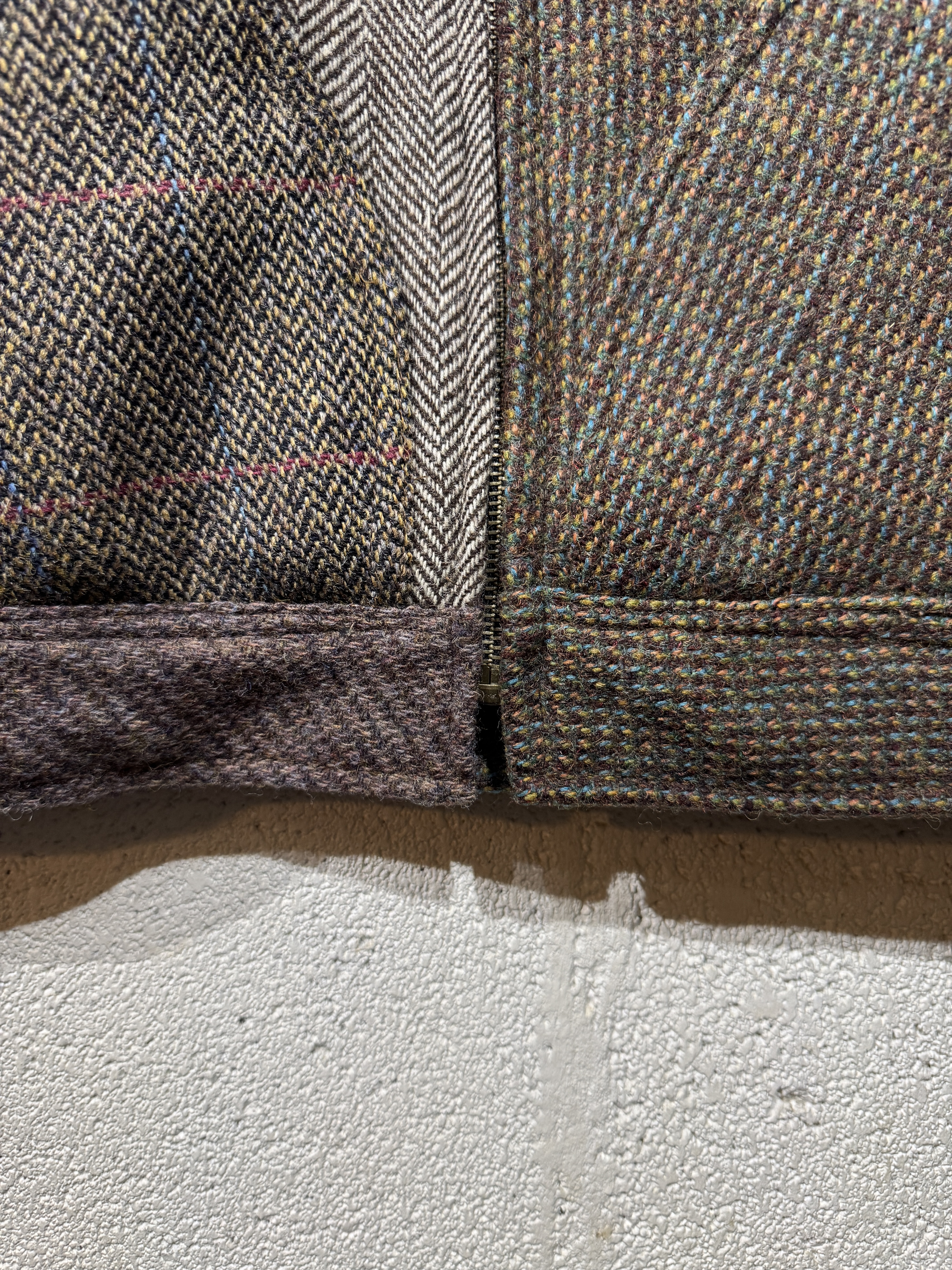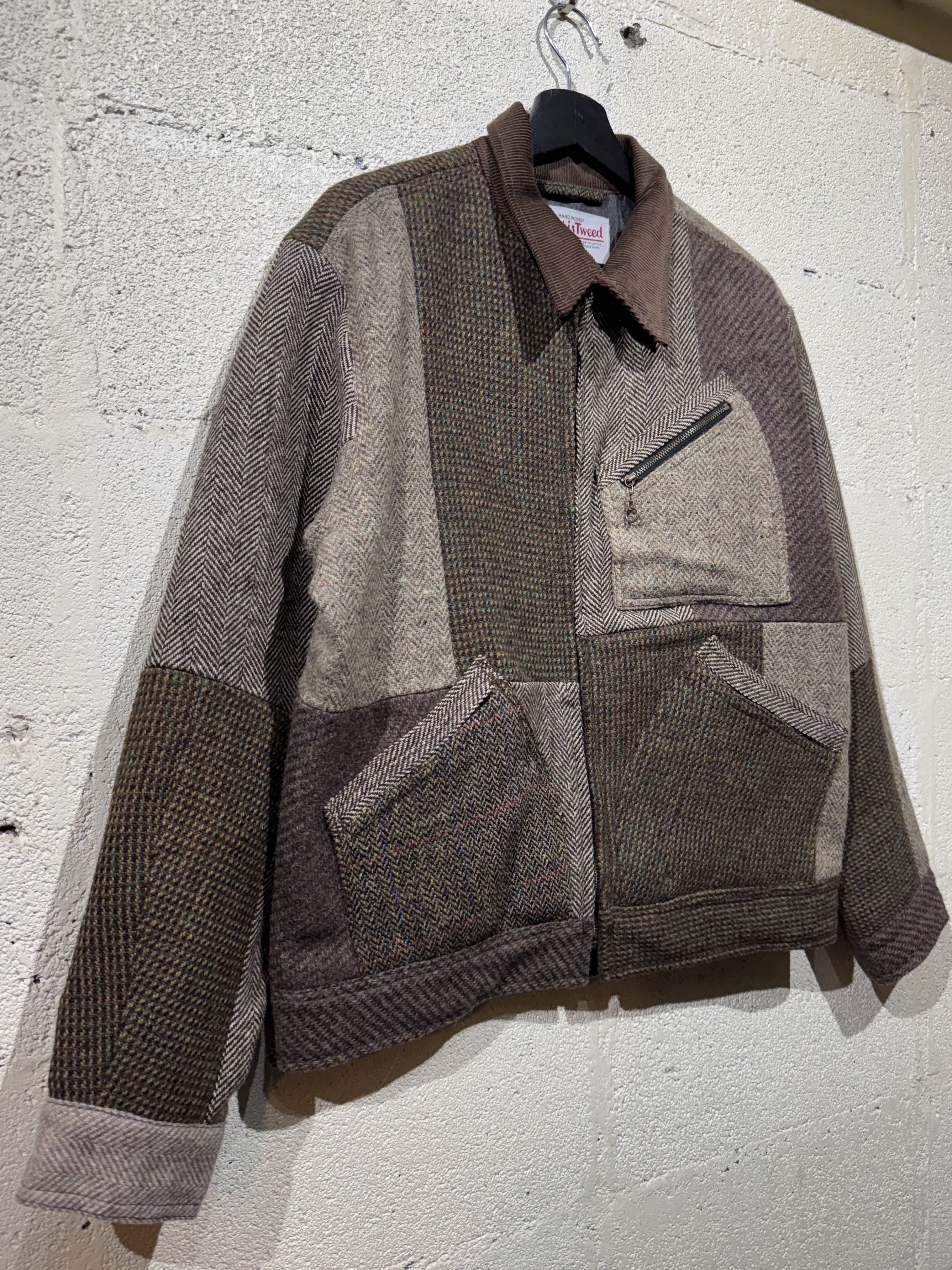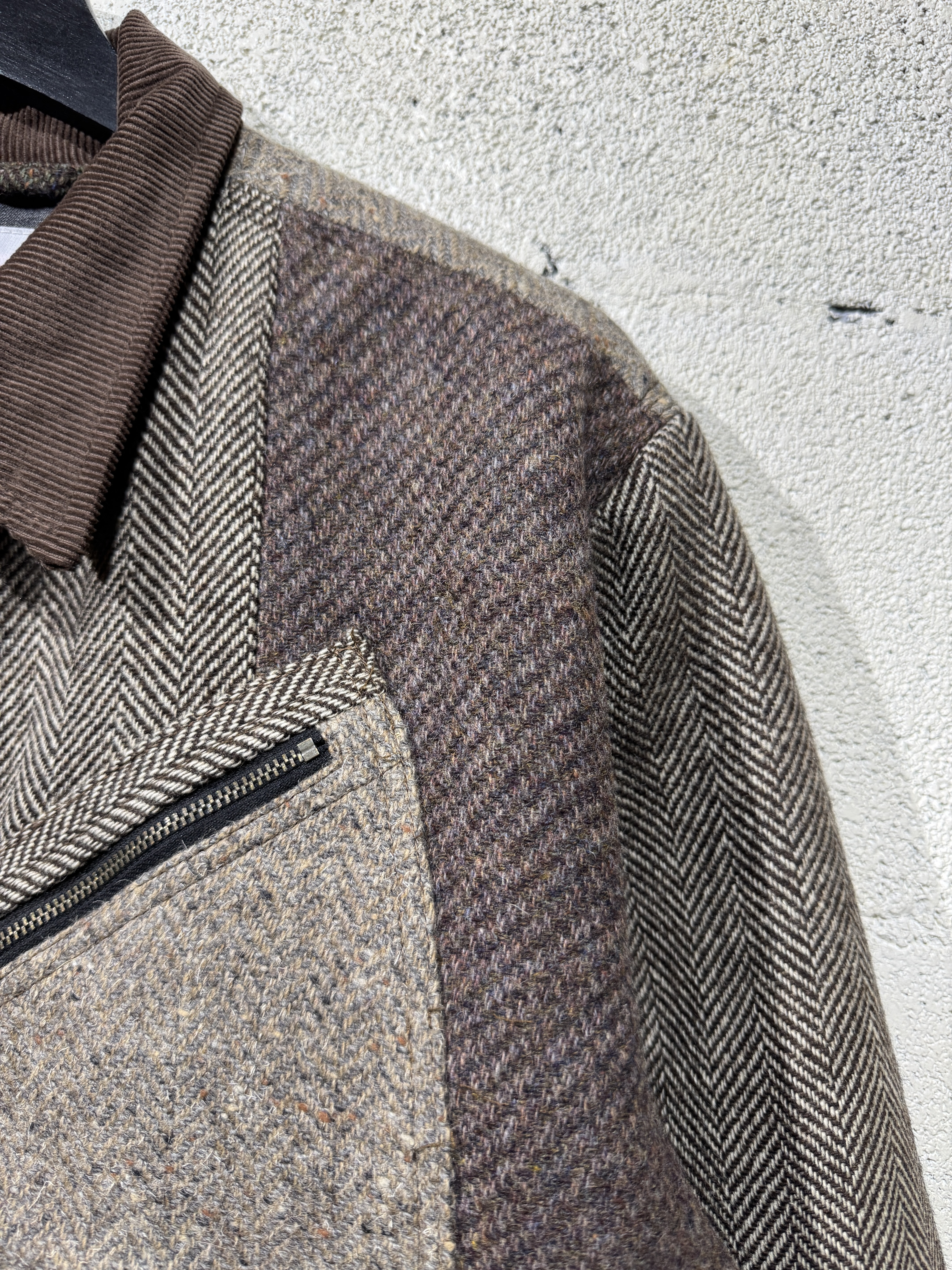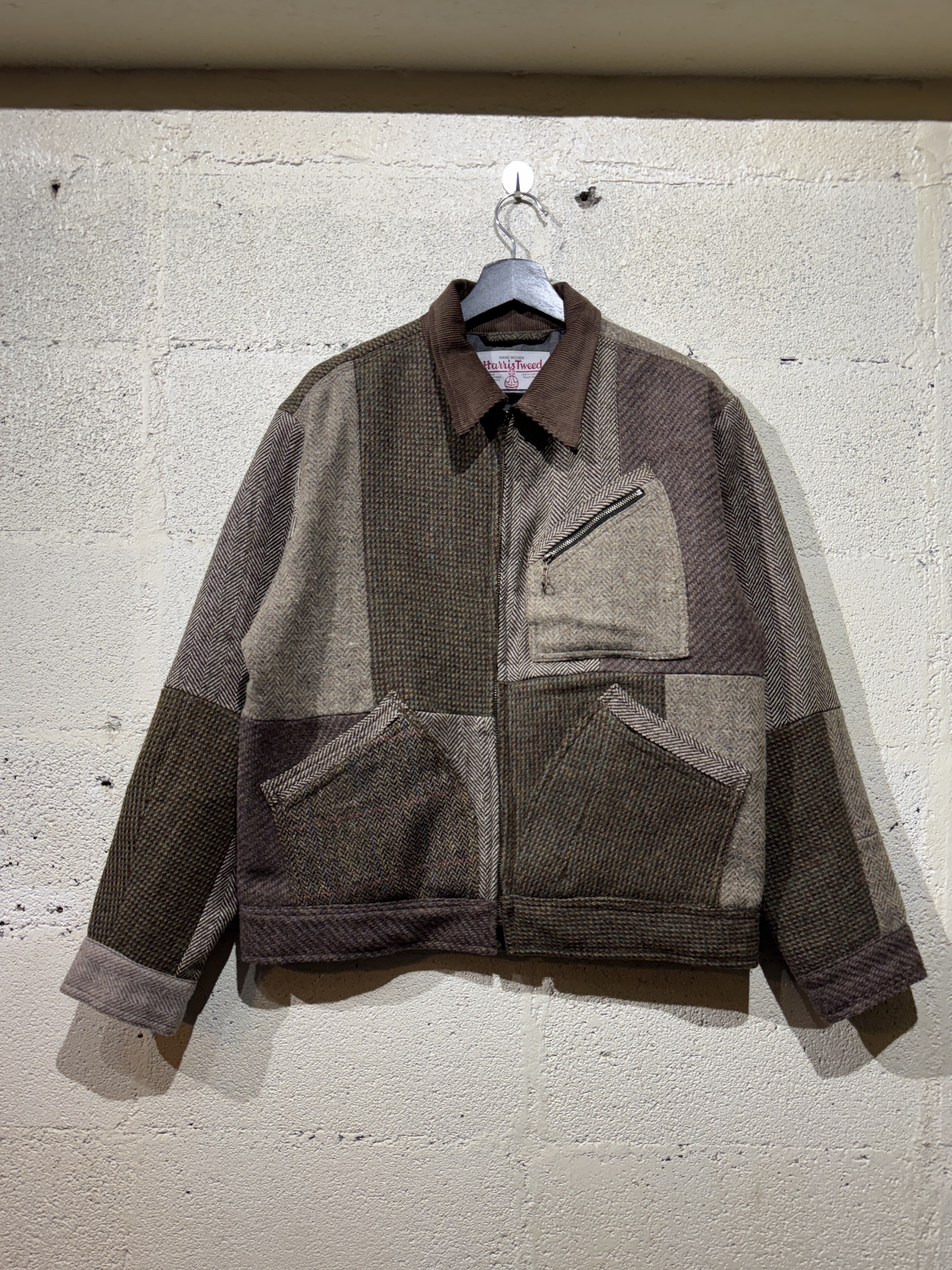 Harris Tweed Sports jacket(91B) レザーで好評の91Bタイプのスポーツジャケットをハリスツイードにて作りました。ハリスツイードは70〜90年代のクラシカルなビンテージをピックし、細かなパーツに分けて再構築してあります。襟はコーデュロイ仕様、ビンテージの91Bよりもやや小ぶりに作ってあります。裏地はシャンブレー生地、また特徴的な胸の斜めポケットのジッパーには91Bのアイコンであるリングトップを付属してます。シルエットはショート丈の太すぎず細すぎずのスポーティーなシルエット。またツイードはレザーに比べ軽いのでストレスを感じさせません。1929年にLeeが発売して約100年。スタイルの変更がほぼ無い完成されたモデルで流行に左右されることなく長くご愛用頂けること間違いありません。カラーはグレー系、ブラウン系の2種、一つ一つ違いますので写真でご確認ください。またサイズは0.1.2の3サイズ、着画は170cm.60kgのものがニットの上から「1」を着用しています。 詳細寸法 サイズ0 身幅:60cm 袖丈:59cm 肩幅:49cm 着丈:62cm