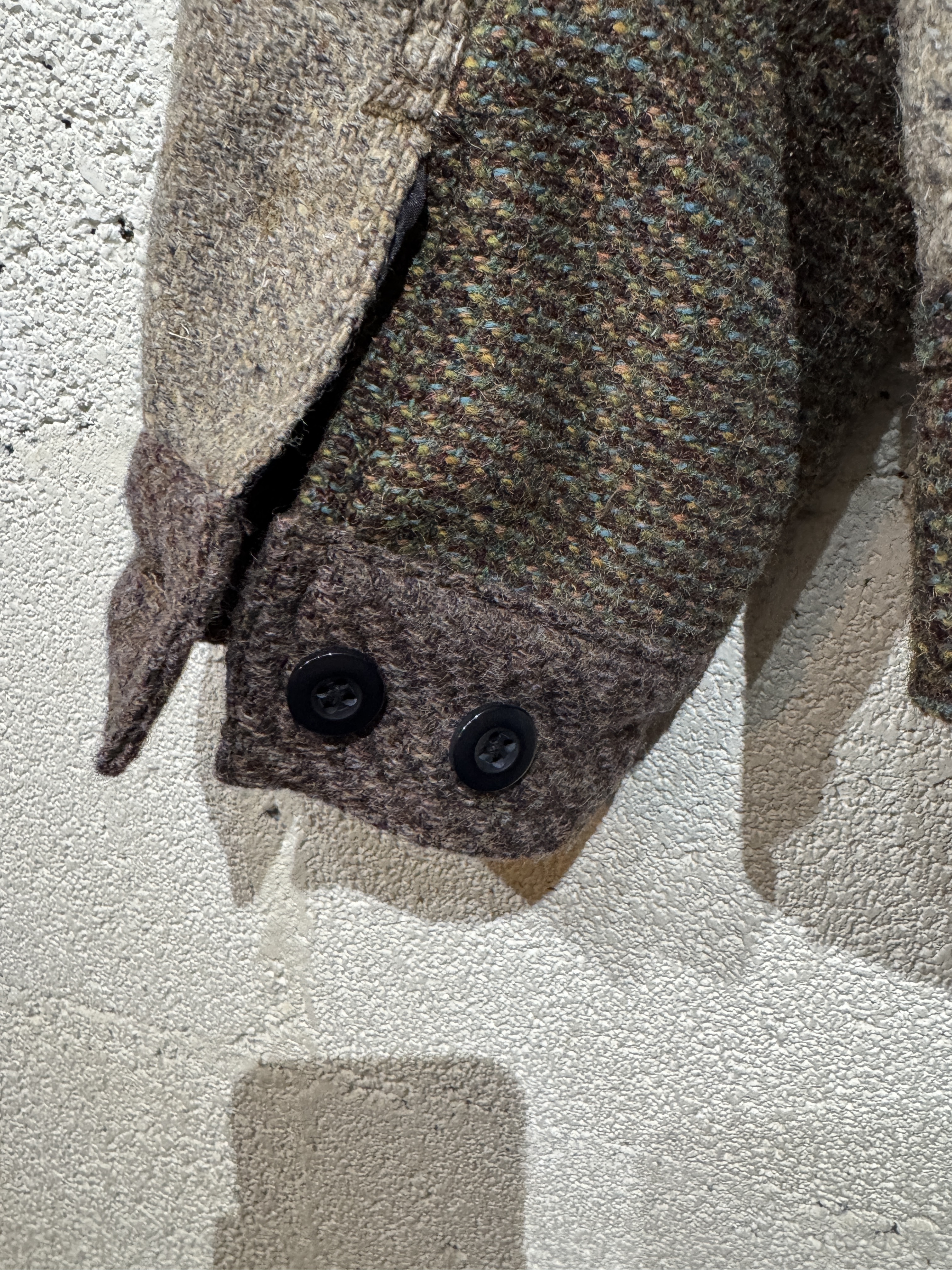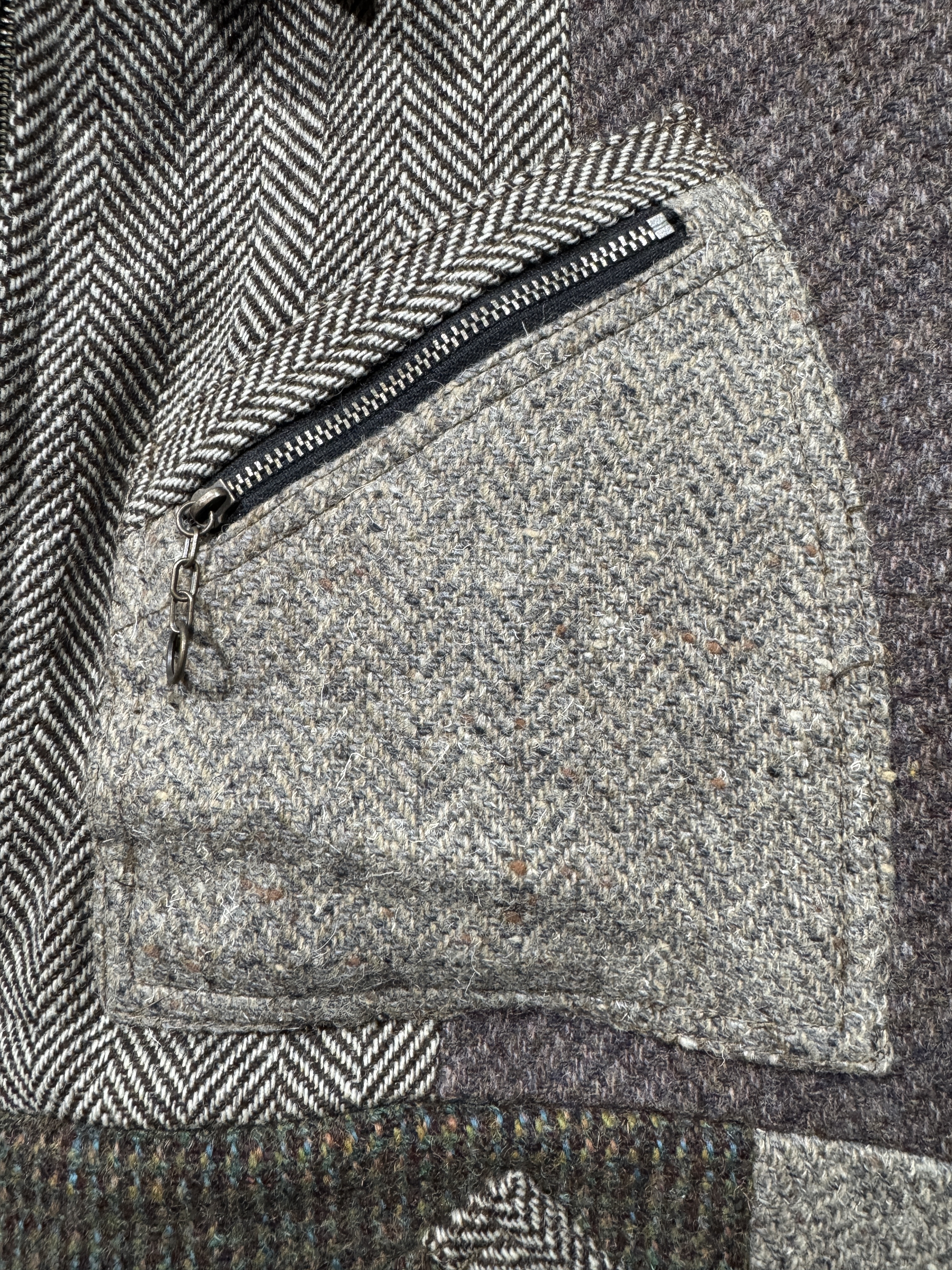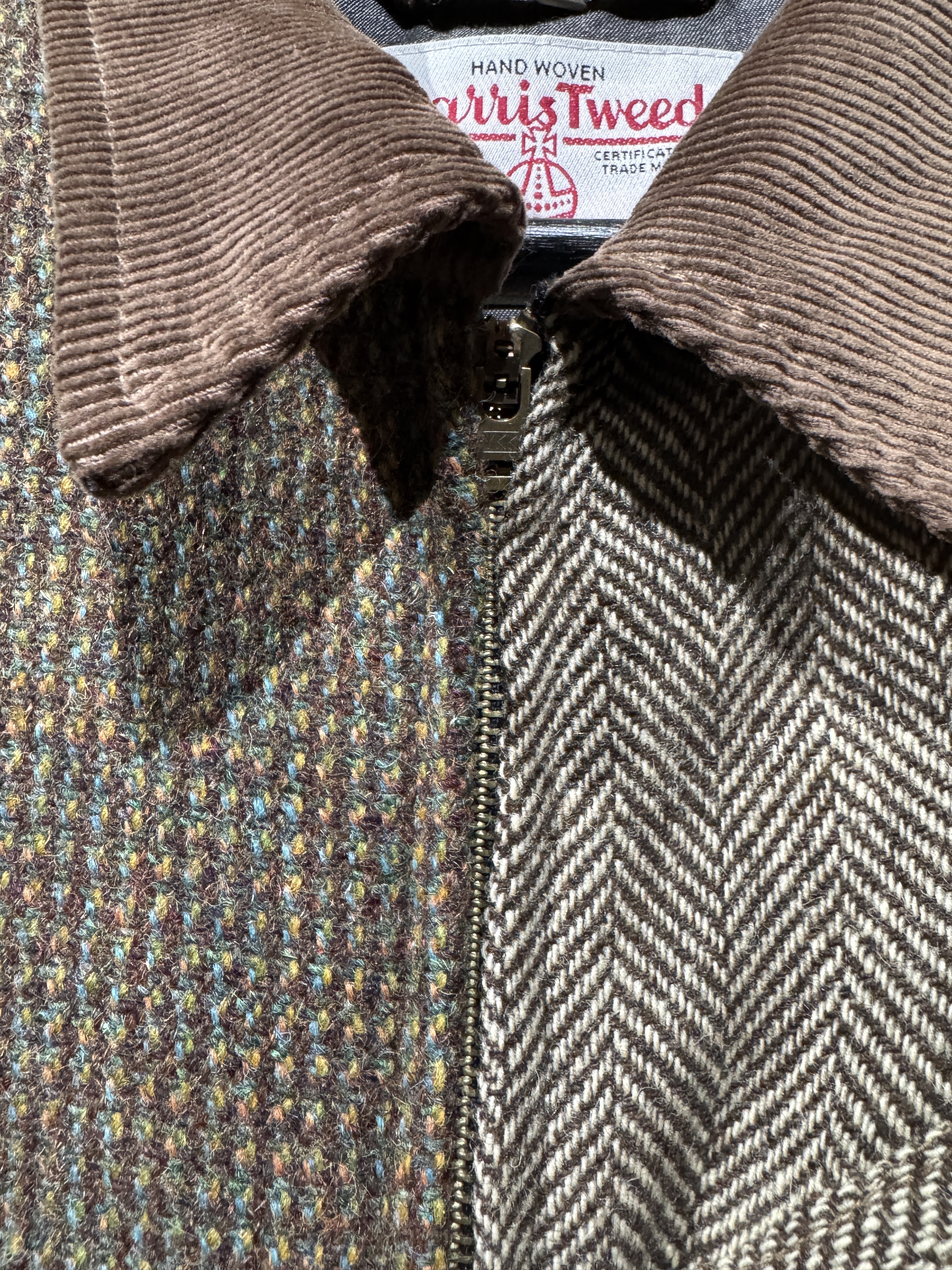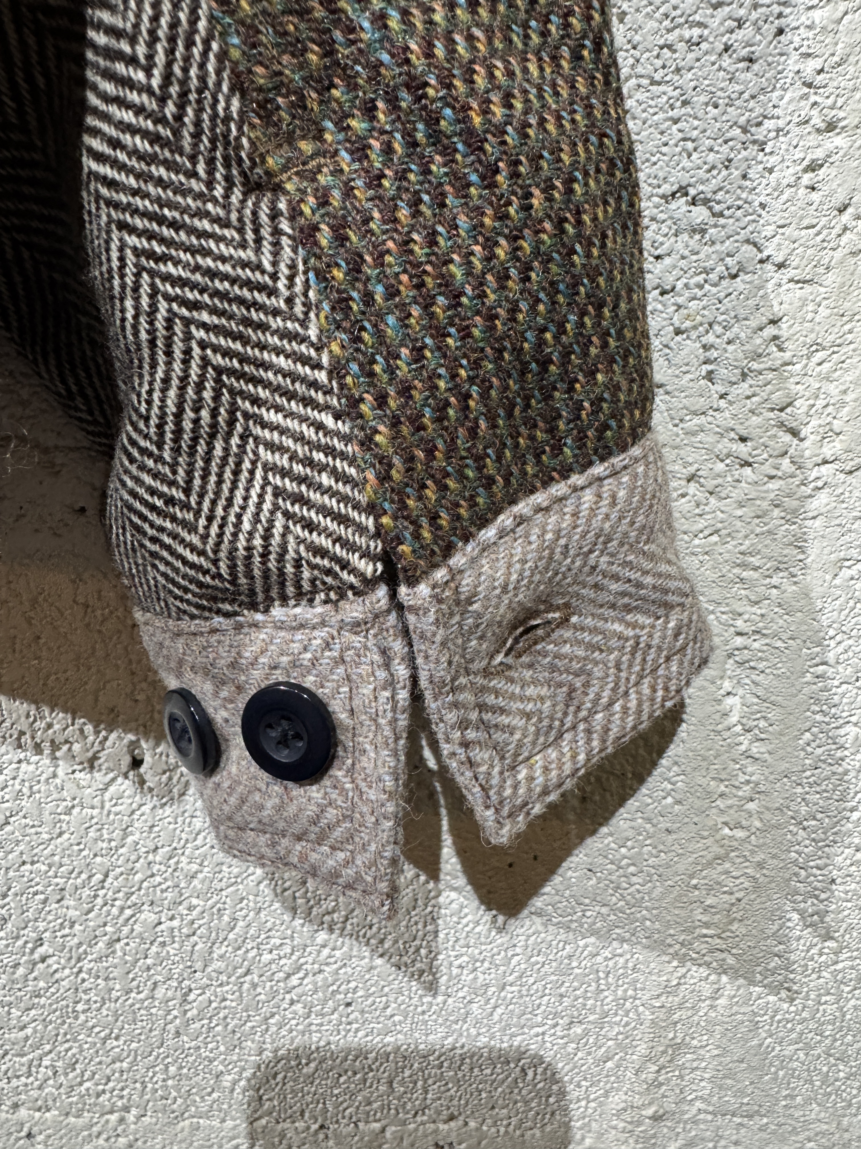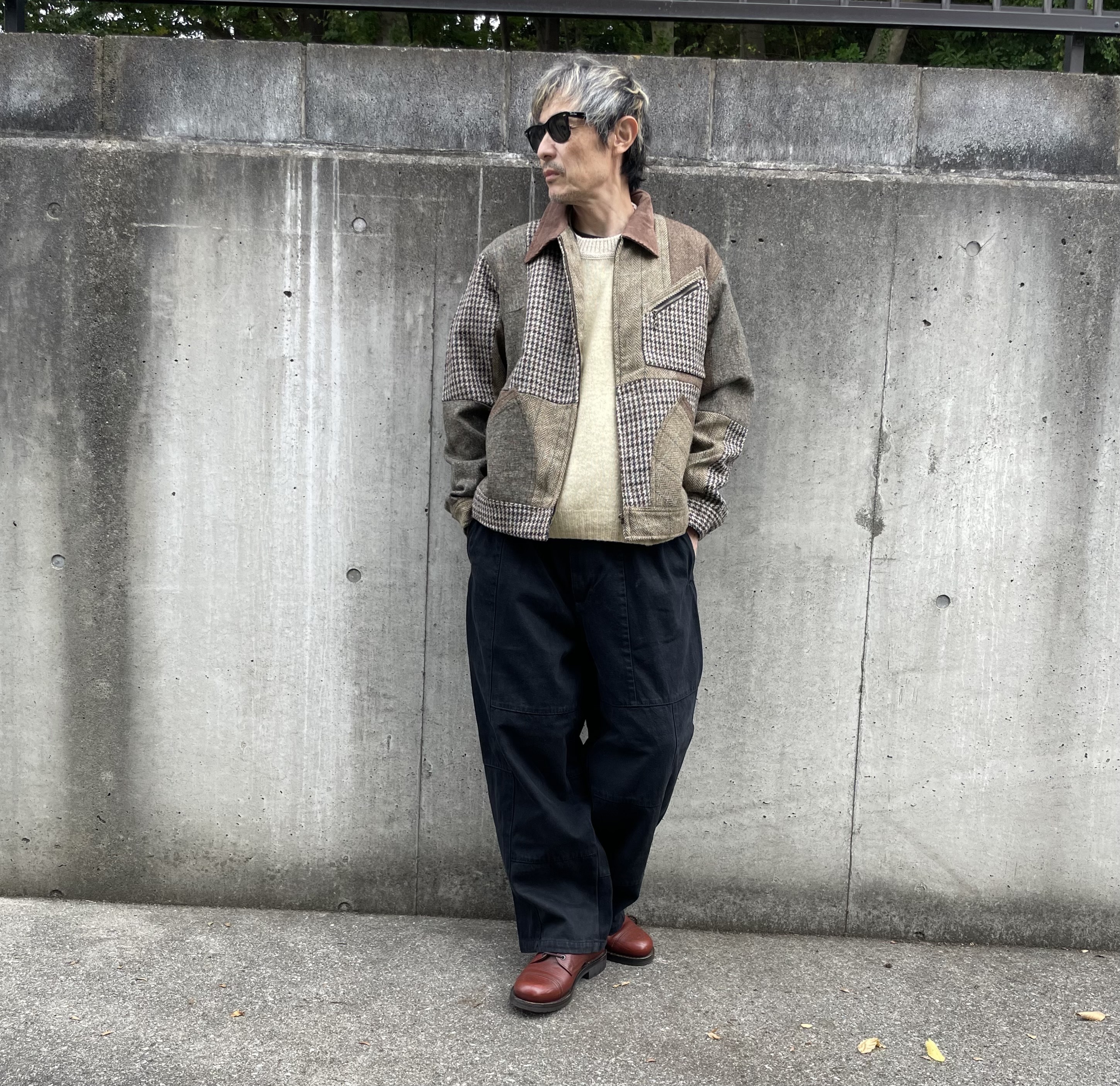Harris Tweed Sports jacket(91B) レザーで好評の91Bタイプのスポーツジャケットをハリスツイードにて作りました。ハリスツイードは70〜90年代のクラシカルなビンテージをピックし、細かなパーツに分けて再構築してあります。襟はコーデュロイ仕様、ビンテージの91Bよりもやや小ぶりに作ってあります。裏地はシャンブレー生地、また特徴的な胸の斜めポケットのジッパーには91Bのアイコンであるリングトップを付属してます。シルエットはショート丈の太すぎず細すぎずのスポーティーなシルエット。またツイードはレザーに比べ軽いのでストレスを感じさせません。1929年にLeeが発売して約100年。スタイルの変更がほぼ無い完成されたモデルで流行に左右されることなく長くご愛用頂けること間違いありません。カラーはグレー系、ブラウン系の2種、一つ一つ違いますので写真でご確認ください。またサイズは0.1.2の3サイズ、着画は170cm.60kgのものがニットの上から「1」を着用しています。 詳細寸法 サイズ0 身幅:60cm 袖丈:59cm 肩幅:49cm 着丈:62cm