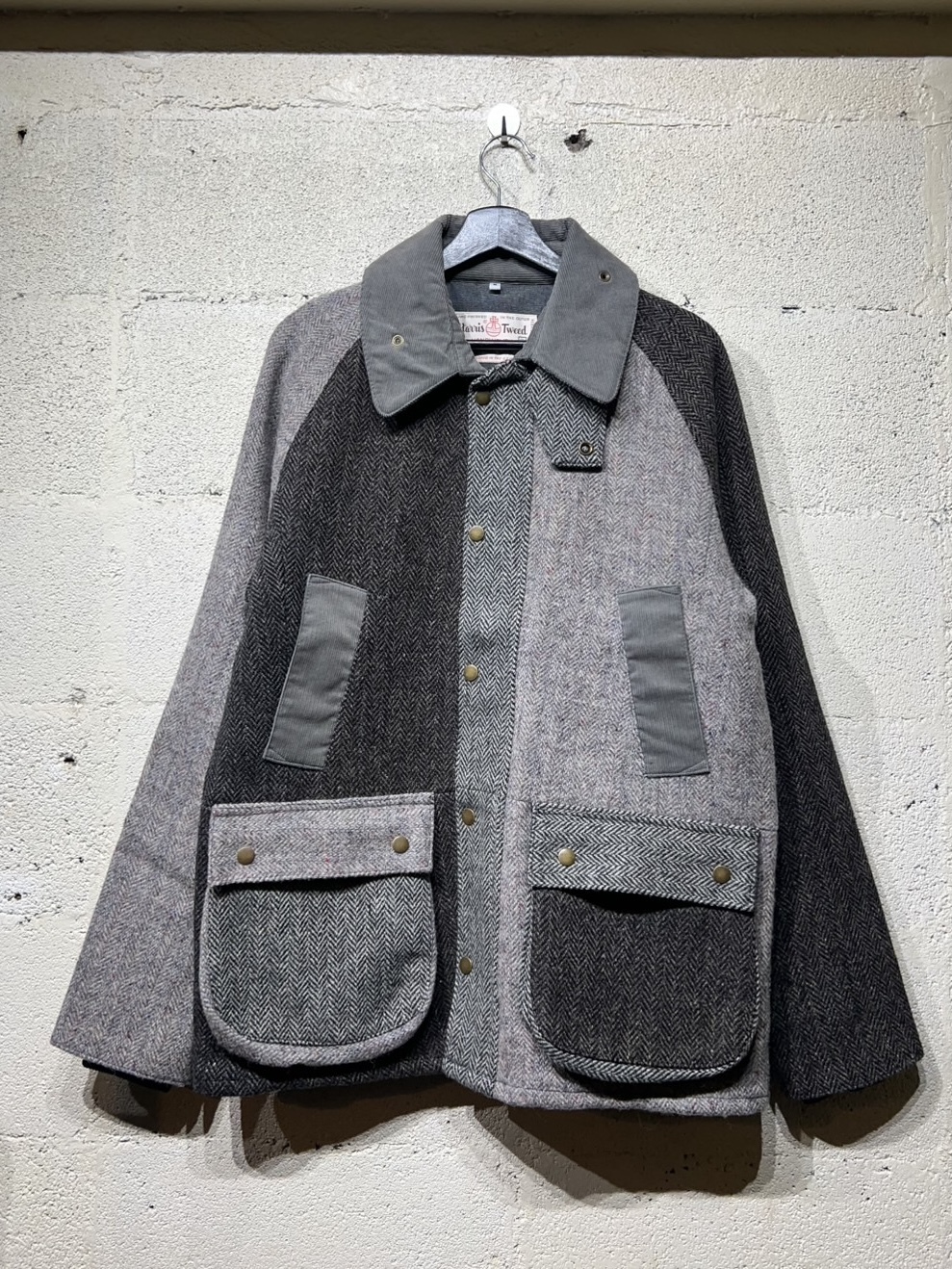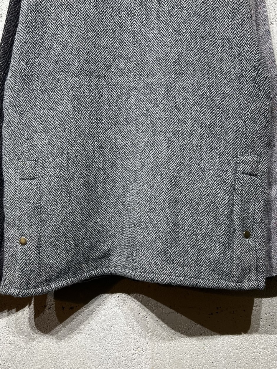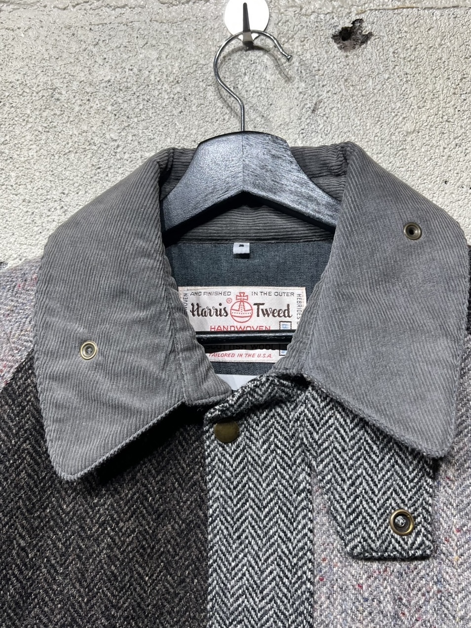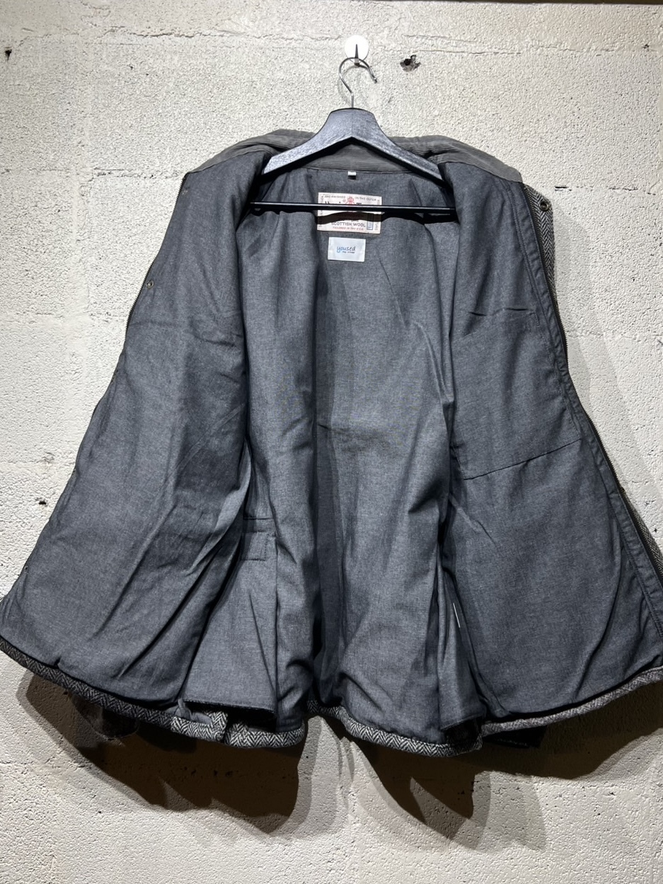 Harris Tweed Country Jacket YOUSED(ユーズド)が手がける、Harris Tweedを使用したカントリージャケット。 スコットランドの伝統素材であるHarris Tweedのヴィンテージウェアを一度解体し、パターンから再構築することで生まれた一着です。 Harris Tweedは、ヴァージンウールを使用し、島内で染色・紡績、職人の自宅で手織りされた生地のみが名乗ることを許された、長い歴史を持つ英国素材。 厳格な基準をクリアしたものだけが正式に認定され、その品質は世界的にも評価されています。 本作では、そのHarris Tweedを細かく分解し、同系色でまとめたクレイジーパターンとして再構築。 パッチワークならではの奥行きある表情と、温かみのあるカラーリングが印象的です。 ラグランスリーブやハンドウォームポケット、マチ付きフラップポケット、チンストラップ付きコーデュロイ襟など、クラシカルなディテールを踏襲。 身頃裏にはシャンブレー、袖裏にはポリエステルを使用し、着用感にも配慮しています。 すべてが一点モノとなる、YOUSEDならではの特別なプロダクトです。 ◯商品詳細 サイズ:2 COLOR:GRAY 詳細寸法 身幅:57cm 着丈:73cm 裄丈:89cm