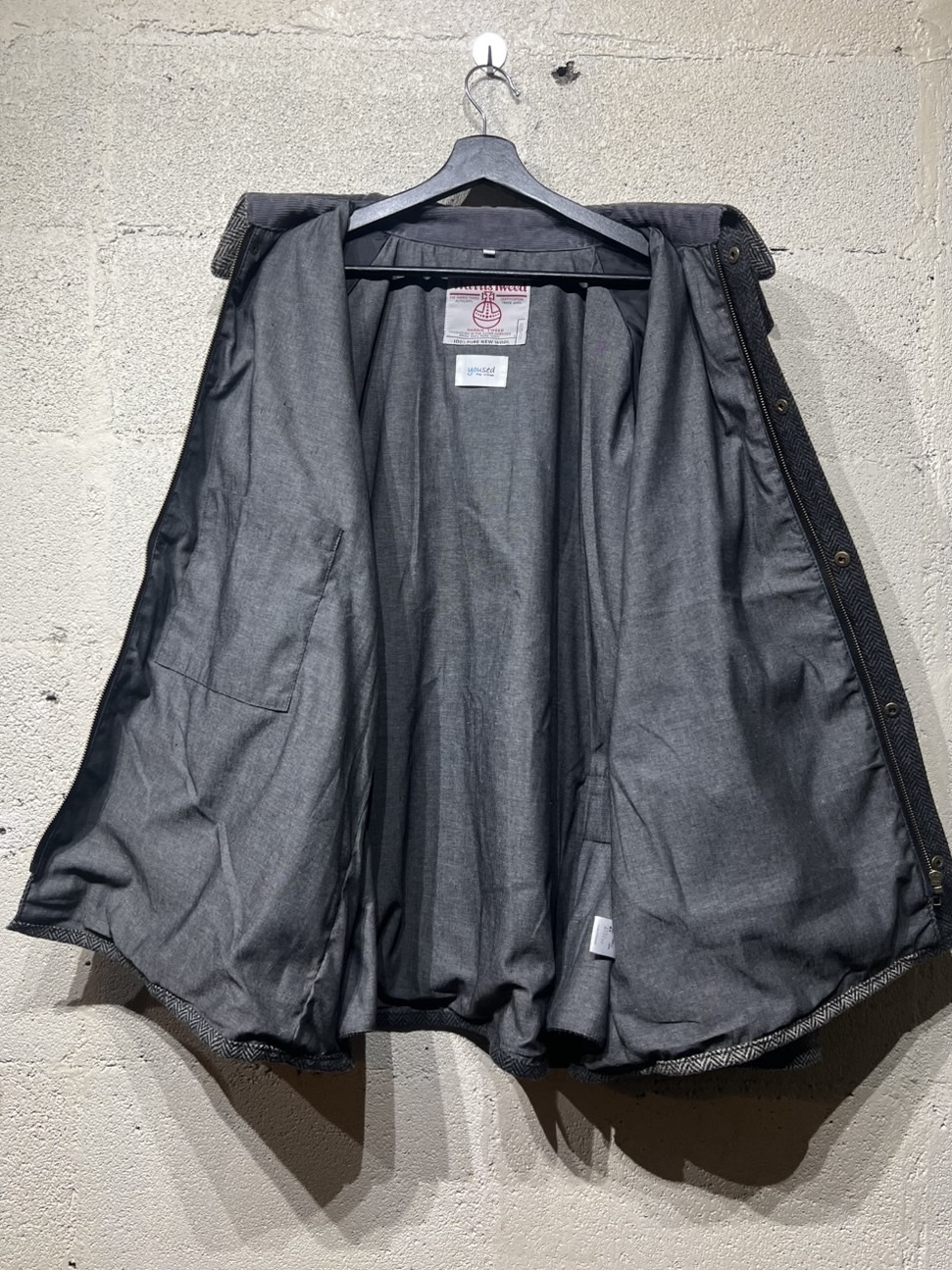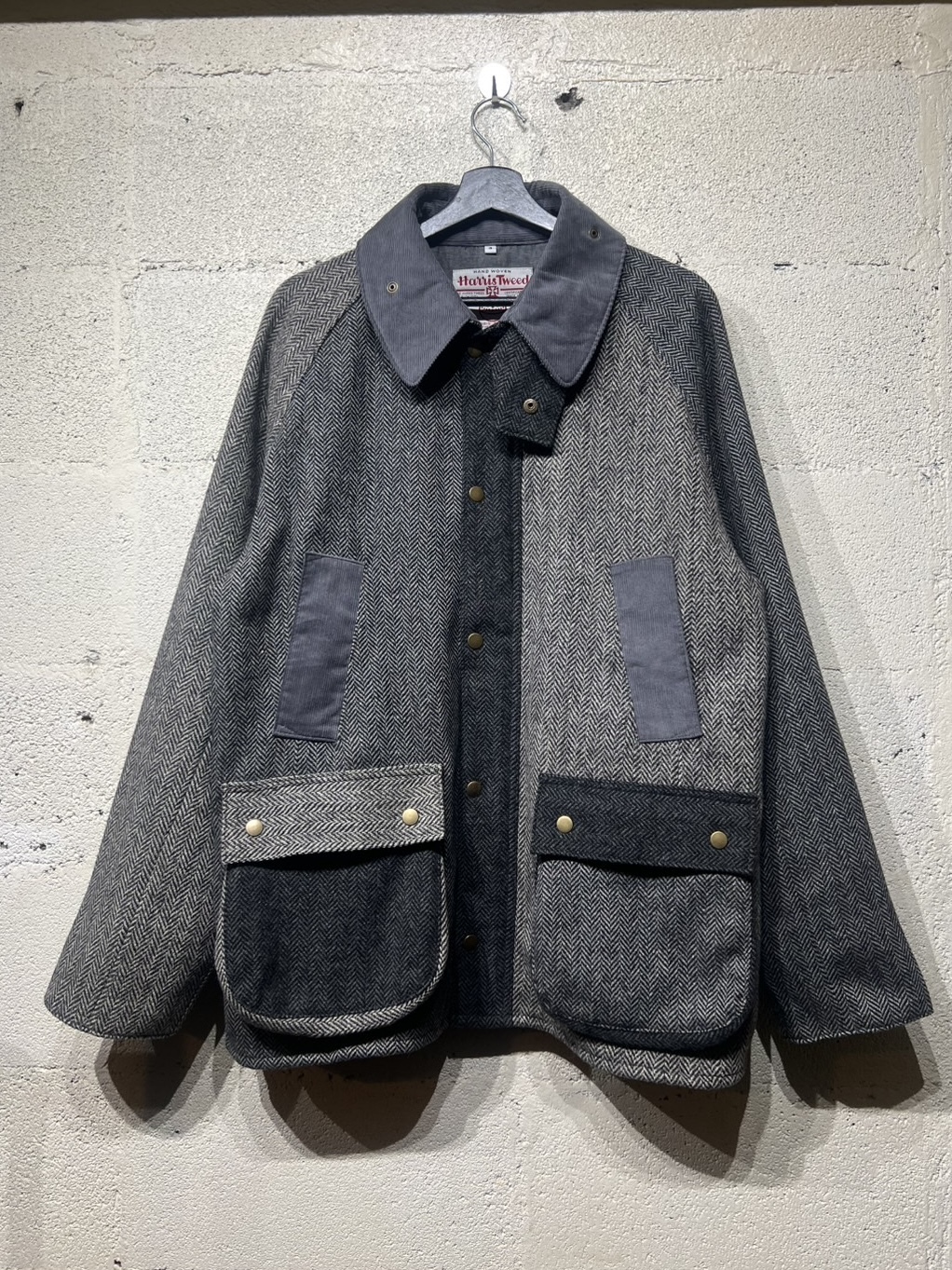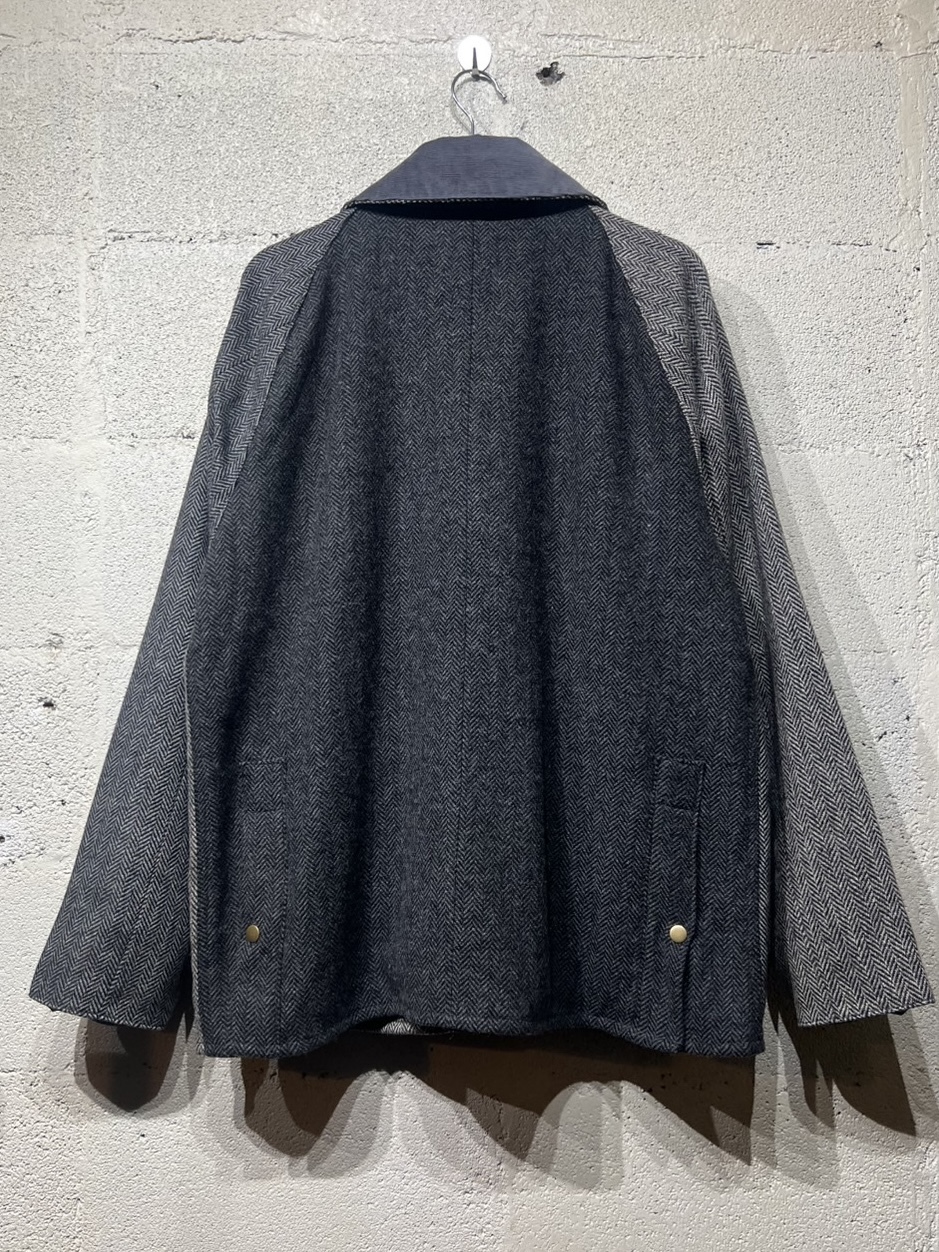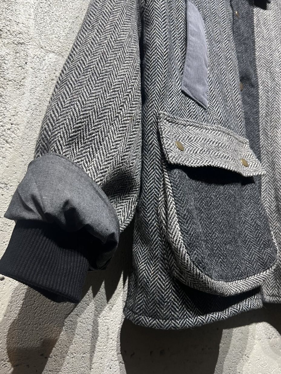 Harris Tweed Country Jacket YOUSED(ユーズド)が手がける、Harris Tweedを使用したカントリージャケット。 スコットランドの伝統素材であるHarris Tweedのヴィンテージウェアを一度解体し、パターンから再構築することで生まれた一着です。 Harris Tweedは、ヴァージンウールを使用し、島内で染色・紡績、職人の自宅で手織りされた生地のみが名乗ることを許された、長い歴史を持つ英国素材。 厳格な基準をクリアしたものだけが正式に認定され、その品質は世界的にも評価されています。 本作では、そのHarris Tweedを細かく分解し、同系色でまとめたクレイジーパターンとして再構築。 パッチワークならではの奥行きある表情と、温かみのあるカラーリングが印象的です。 ラグランスリーブやハンドウォームポケット、マチ付きフラップポケット、チンストラップ付きコーデュロイ襟など、クラシカルなディテールを踏襲。 身頃裏にはシャンブレー、袖裏にはポリエステルを使用し、着用感にも配慮しています。 すべてが一点モノとなる、YOUSEDならではの特別なプロダクトです。 ◯商品詳細 サイズ:3 COLOR:GRAY 詳細寸法 身幅:63cm 着丈:75cm 裄丈:91cm