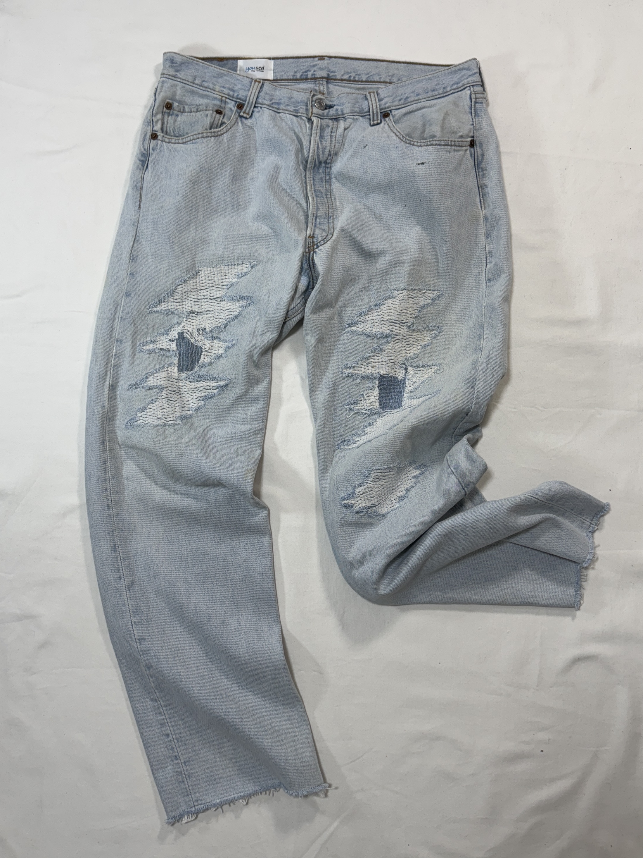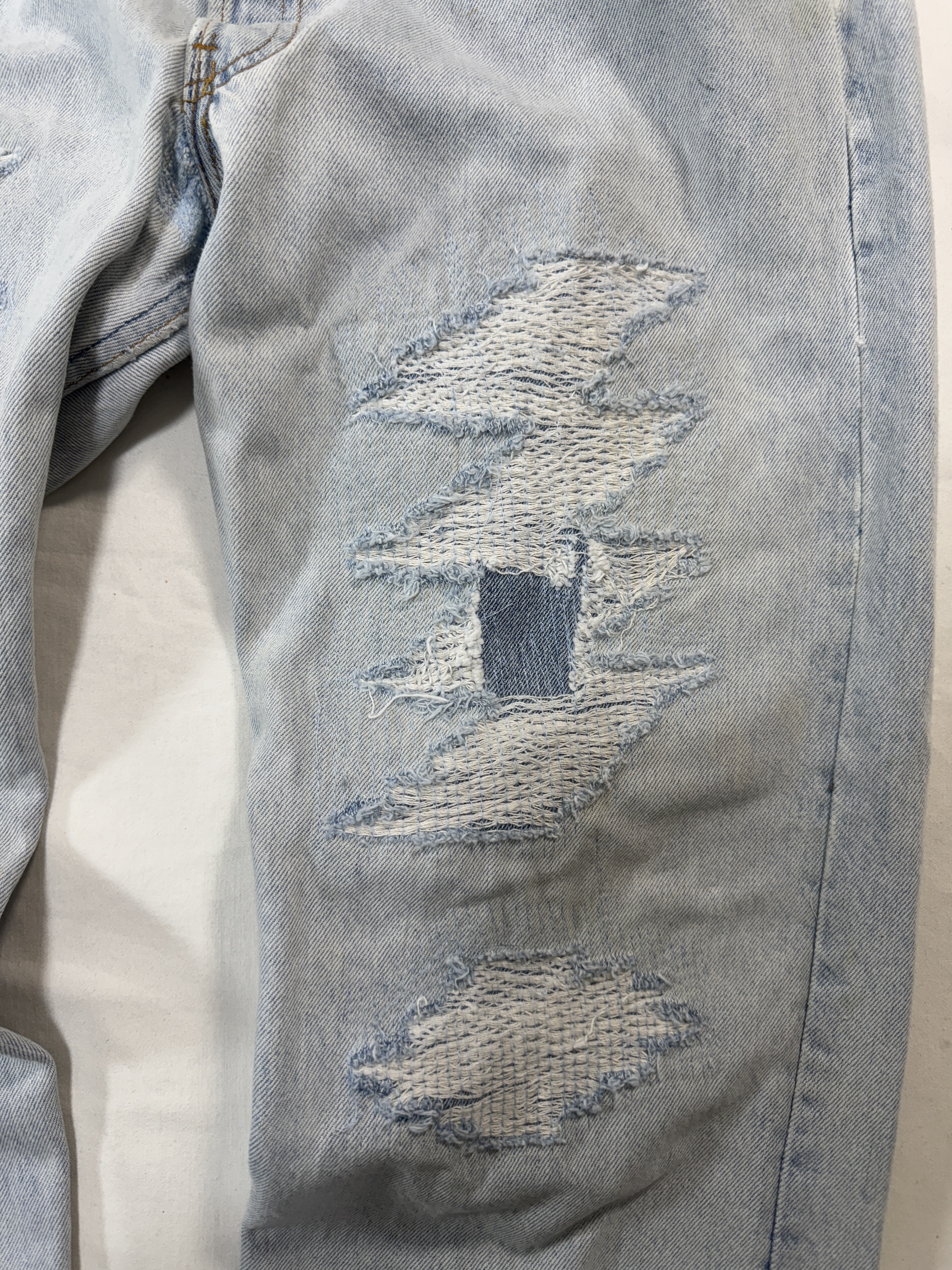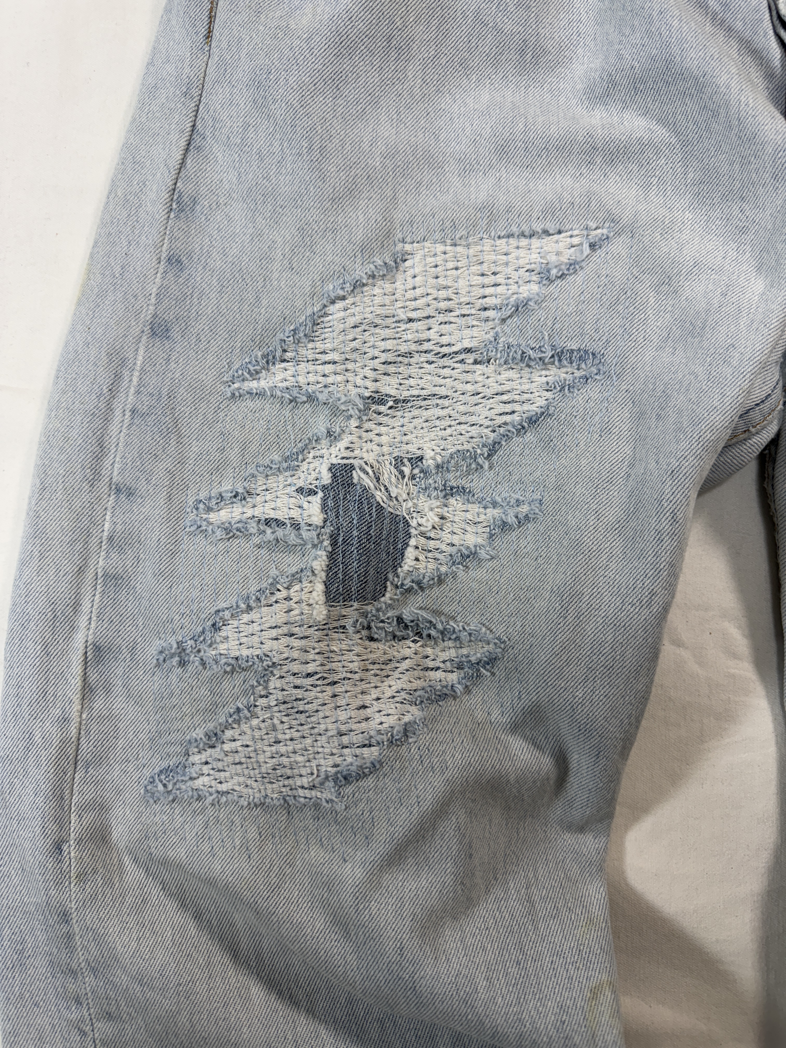 希少な90年代USA製のリーバイス501をベースに、大胆なリペアを施した一本。90年代のグランジシーンを象徴するカート・コバーンのスタイルをイメージし、薄めのインディゴやケミカルブリーチ系の色味をセレクトしました。 ダメージ箇所には、タタキと呼ばれるミシンを200回以上折り返して縫う技法を使用。現在ではコストがかかりすぎて再現が難しい、非常に手の込んだスペシャルなリペアです。 今後ますます希少価値の高まるUSA製リーバイス501。 この特別なリメイクデニムを、ぜひお試しください。 ◾️詳細情報 ・ブランド:Levi’s(リーバイス) ・モデル:501(USA製) ・年代:1990年代 ・カラー:ライトインディゴ / ケミカルブリーチ ・生産国:USA製 ◾️詳細寸法 実寸上サイズ W36 L30 総丈 :101cm レングス 75cm ワタリ :30cm(股下5センチ箇所から計測) ウエスト :87cm 裾幅 :21cm ※採寸には多少の誤差が生じる場合がございます。