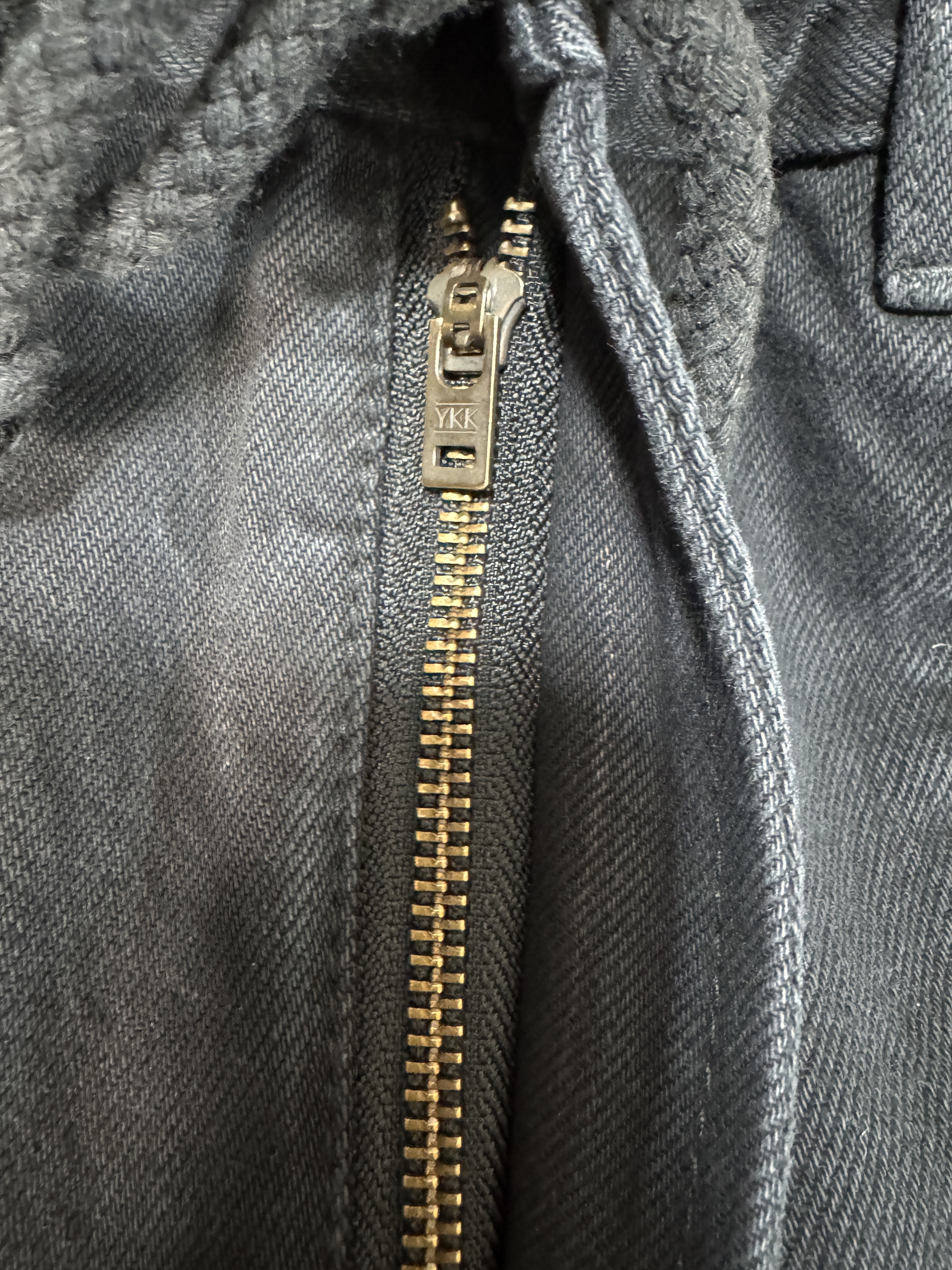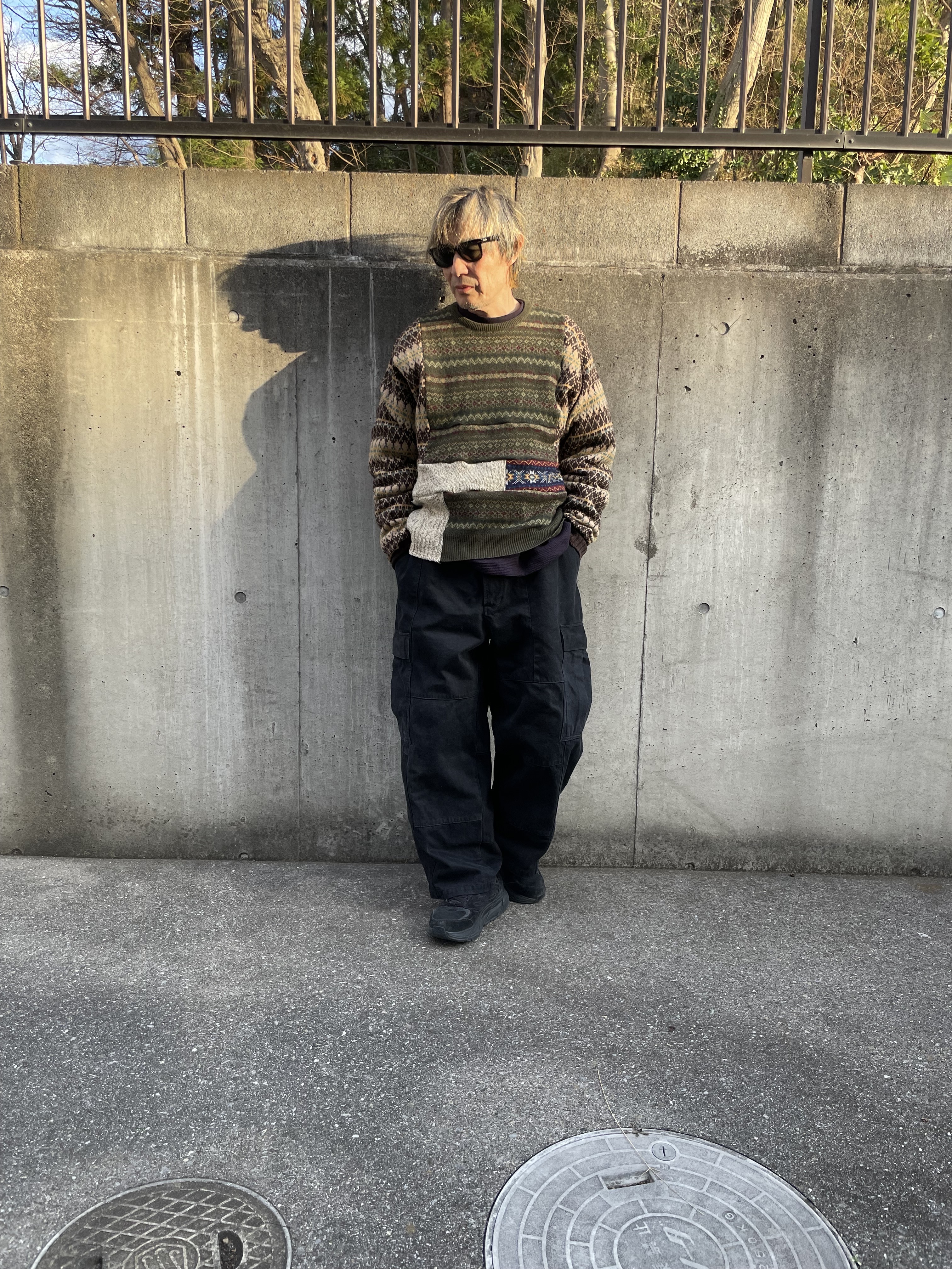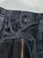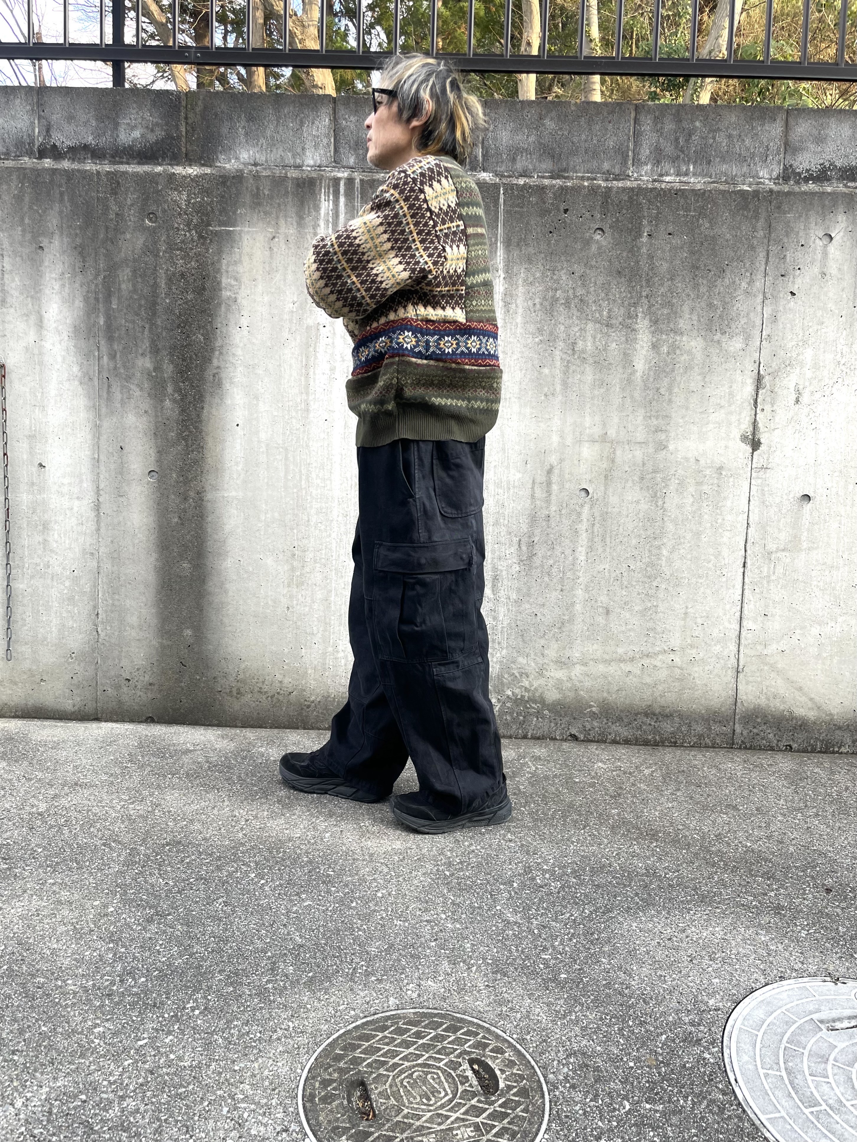 古着のデニムパンツを解体・再構築して仕立てた、ワイドシルエットのイージーパンツ。 素材にはLevi’s 501 / 505を使用し、14オンスのしっかりとしたデニム生地を採用しています。 ワタリ約37cm、裾幅25cmの大胆なワイド設計に加え、股上は39cmと深め。 イージーパンツながら、安定したフィット感と存在感のあるシルエットが特徴です。 ウエストは3段ゴム+ドローコード仕様で、最大約86cmまで対応。 ポケットはサイド・バック合わせて4つ配置し、いずれも深めの設計。 動いた際にも中身が落ちにくく、デイリーユースを想定した実用的なディテールです。 ※カーゴタイプは、通常のポケットに加え、左右にカーゴポケットを備えています。 ブラックカラーは、デニムの表情を残しつつ、よりモードで引き締まった印象に。 スタイリングの幅が広く、通年着用可能な一本です。 COLOR BLACK SIZE 1 / 2(ウエストフリー) ※サイズ差は主にレングスの違いとなります ※モデル身長170cm / サイズ1着用 ワイドイージーパンツ BLK サイズ1 ウエスト(FREE) ワタリ37cm 総丈100cm レングス67cm 裾幅25cm サイズ2 ウエスト(FREE) ワタリ37cm 総丈103cm レングス71cm 裾幅25cm