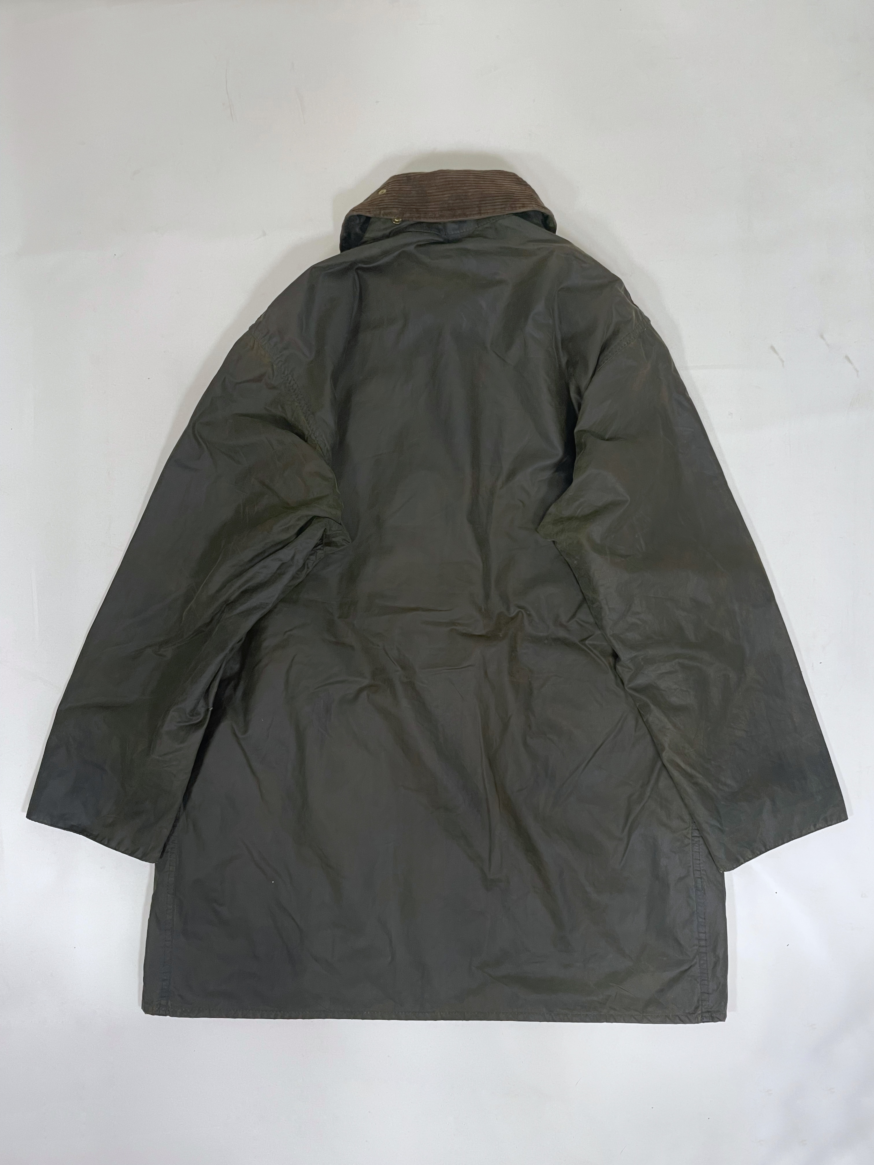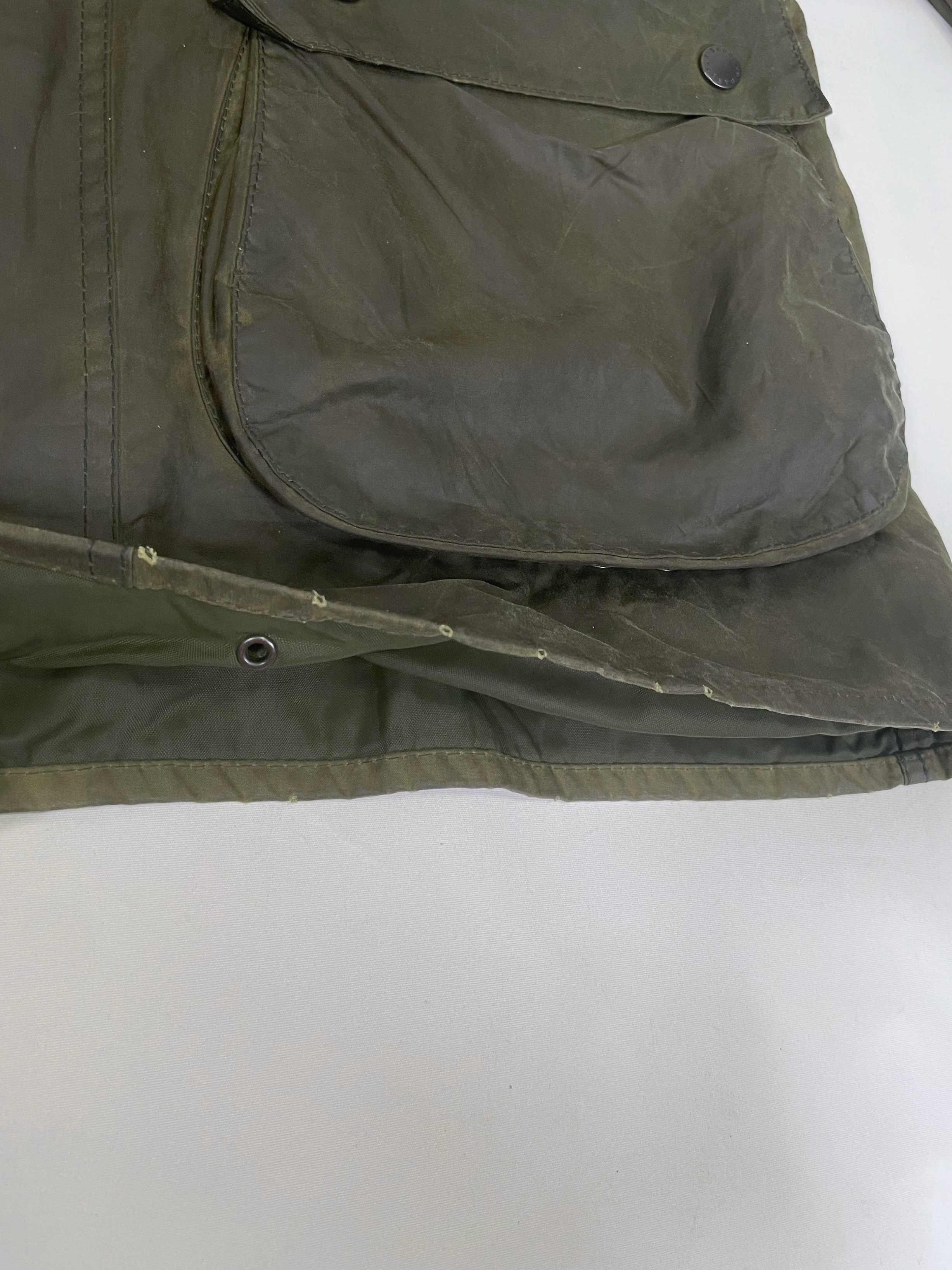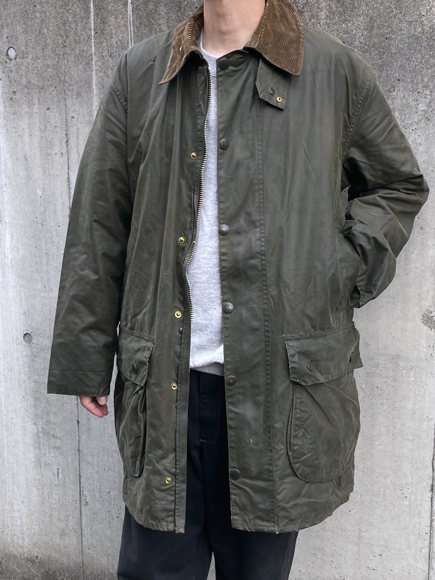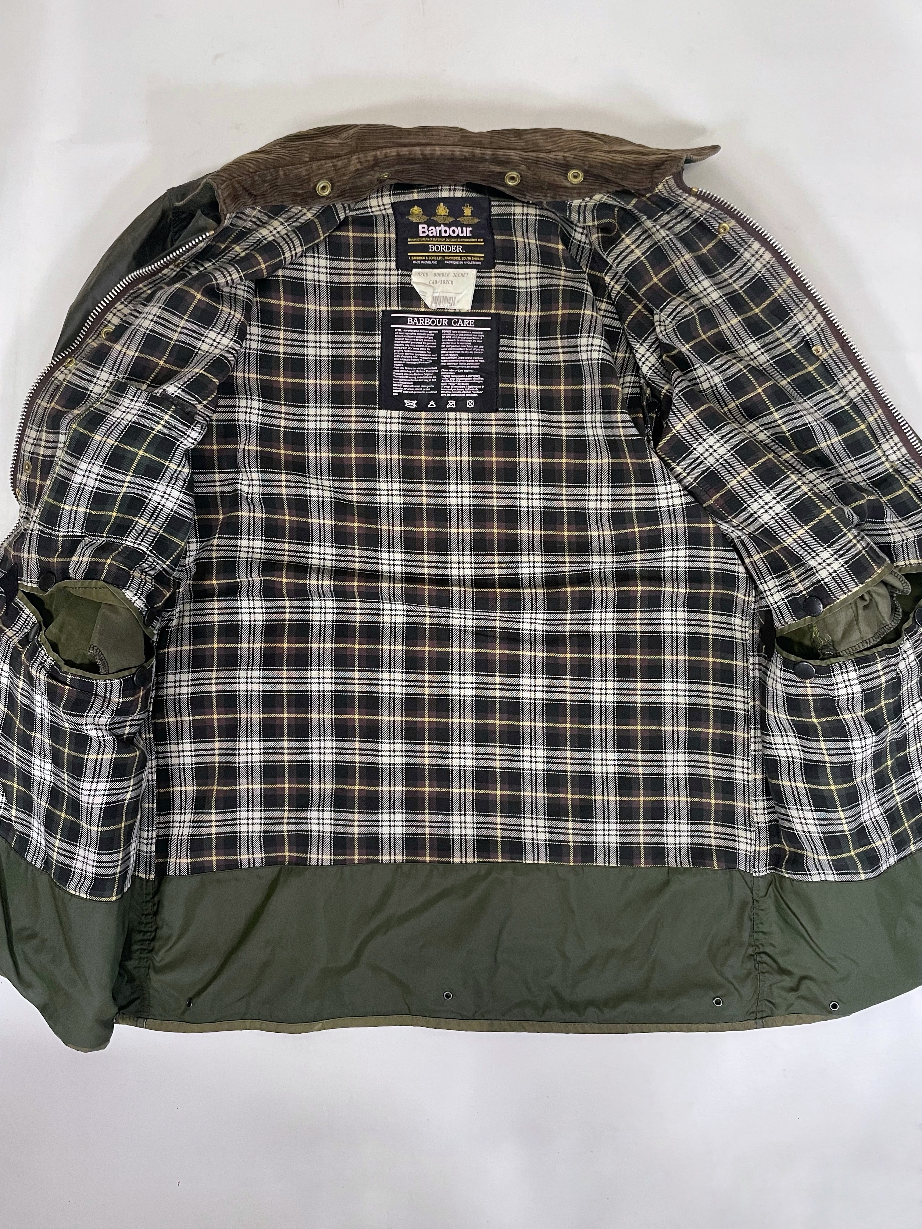Barbour (Special Condition) モデル:BORDER カラー:オリーブ(セージ) 年代 :1993年製 サイズ:40 「袖丈:59cm 身幅:64cm 着丈:89cm 肩幅:51cm」 コンディション:目視の限り小穴等ダメージはございません。※光の加減により一部色が変色してしまっているように見えますが、実物はそのような事はございませんのでご安心下さい。また、襟の汚れやボタン、ジッパーなどの機能も問題ありません。袖端のスレは御座いませんが、画像の最後に掲載してますように裾端の中部分に若干のスレがございます。 ※ミリ単位のピンホール、小傷等はお許し下さい(目で見つかったものは写真掲載します。) 一年かけて集めたほぼノンダメージのビンテージバブアーです。 実のところ全くダメージの無いバブアーは数十枚に一枚程度しかありません。(それもそのはず、捨てる理由がありませんので。) また、こちらのSpecial Conditionのバブアーは全て洗濯、クリーニング済みです。尚殆どのものがリプルーフを施し長くお使い頂ける様メンテナンスを行い商品化させて頂いてます。※ミリ単位のピンホール、小傷等はお許し下さい(目で見つかったものは写真掲載します。)コンディションの良いビンテージバブアーをお探しの方ぜひご検討下さい。