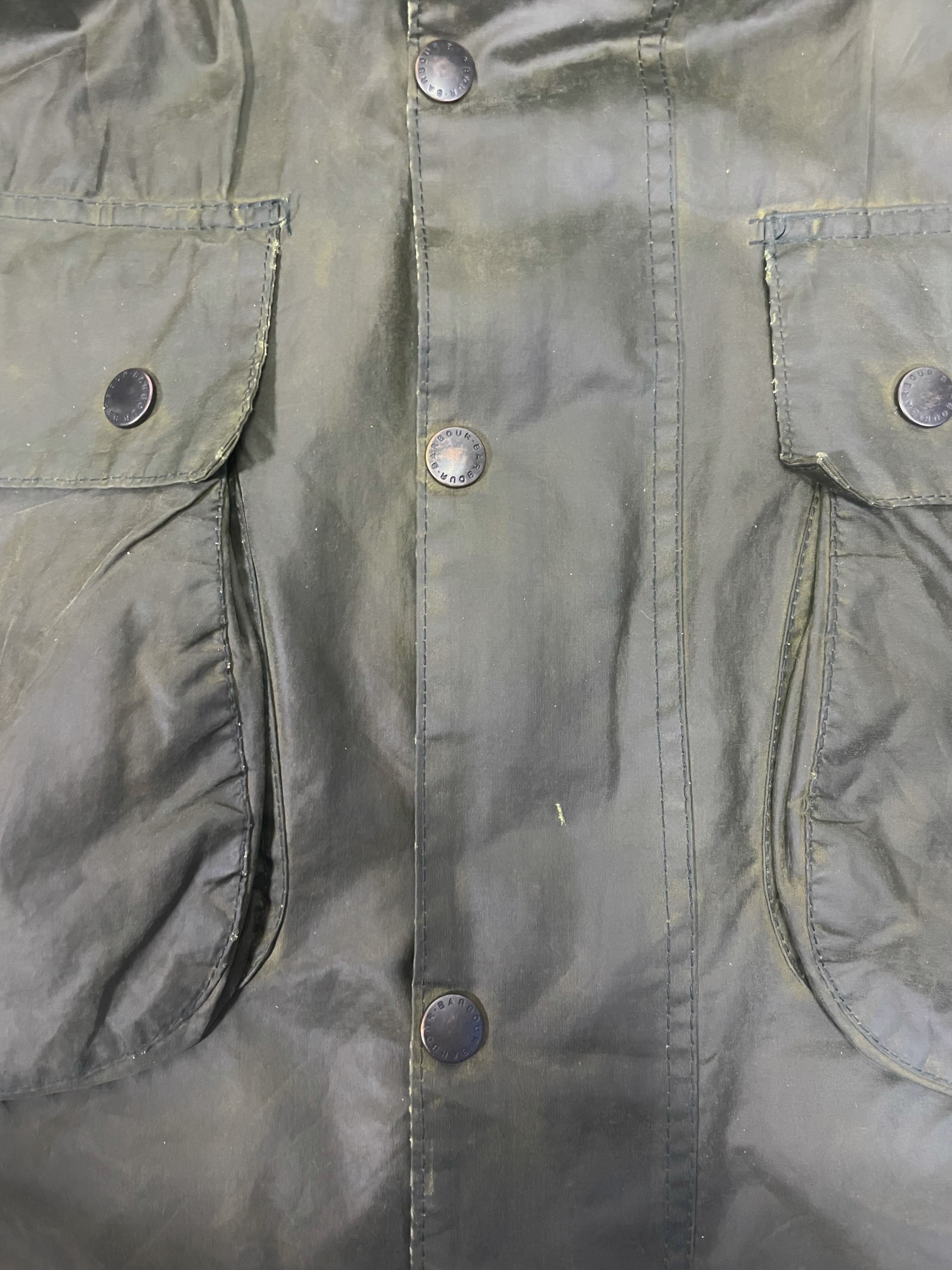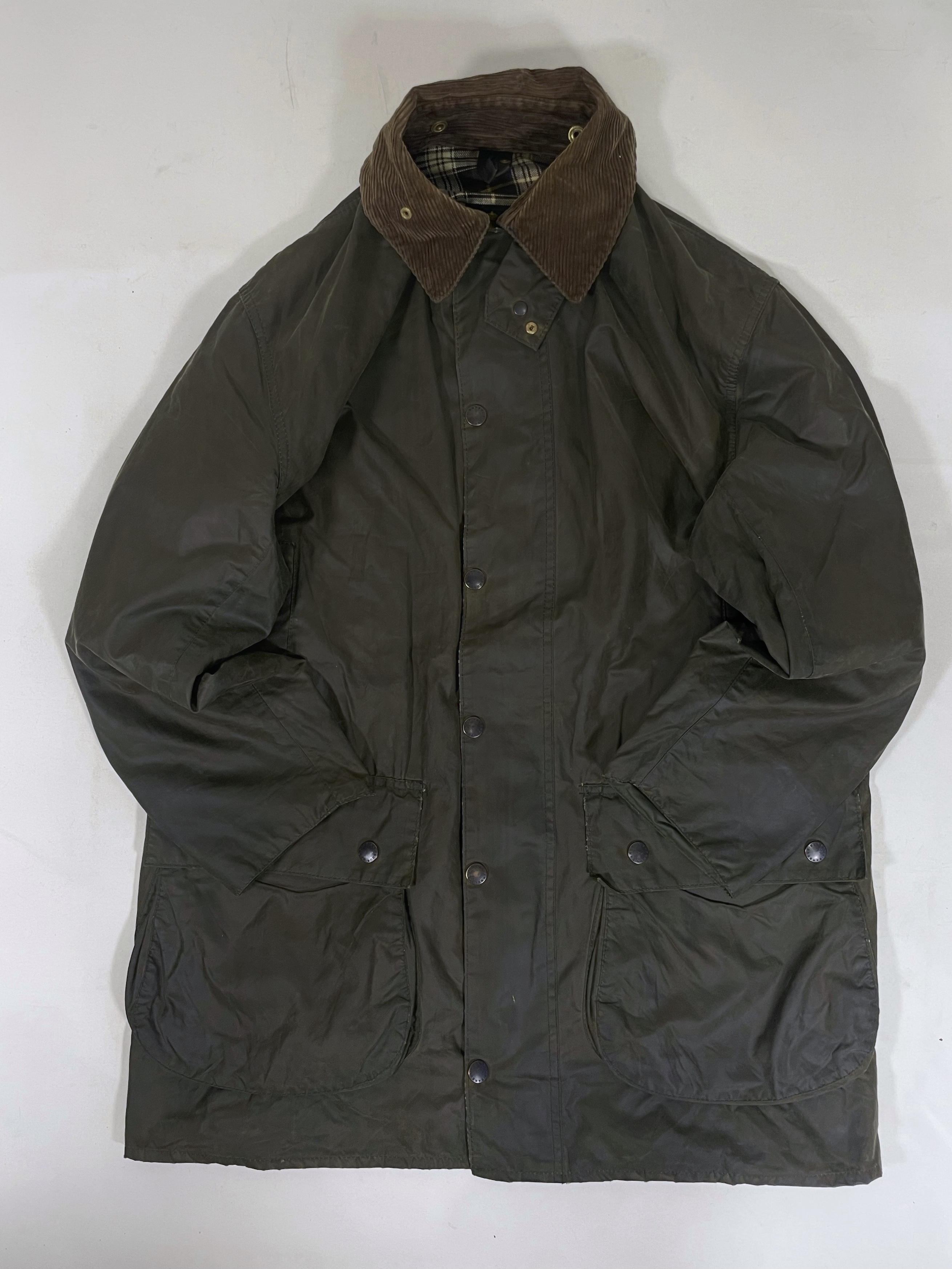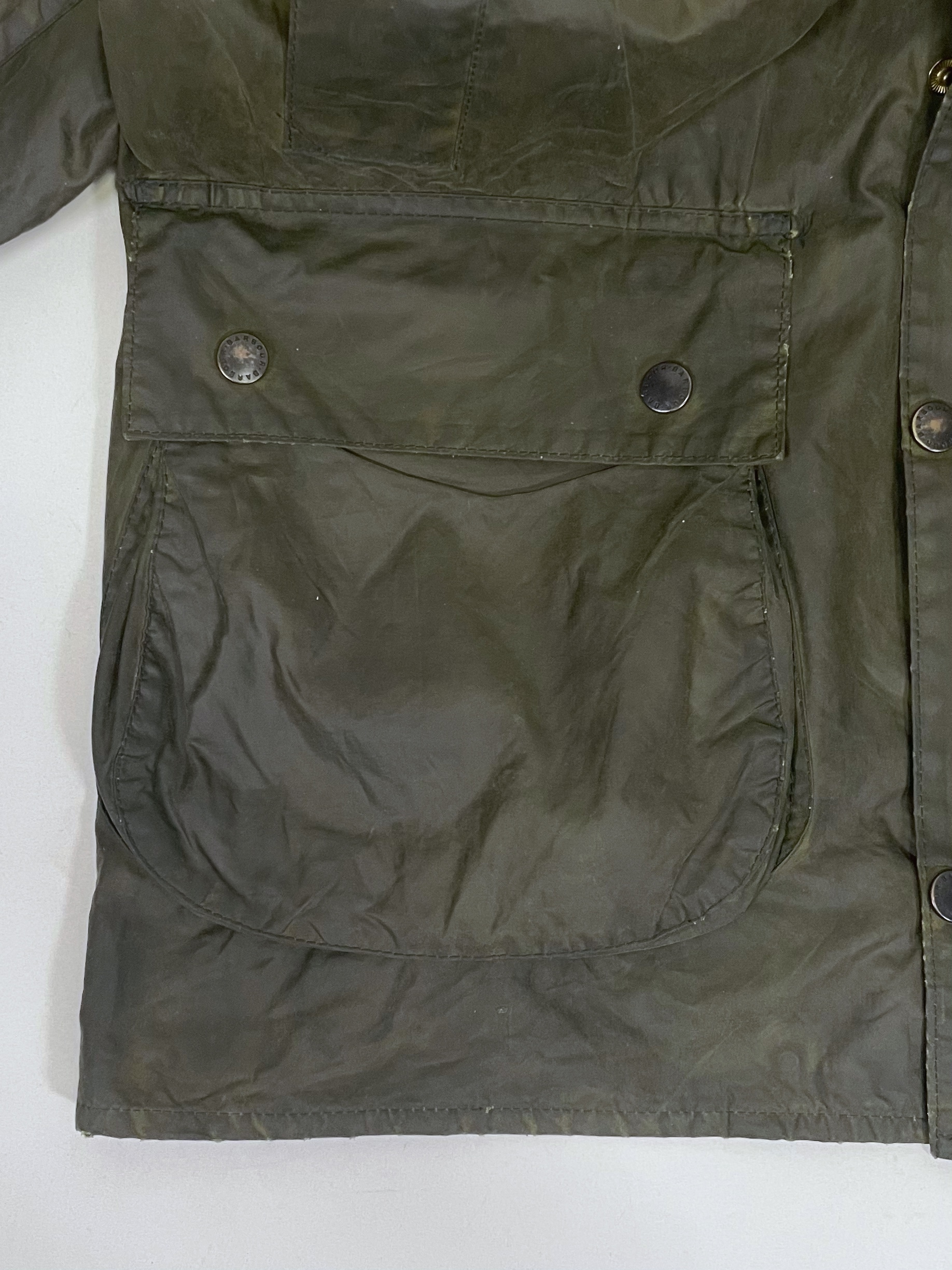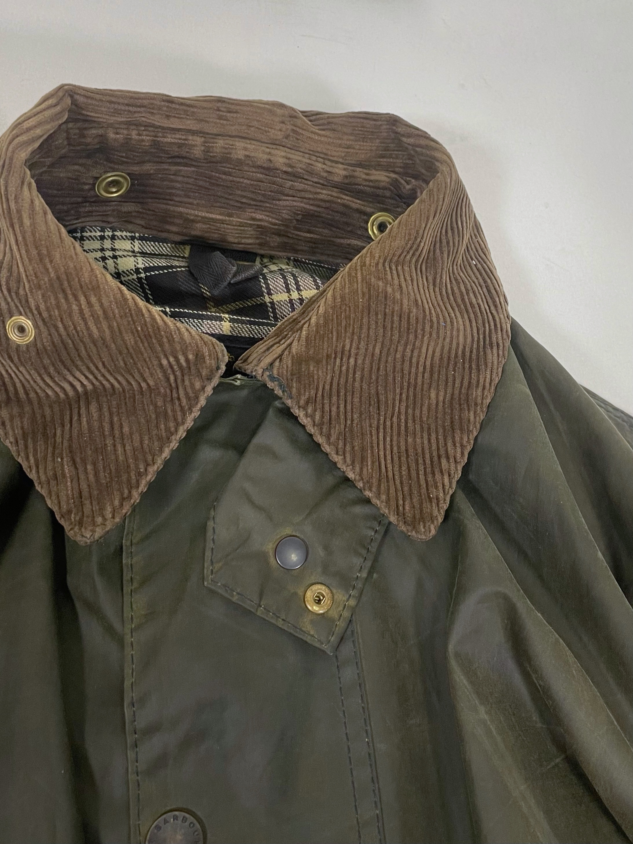 Barbour (Special Condition) モデル:BORDER カラー:オリーブ(セージ) 年代 :1993年製 サイズ:40 「袖丈:59cm 身幅:64cm 着丈:89cm 肩幅:51cm」 コンディション:目視の限り小穴等ダメージはございません。※光の加減により一部色が変色してしまっているように見えますが、実物はそのような事はございませんのでご安心下さい。また、襟の汚れやボタン、ジッパーなどの機能も問題ありません。袖端のスレは御座いませんが、画像の最後に掲載してますように裾端の中部分に若干のスレがございます。 ※ミリ単位のピンホール、小傷等はお許し下さい(目で見つかったものは写真掲載します。) 一年かけて集めたほぼノンダメージのビンテージバブアーです。 実のところ全くダメージの無いバブアーは数十枚に一枚程度しかありません。(それもそのはず、捨てる理由がありませんので。) また、こちらのSpecial Conditionのバブアーは全て洗濯、クリーニング済みです。尚殆どのものがリプルーフを施し長くお使い頂ける様メンテナンスを行い商品化させて頂いてます。※ミリ単位のピンホール、小傷等はお許し下さい(目で見つかったものは写真掲載します。)コンディションの良いビンテージバブアーをお探しの方ぜひご検討下さい。