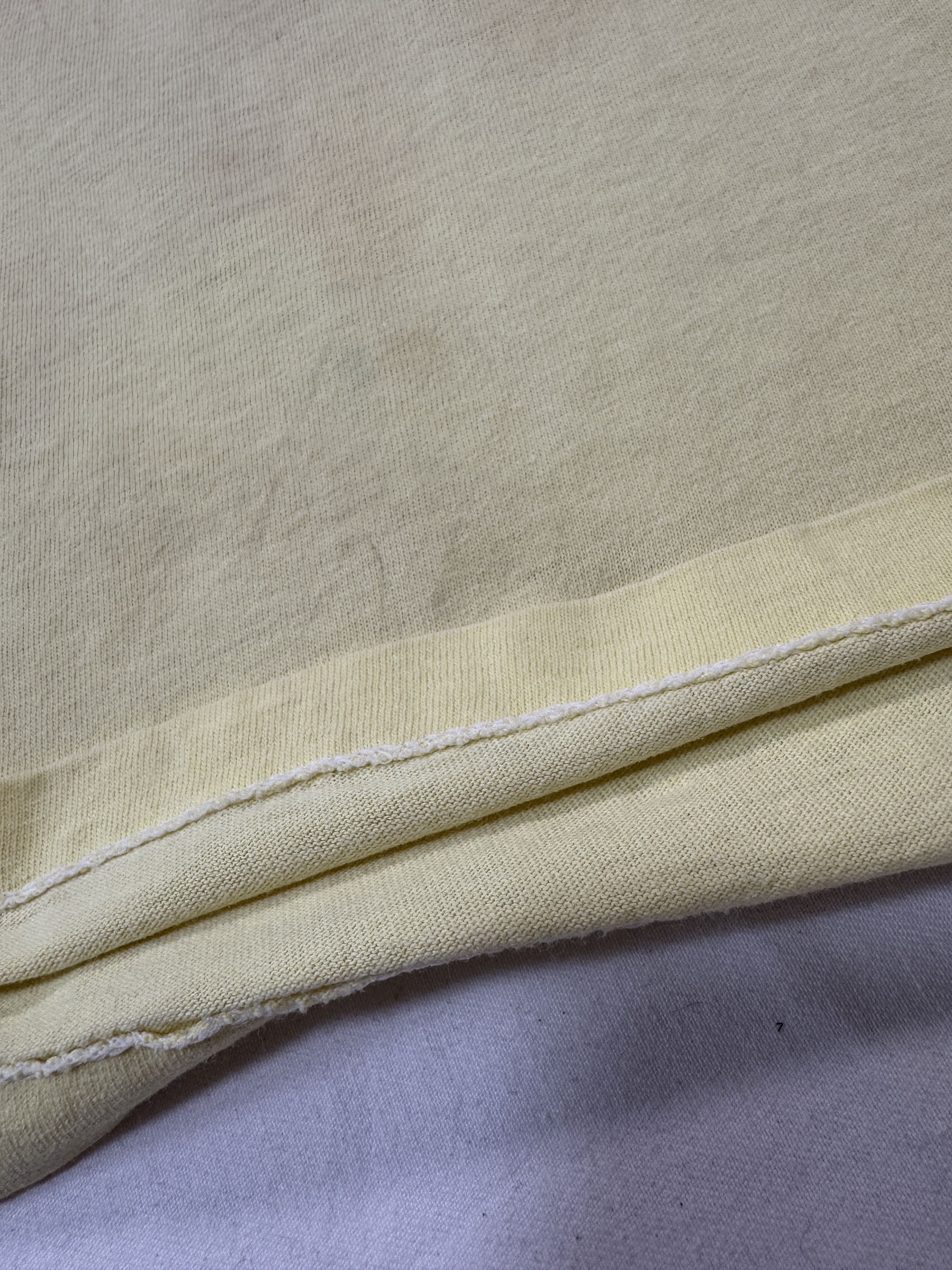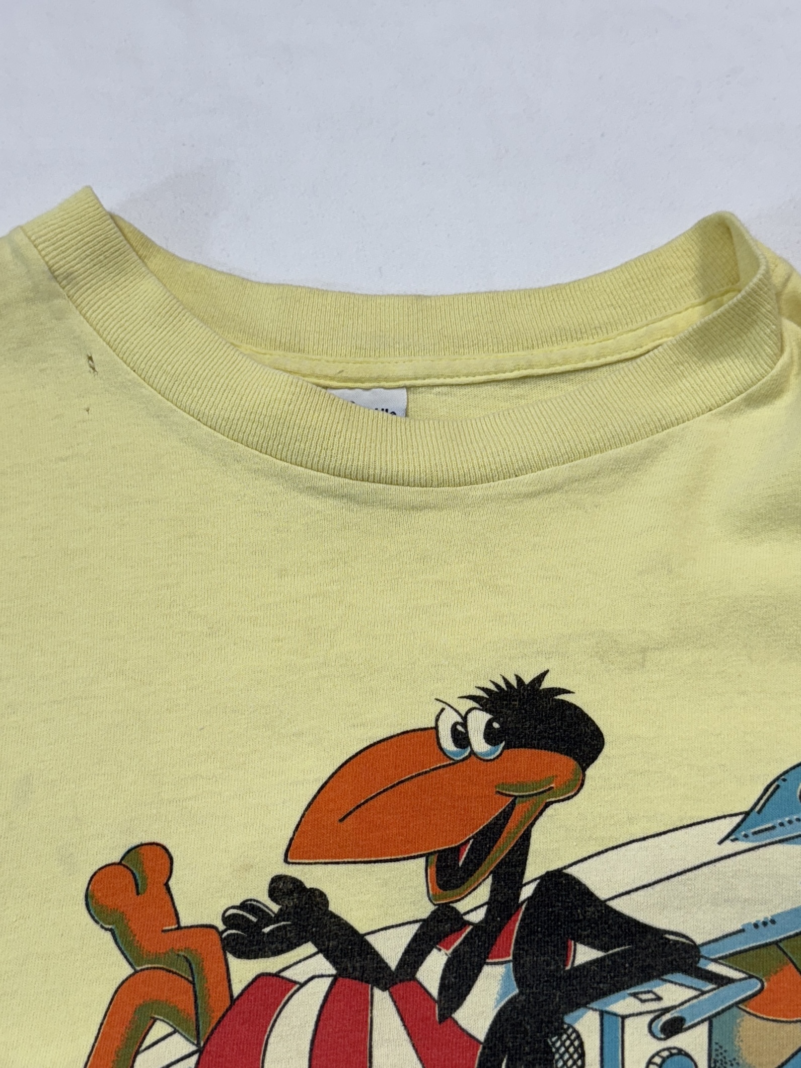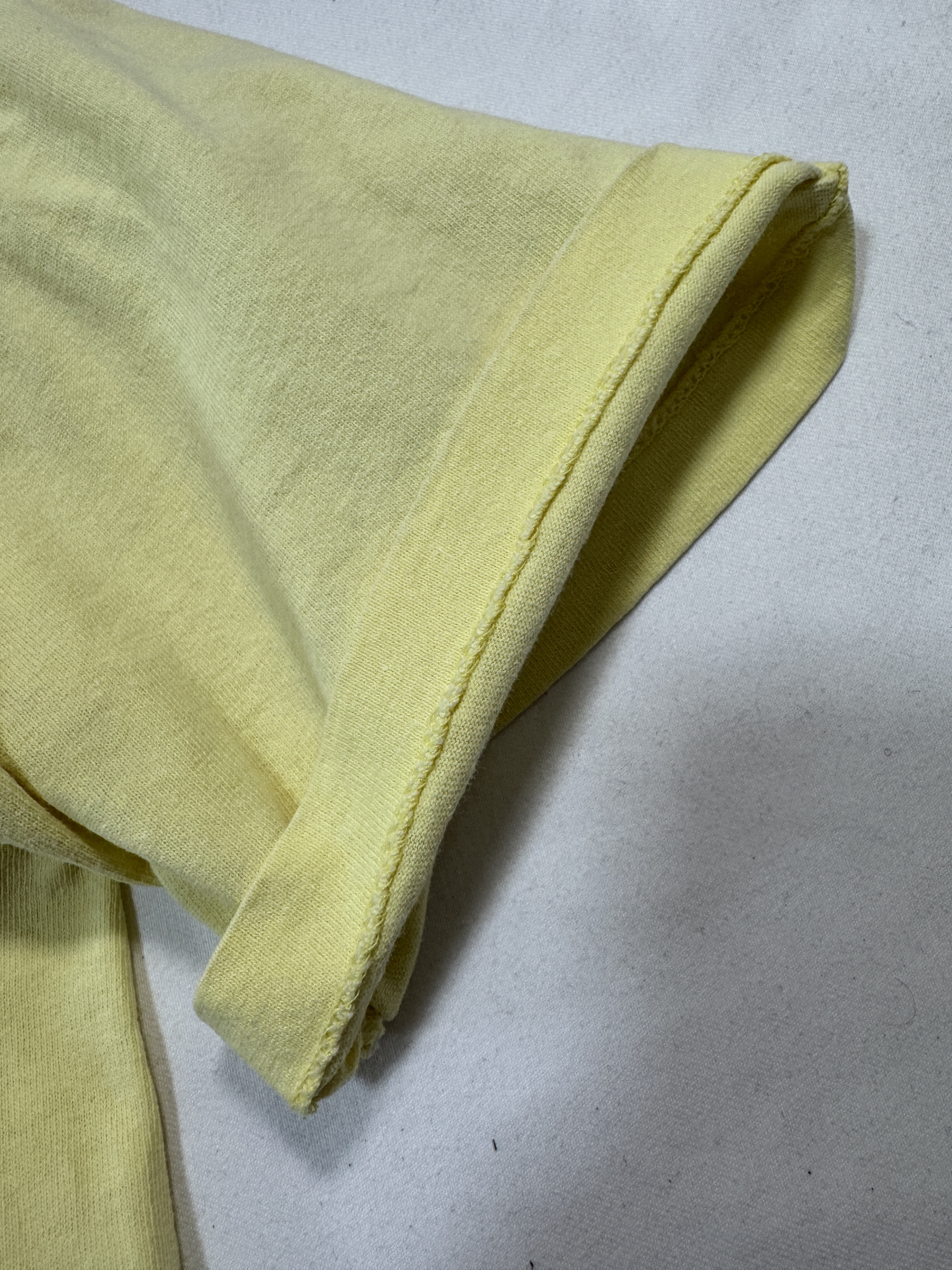 【商品説明】 ブランド:Textile Prints 年代:1980年代製 生産国:made in usa カラー:イエロー ステッチ:シングルステッチ 【コンディション】 プリント辺りに薄汚れが数箇所ございます。 襟の右側に若干のダメージが1箇所ございます。 全て画像にて掲載してますのでご確認下さい。 多少の着用感あり(ヴィンテージ特有の風合いとしてご理解ください) 【サイズ】 表記サイズ:L 着丈(後ろ襟の付け根中央から計測):約62cm 身幅(脇下左右):約55cm 肩幅:約49cm 袖丈:約18cm 【備考】 ・洗濯済みですぐにご着用いただけます。 ・古着にご理解のある方のみご購入をお願いいたします。